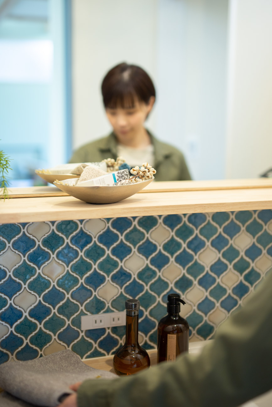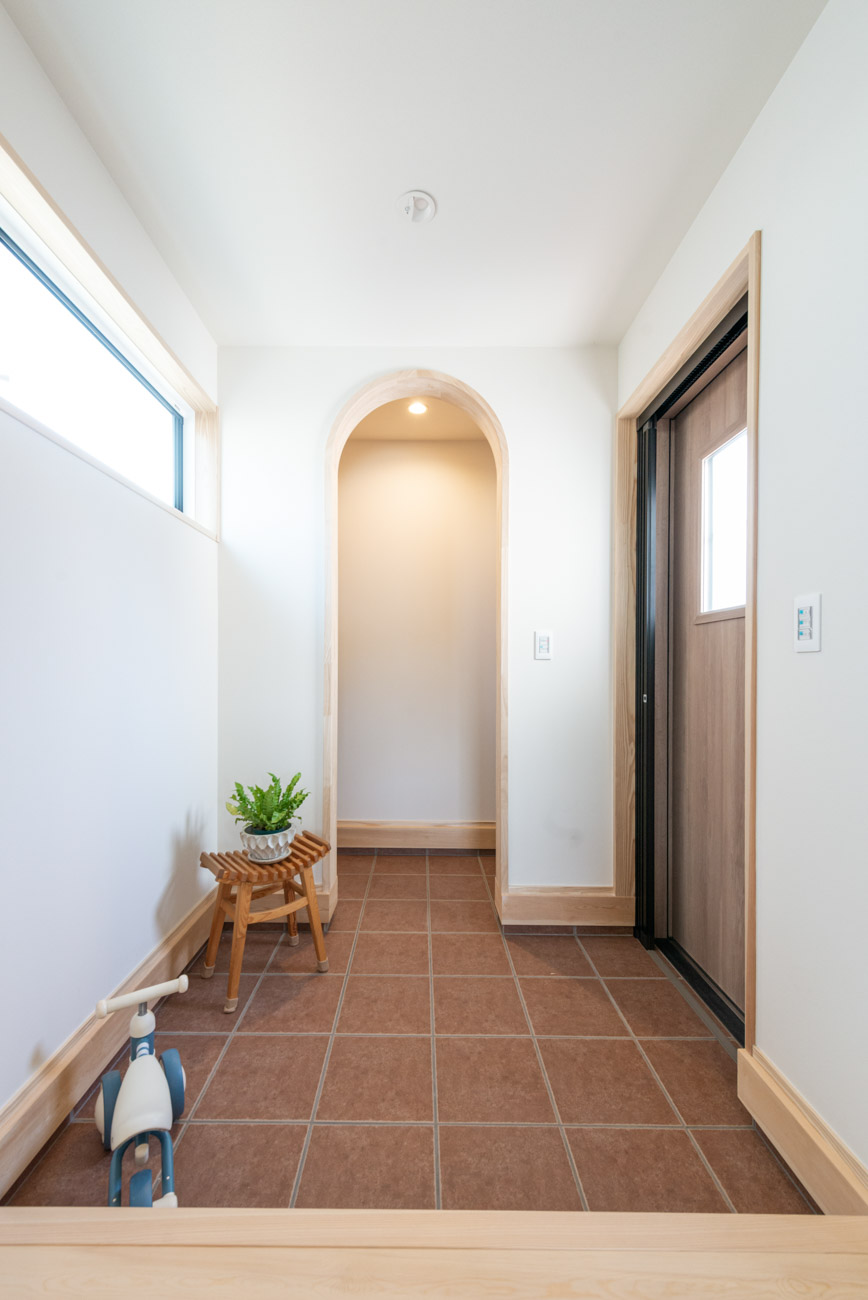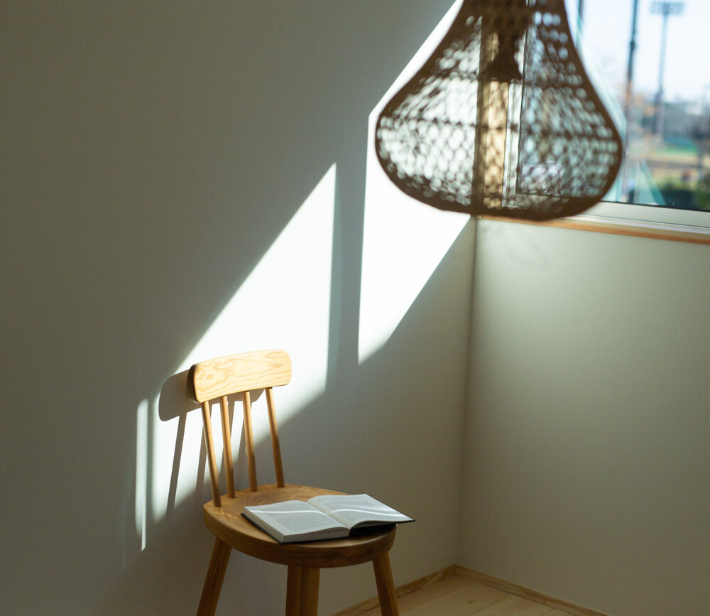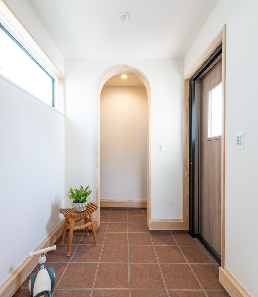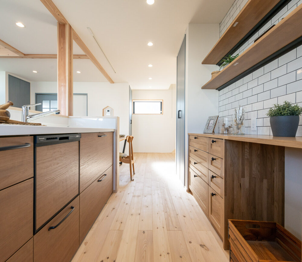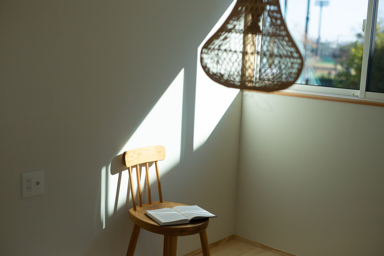 ふわっと暖かい自然素材で優しくしつらえた室内デザイン。タイルの表情が美しい、造作の洗面化粧台。爽やかなアクセントウォールと桐のパネリングが相性良く収まる高い吹き抜け。家族の成長に合わせて対応できるプランニング。若いご家族がやわらかく暮らすお住まい。 家族が集まる吹き抜けリビング ハンモックを取り付けたり趣味のサーフボードを展示したりと親子で楽しめる空間に。キッチンからぐるっとリビングを見渡せるため、家事をしながらお子様の様子を見守れます。吹き抜けの淡いカラーリングのアクセントウォールは珪藻土左官塗壁。調湿性・消臭性・抗菌作用があり、室内の空気を清浄に保つ効果があります。天井には桐の幅広パネリングを使用。落ち着いた表情で、上品な雰囲気に。軽い素材で施工しやすく狂いが少ない優れた無垢素材です。 家族が繋がるシンプル設計 上下階を繋ぐ吹き抜けで、家族がどこにいても気配をつないでくれます。また、2階フリースペースは将来的に2部屋に仕切れる仕様。扉をつけないおープンクローゼットは掃除がしやすい優れもの。シンプルに作ることで、無駄な予算も抑え、開放的に暮らせます。断熱性・機密性も高く、広くても冷暖房効率が良く、コストパフォーマンスの良いお住まいです。 自分だけのオリジナル造作家具 お好きなタイルと照明を組み合わせ、マリンスタイルの一点ものの洗面化粧台を造作。建具や家具、既製品は数あれど、しっくり来るものがないというときは、皆様の好みや暮らし方に合わせて作る造作家具や建具をおすすめしています。