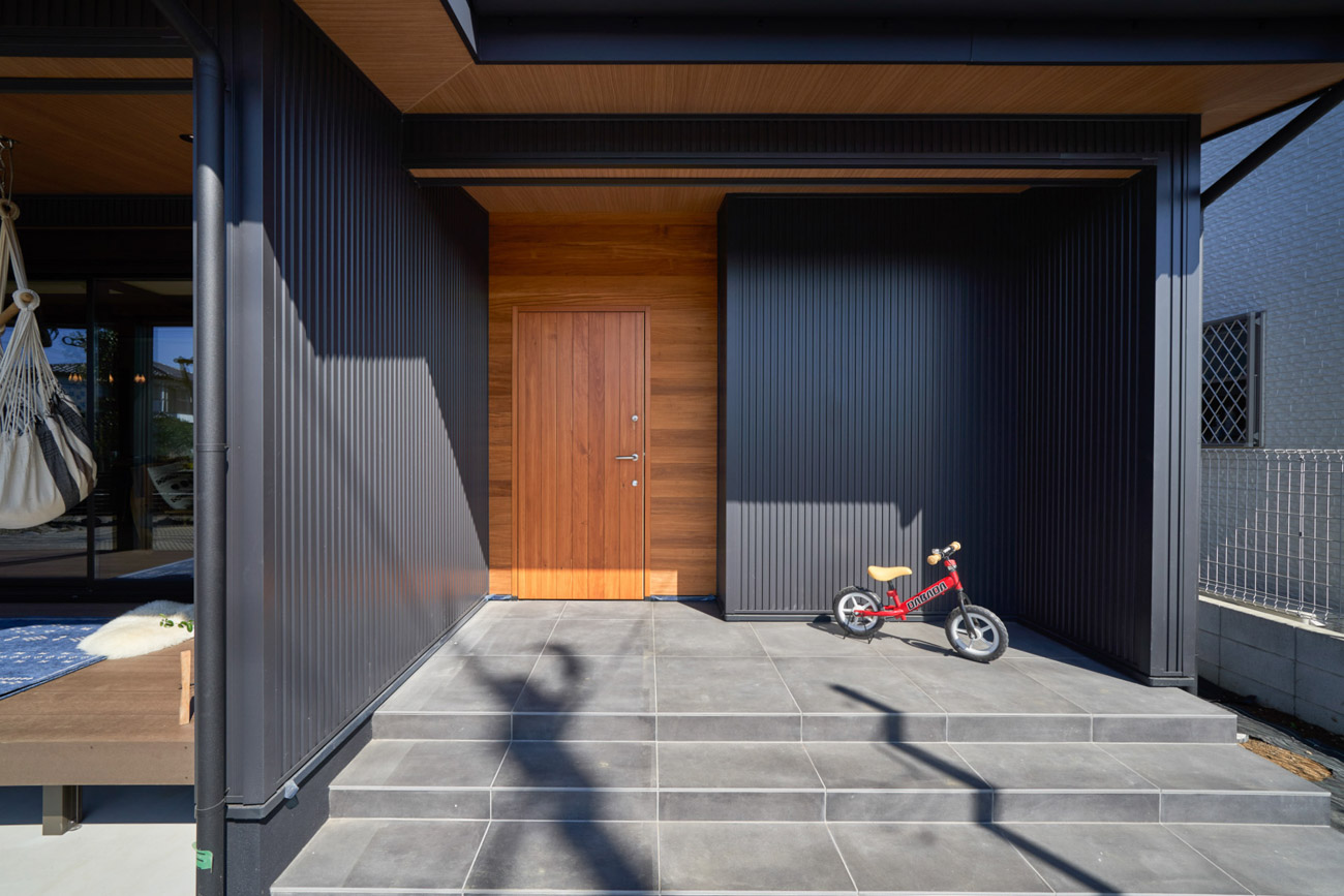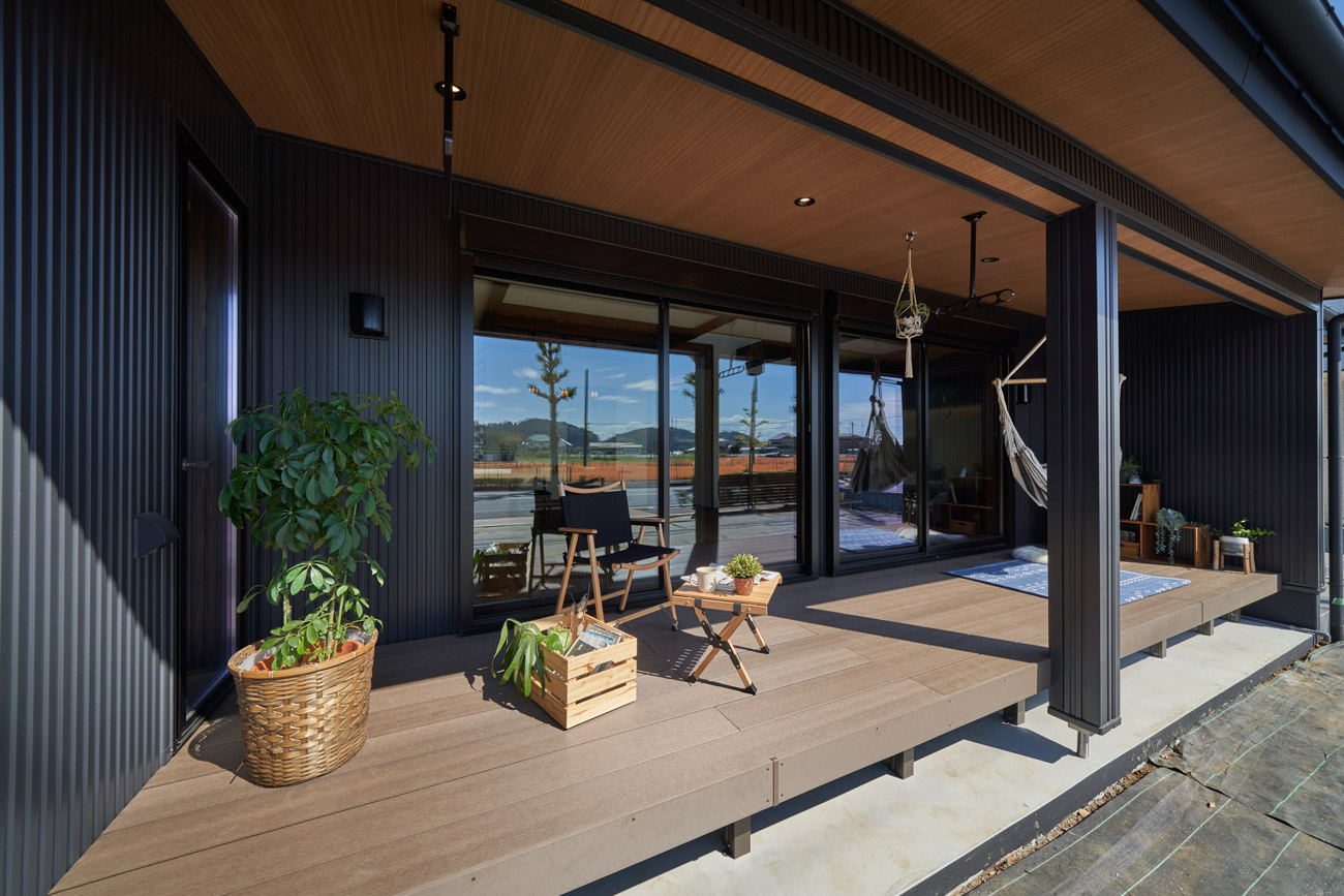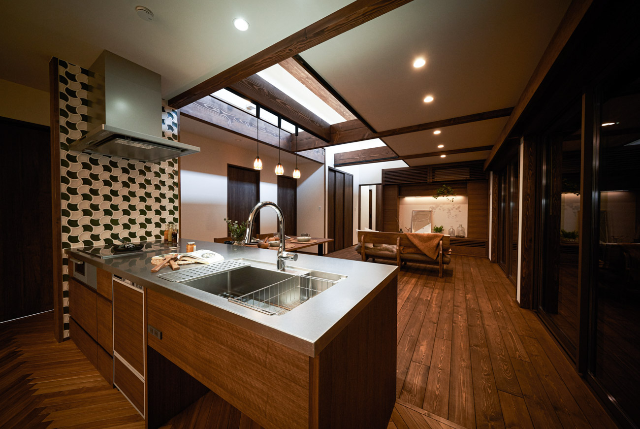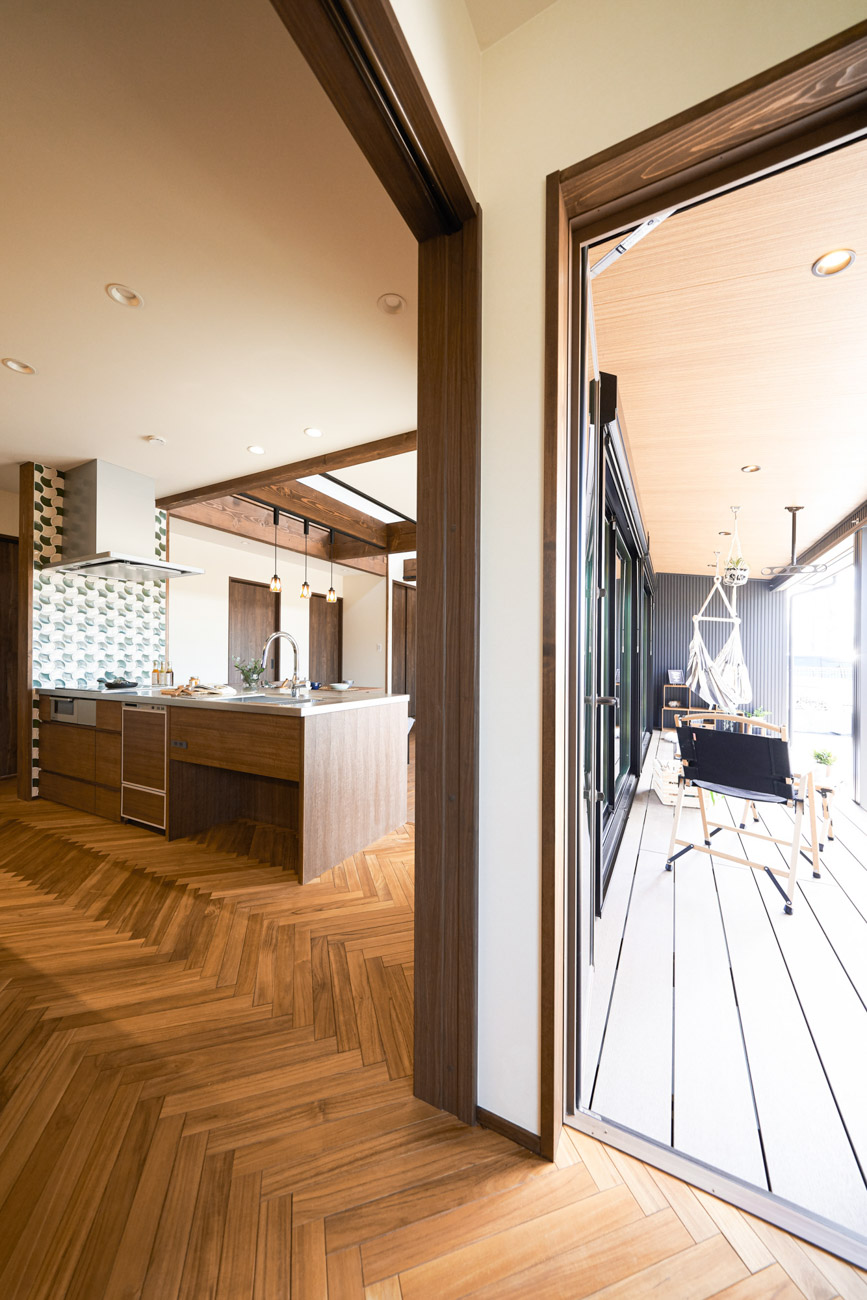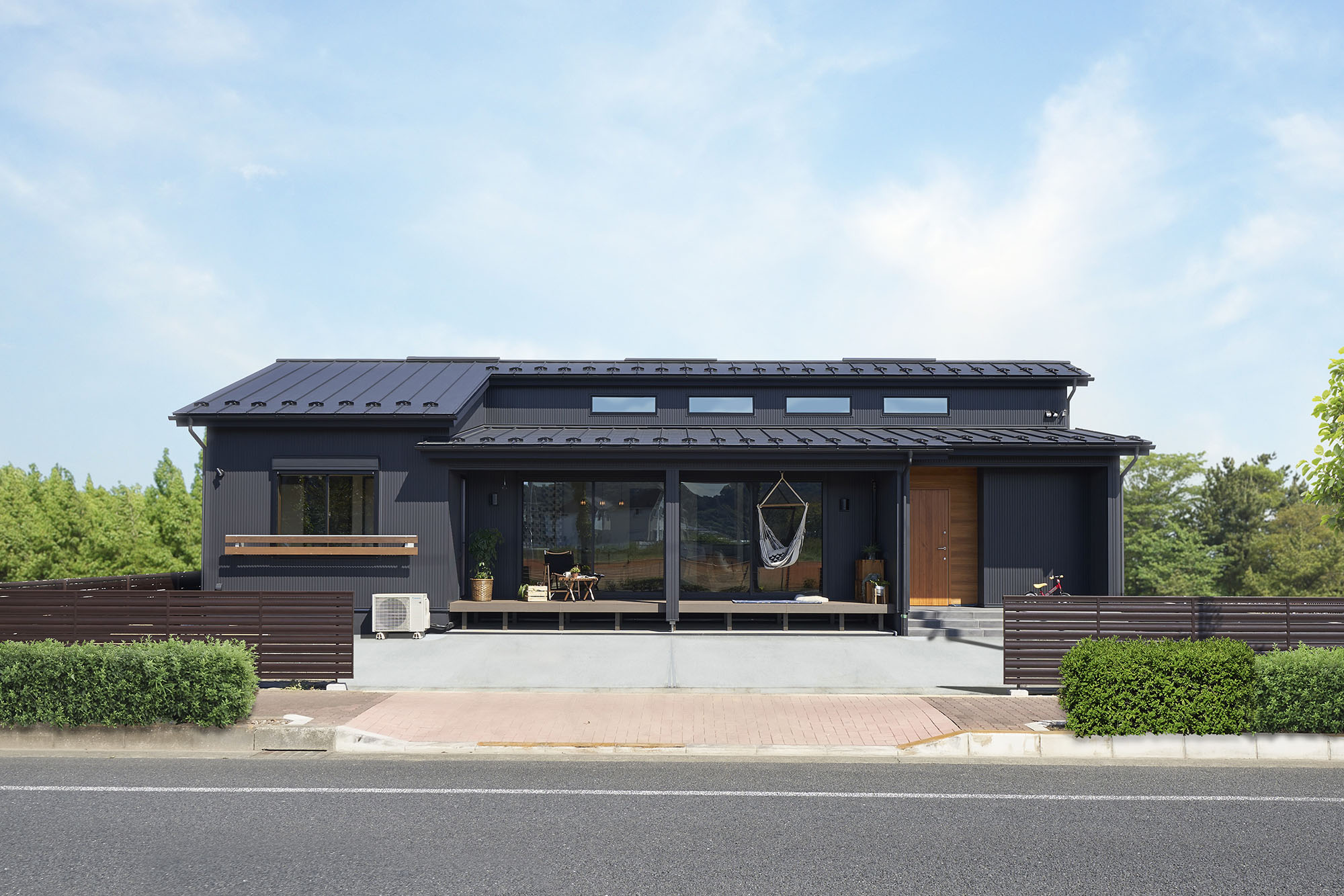 大判タイルが迎える、無垢扉の玄関。ウッドデッキへと繋がる大きな掃き出し窓と、深い下屋。落ち着いた内装と造作キッチンに映える、美しいモザイクタイル。ぐるりと動線の良い家事スペースは、表情豊かなヘリンボーンの床。 家中に建主様のこだわりをちりばめた、悠々と構える平屋の邸宅。 悠々とたたずむ平屋。 約40坪の堂々たる平屋の邸宅。アプローチに60cm角の大判タイルを、玄関ドアはオレンジ塗装の木製扉、壁にはチーク材を使用。リビング幅と同じ大きなウッドデッキにはハンモックフックがあり、家族でのびのびと過ごせるアウトドアリビングとなっています。ブラックの外壁が全体を引き締め男前な外観デザインとなりました。 モダンリビングと美しい造作家具 造作で作られた大きなウォールナットのペニンシュラキッチンと背面収納棚。アクセントに使われているイチョウ型とランタン型のモザイクタイルを、間接照明が美しく照らします。ヘリンボーンの床との相性がよく、品の良いミッドセンチュリーな内装デザイン。TVボードも同じくウォールナット材を使用。エアコンカバーを上手に組み合わせ、スッキリとした空間に。 回遊する家事動線 ランドリールーム→パントリー→キッチンはぐるりと回り込める回遊動線。暮らしやすく家事の動線もスムーズに。ランドリールームからはそのままウッドデッキへ出入りが可能。