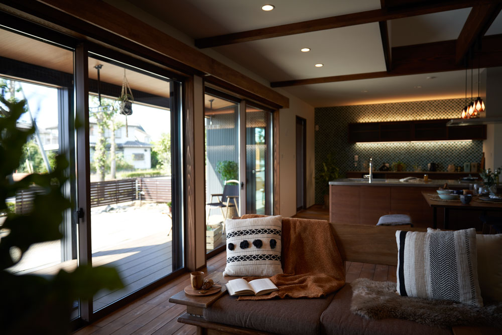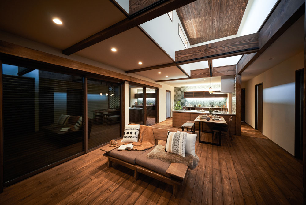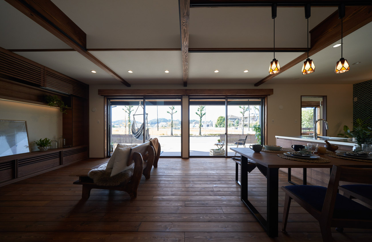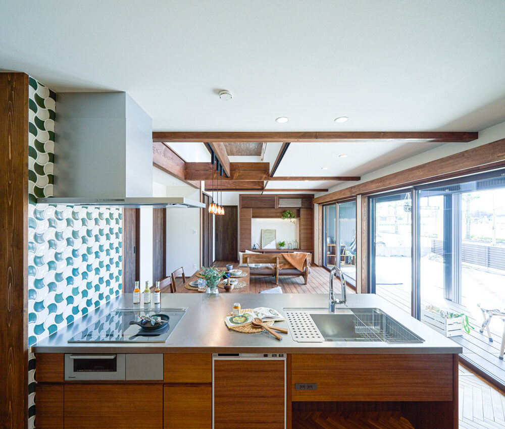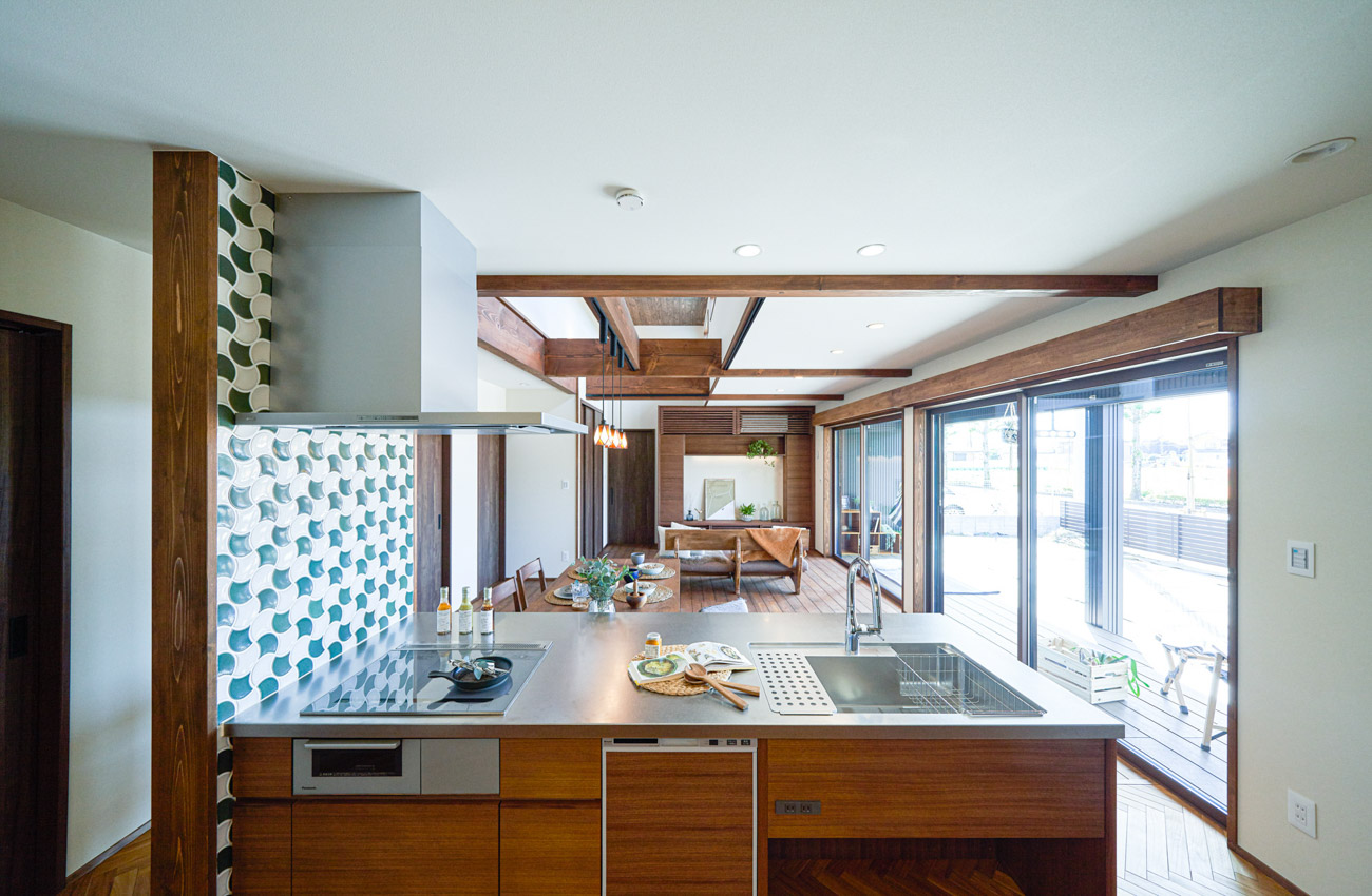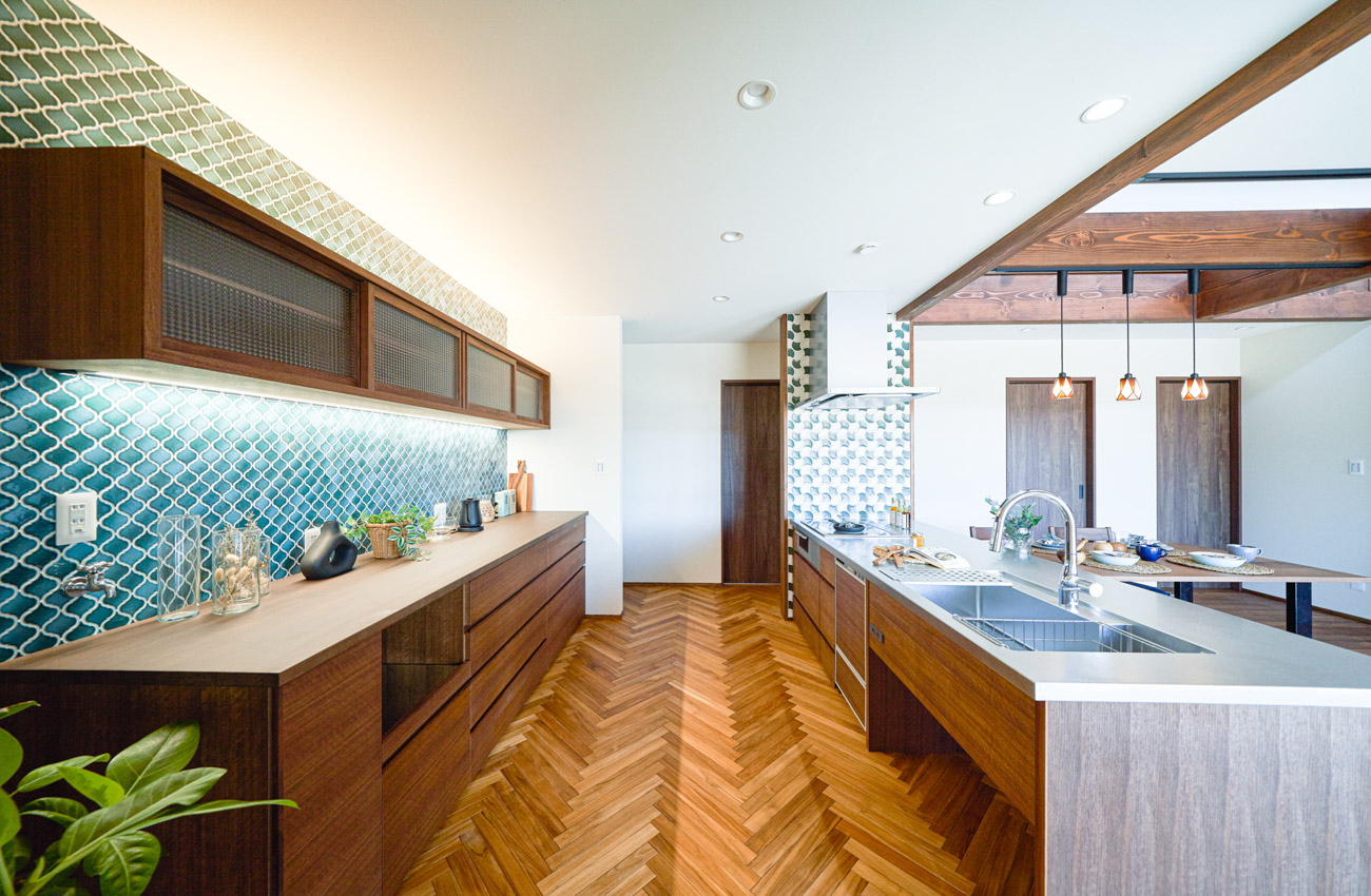 大判タイルが迎える、無垢扉の玄関。ウッドデッキへと繋がる大きな掃き出し窓と、深い下屋。落ち着いた内装と造作キッチンに映える、美しいモザイクタイル。ぐるりと動線の良い家事スペースは、表情豊かなヘリンボーンの床。 家中に建主様のこだわりをちりばめた、悠々と構える平屋の邸宅。 悠々とたたずむ平屋。 約40坪の堂々たる平屋の邸宅。アプローチに60cm角の大判タイルを、玄関ドアはオレンジ塗装の木製扉、壁にはチーク材を使用。リビング幅と同じ大きなウッドデッキにはハンモックフックがあり、家族でのびのびと過ごせるアウトドアリビングとなっています。ブラックの外壁が全体を引き締め男前な外観デザインとなりました。 モダンリビングと美しい造作家具 造作で作られた大きなウォールナットのペニンシュラキッチンと背面収納棚。アクセントに使われているイチョウ型とランタン型のモザイクタイルを、間接照明が美しく照らします。ヘリンボーンの床との相性がよく、品の良いミッドセンチュリーな内装デザイン。TVボードも同じくウォールナット材を使用。エアコンカバーを上手に組み合わせ、スッキリとした空間に。 回遊する家事動線 ランドリールーム→パントリー→キッチンはぐるりと回り込める回遊動線。暮らしやすく家事の動線もスムーズに。ランドリールームからはそのままウッドデッキへ出入りが可能。