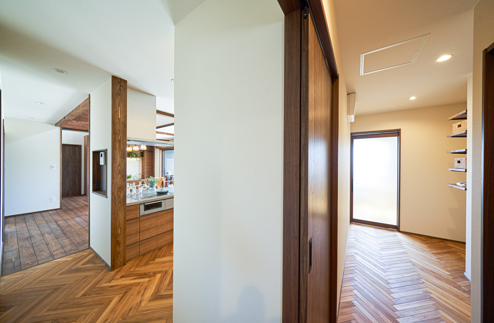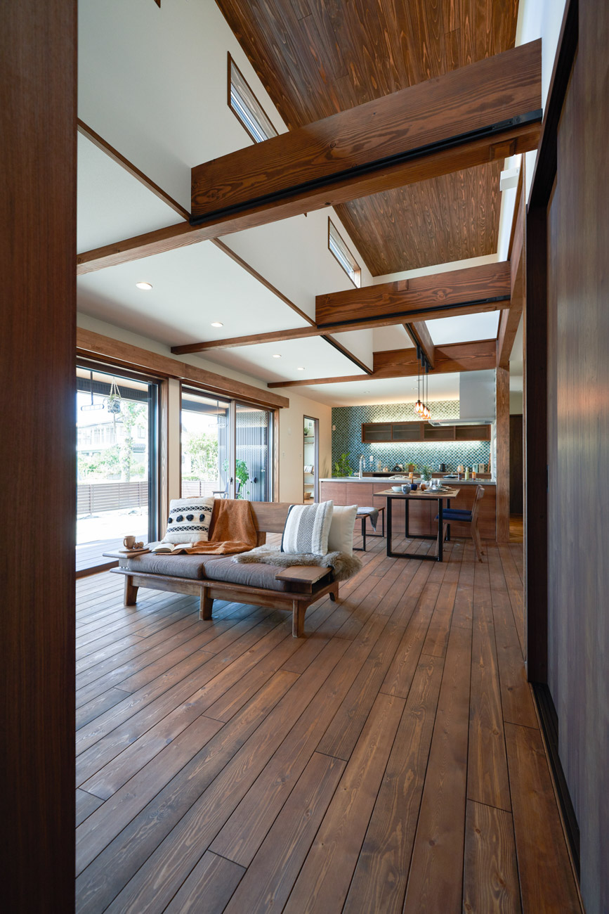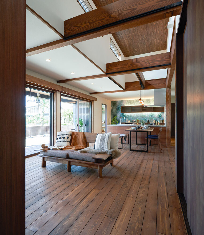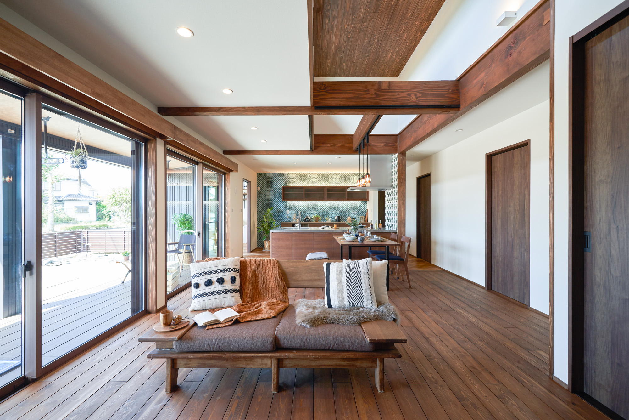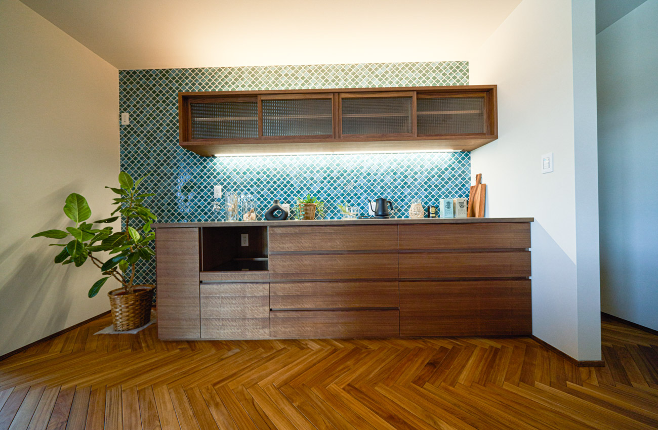 大判タイルが迎える、無垢扉の玄関。ウッドデッキへと繋がる大きな掃き出し窓と、深い下屋。落ち着いた内装と造作キッチンに映える、美しいモザイクタイル。ぐるりと動線の良い家事スペースは、表情豊かなヘリンボーンの床。 家中に建主様のこだわりをちりばめた、悠々と構える平屋の邸宅。 悠々とたたずむ平屋。 約40坪の堂々たる平屋の邸宅。アプローチに60cm角の大判タイルを、玄関ドアはオレンジ塗装の木製扉、壁にはチーク材を使用。リビング幅と同じ大きなウッドデッキにはハンモックフックがあり、家族でのびのびと過ごせるアウトドアリビングとなっています。ブラックの外壁が全体を引き締め男前な外観デザインとなりました。 モダンリビングと美しい造作家具 造作で作られた大きなウォールナットのペニンシュラキッチンと背面収納棚。アクセントに使われているイチョウ型とランタン型のモザイクタイルを、間接照明が美しく照らします。ヘリンボーンの床との相性がよく、品の良いミッドセンチュリーな内装デザイン。TVボードも同じくウォールナット材を使用。エアコンカバーを上手に組み合わせ、スッキリとした空間に。 回遊する家事動線 ランドリールーム→パントリー→キッチンはぐるりと回り込める回遊動線。暮らしやすく家事の動線もスムーズに。ランドリールームからはそのままウッドデッキへ出入りが可能。
