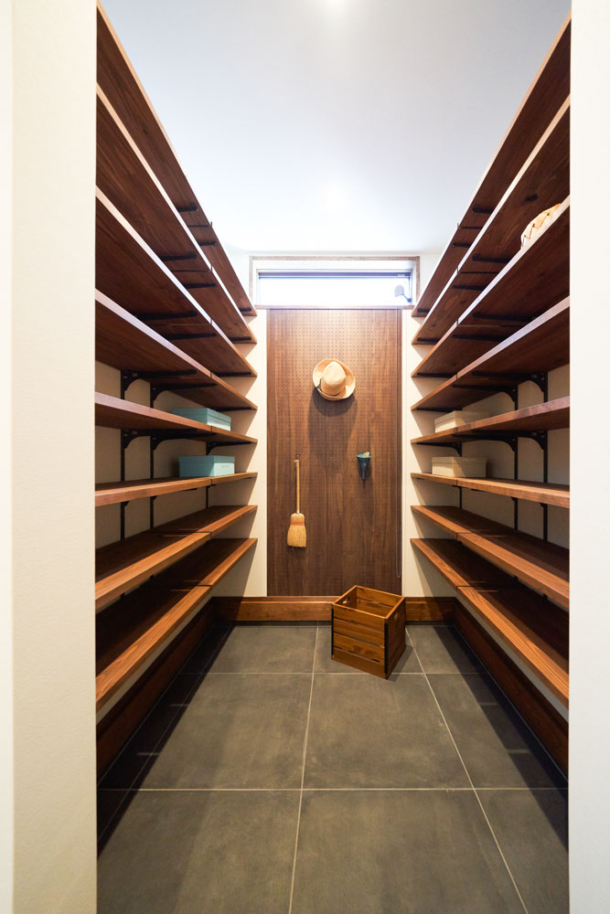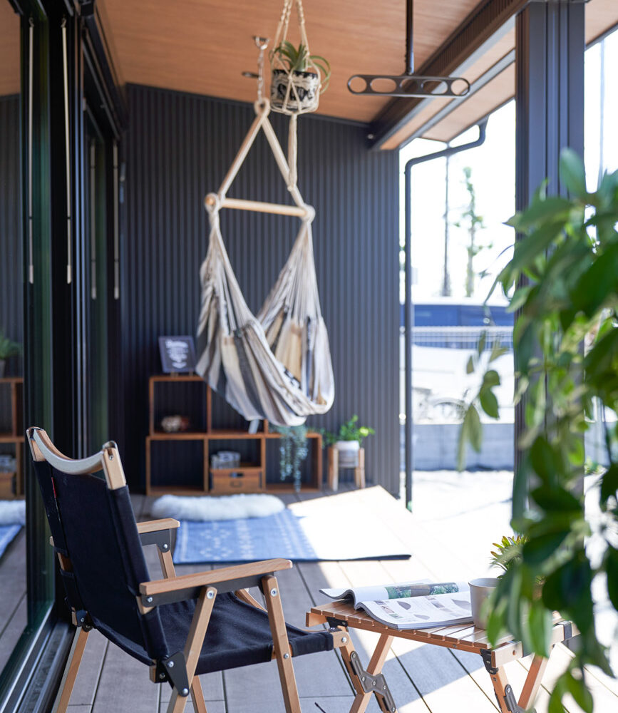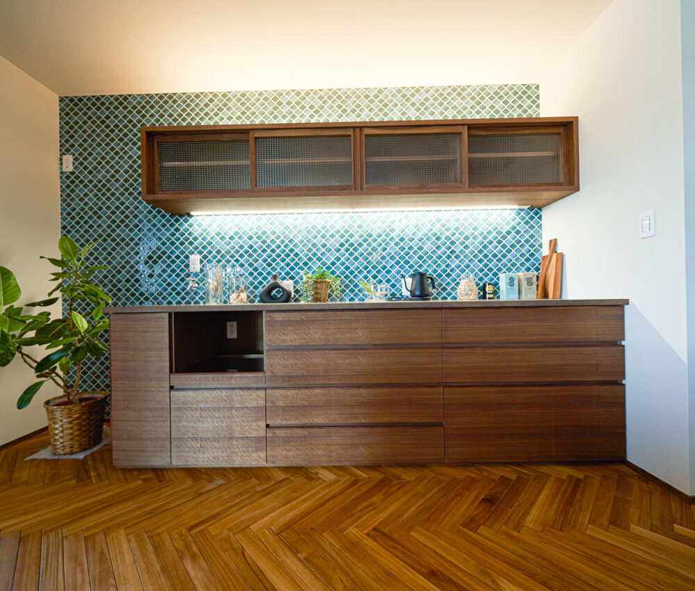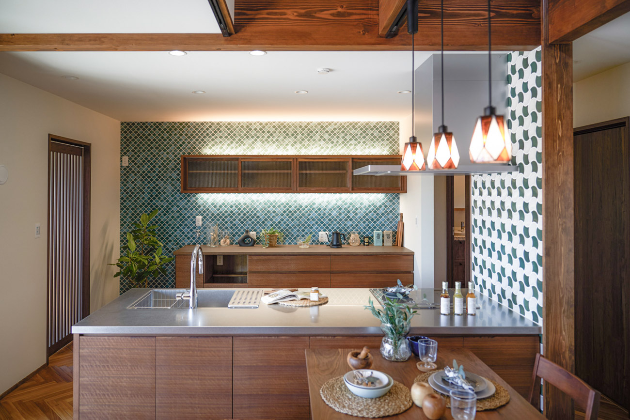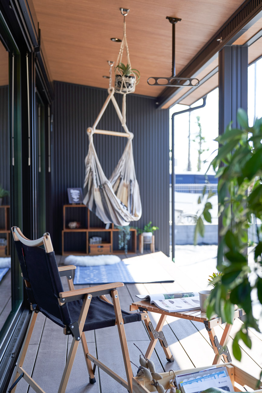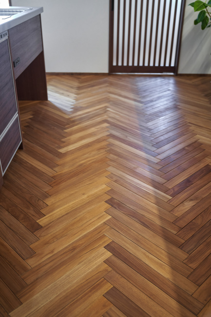 大判タイルが迎える、無垢扉の玄関。ウッドデッキへと繋がる大きな掃き出し窓と、深い下屋。落ち着いた内装と造作キッチンに映える、美しいモザイクタイル。ぐるりと動線の良い家事スペースは、表情豊かなヘリンボーンの床。 家中に建主様のこだわりをちりばめた、悠々と構える平屋の邸宅。 悠々とたたずむ平屋。 約40坪の堂々たる平屋の邸宅。アプローチに60cm角の大判タイルを、玄関ドアはオレンジ塗装の木製扉、壁にはチーク材を使用。リビング幅と同じ大きなウッドデッキにはハンモックフックがあり、家族でのびのびと過ごせるアウトドアリビングとなっています。ブラックの外壁が全体を引き締め男前な外観デザインとなりました。 モダンリビングと美しい造作家具 造作で作られた大きなウォールナットのペニンシュラキッチンと背面収納棚。アクセントに使われているイチョウ型とランタン型のモザイクタイルを、間接照明が美しく照らします。ヘリンボーンの床との相性がよく、品の良いミッドセンチュリーな内装デザイン。TVボードも同じくウォールナット材を使用。エアコンカバーを上手に組み合わせ、スッキリとした空間に。 回遊する家事動線 ランドリールーム→パントリー→キッチンはぐるりと回り込める回遊動線。暮らしやすく家事の動線もスムーズに。ランドリールームからはそのままウッドデッキへ出入りが可能。