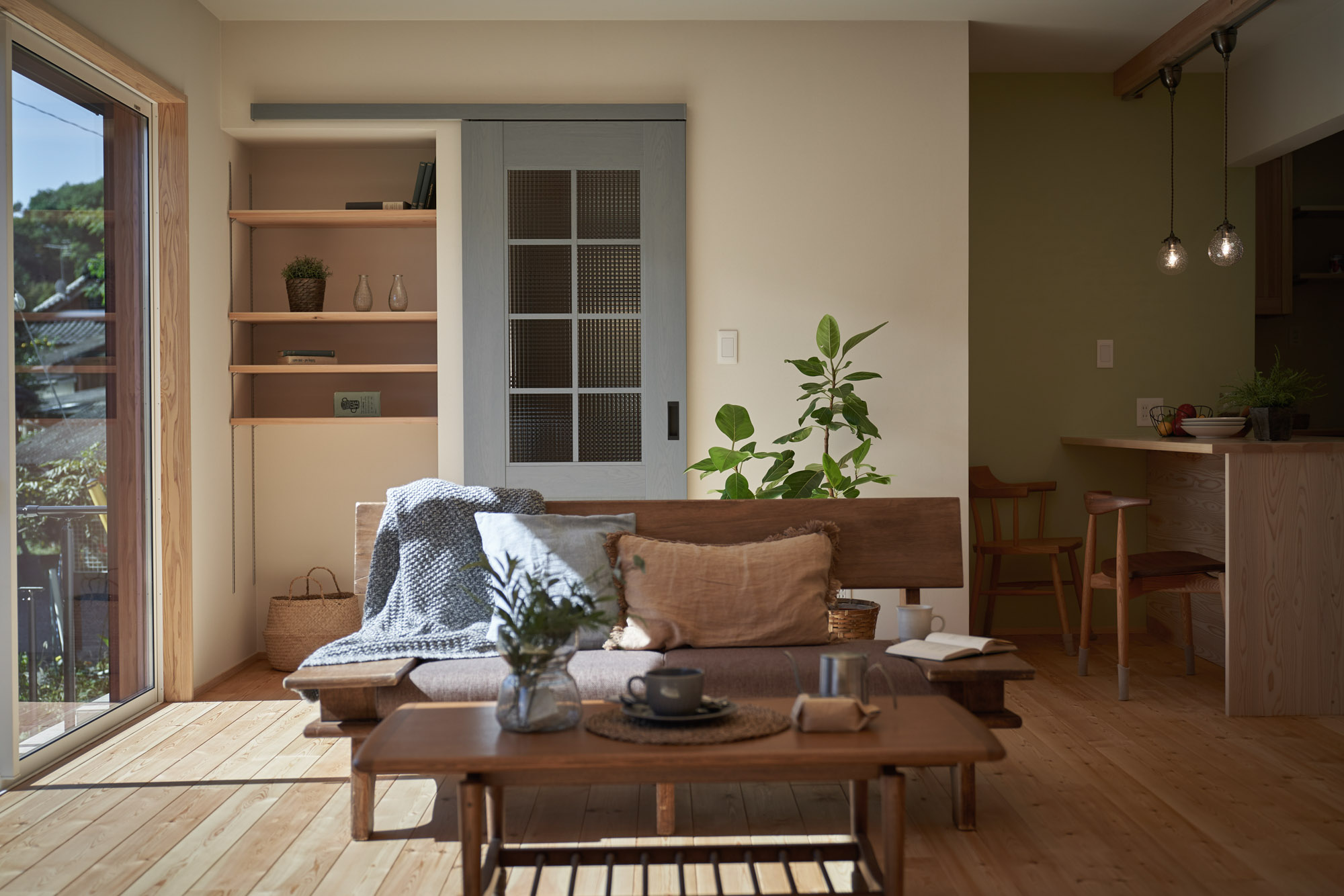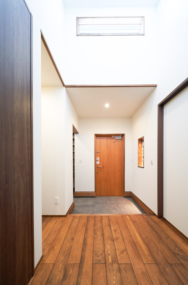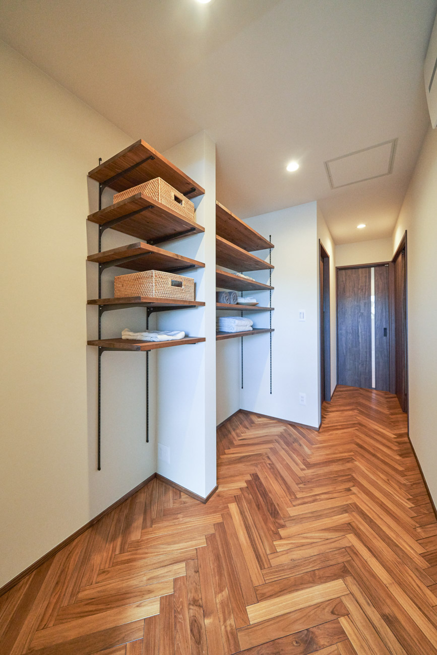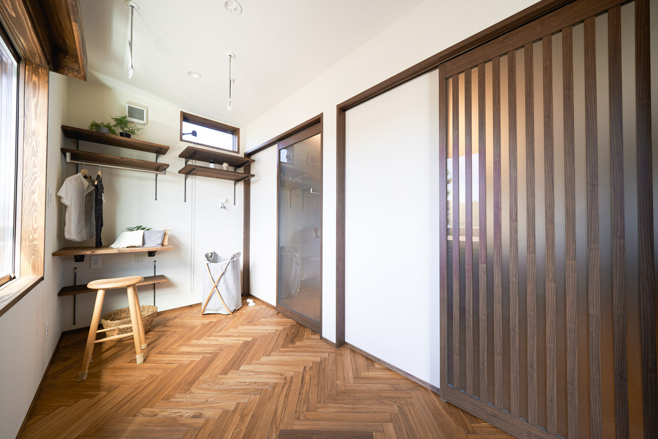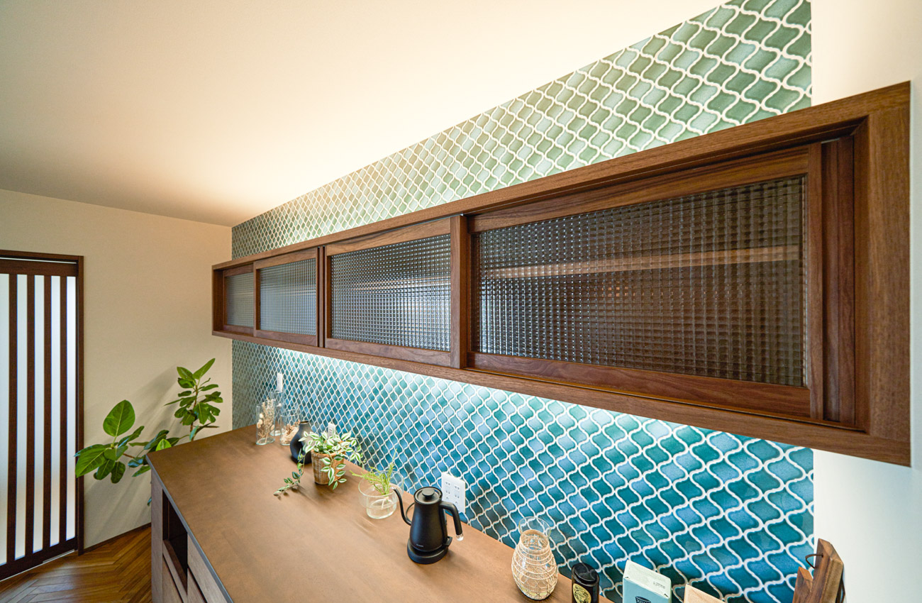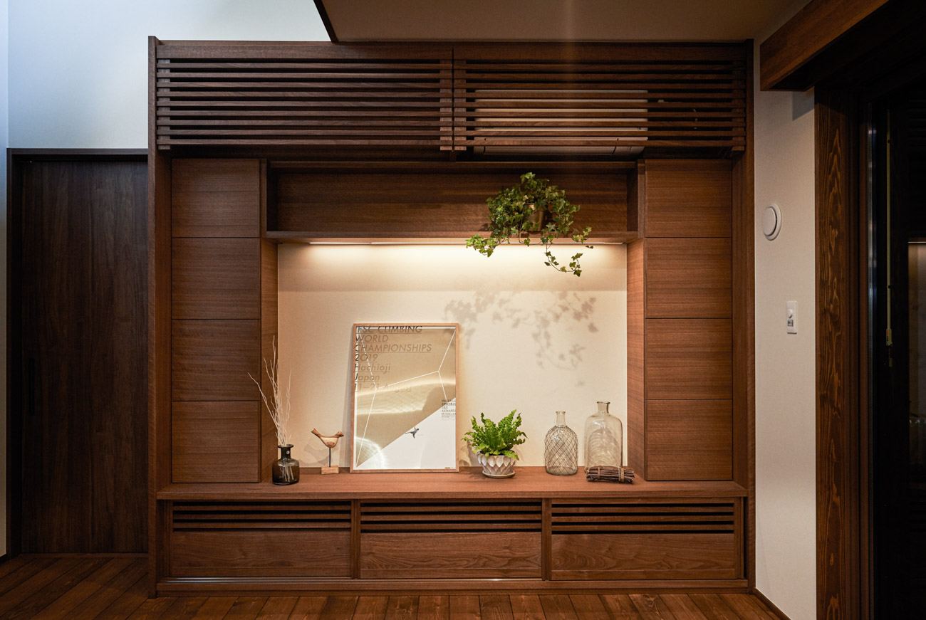 大判タイルが迎える、無垢扉の玄関。ウッドデッキへと繋がる大きな掃き出し窓と、深い下屋。落ち着いた内装と造作キッチンに映える、美しいモザイクタイル。ぐるりと動線の良い家事スペースは、表情豊かなヘリンボーンの床。 家中に建主様のこだわりをちりばめた、悠々と構える平屋の邸宅。 悠々とたたずむ平屋。 約40坪の堂々たる平屋の邸宅。アプローチに60cm角の大判タイルを、玄関ドアはオレンジ塗装の木製扉、壁にはチーク材を使用。リビング幅と同じ大きなウッドデッキにはハンモックフックがあり、家族でのびのびと過ごせるアウトドアリビングとなっています。ブラックの外壁が全体を引き締め男前な外観デザインとなりました。 モダンリビングと美しい造作家具 造作で作られた大きなウォールナットのペニンシュラキッチンと背面収納棚。アクセントに使われているイチョウ型とランタン型のモザイクタイルを、間接照明が美しく照らします。ヘリンボーンの床との相性がよく、品の良いミッドセンチュリーな内装デザイン。TVボードも同じくウォールナット材を使用。エアコンカバーを上手に組み合わせ、スッキリとした空間に。 回遊する家事動線 ランドリールーム→パントリー→キッチンはぐるりと回り込める回遊動線。暮らしやすく家事の動線もスムーズに。ランドリールームからはそのままウッドデッキへ出入りが可能。