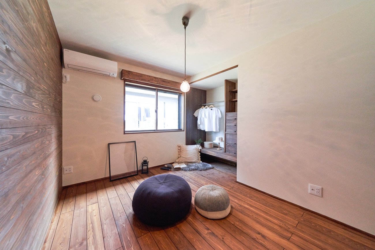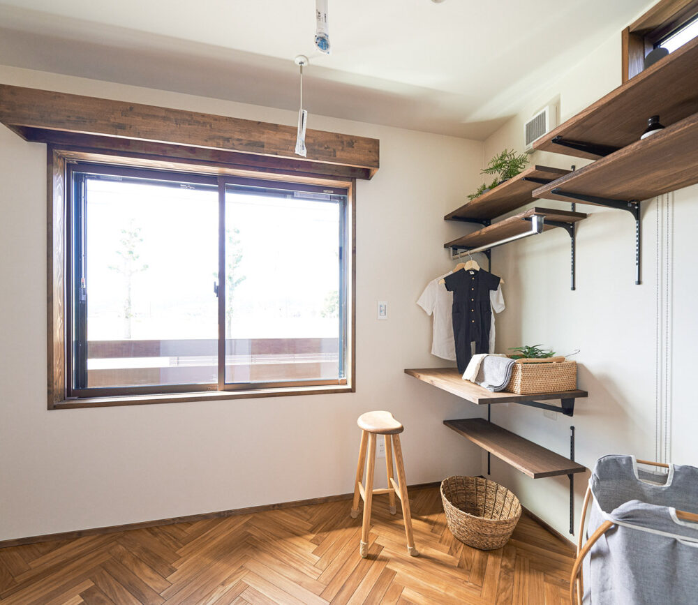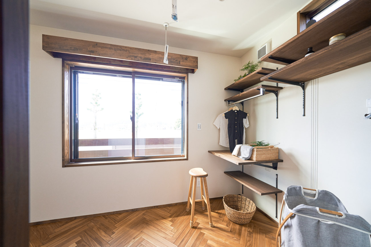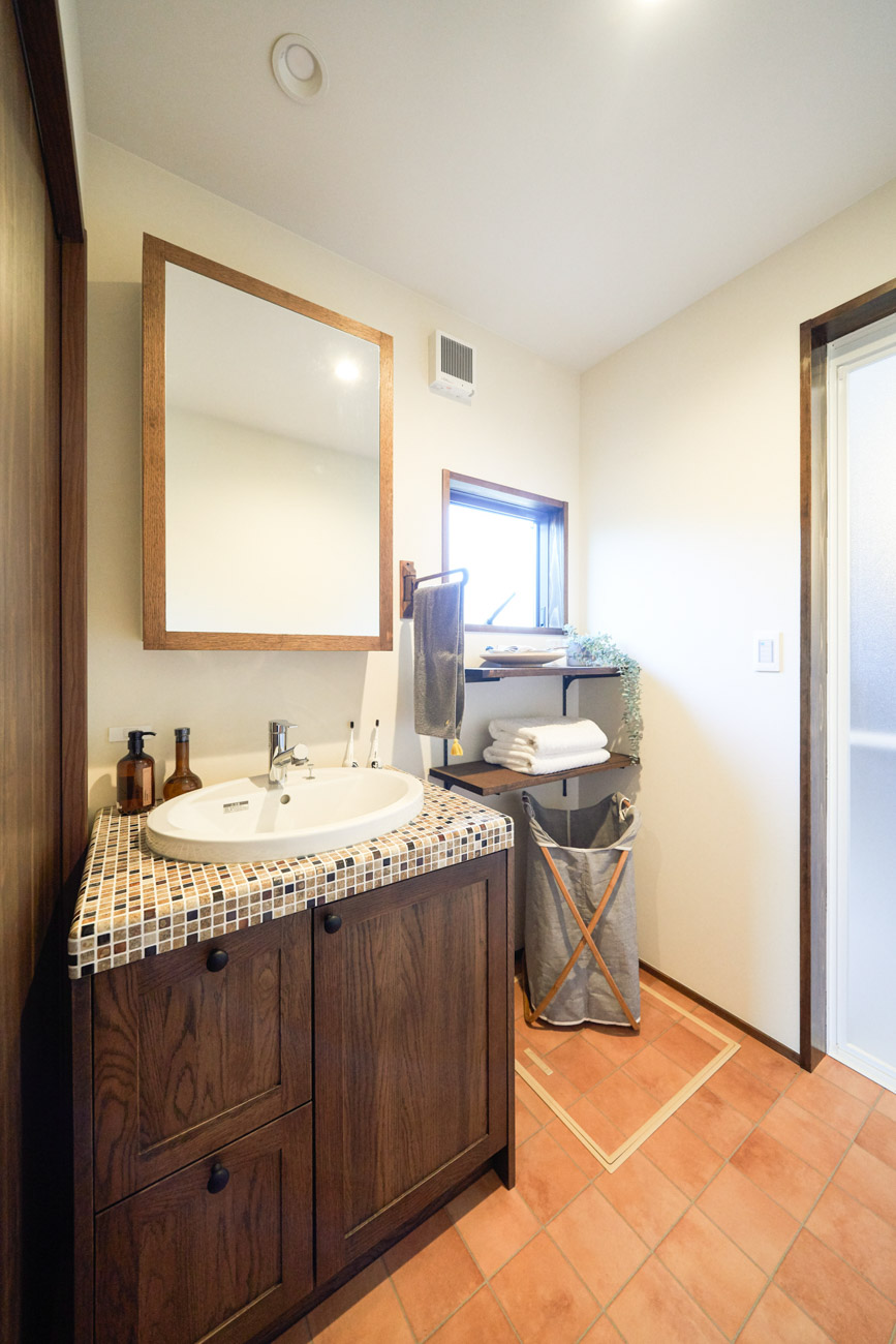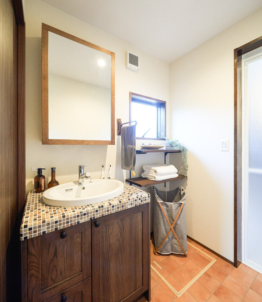 大判タイルが迎える、無垢扉の玄関。ウッドデッキへと繋がる大きな掃き出し窓と、深い下屋。落ち着いた内装と造作キッチンに映える、美しいモザイクタイル。ぐるりと動線の良い家事スペースは、表情豊かなヘリンボーンの床。 家中に建主様のこだわりをちりばめた、悠々と構える平屋の邸宅。 悠々とたたずむ平屋。 約40坪の堂々たる平屋の邸宅。アプローチに60cm角の大判タイルを、玄関ドアはオレンジ塗装の木製扉、壁にはチーク材を使用。リビング幅と同じ大きなウッドデッキにはハンモックフックがあり、家族でのびのびと過ごせるアウトドアリビングとなっています。ブラックの外壁が全体を引き締め男前な外観デザインとなりました。 モダンリビングと美しい造作家具 造作で作られた大きなウォールナットのペニンシュラキッチンと背面収納棚。アクセントに使われているイチョウ型とランタン型のモザイクタイルを、間接照明が美しく照らします。ヘリンボーンの床との相性がよく、品の良いミッドセンチュリーな内装デザイン。TVボードも同じくウォールナット材を使用。エアコンカバーを上手に組み合わせ、スッキリとした空間に。 回遊する家事動線 ランドリールーム→パントリー→キッチンはぐるりと回り込める回遊動線。暮らしやすく家事の動線もスムーズに。ランドリールームからはそのままウッドデッキへ出入りが可能。