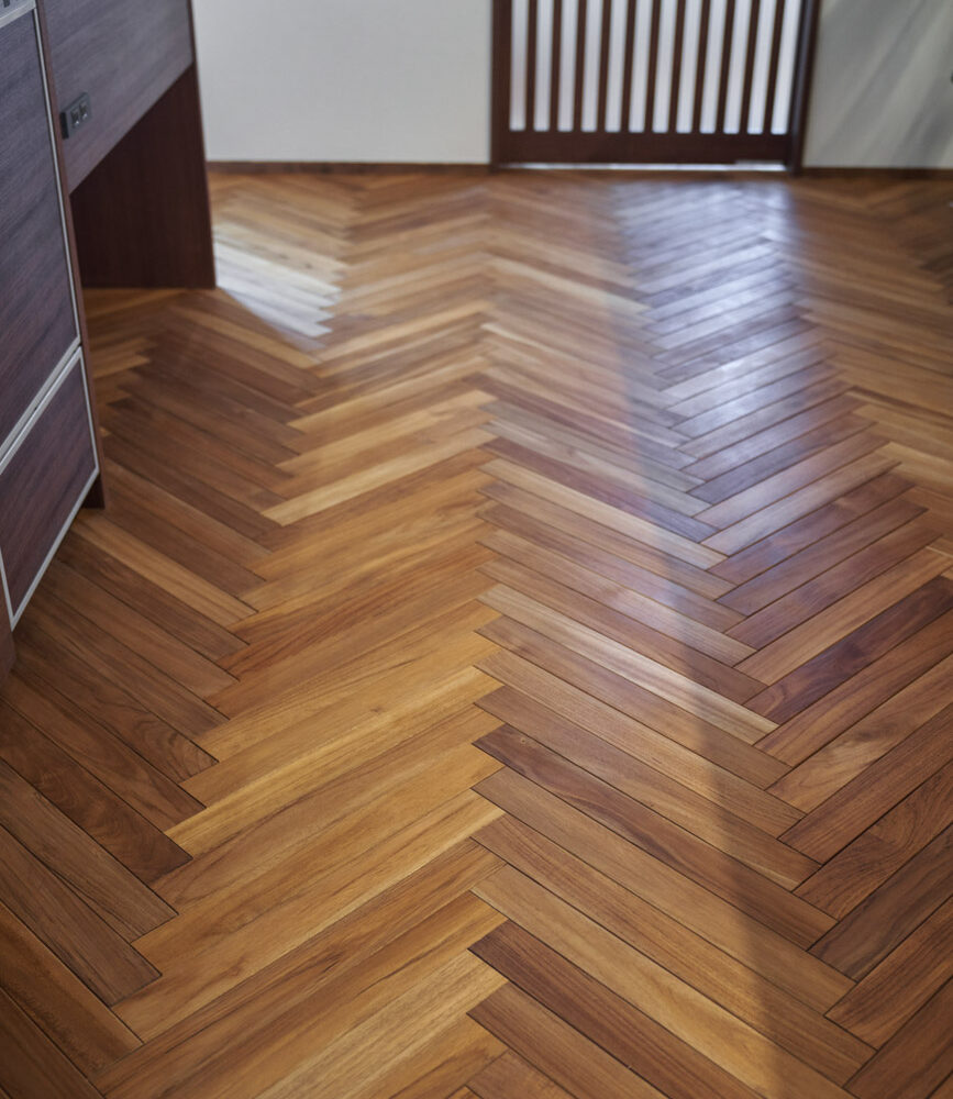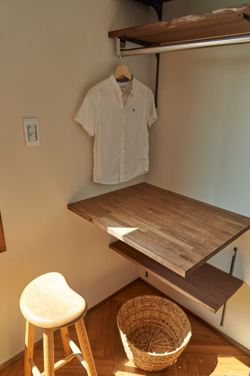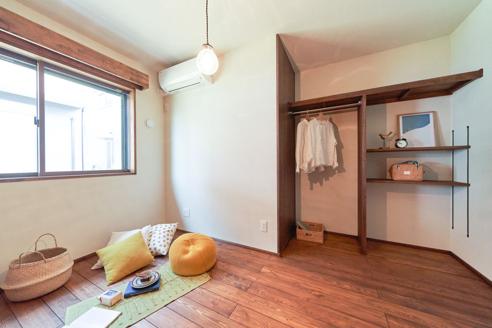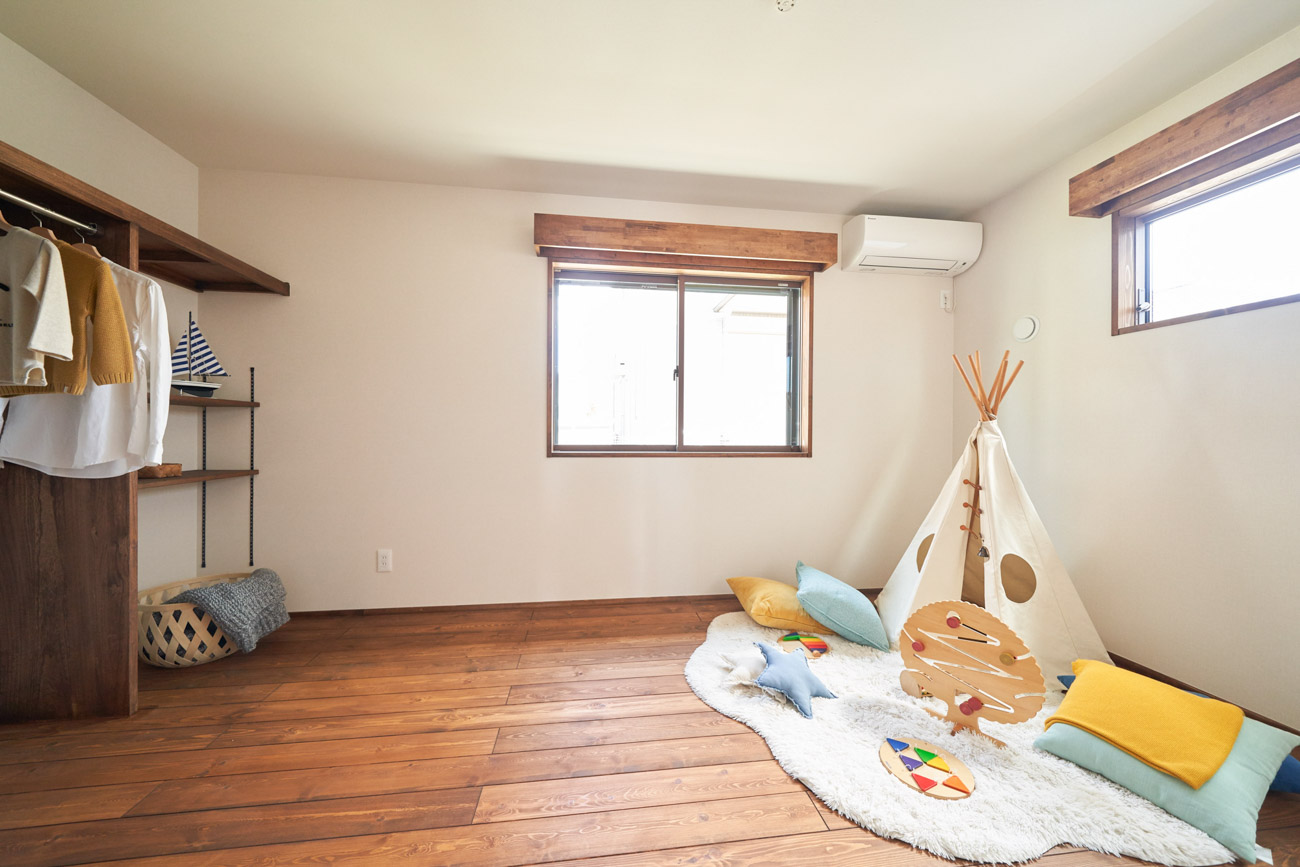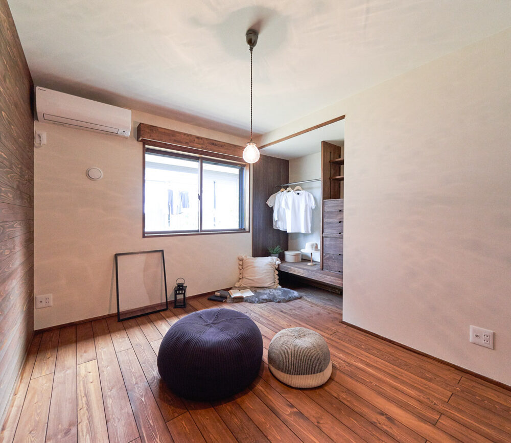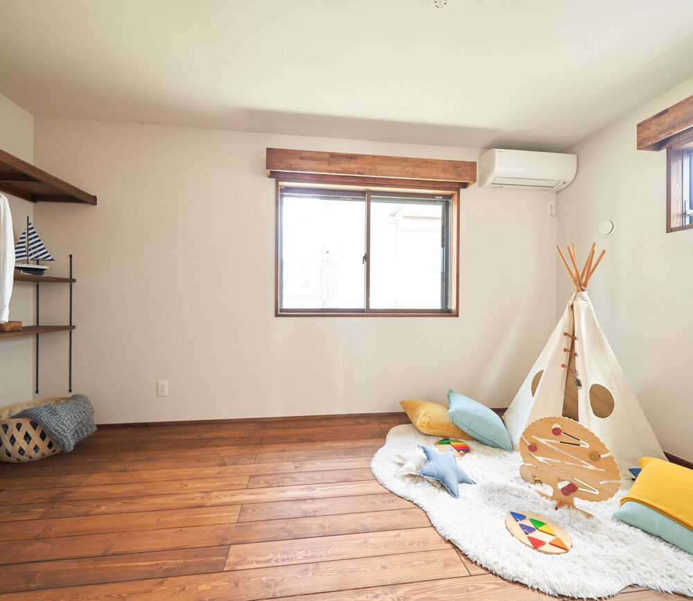 大判タイルが迎える、無垢扉の玄関。ウッドデッキへと繋がる大きな掃き出し窓と、深い下屋。落ち着いた内装と造作キッチンに映える、美しいモザイクタイル。ぐるりと動線の良い家事スペースは、表情豊かなヘリンボーンの床。 家中に建主様のこだわりをちりばめた、悠々と構える平屋の邸宅。 悠々とたたずむ平屋。 約40坪の堂々たる平屋の邸宅。アプローチに60cm角の大判タイルを、玄関ドアはオレンジ塗装の木製扉、壁にはチーク材を使用。リビング幅と同じ大きなウッドデッキにはハンモックフックがあり、家族でのびのびと過ごせるアウトドアリビングとなっています。ブラックの外壁が全体を引き締め男前な外観デザインとなりました。 モダンリビングと美しい造作家具 造作で作られた大きなウォールナットのペニンシュラキッチンと背面収納棚。アクセントに使われているイチョウ型とランタン型のモザイクタイルを、間接照明が美しく照らします。ヘリンボーンの床との相性がよく、品の良いミッドセンチュリーな内装デザイン。TVボードも同じくウォールナット材を使用。エアコンカバーを上手に組み合わせ、スッキリとした空間に。 回遊する家事動線 ランドリールーム→パントリー→キッチンはぐるりと回り込める回遊動線。暮らしやすく家事の動線もスムーズに。ランドリールームからはそのままウッドデッキへ出入りが可能。