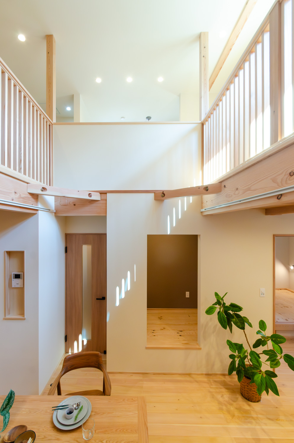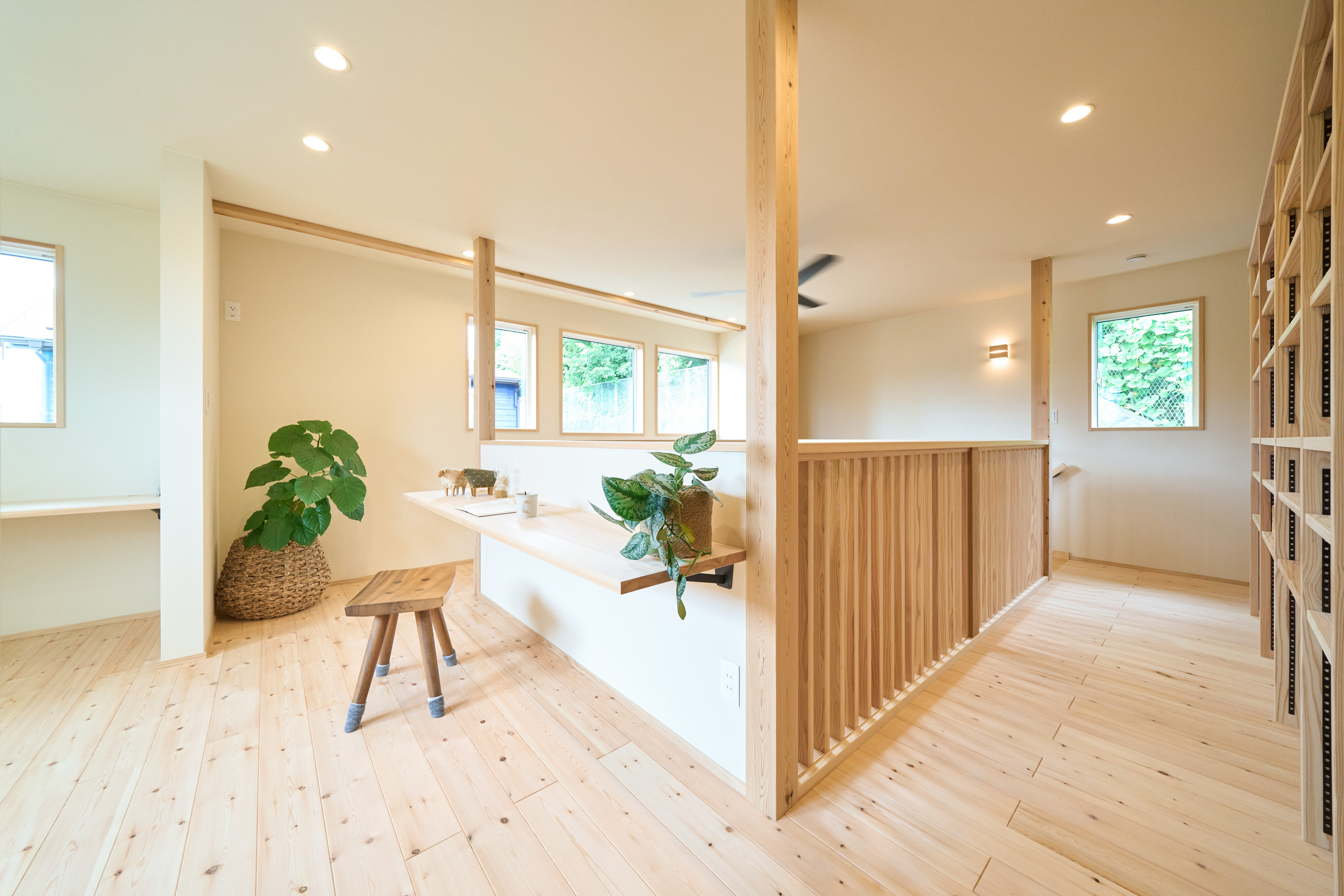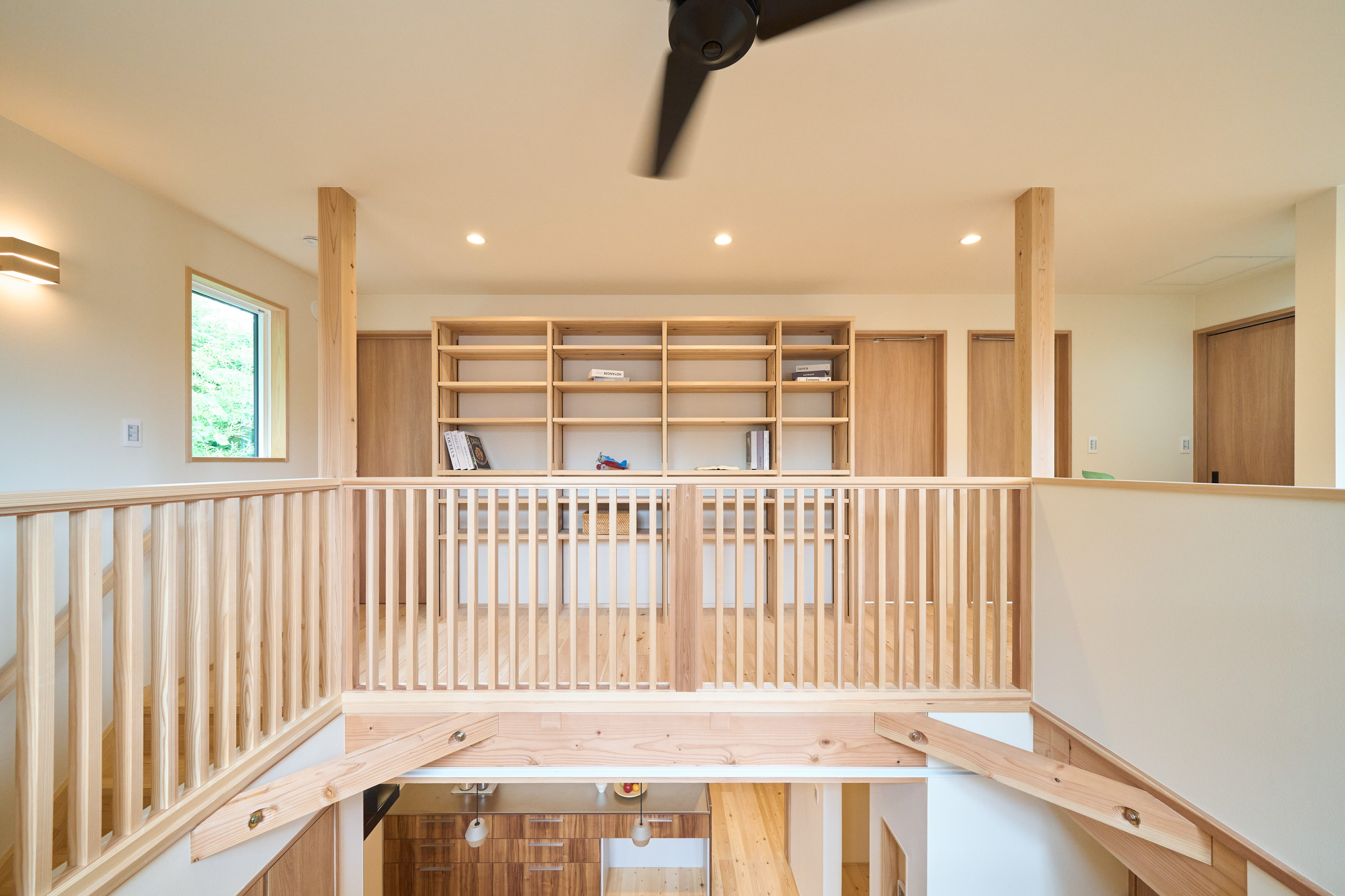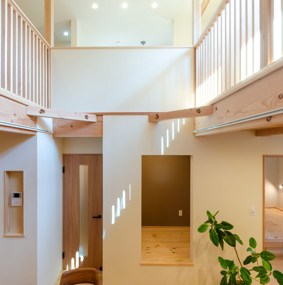 住空間の真ん中に位置する吹き抜けにはキャットウォークを設置し、子供達がぐるりと走り回れたり採光窓の掃除もしやすい設計に。