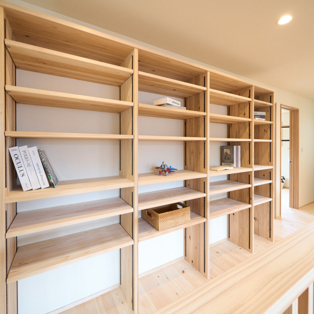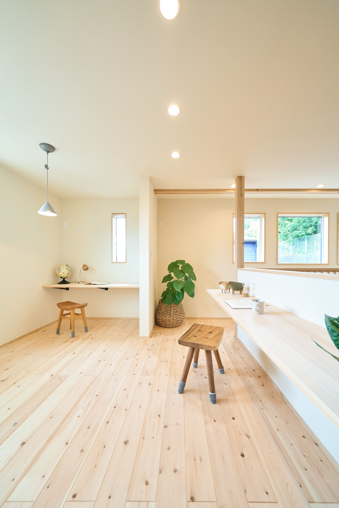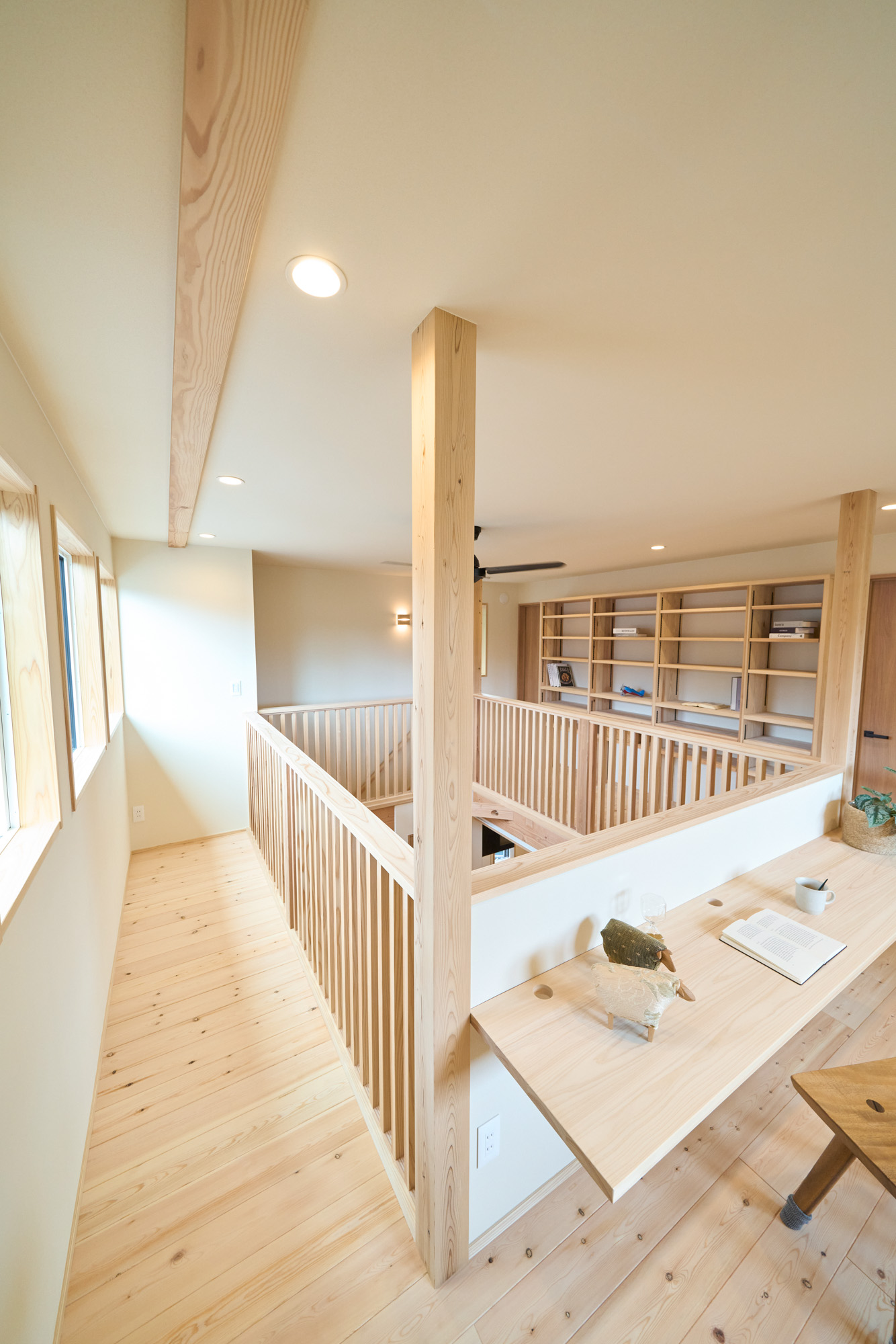 住空間の真ん中に位置する吹き抜けにはキャットウォークを設置し、子供達がぐるりと走り回れたり採光窓の掃除もしやすい設計に。