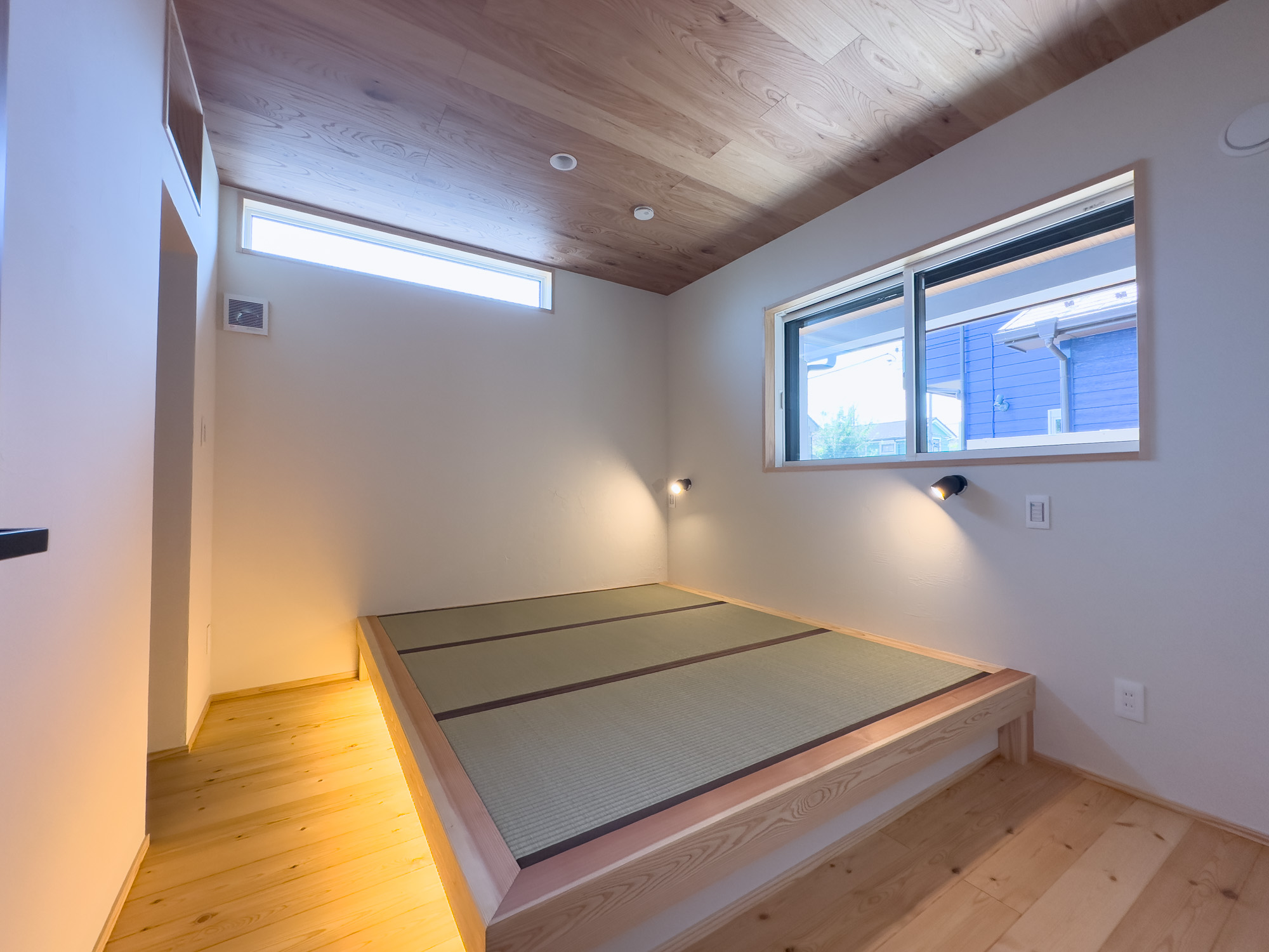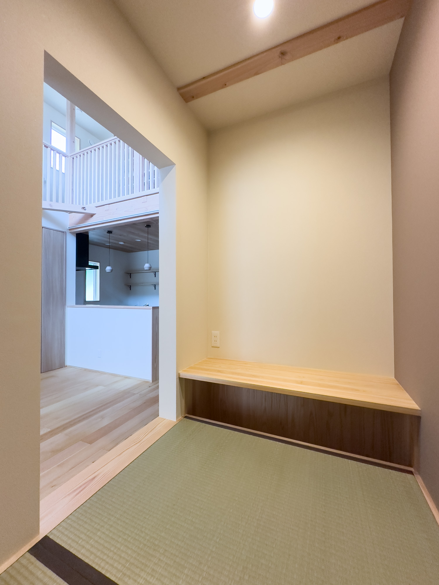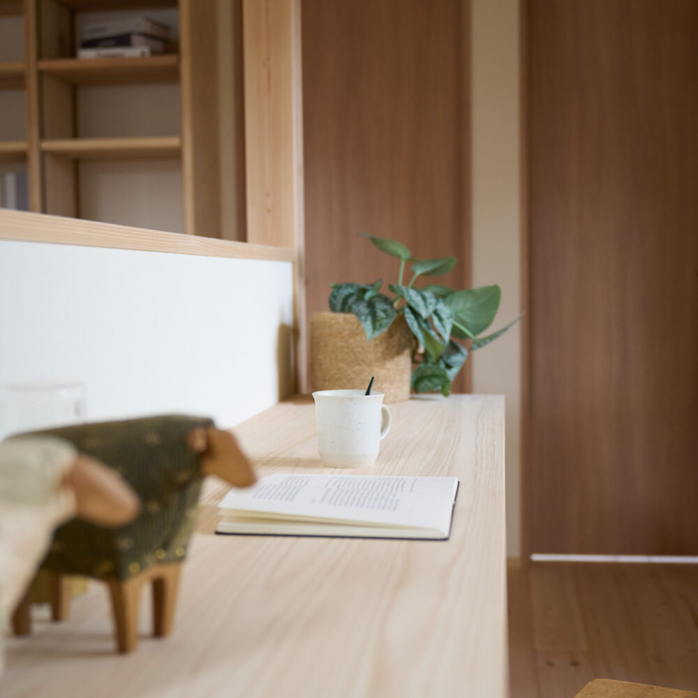 リビングの脇には文机もある畳のヌックを設置。こもれる感じがちょうど良い憩いの場所となりました。主寝室には足元間接照明のある小上がり畳ベッドを造作。奥行きのある大容量のクローゼットを設えました。