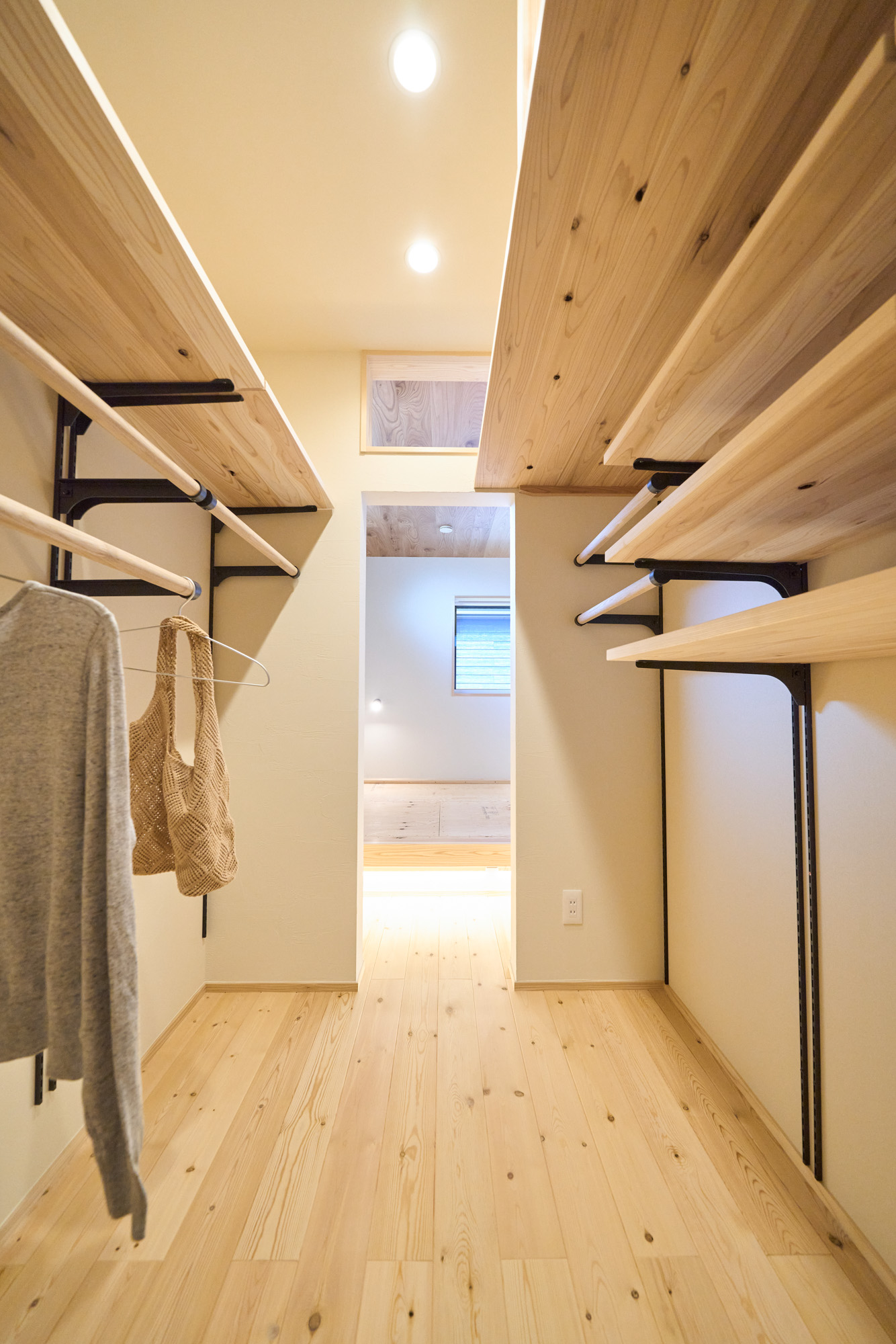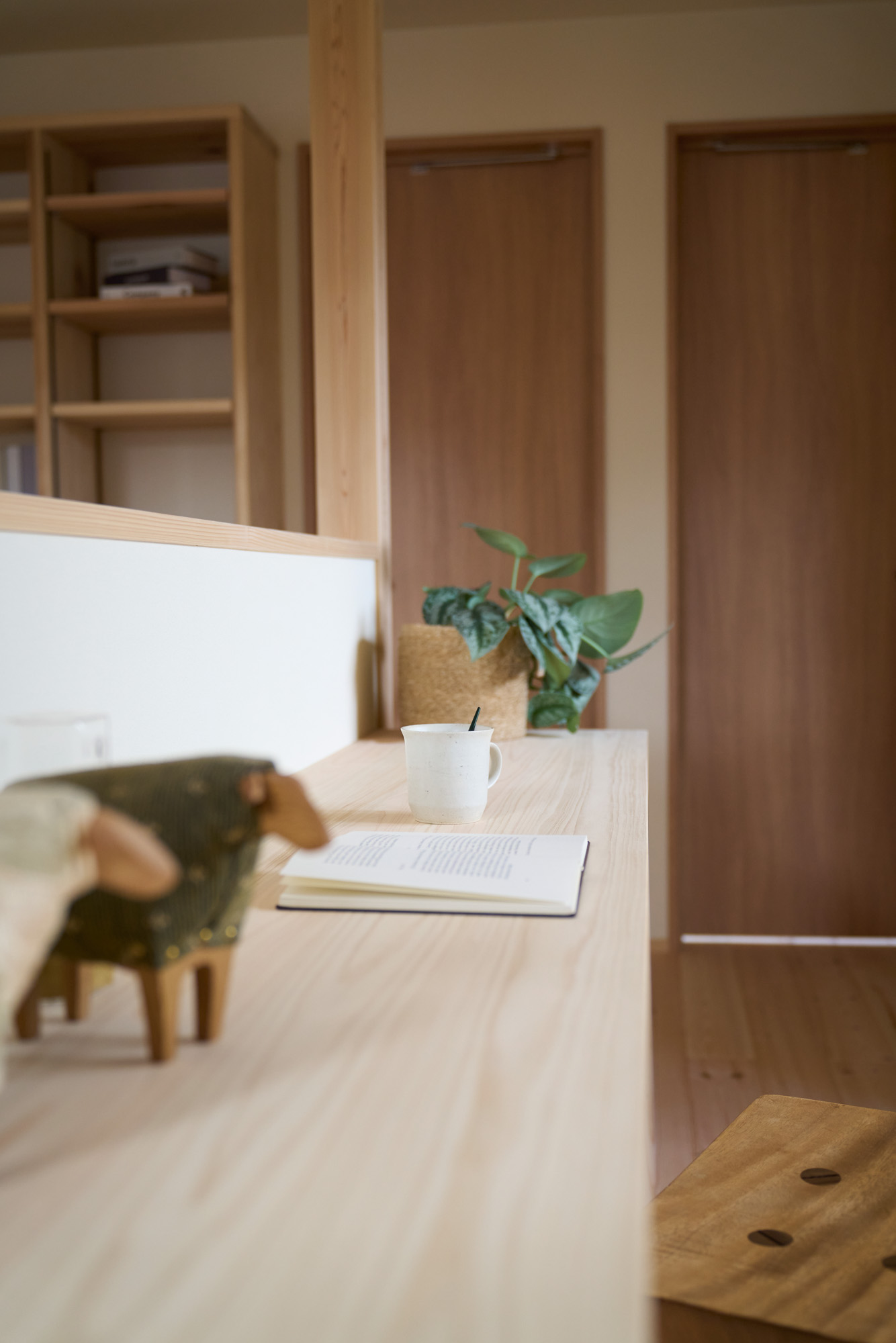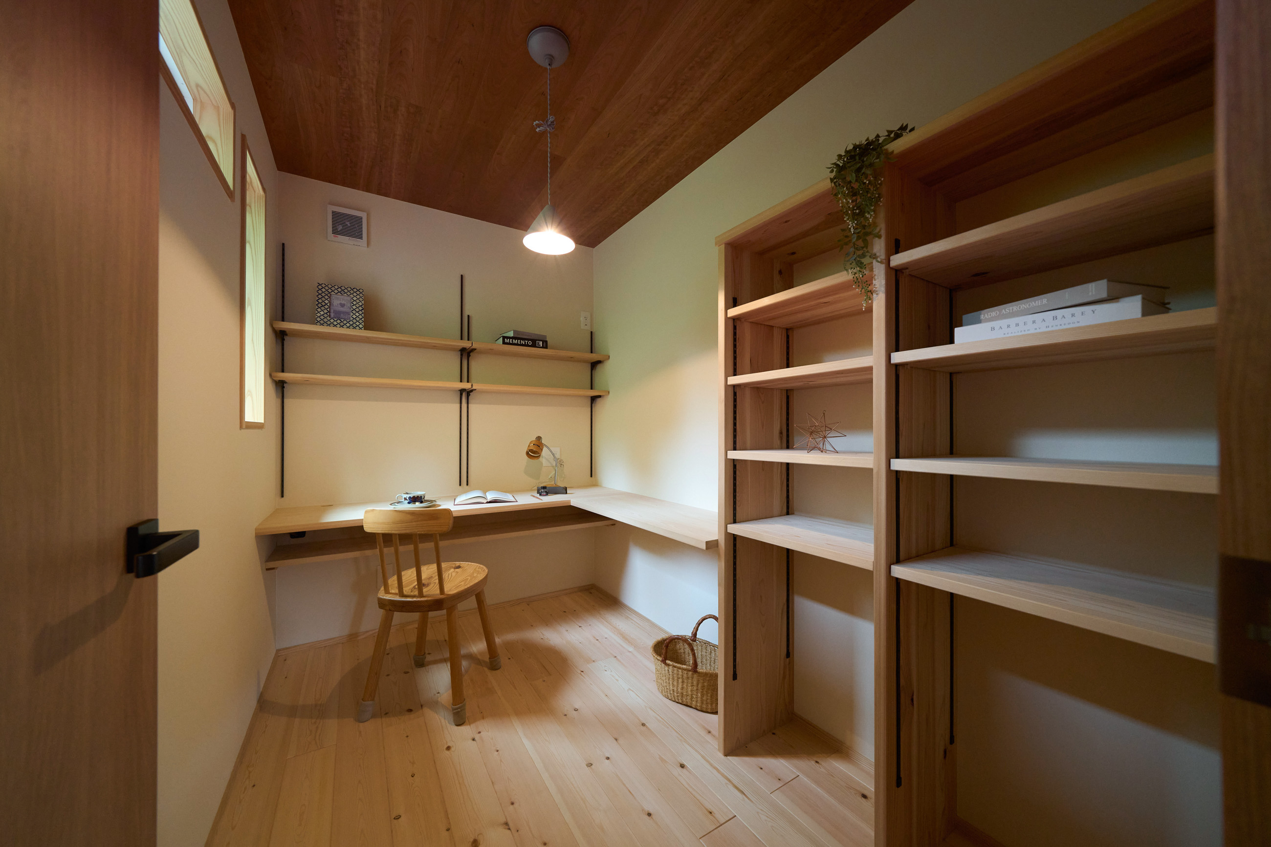 リビングの脇には文机もある畳のヌックを設置。こもれる感じがちょうど良い憩いの場所となりました。主寝室には足元間接照明のある小上がり畳ベッドを造作。奥行きのある大容量のクローゼットを設えました。