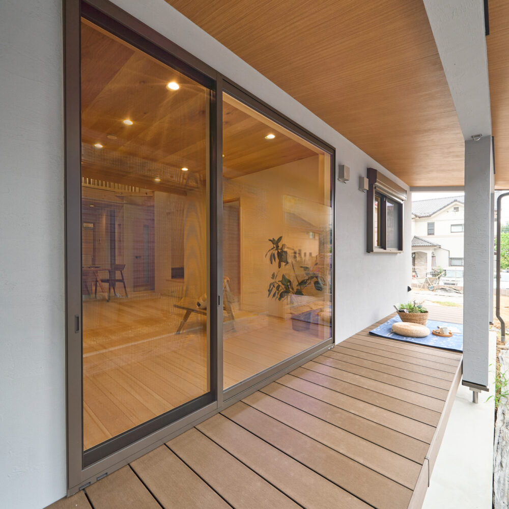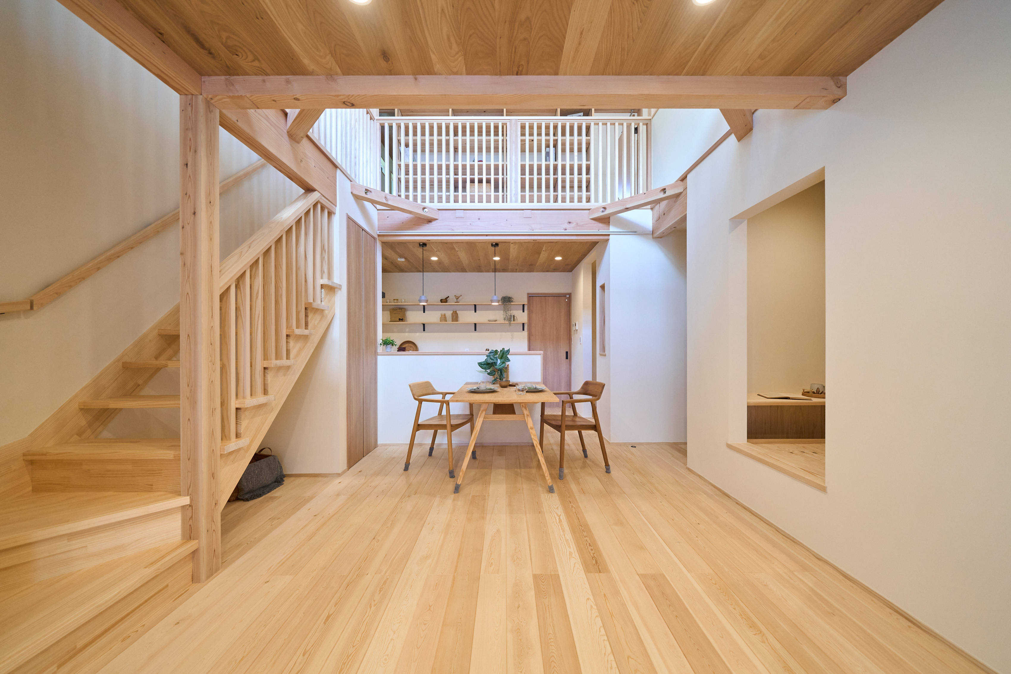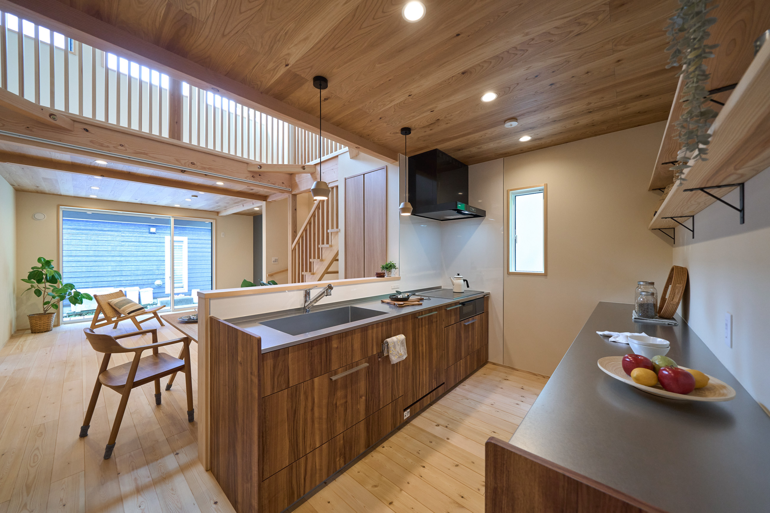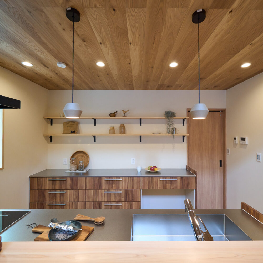 1階に生活設備と主寝室を集約した、将来的に平屋のように暮らせる1階完結型の間取りを採用。リビングとキッチンの天井には表情の良いハルニレ材を使用。掃き出し窓からは大きな下屋のウッドデッキへと続きます。将来的にペレットストーブを導入できるよう、リビングの一角にはタイルの床と給気口を準備してあります。