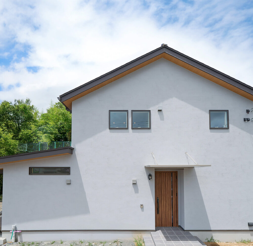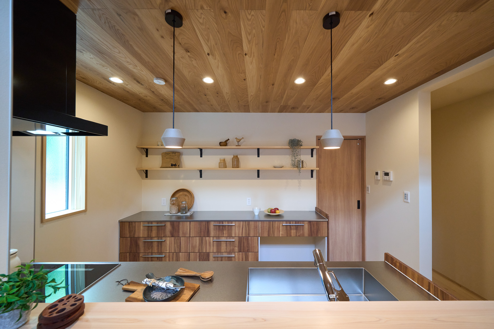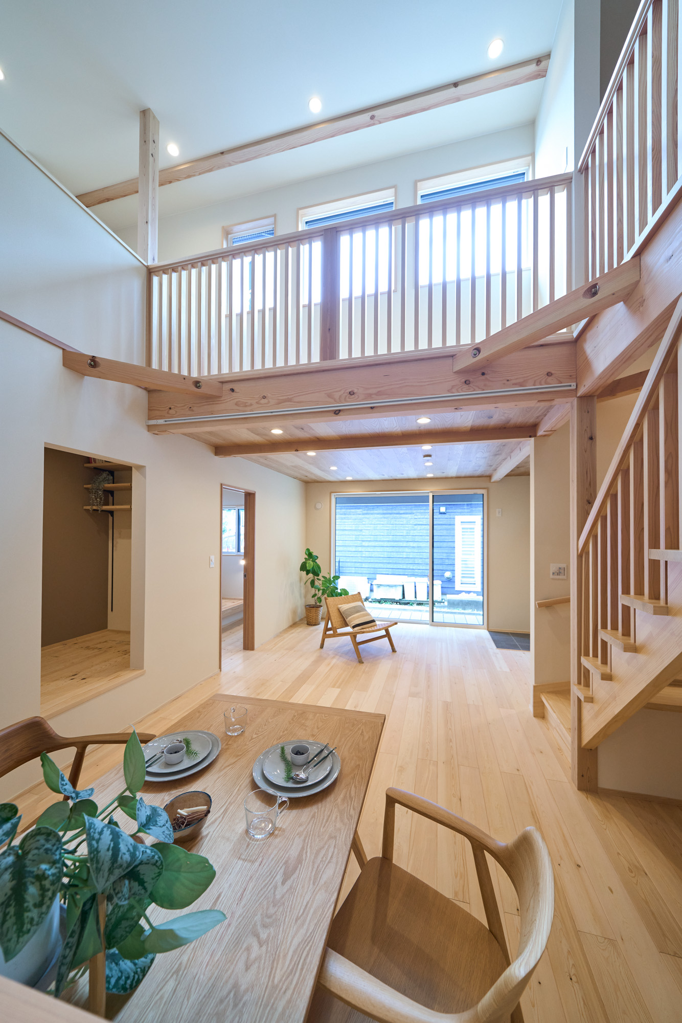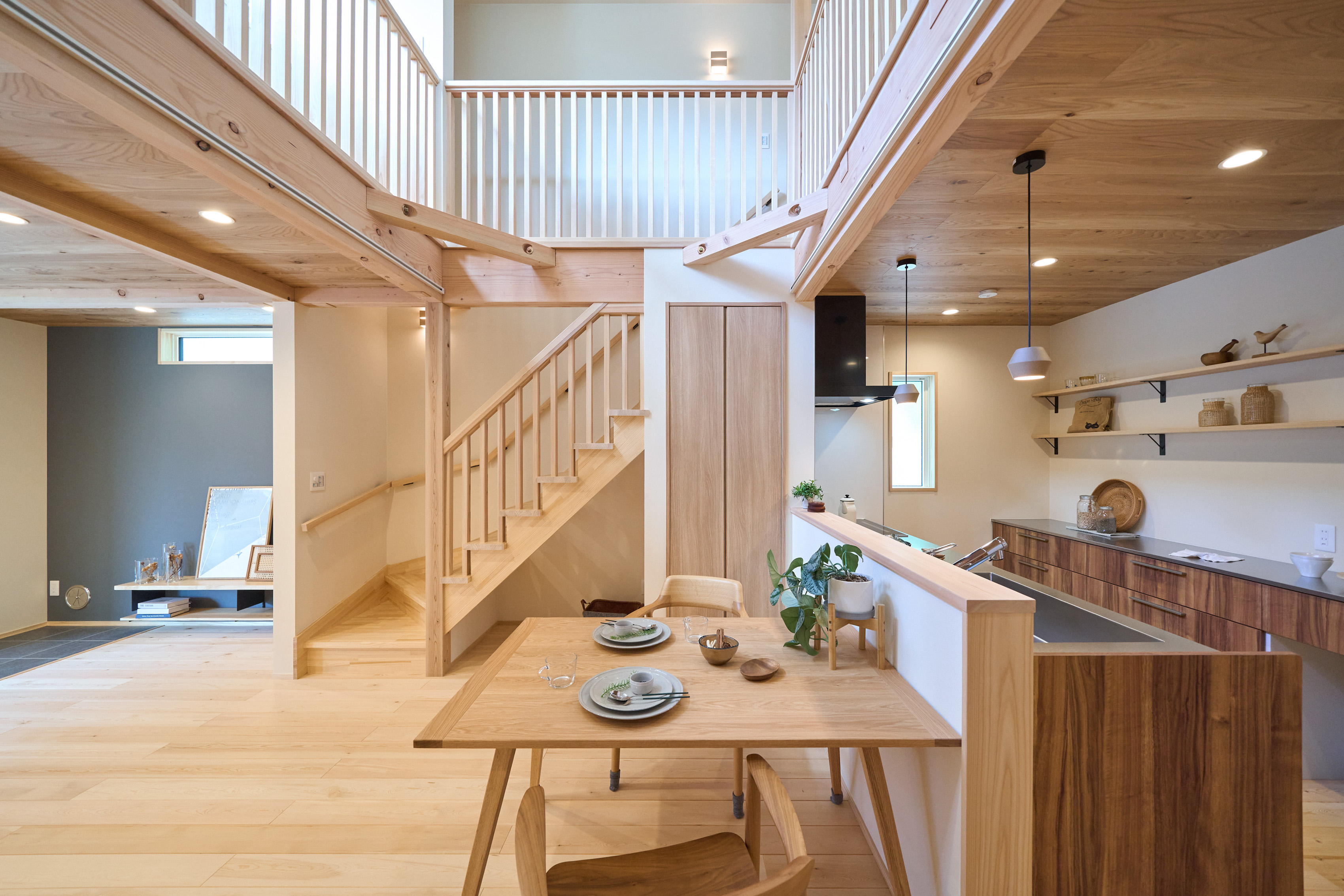 1階に生活設備と主寝室を集約した、将来的に平屋のように暮らせる1階完結型の間取りを採用。リビングとキッチンの天井には表情の良いハルニレ材を使用。掃き出し窓からは大きな下屋のウッドデッキへと続きます。将来的にペレットストーブを導入できるよう、リビングの一角にはタイルの床と給気口を準備してあります。
