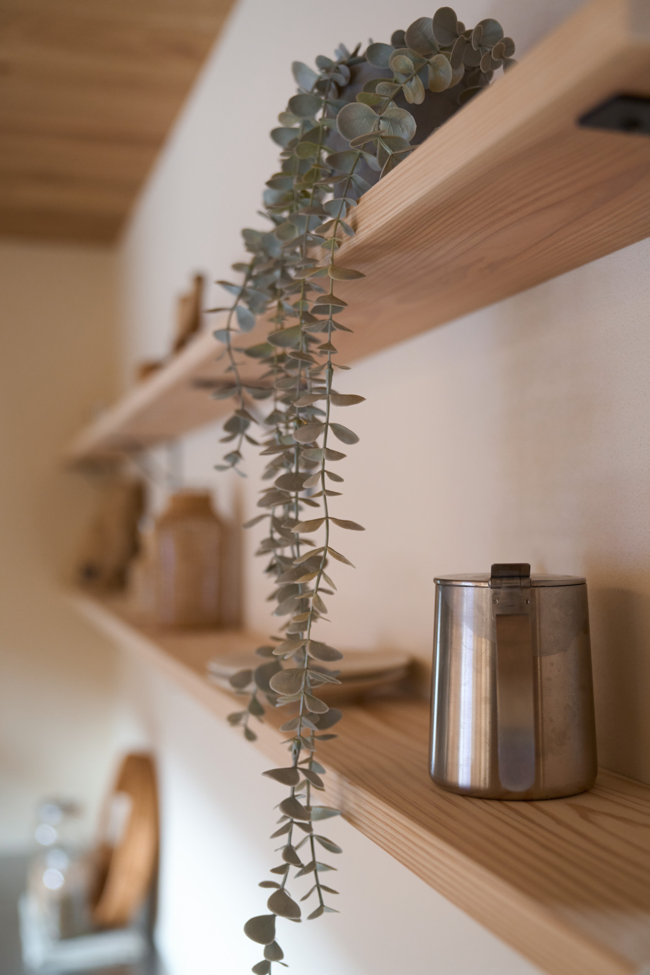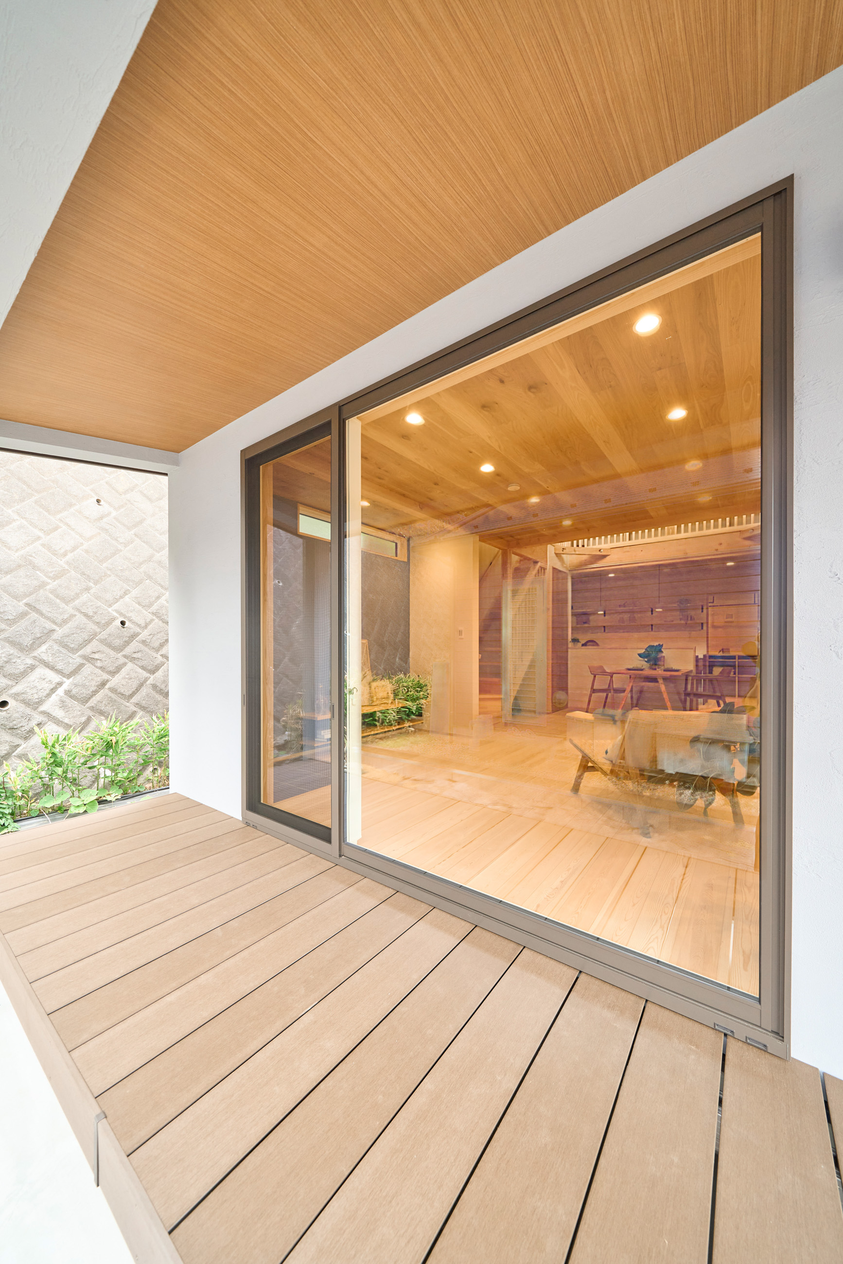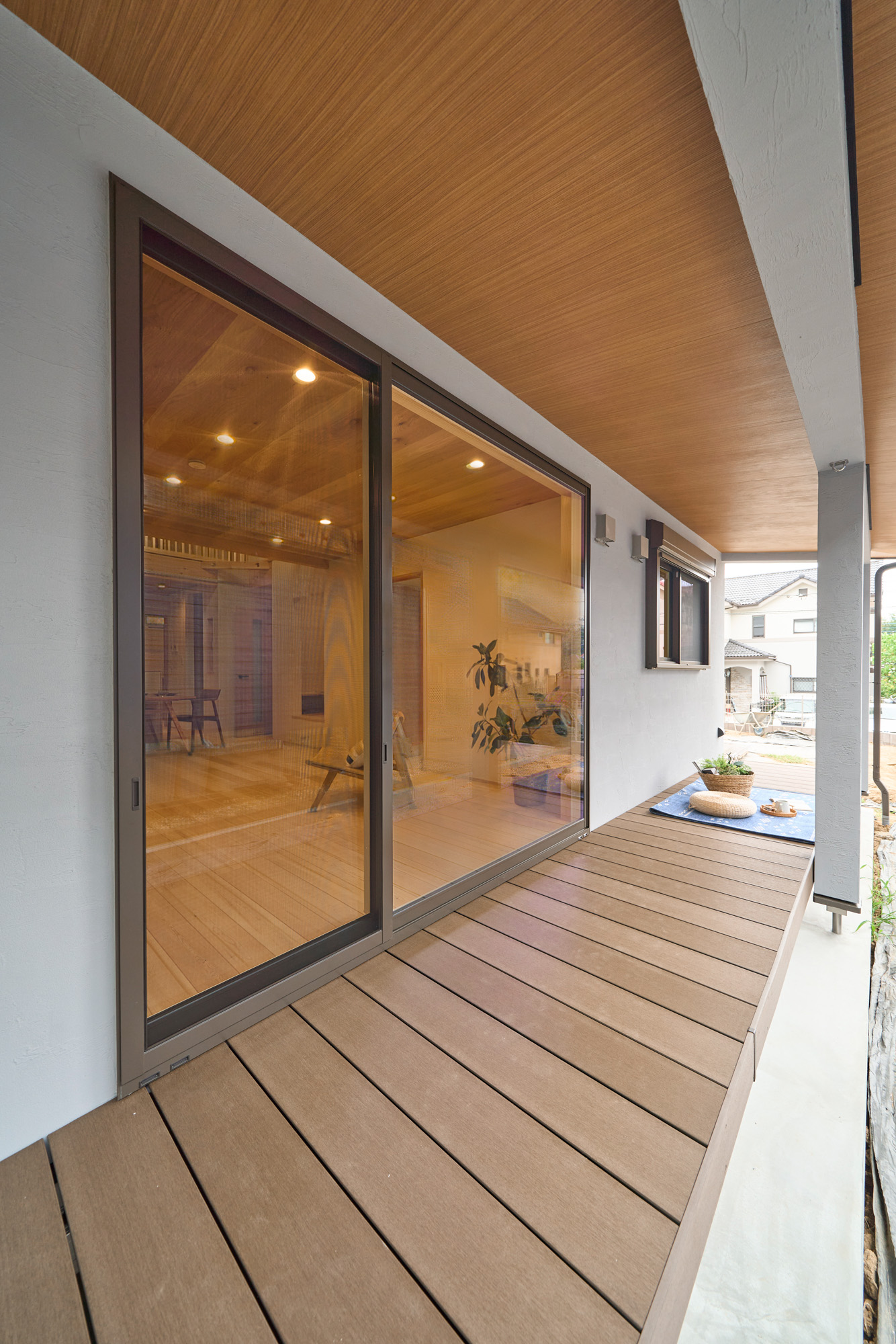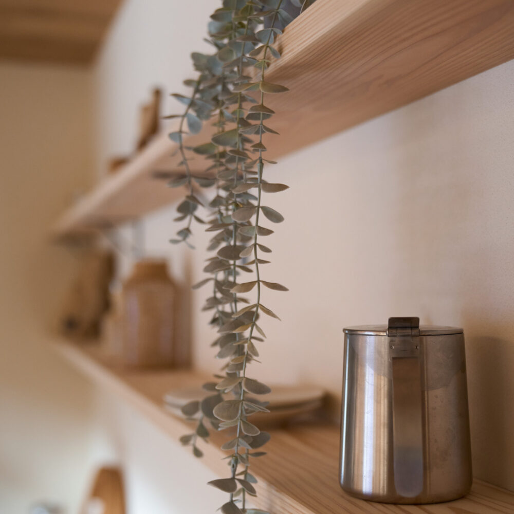 1階に生活設備と主寝室を集約した、将来的に平屋のように暮らせる1階完結型の間取りを採用。リビングとキッチンの天井には表情の良いハルニレ材を使用。掃き出し窓からは大きな下屋のウッドデッキへと続きます。将来的にペレットストーブを導入できるよう、リビングの一角にはタイルの床と給気口を準備してあります。