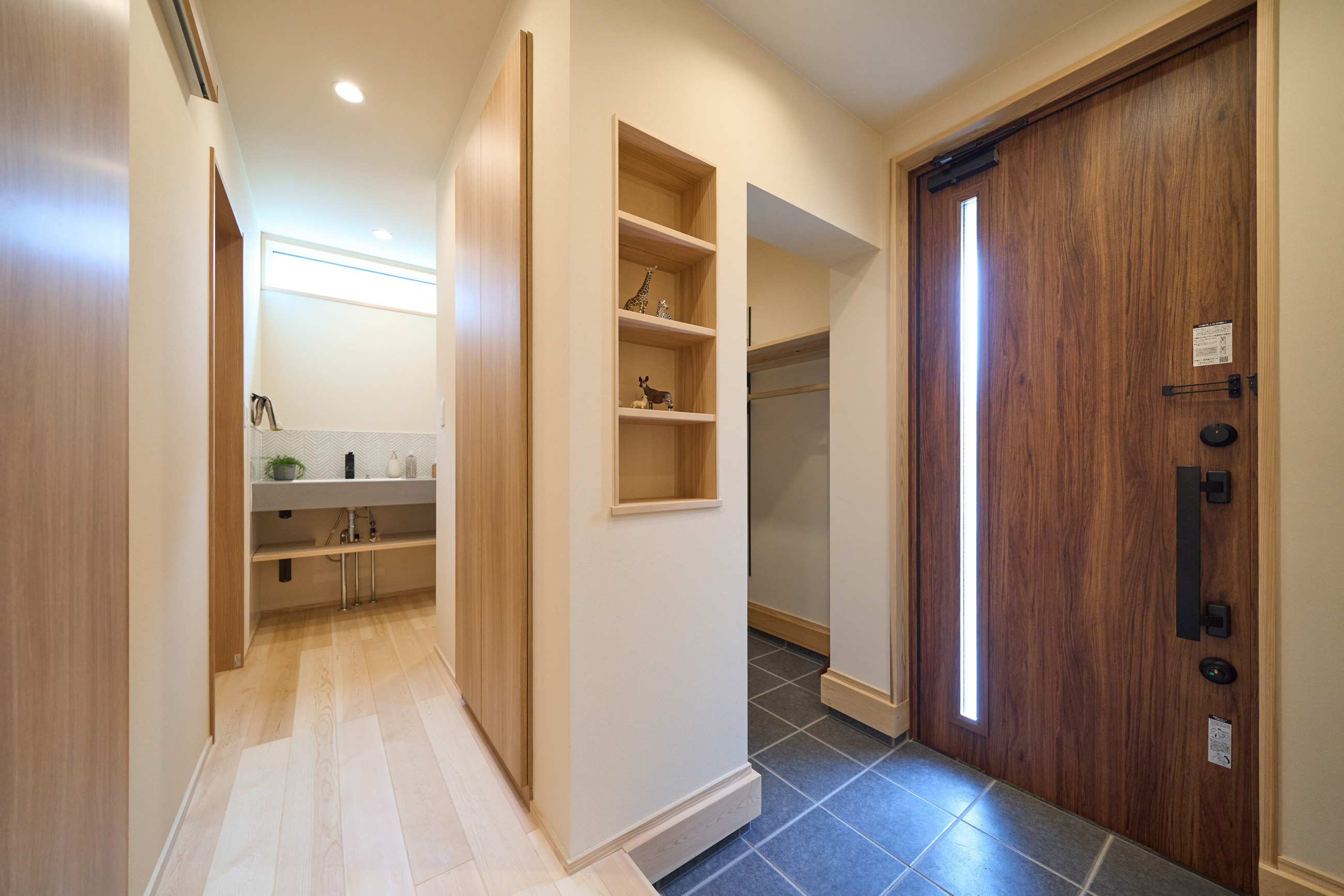 ①玄関→シューズクローク→洗面室→家事室