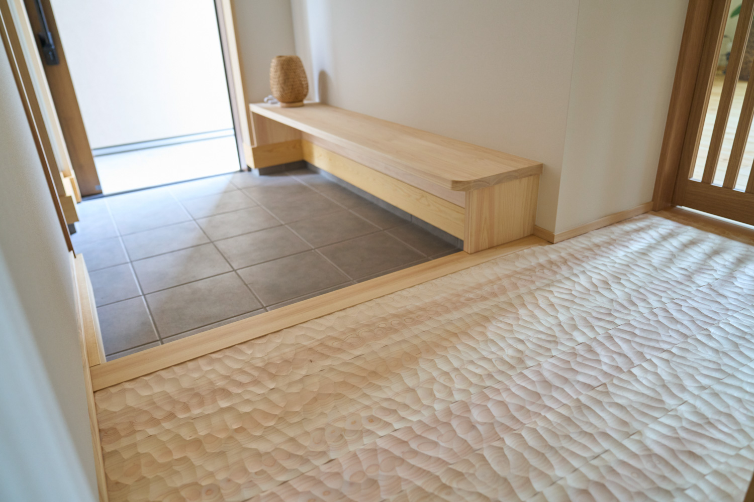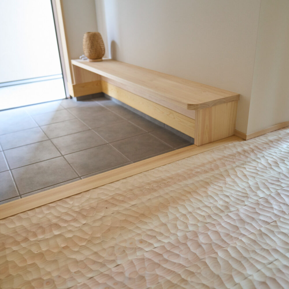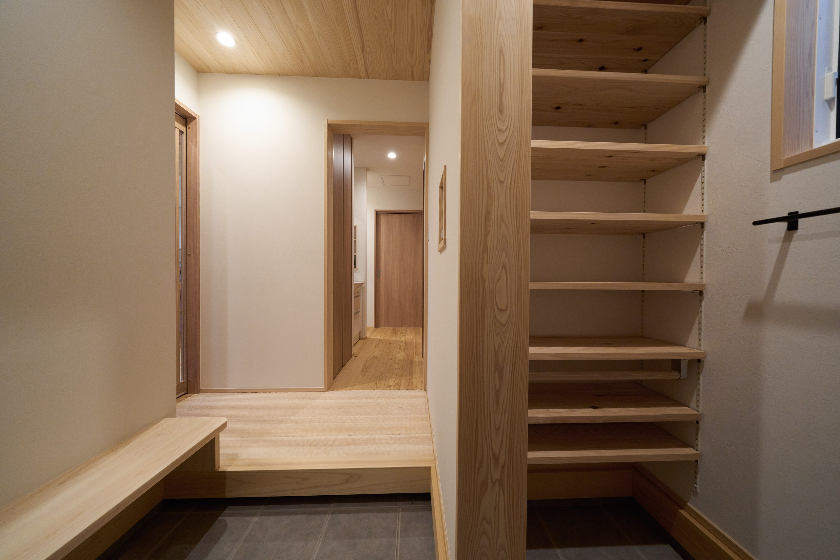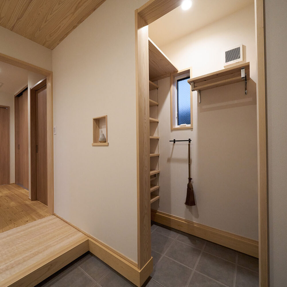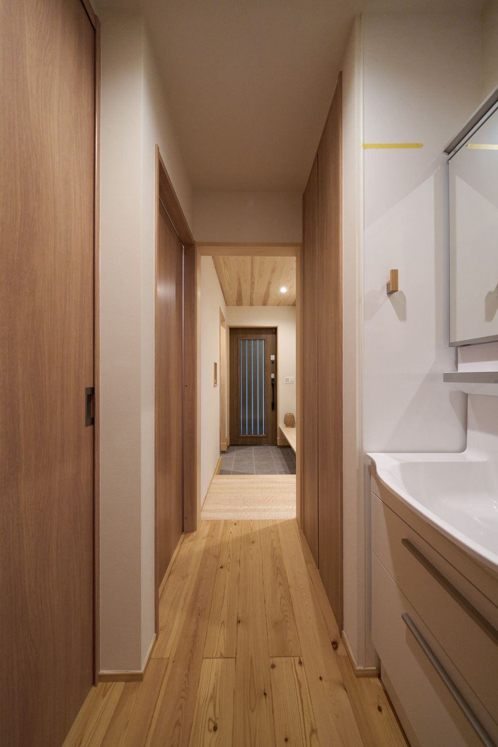 玄関を開けると腰掛けられるベンチの先にスプーンカットの玄関小上がり。足を乗せると質感が心地よく桧の心地よい肌触り印象的。玄関からの動線はリビングとサニタリースペースの二手に分かれます。ファミリクローゼットや洗面台横を通って浴室までまっすぐ直行できるのは、室内へ外の埃などを持ち込まない工夫です。