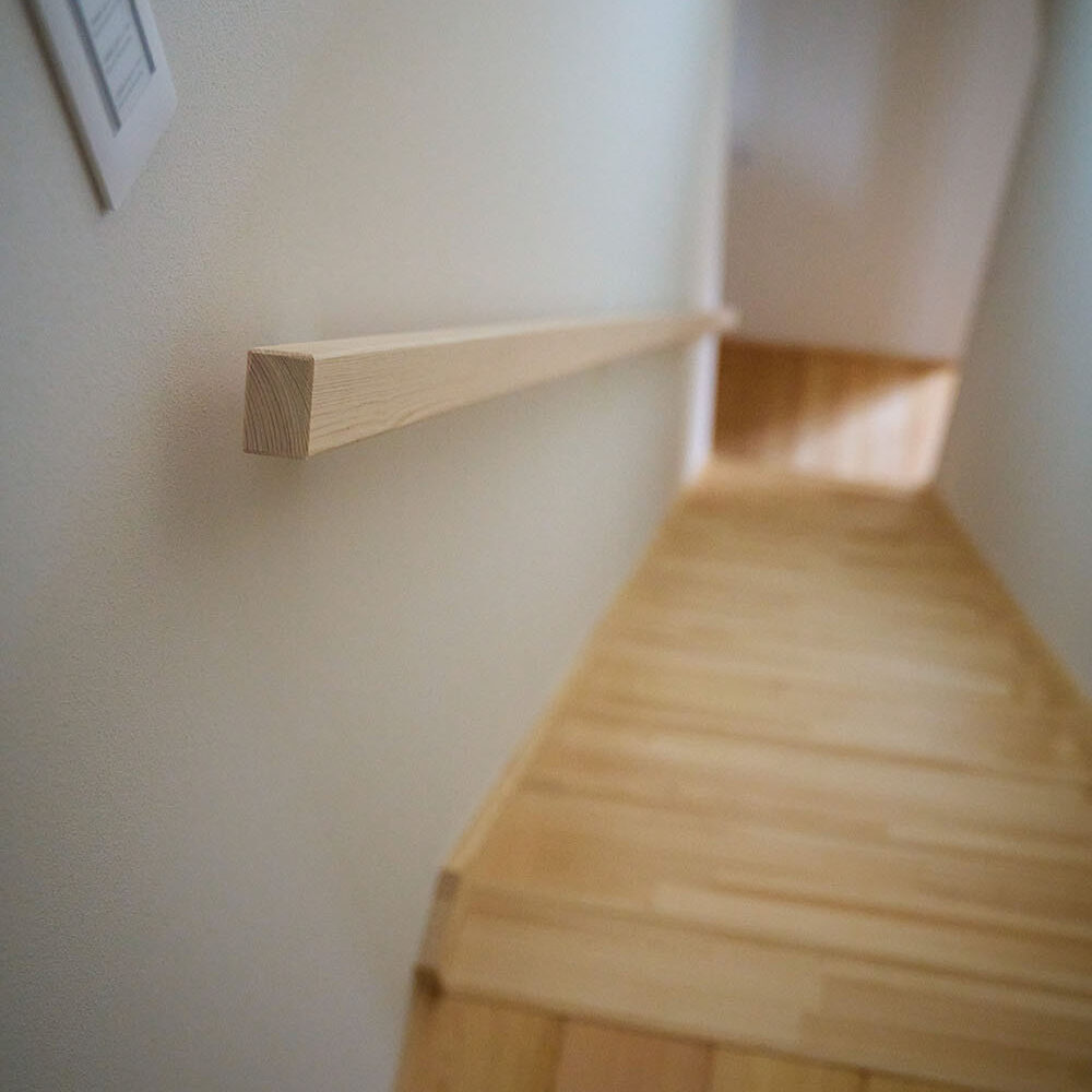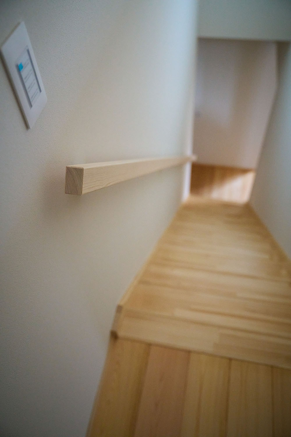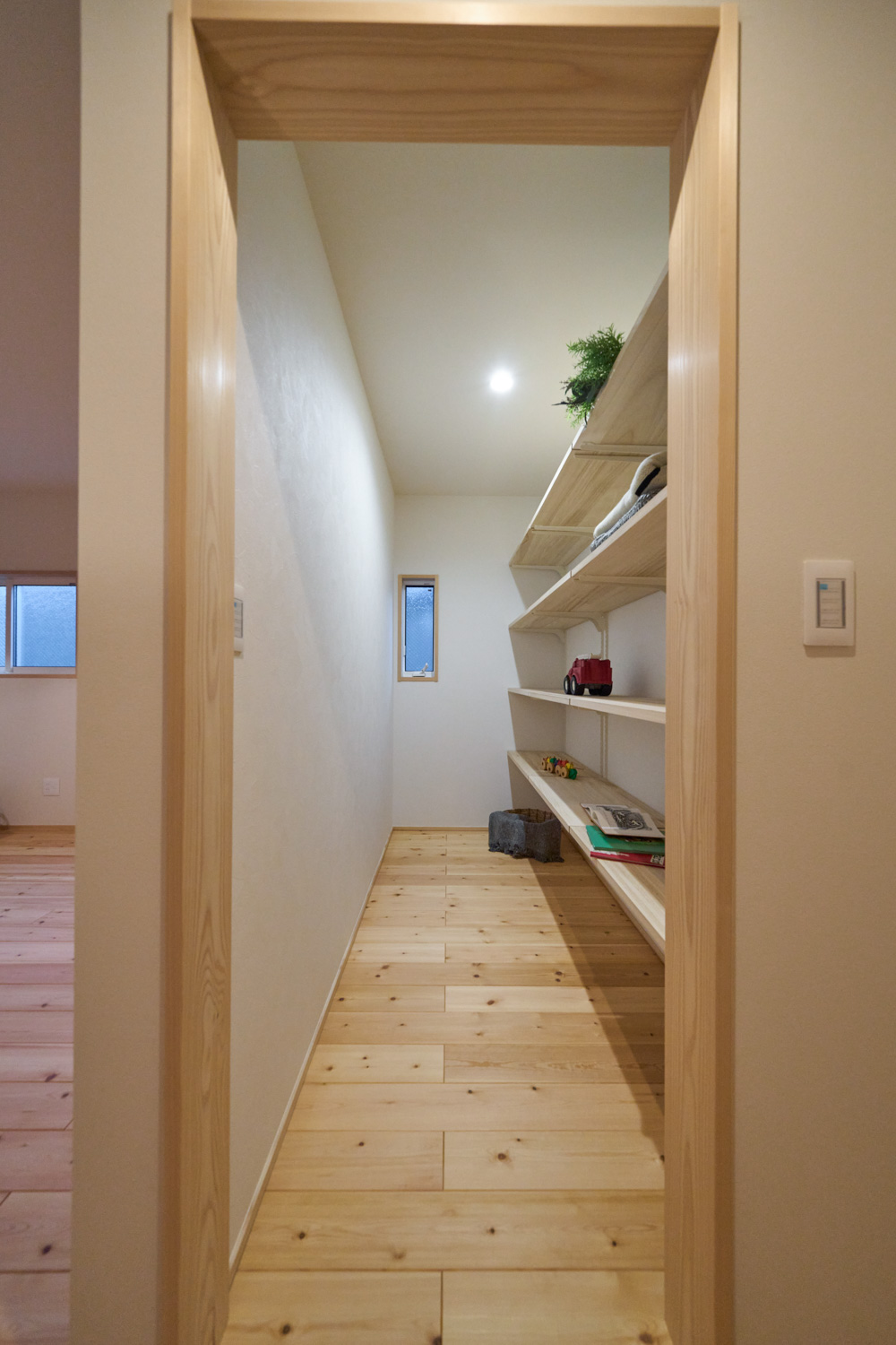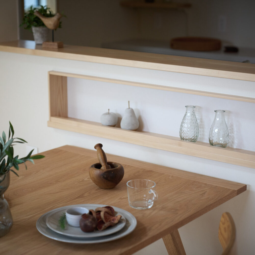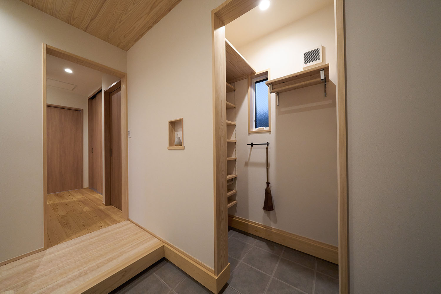 玄関を開けると腰掛けられるベンチの先にスプーンカットの玄関小上がり。足を乗せると質感が心地よく桧の心地よい肌触り印象的。玄関からの動線はリビングとサニタリースペースの二手に分かれます。ファミリクローゼットや洗面台横を通って浴室までまっすぐ直行できるのは、室内へ外の埃などを持ち込まない工夫です。