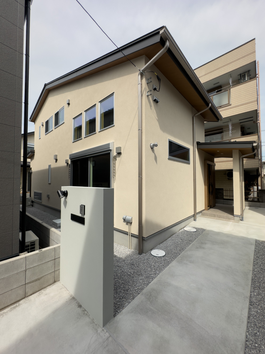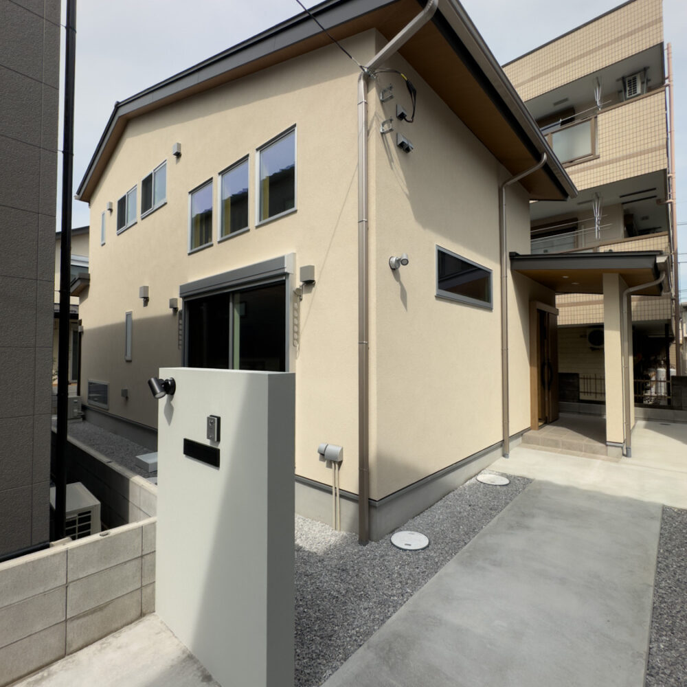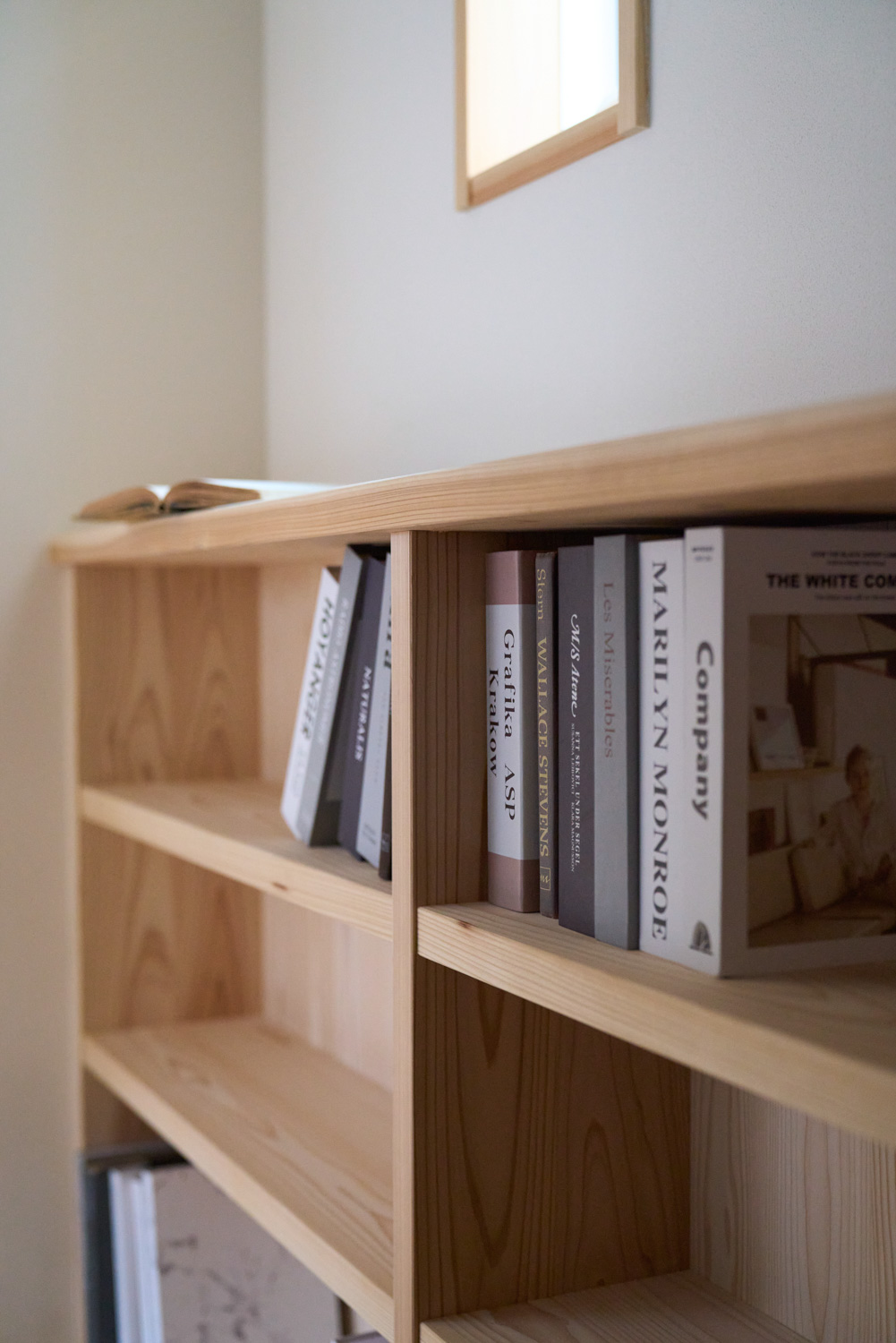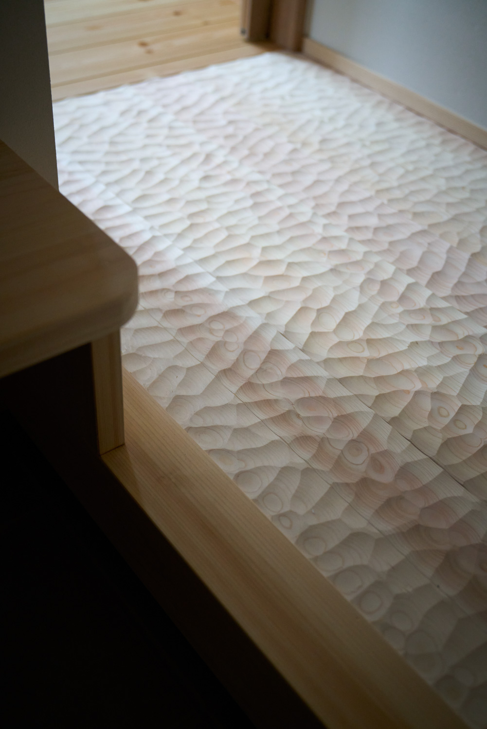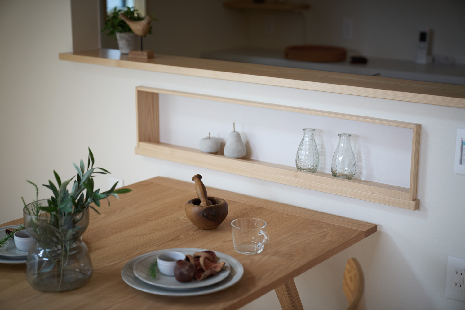 玄関を開けると腰掛けられるベンチの先にスプーンカットの玄関小上がり。足を乗せると質感が心地よく桧の心地よい肌触り印象的。玄関からの動線はリビングとサニタリースペースの二手に分かれます。ファミリクローゼットや洗面台横を通って浴室までまっすぐ直行できるのは、室内へ外の埃などを持ち込まない工夫です。