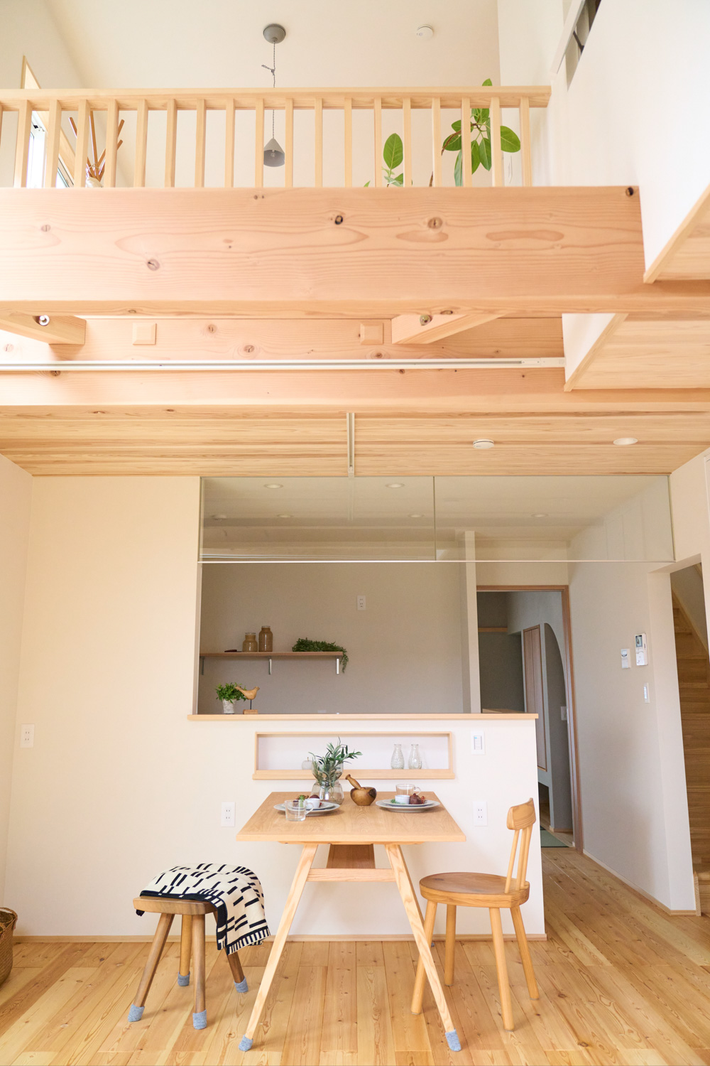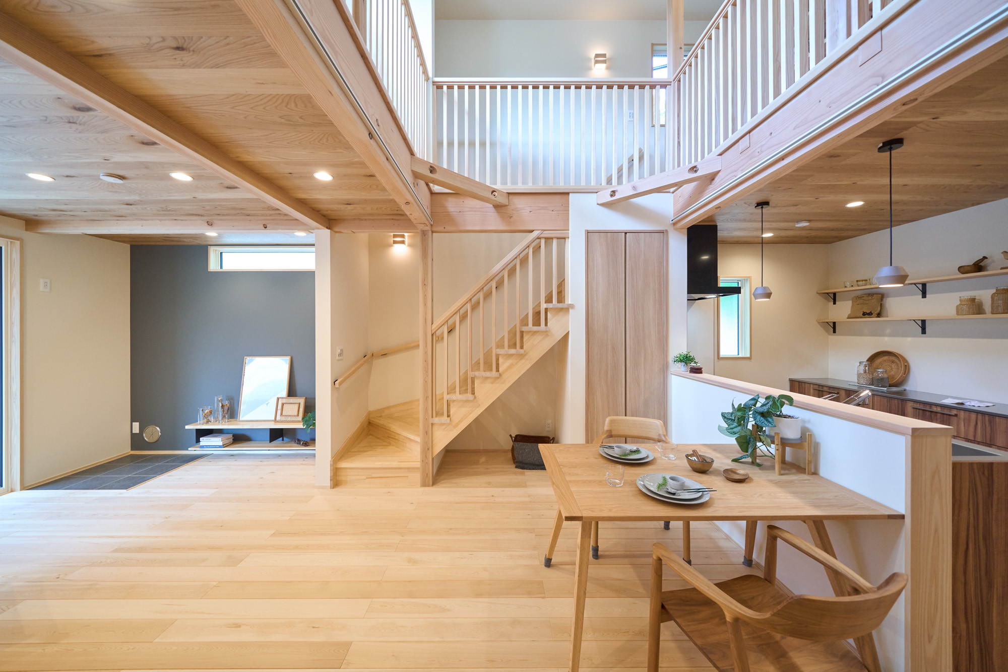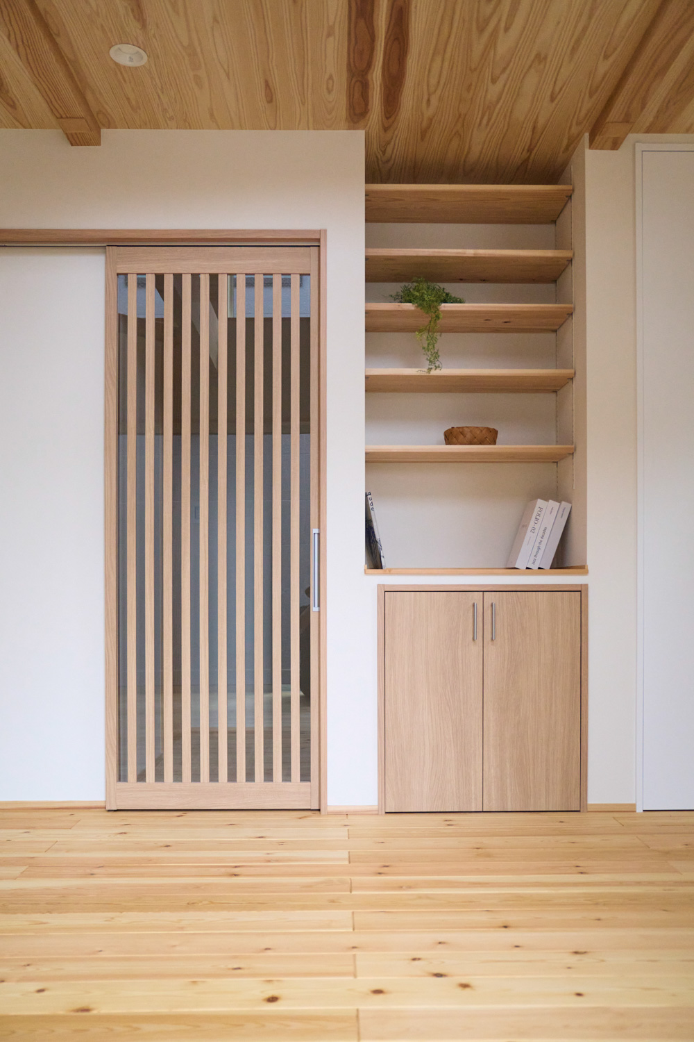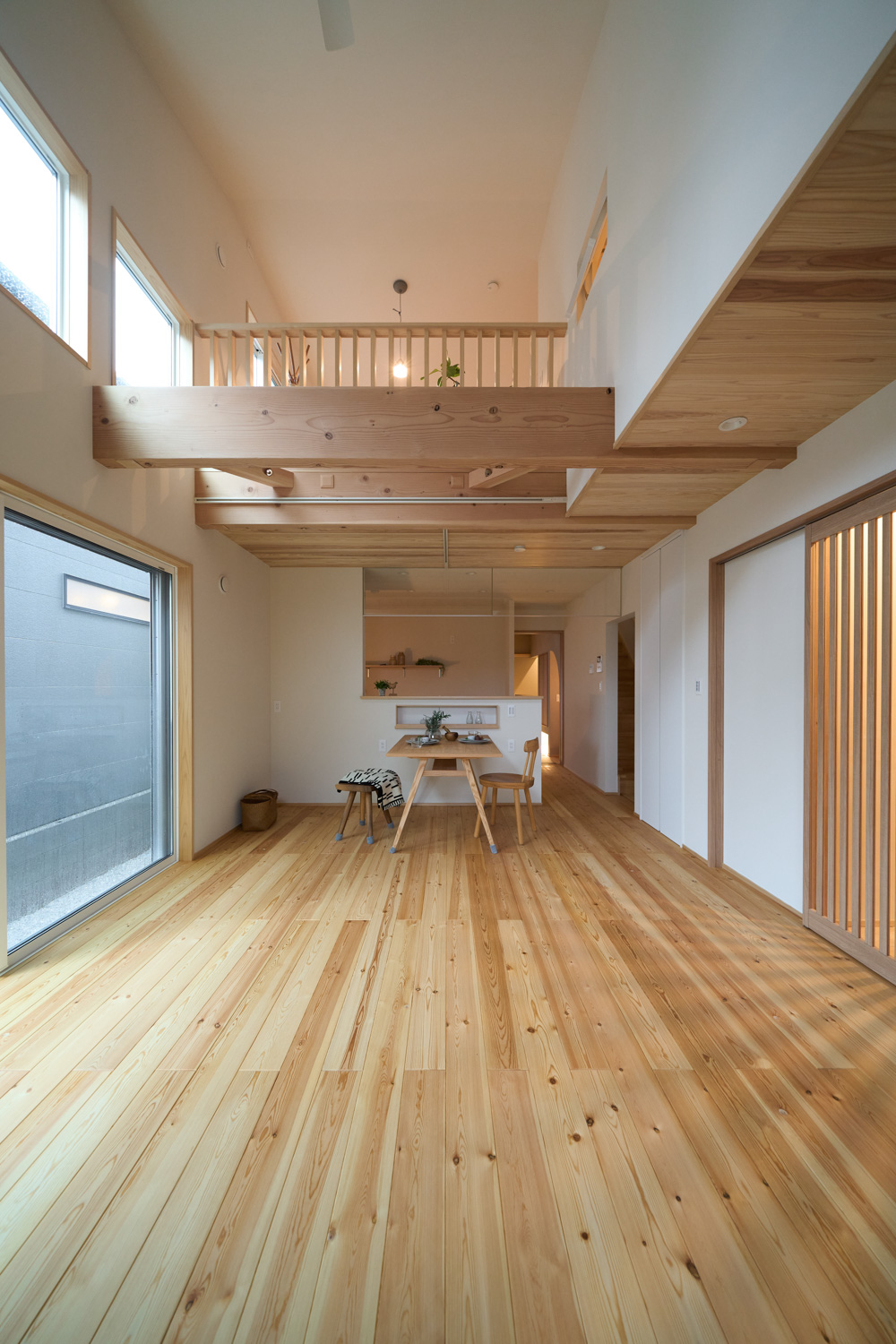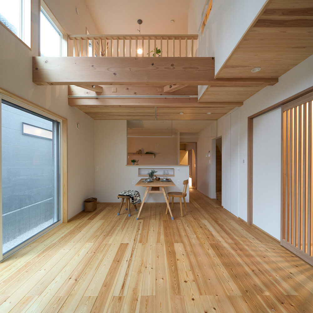 リビングの吹き抜けは2階のフリースペースと繋がりとても開放的。天井の杉の無垢板貼りが室内を柔らかな印象に仕上げています。キッチン脇を通り抜けた奥には、床の間とR壁のヌック兼デスクスペースを備えた主寝室となる和室を設えました。障子から淡く入る外光が心落ち着く空間となっています。主寝室と主要な生活設備を1階に設置することで生活が1フロアで完結。将来的に平屋のように暮らせるプランです。