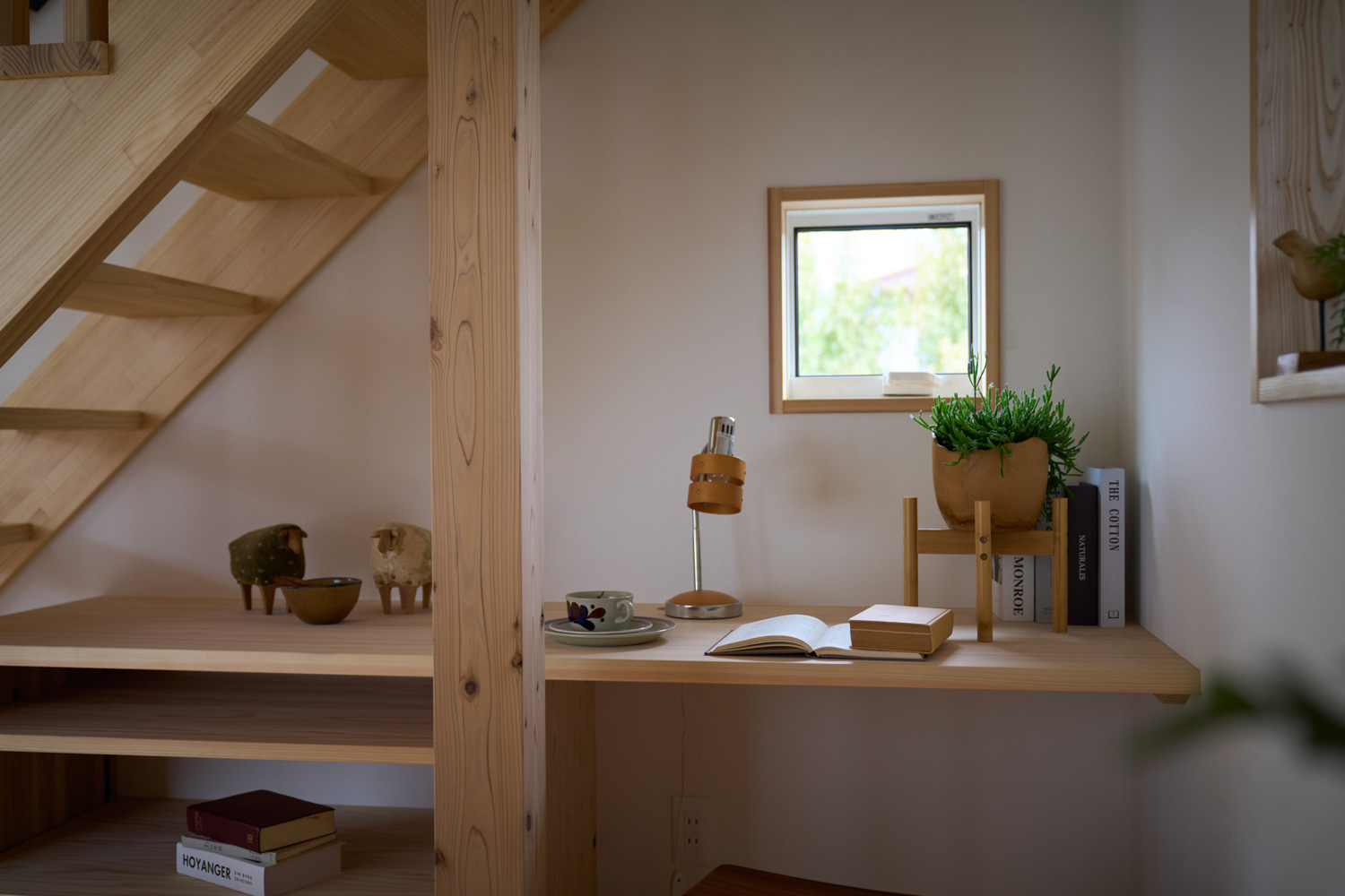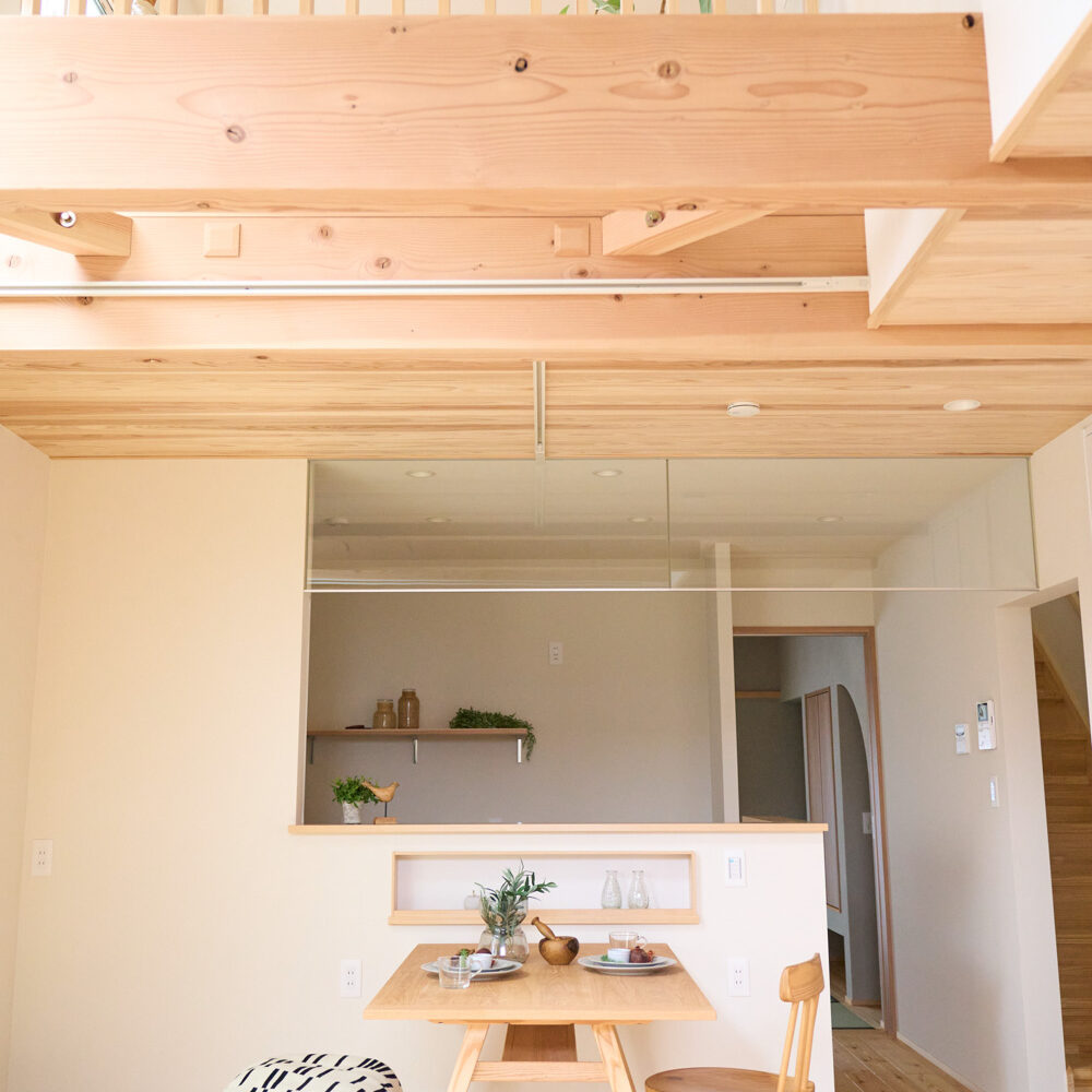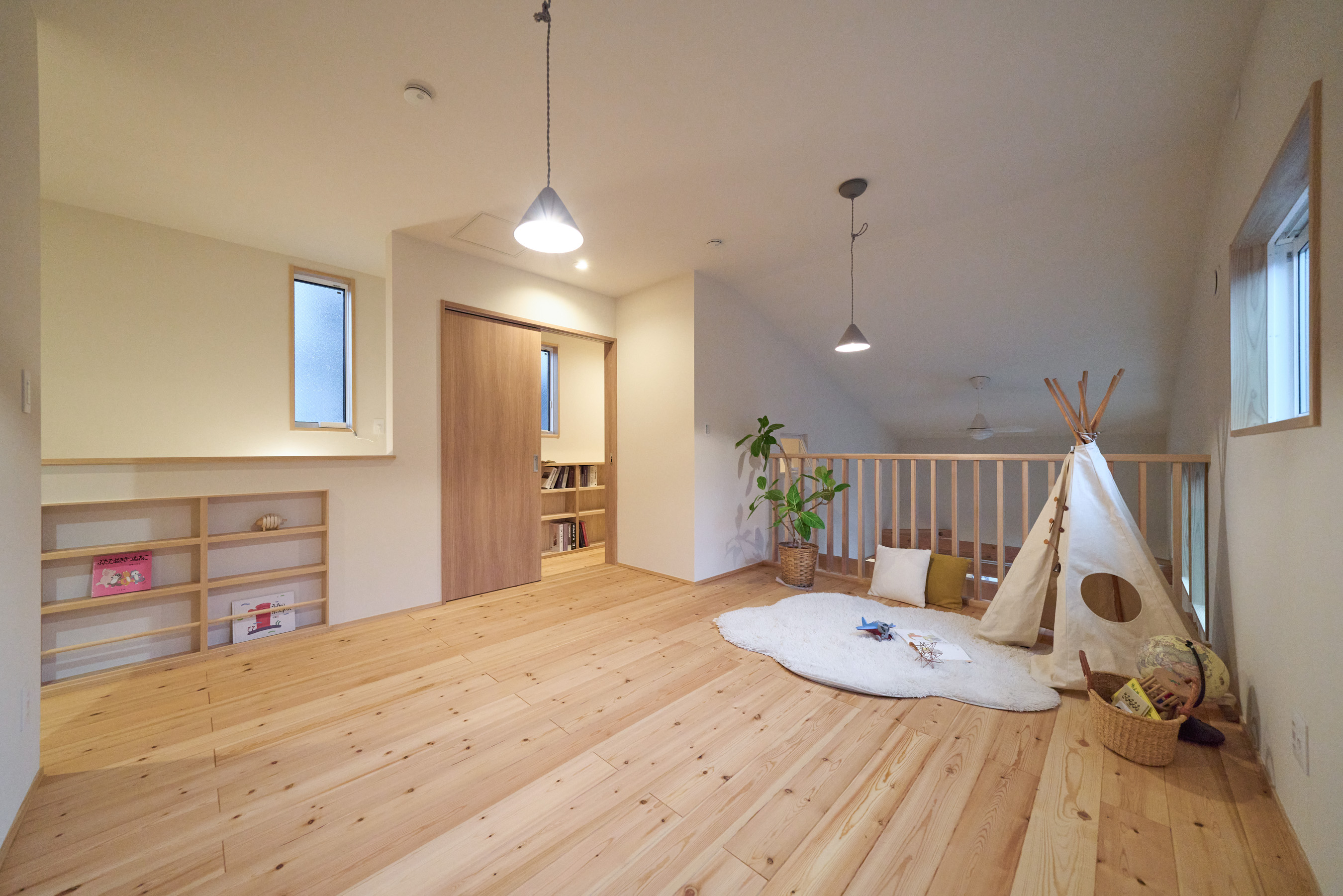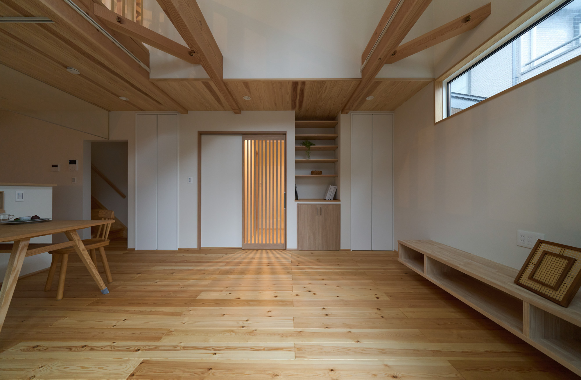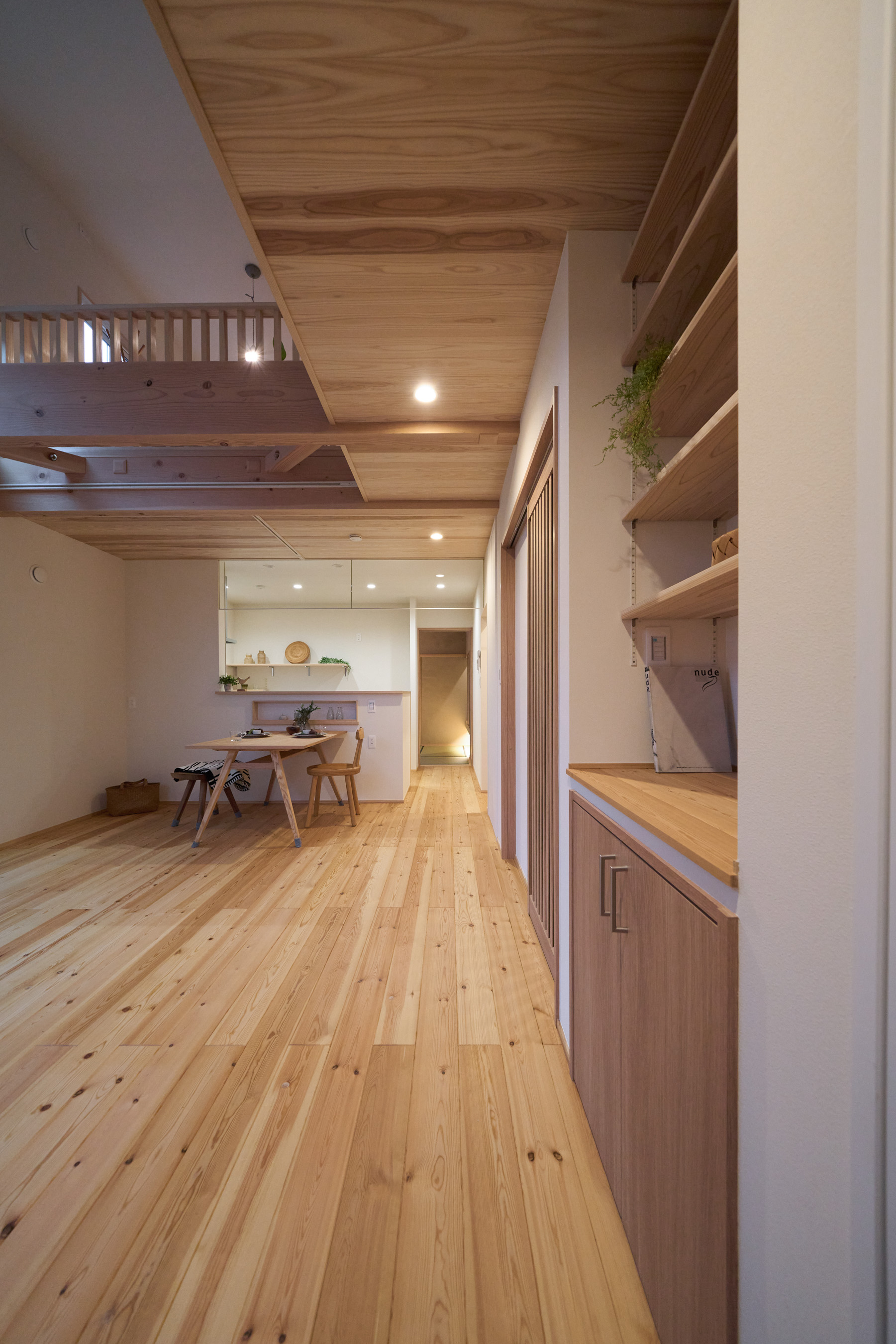 リビングの吹き抜けは2階のフリースペースと繋がりとても開放的。天井の杉の無垢板貼りが室内を柔らかな印象に仕上げています。キッチン脇を通り抜けた奥には、床の間とR壁のヌック兼デスクスペースを備えた主寝室となる和室を設えました。障子から淡く入る外光が心落ち着く空間となっています。主寝室と主要な生活設備を1階に設置することで生活が1フロアで完結。将来的に平屋のように暮らせるプランです。