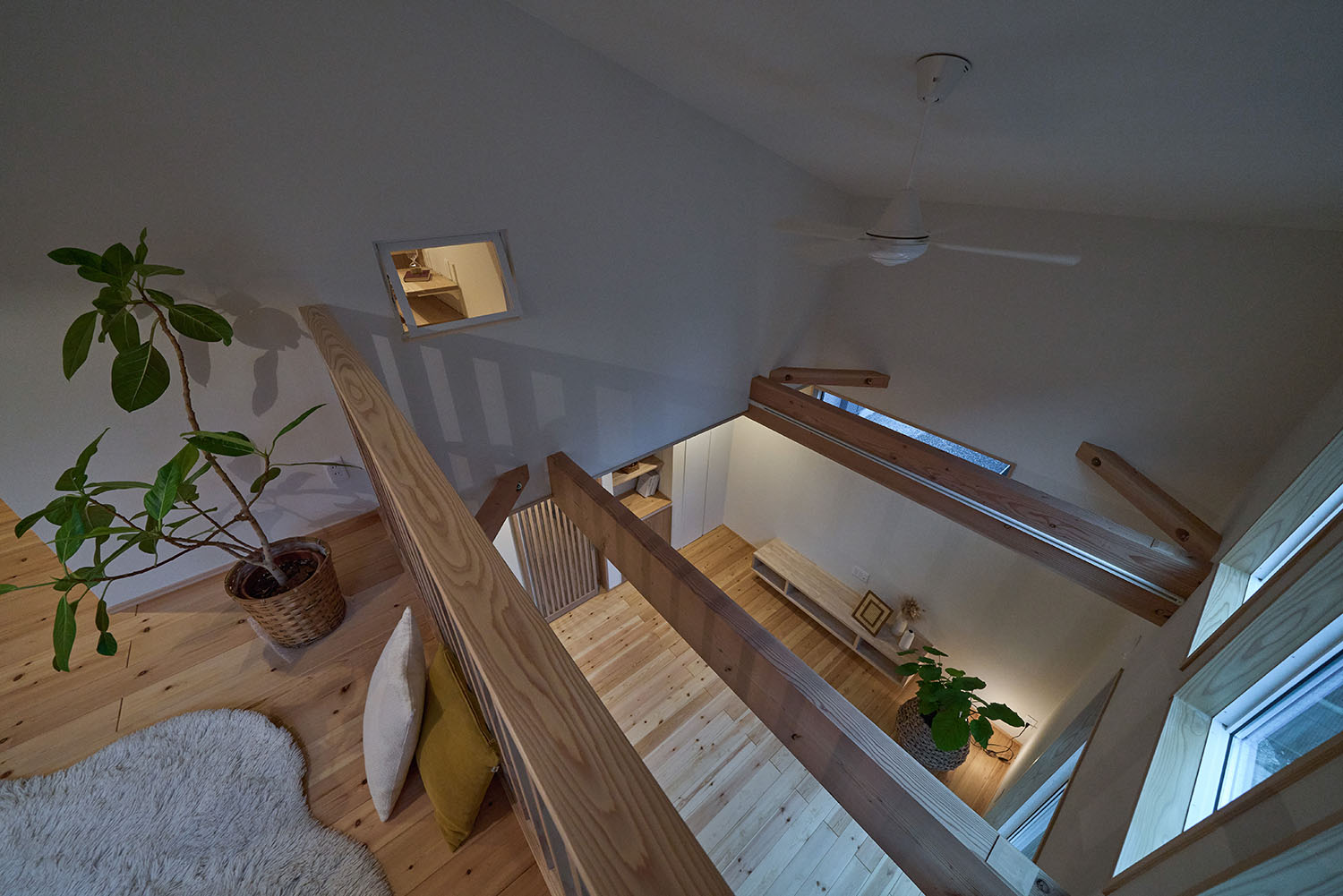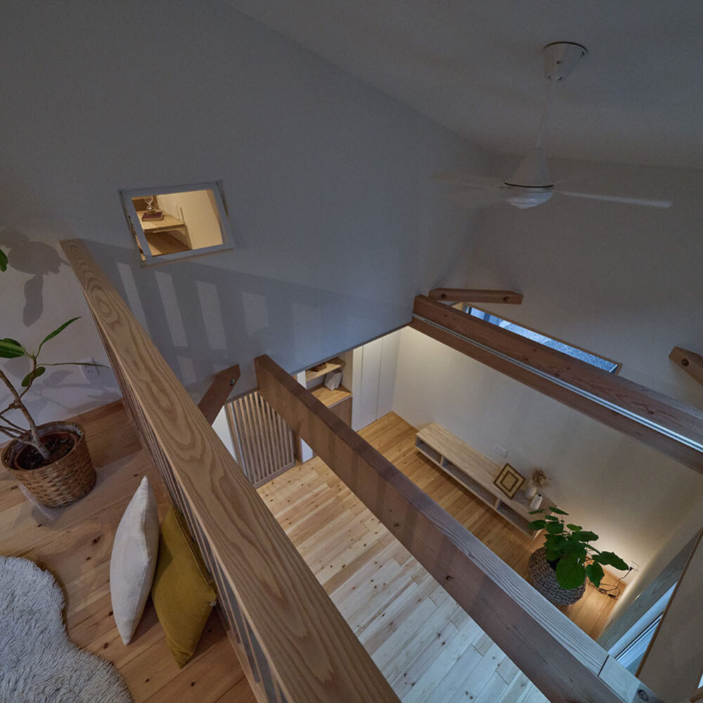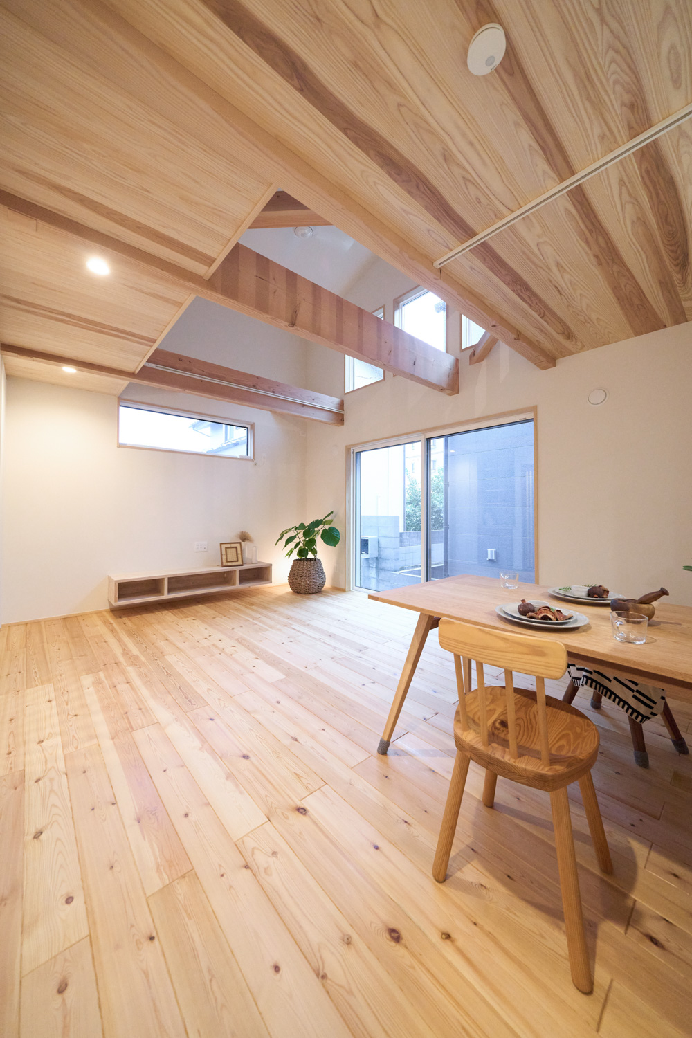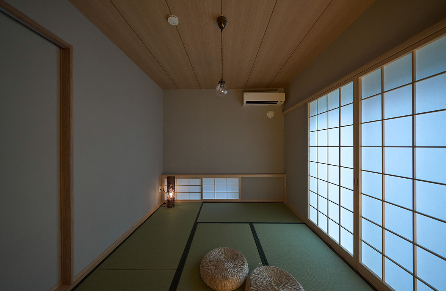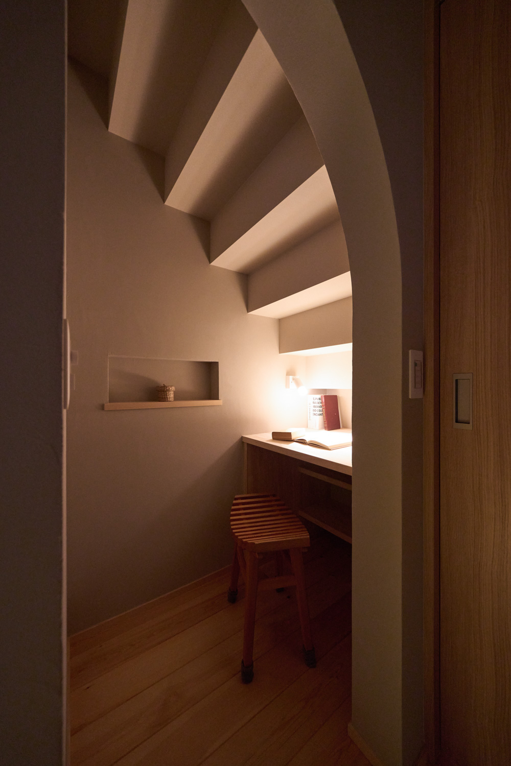 リビングの吹き抜けは2階のフリースペースと繋がりとても開放的。天井の杉の無垢板貼りが室内を柔らかな印象に仕上げています。キッチン脇を通り抜けた奥には、床の間とR壁のヌック兼デスクスペースを備えた主寝室となる和室を設えました。障子から淡く入る外光が心落ち着く空間となっています。主寝室と主要な生活設備を1階に設置することで生活が1フロアで完結。将来的に平屋のように暮らせるプランです。