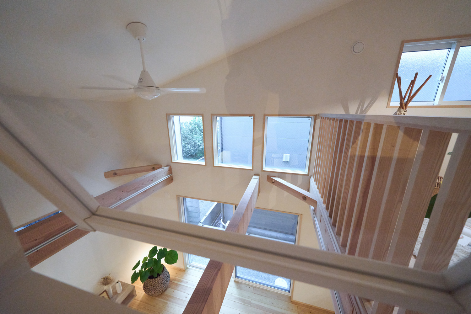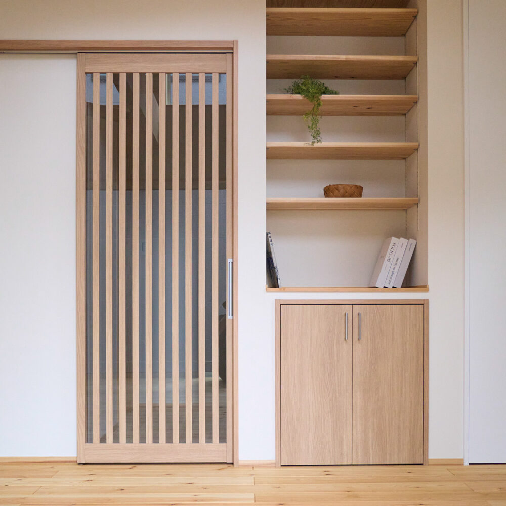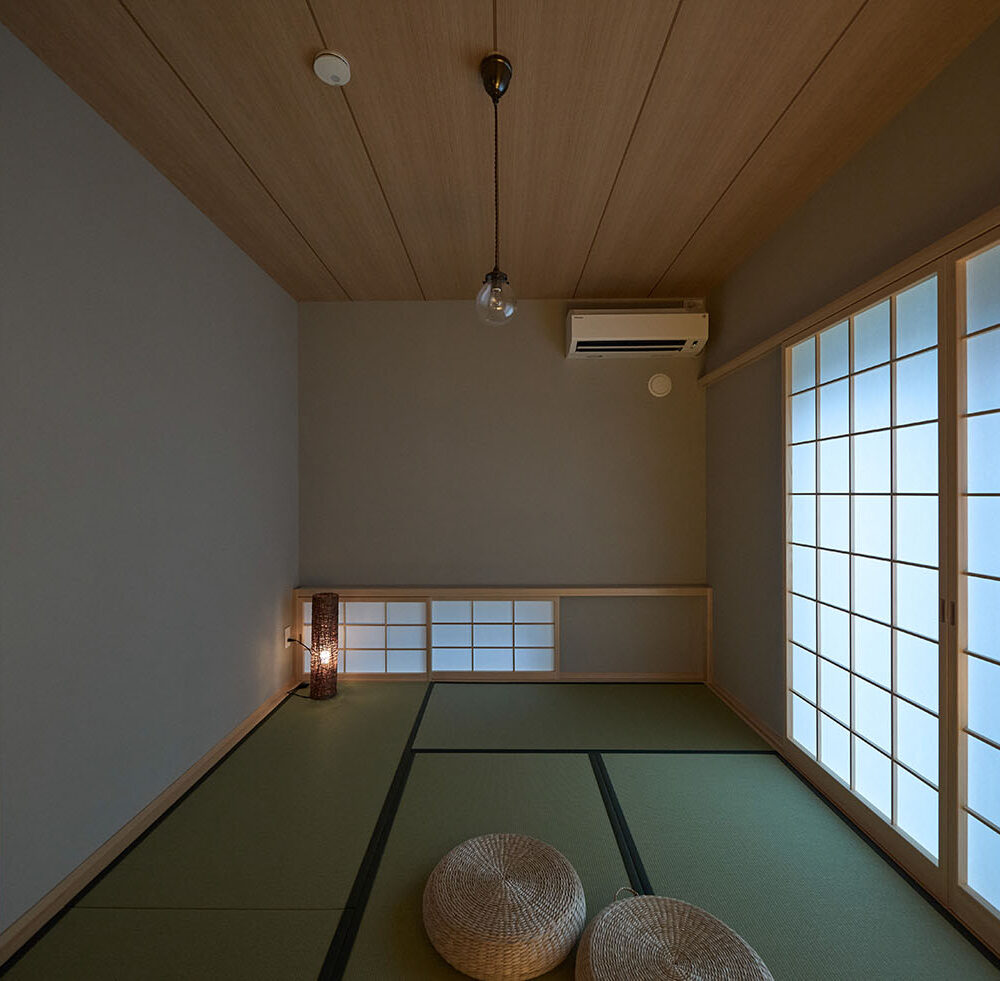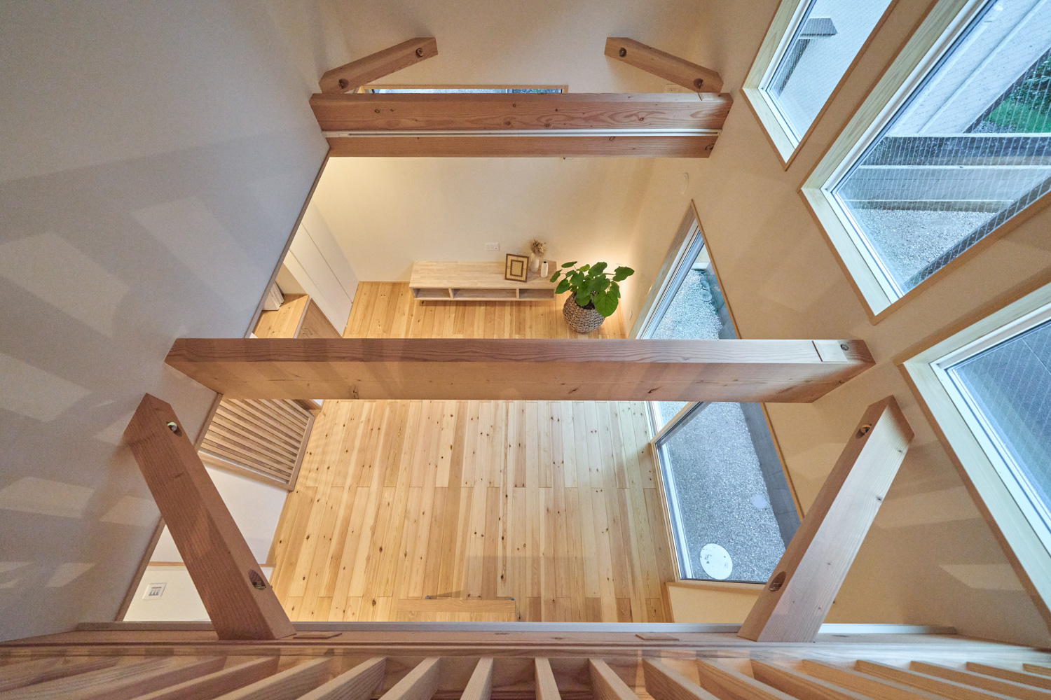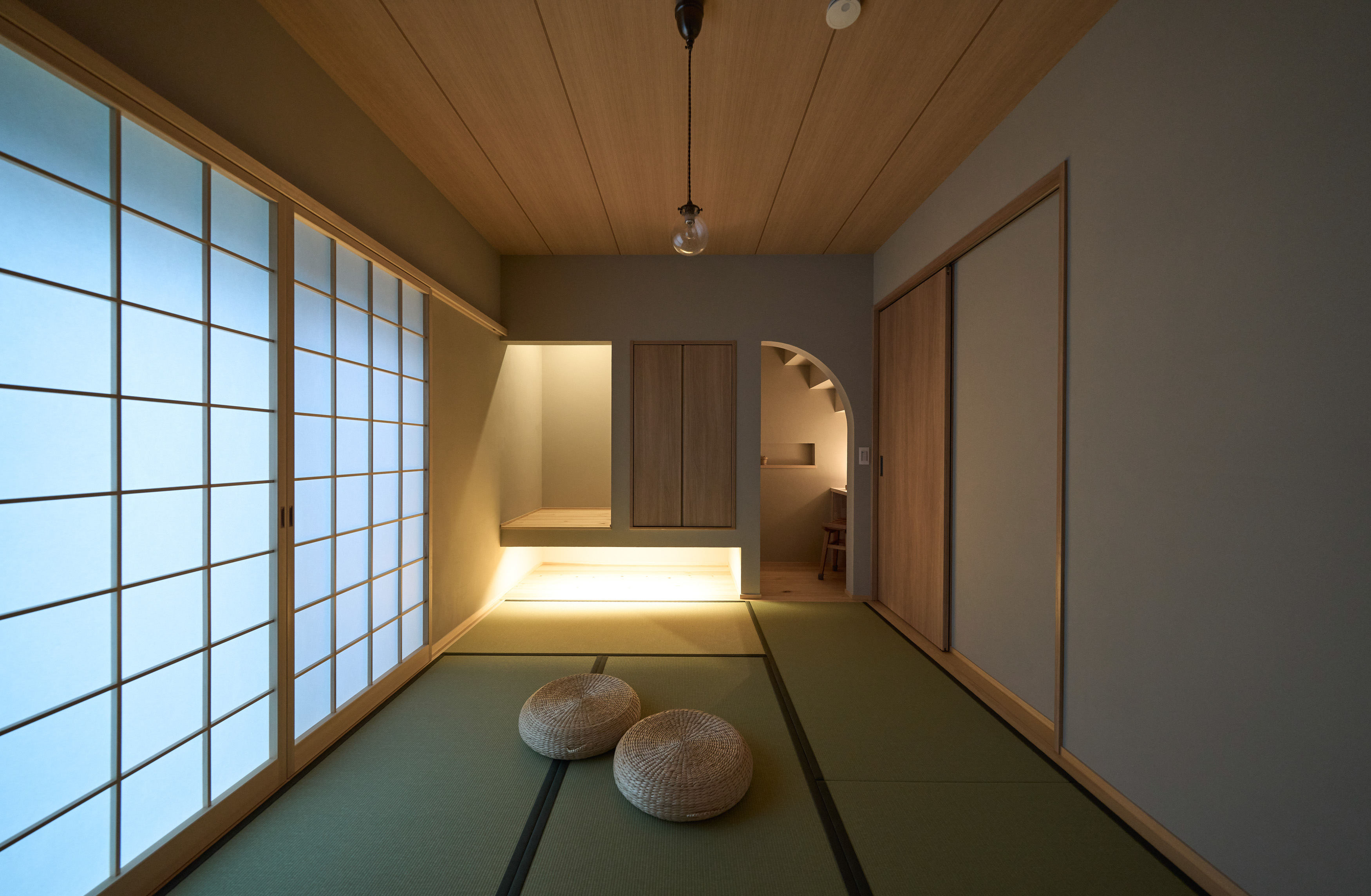 リビングの吹き抜けは2階のフリースペースと繋がりとても開放的。天井の杉の無垢板貼りが室内を柔らかな印象に仕上げています。キッチン脇を通り抜けた奥には、床の間とR壁のヌック兼デスクスペースを備えた主寝室となる和室を設えました。障子から淡く入る外光が心落ち着く空間となっています。主寝室と主要な生活設備を1階に設置することで生活が1フロアで完結。将来的に平屋のように暮らせるプランです。