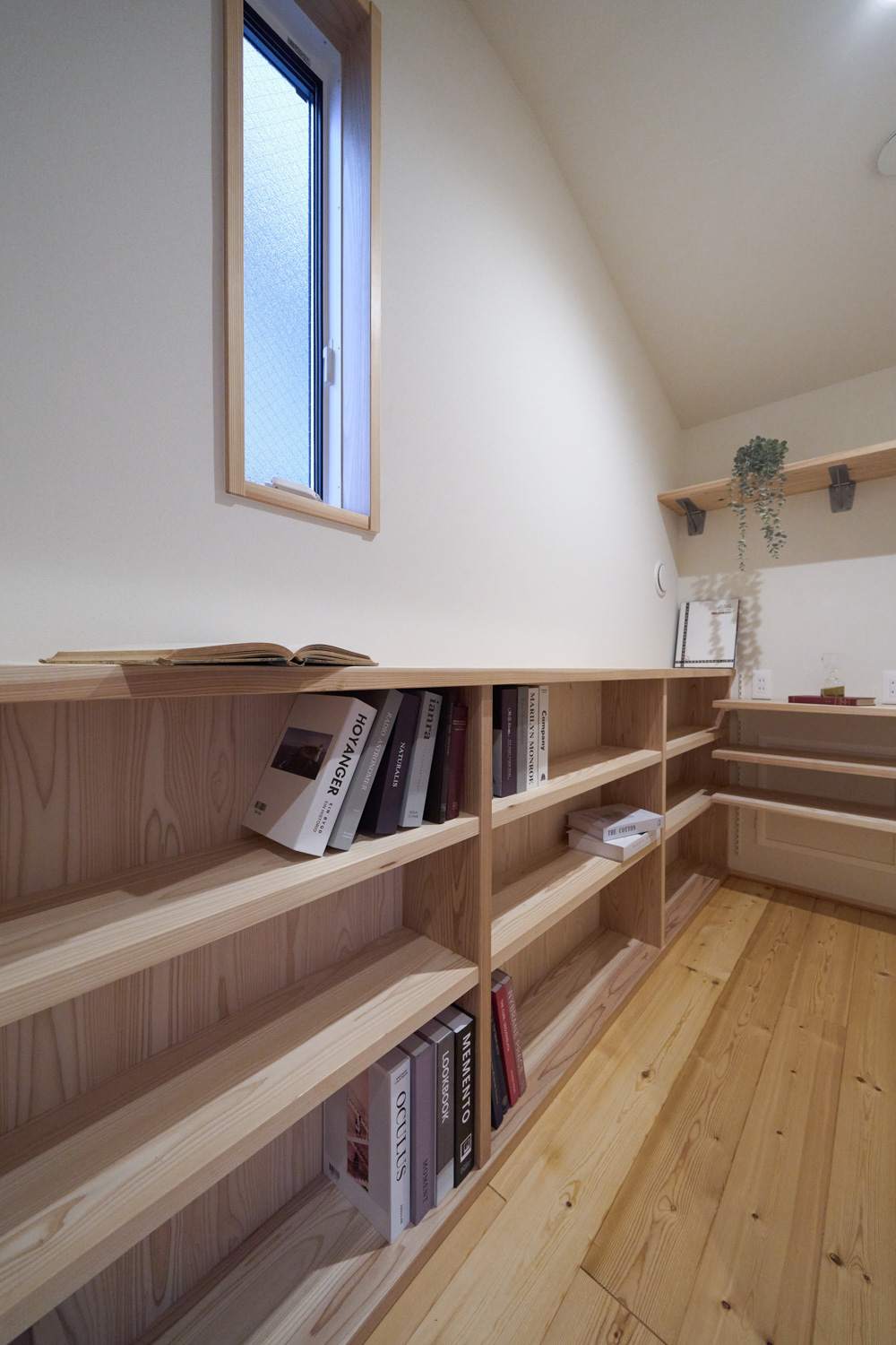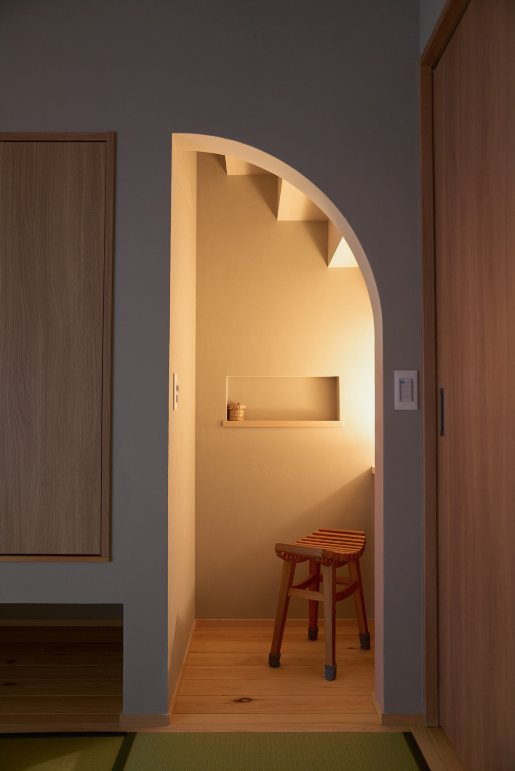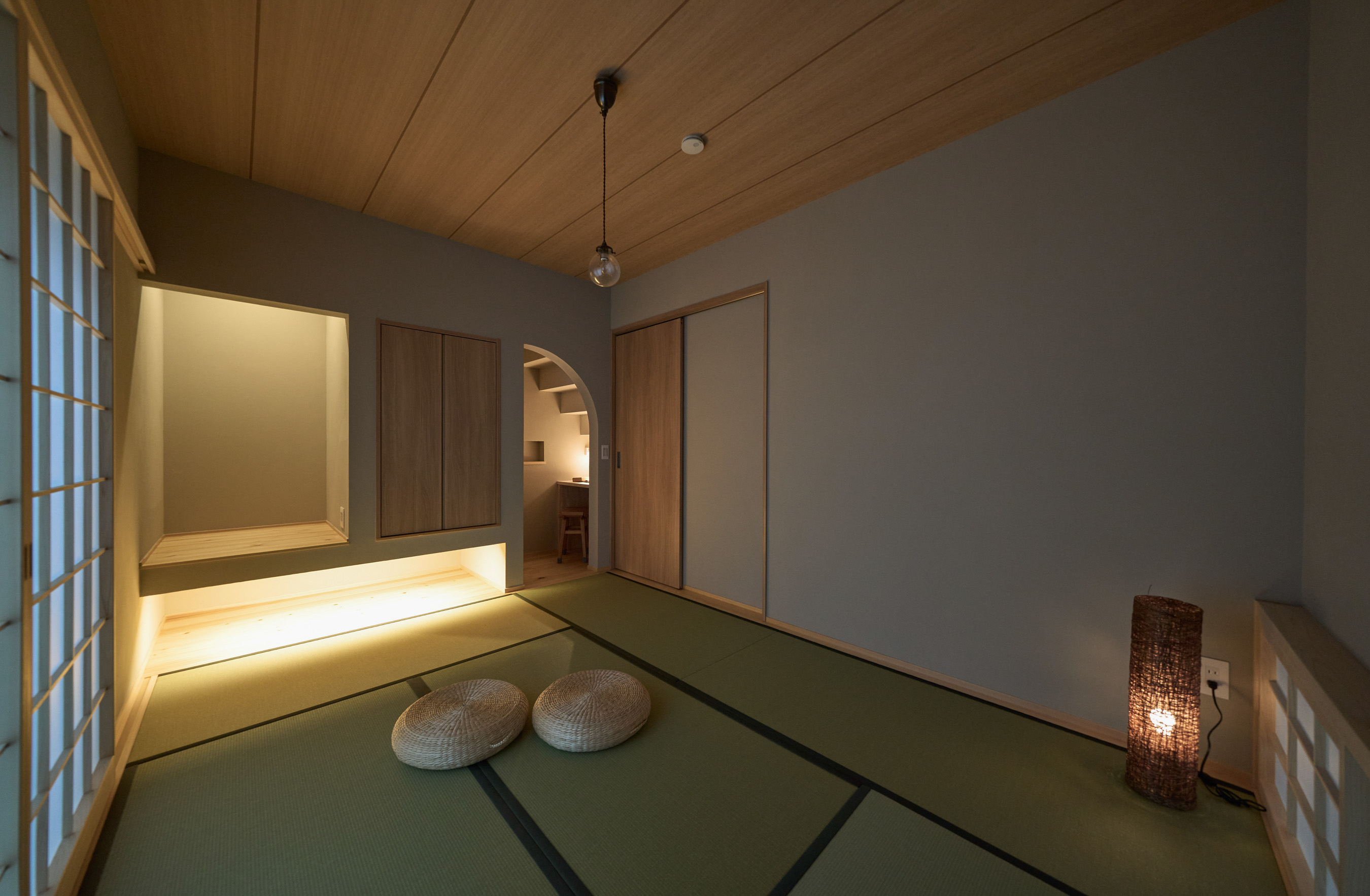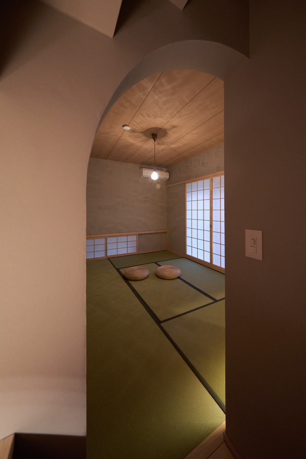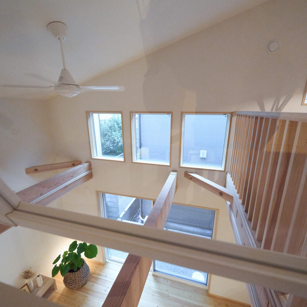 リビングの吹き抜けは2階のフリースペースと繋がりとても開放的。天井の杉の無垢板貼りが室内を柔らかな印象に仕上げています。キッチン脇を通り抜けた奥には、床の間とR壁のヌック兼デスクスペースを備えた主寝室となる和室を設えました。障子から淡く入る外光が心落ち着く空間となっています。主寝室と主要な生活設備を1階に設置することで生活が1フロアで完結。将来的に平屋のように暮らせるプランです。