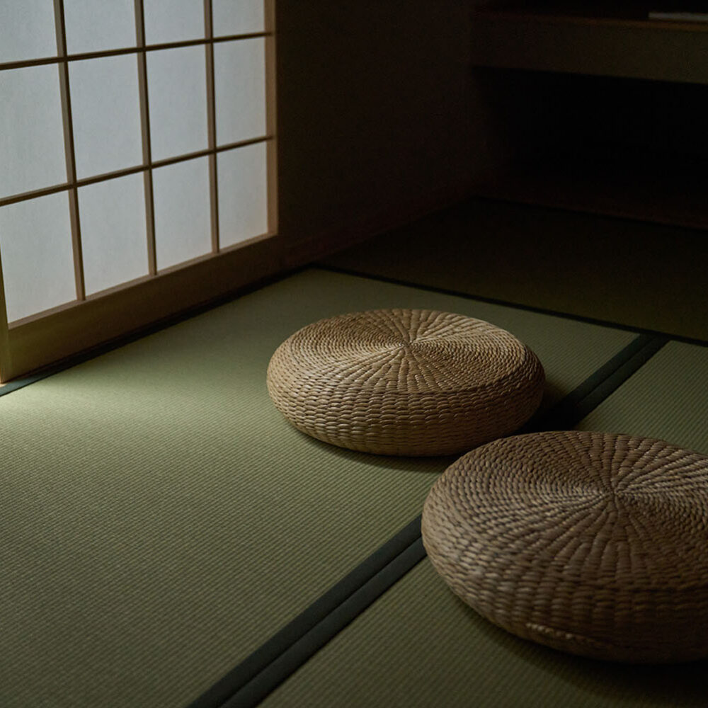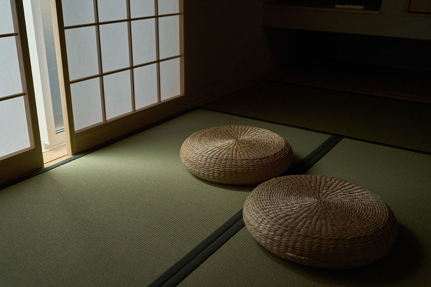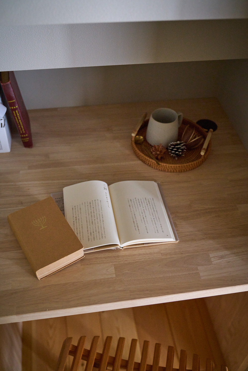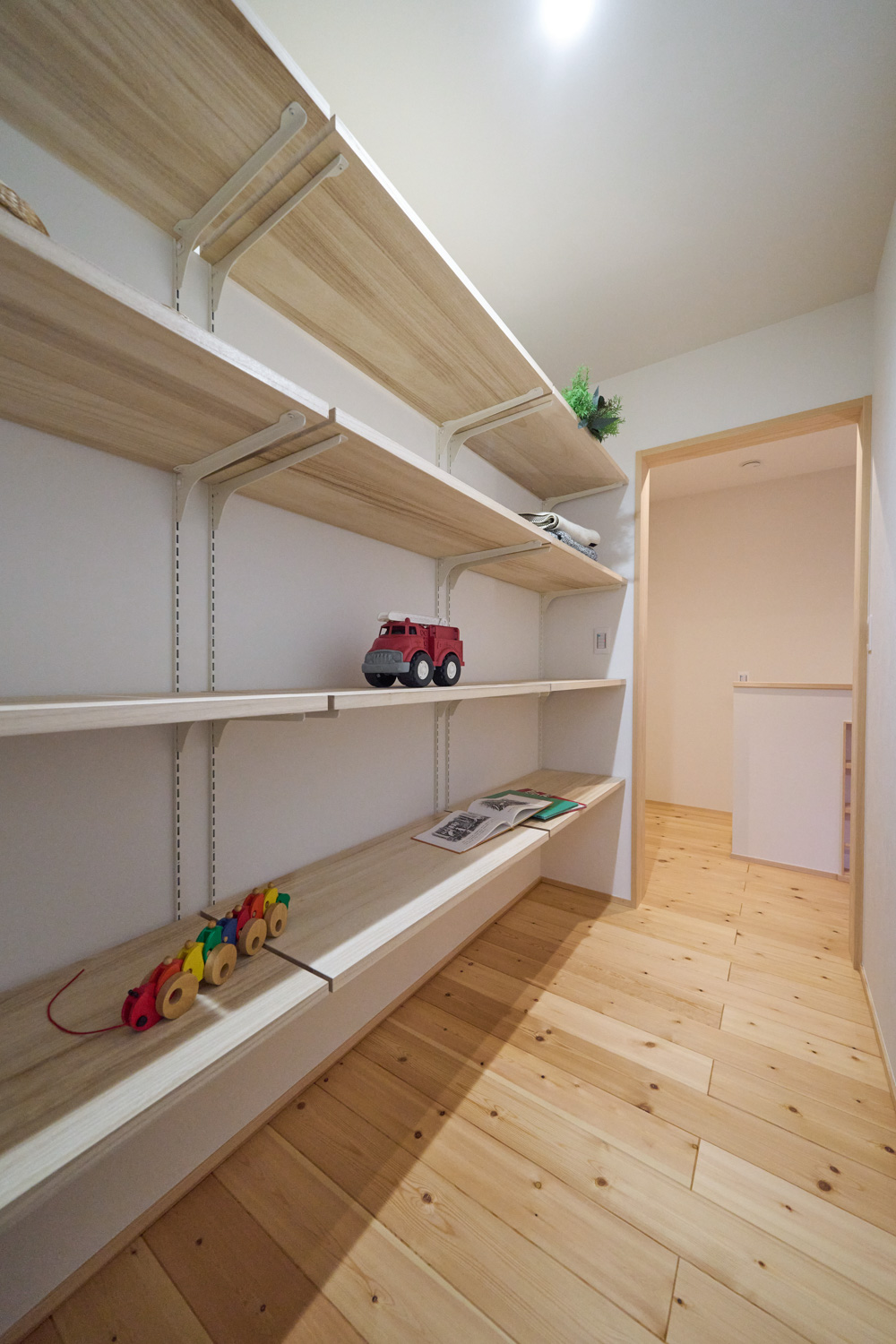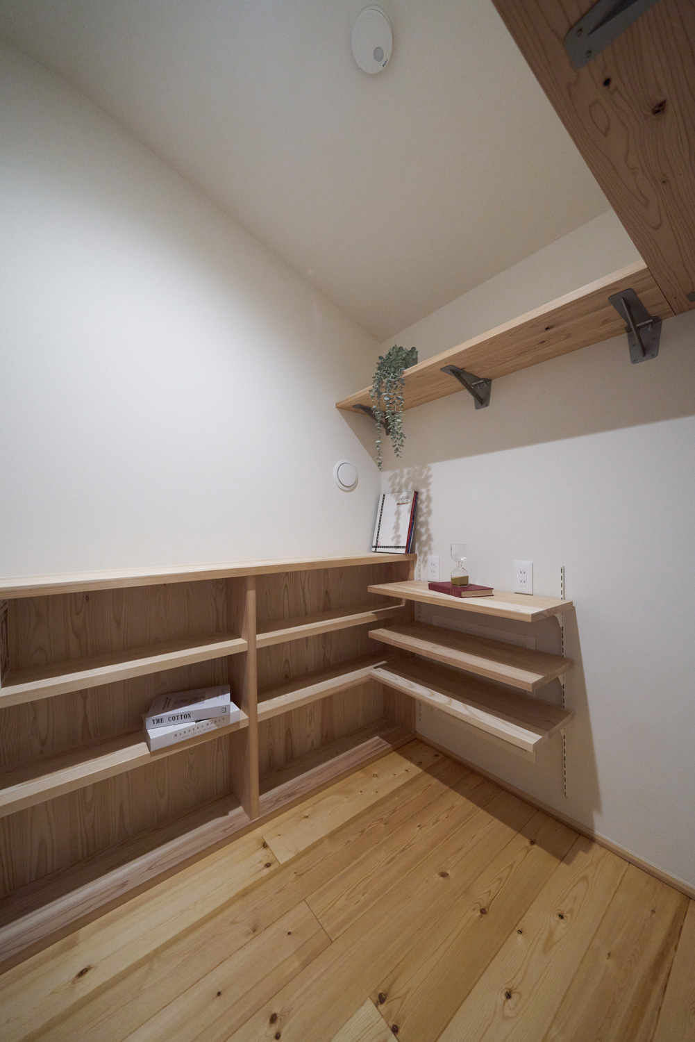リビングの吹き抜けは2階のフリースペースと繋がりとても開放的。天井の杉の無垢板貼りが室内を柔らかな印象に仕上げています。キッチン脇を通り抜けた奥には、床の間とR壁のヌック兼デスクスペースを備えた主寝室となる和室を設えました。障子から淡く入る外光が心落ち着く空間となっています。主寝室と主要な生活設備を1階に設置することで生活が1フロアで完結。将来的に平屋のように暮らせるプランです。