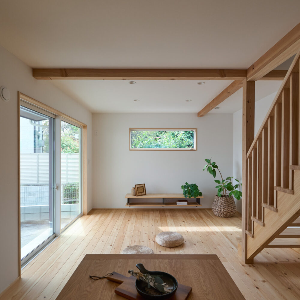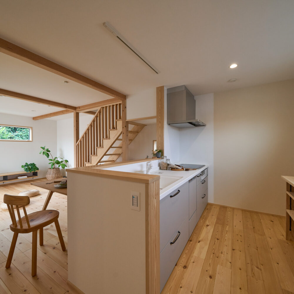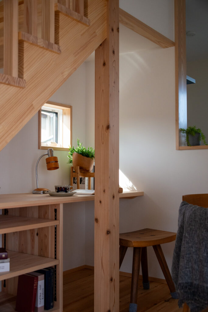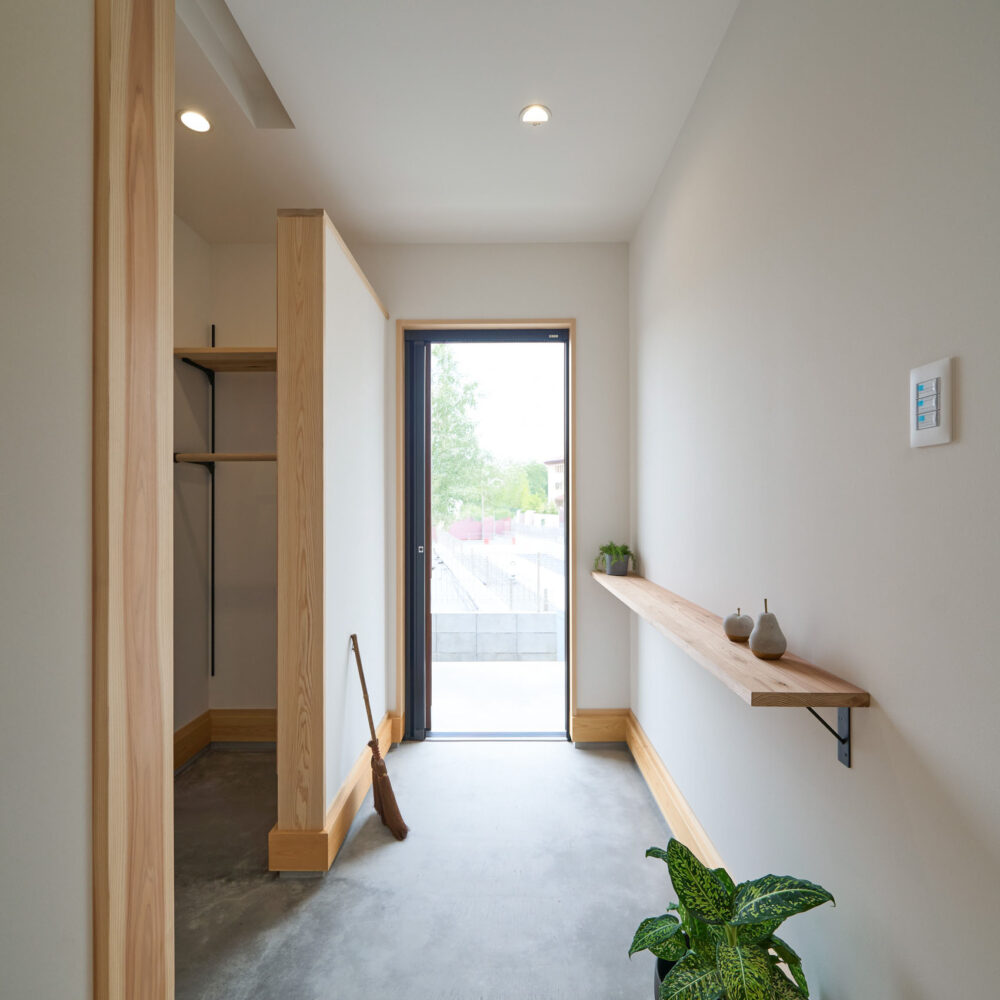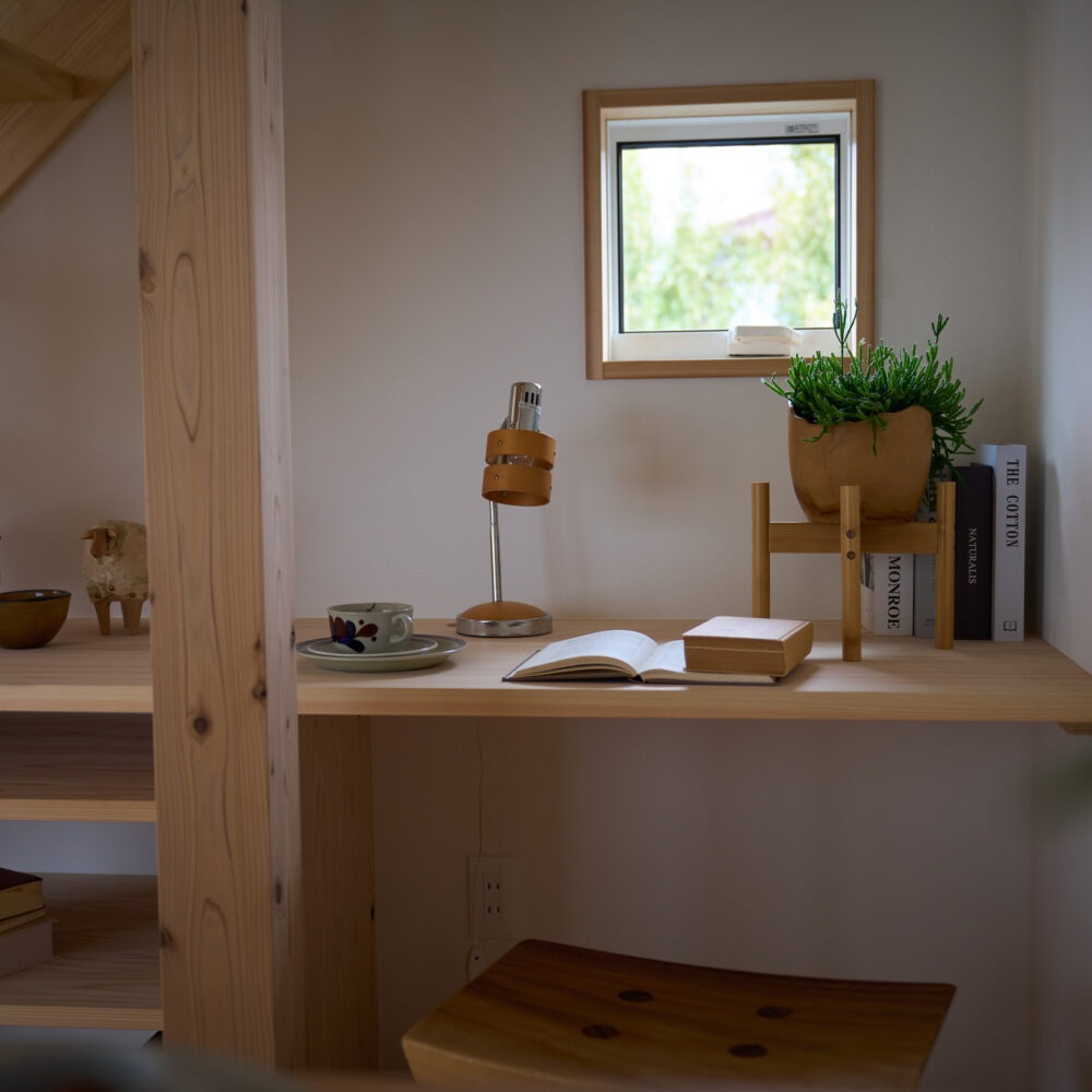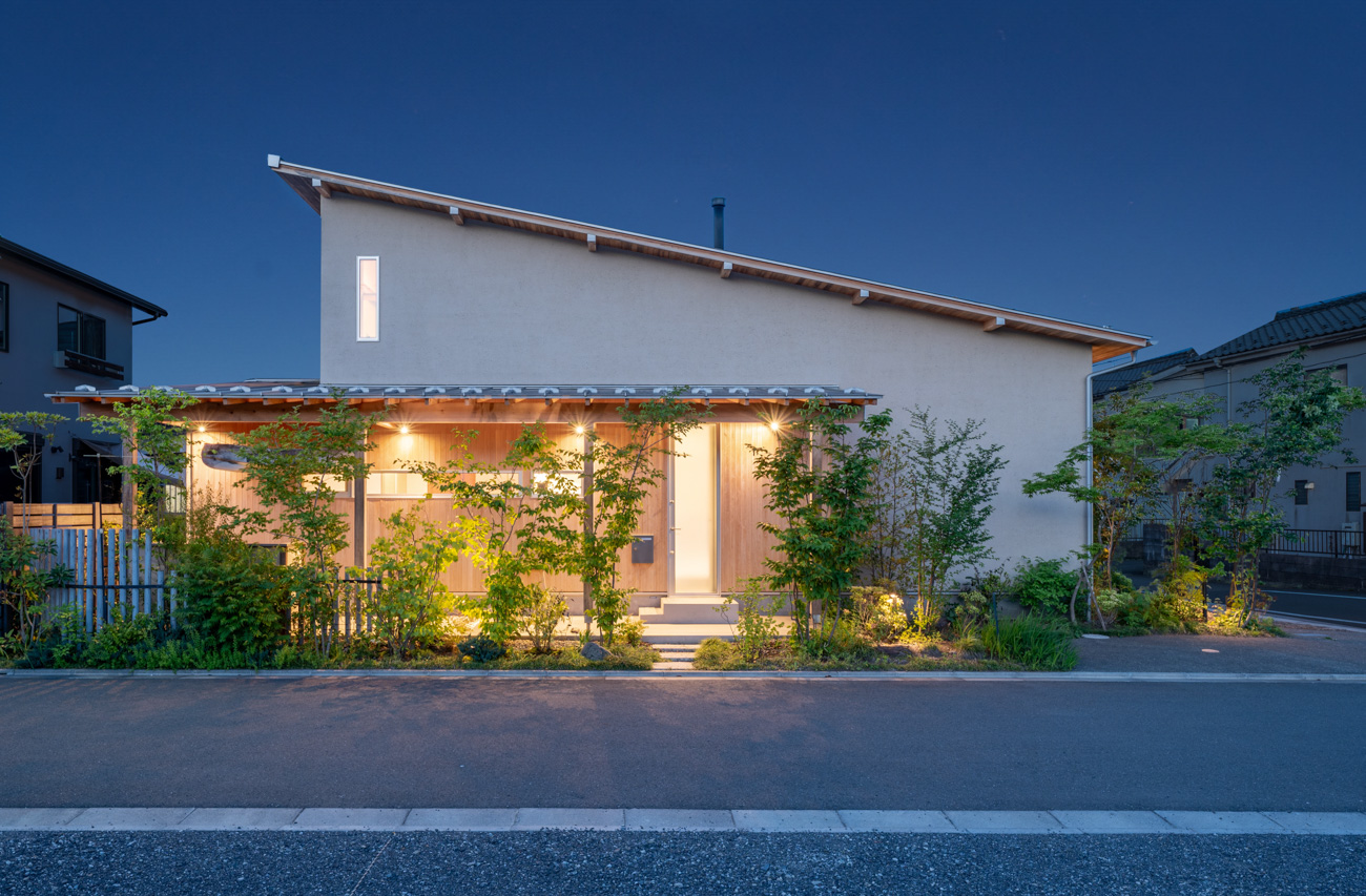「お庭を眺められるリビングと、家事動線の良い暮らしやすい家を」とご希望された建主様。旗竿地をうまく活かした建物配置により、リビングの大きな掃き出し窓からは奥行きのある庭の景色を楽しめます。 また、玄関から家事室・ファミリークローゼット・キッチン・パントリーへと回遊できる、動きやすい家事動線を実現しました。リビング横には家族でシェアできるワークスペースを、さらに集中して仕事に取り組める書斎も設けています。 加えて、可変できる子供部屋や細やかに計画された収納、すっきりと隠せるロールスクリーン用の埋め込みボックスなど、日々の暮らしを心地よく整える工夫を随所に凝らしました。 1F 周辺環境を上手に活用したリビング 旗竿地で通りから玄関まで奥行きがあることや、周辺が緑の多い住宅地ということから窓の配置を導きました。大きな掃き出し窓からは抜けの良いお庭を。TVボード上部や、デスクスペースからは周辺の緑を望めるピクチャーウィンドウを設置。彩光もあるため、室内も明るく保てます。 家事効率が上がる、設備充実の回遊動線 玄関→リビング→キッチン→家事室と、ぐるっと動きやすい回遊動線。その動線上に収納やファミリークローゼット、パントリーなど多彩な設備を配置。特に家事室とクローゼットが近いことでスムーズな洗濯動線になっています。 2F 家族のライフスタイルに沿う場所づくり 2階には主寝室や子供部屋のほか、書斎や読書スペースを配置。書斎は仕事や趣味に、読書スペースには本棚を置いて好きな本を読み耽る、そんな場所をつくりました。子供部屋は成長に併せて2部屋に可変できる仕様に。主寝室には使い勝手の良い大きなクローゼットを設置。ライフスタイルや家族の変化にも柔軟に対応できる間取りです。