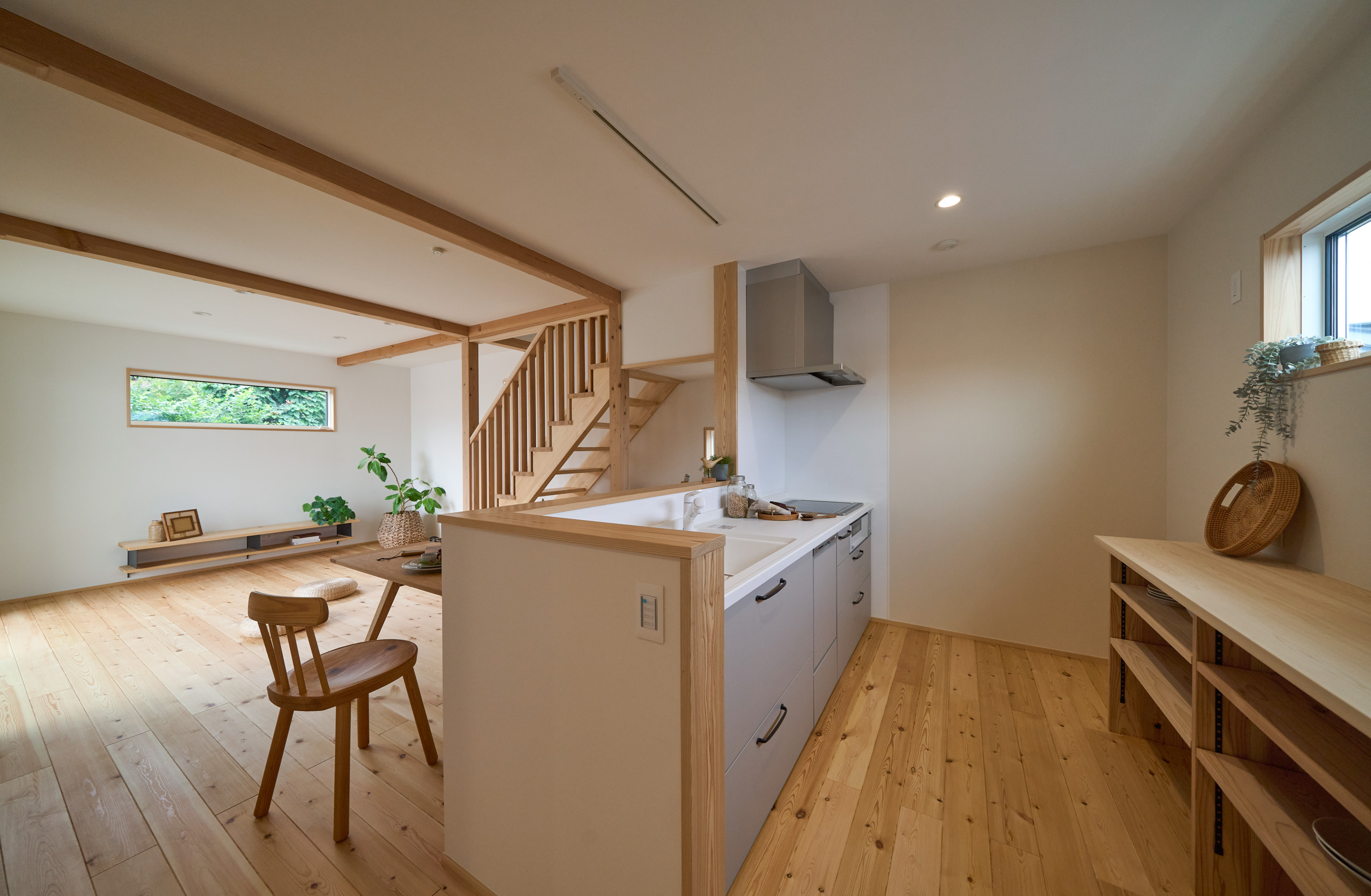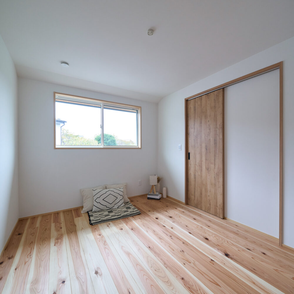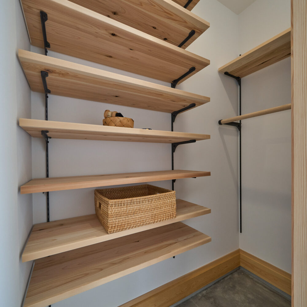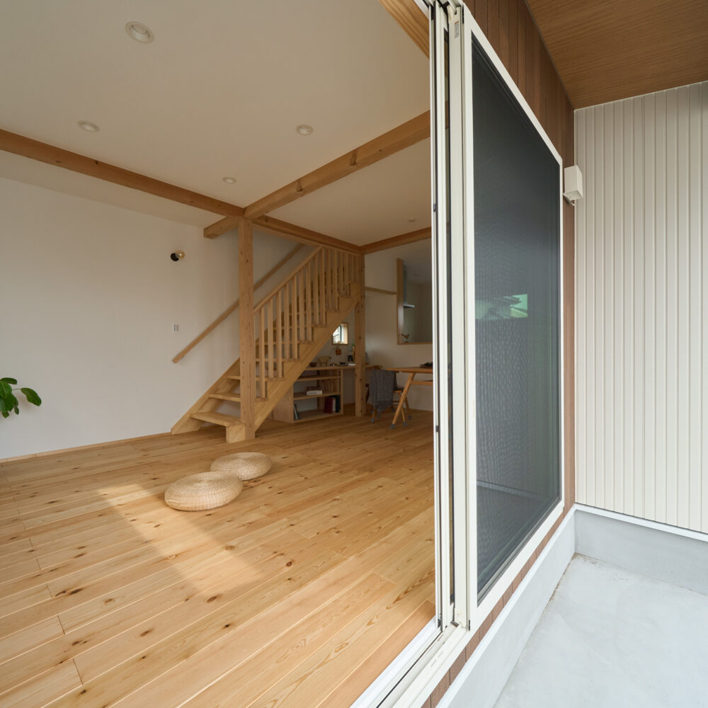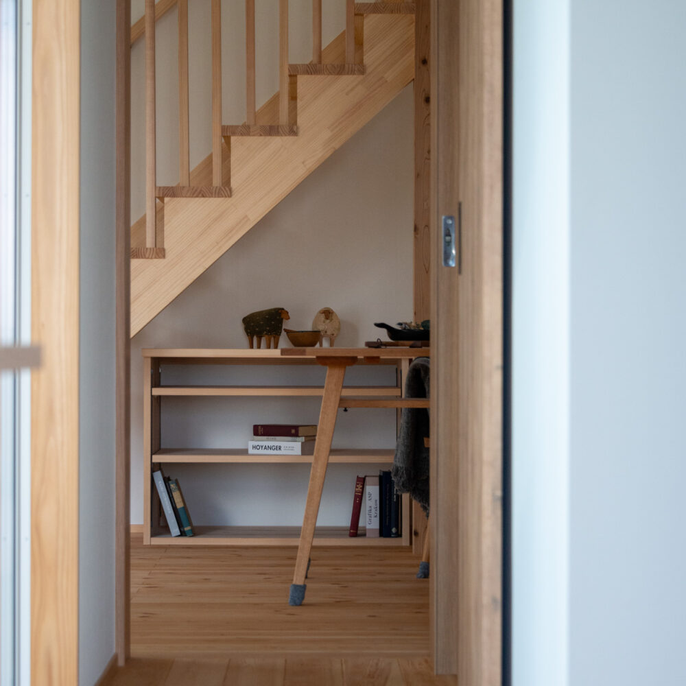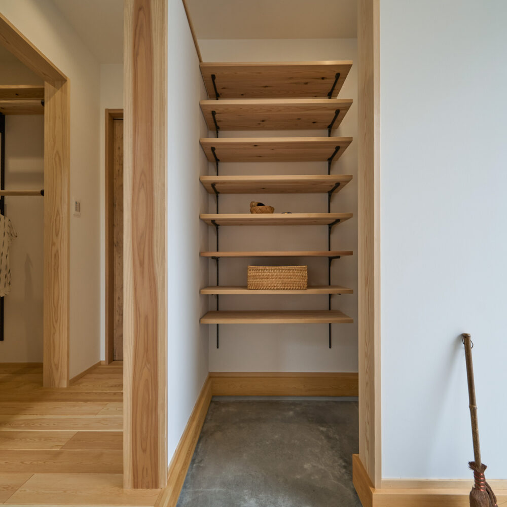 「お庭を眺められるリビングと、家事動線の良い暮らしやすい家を」とご希望された建主様。旗竿地をうまく活かした建物配置により、リビングの大きな掃き出し窓からは奥行きのある庭の景色を楽しめます。 また、玄関から家事室・ファミリークローゼット・キッチン・パントリーへと回遊できる、動きやすい家事動線を実現しました。リビング横には家族でシェアできるワークスペースを、さらに集中して仕事に取り組める書斎も設けています。 加えて、可変できる子供部屋や細やかに計画された収納、すっきりと隠せるロールスクリーン用の埋め込みボックスなど、日々の暮らしを心地よく整える工夫を随所に凝らしました。 1F 周辺環境を上手に活用したリビング 旗竿地で通りから玄関まで奥行きがあることや、周辺が緑の多い住宅地ということから窓の配置を導きました。大きな掃き出し窓からは抜けの良いお庭を。TVボード上部や、デスクスペースからは周辺の緑を望めるピクチャーウィンドウを設置。彩光もあるため、室内も明るく保てます。 家事効率が上がる、設備充実の回遊動線 玄関→リビング→キッチン→家事室と、ぐるっと動きやすい回遊動線。その動線上に収納やファミリークローゼット、パントリーなど多彩な設備を配置。特に家事室とクローゼットが近いことでスムーズな洗濯動線になっています。 2F 家族のライフスタイルに沿う場所づくり 2階には主寝室や子供部屋のほか、書斎や読書スペースを配置。書斎は仕事や趣味に、読書スペースには本棚を置いて好きな本を読み耽る、そんな場所をつくりました。子供部屋は成長に併せて2部屋に可変できる仕様に。主寝室には使い勝手の良い大きなクローゼットを設置。ライフスタイルや家族の変化にも柔軟に対応できる間取りです。