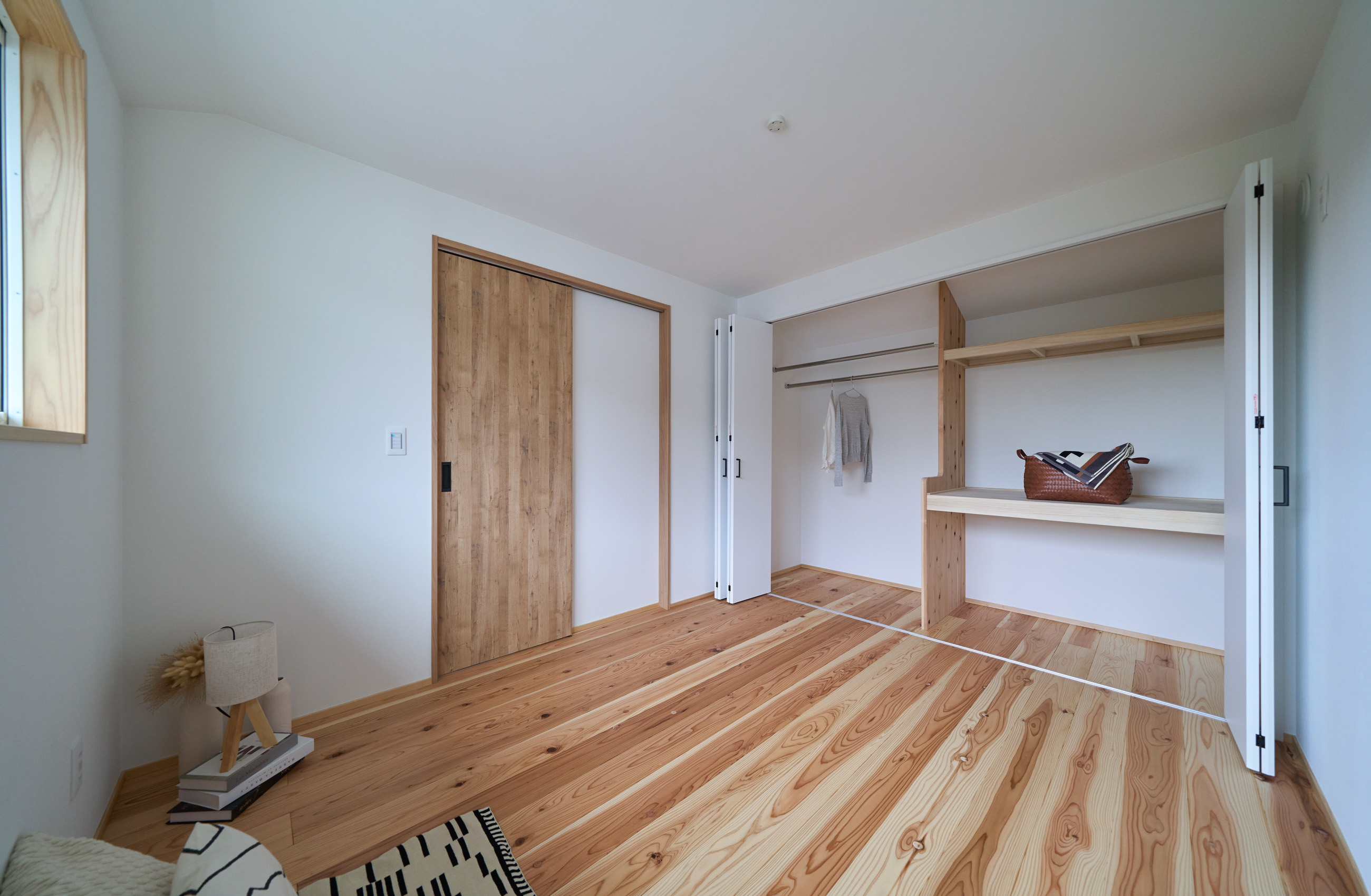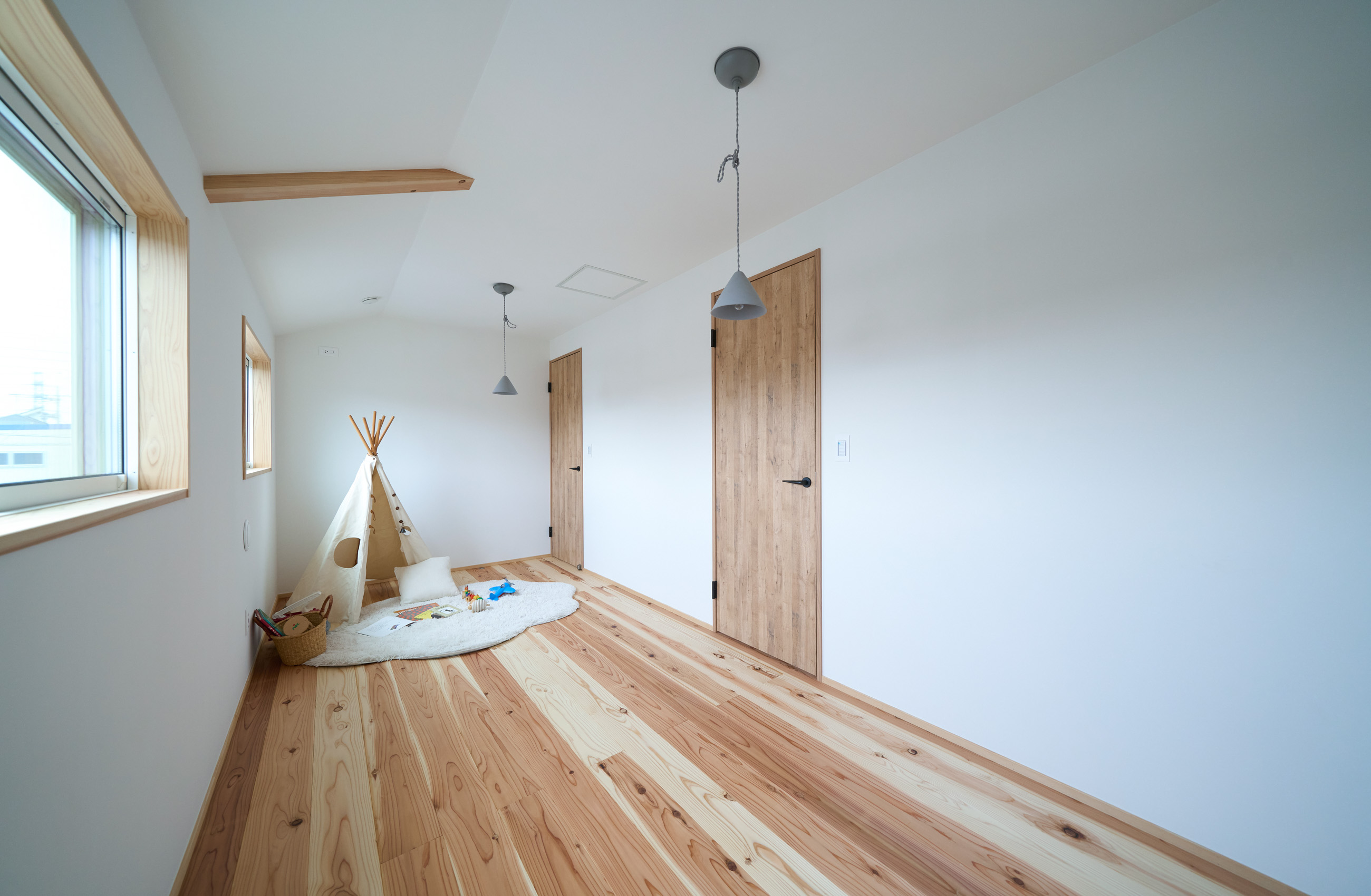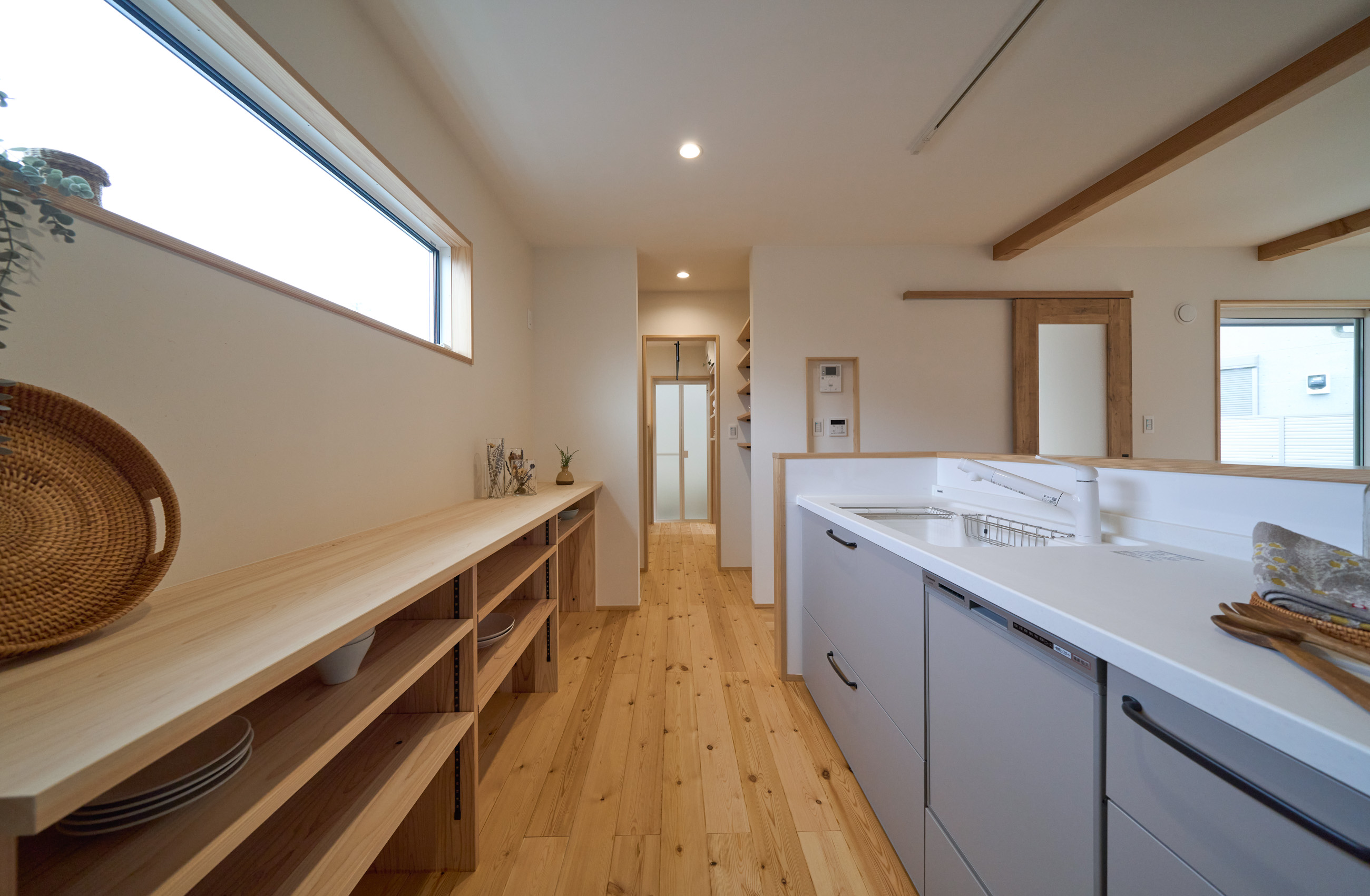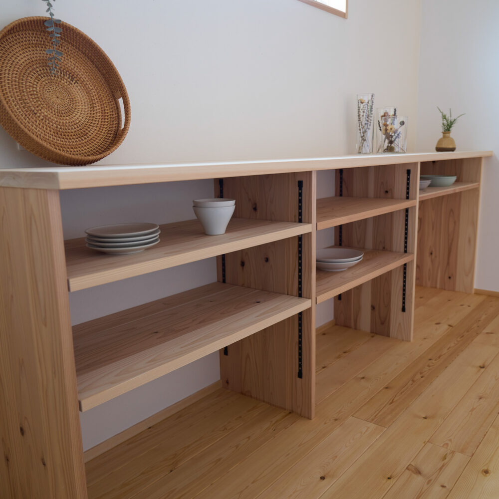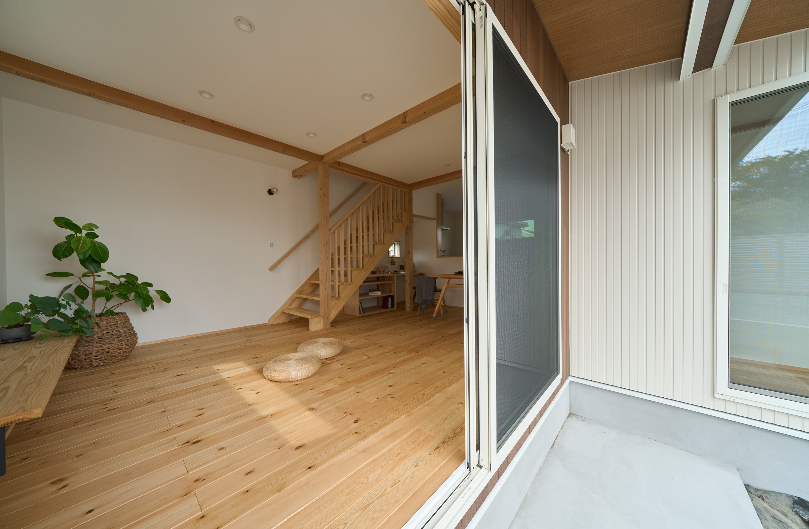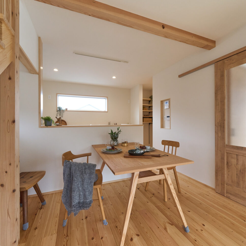 「お庭を眺められるリビングと、家事動線の良い暮らしやすい家を」とご希望された建主様。旗竿地をうまく活かした建物配置により、リビングの大きな掃き出し窓からは奥行きのある庭の景色を楽しめます。 また、玄関から家事室・ファミリークローゼット・キッチン・パントリーへと回遊できる、動きやすい家事動線を実現しました。リビング横には家族でシェアできるワークスペースを、さらに集中して仕事に取り組める書斎も設けています。 加えて、可変できる子供部屋や細やかに計画された収納、すっきりと隠せるロールスクリーン用の埋め込みボックスなど、日々の暮らしを心地よく整える工夫を随所に凝らしました。 1F 周辺環境を上手に活用したリビング 旗竿地で通りから玄関まで奥行きがあることや、周辺が緑の多い住宅地ということから窓の配置を導きました。大きな掃き出し窓からは抜けの良いお庭を。TVボード上部や、デスクスペースからは周辺の緑を望めるピクチャーウィンドウを設置。彩光もあるため、室内も明るく保てます。 家事効率が上がる、設備充実の回遊動線 玄関→リビング→キッチン→家事室と、ぐるっと動きやすい回遊動線。その動線上に収納やファミリークローゼット、パントリーなど多彩な設備を配置。特に家事室とクローゼットが近いことでスムーズな洗濯動線になっています。 2F 家族のライフスタイルに沿う場所づくり 2階には主寝室や子供部屋のほか、書斎や読書スペースを配置。書斎は仕事や趣味に、読書スペースには本棚を置いて好きな本を読み耽る、そんな場所をつくりました。子供部屋は成長に併せて2部屋に可変できる仕様に。主寝室には使い勝手の良い大きなクローゼットを設置。ライフスタイルや家族の変化にも柔軟に対応できる間取りです。