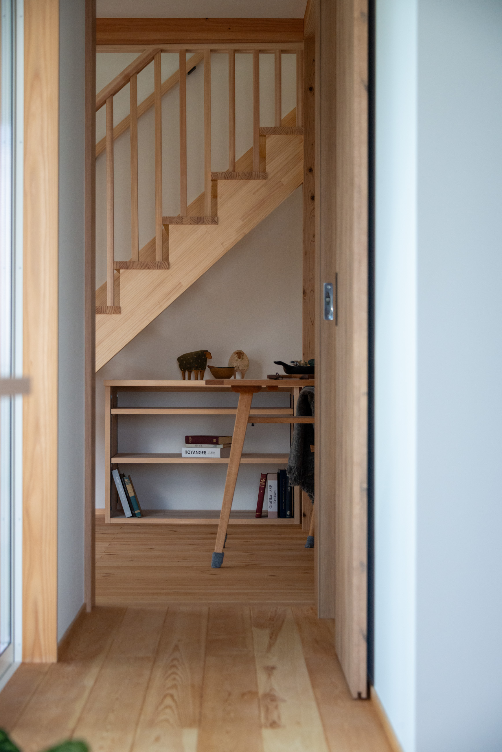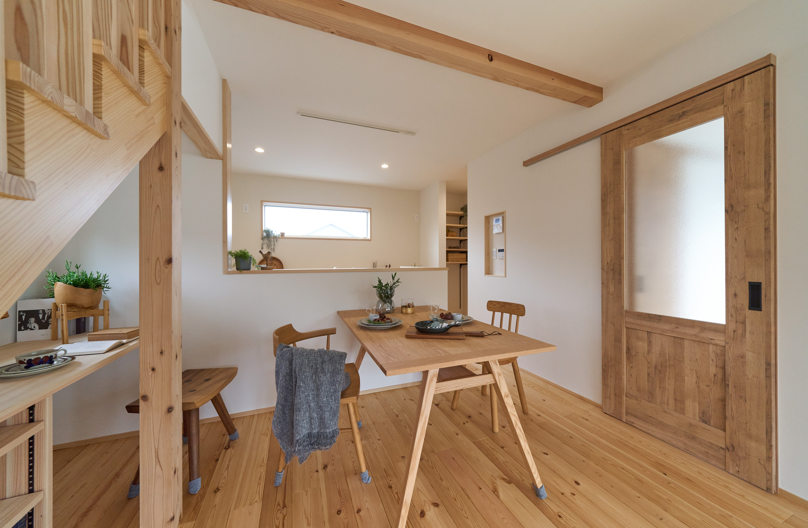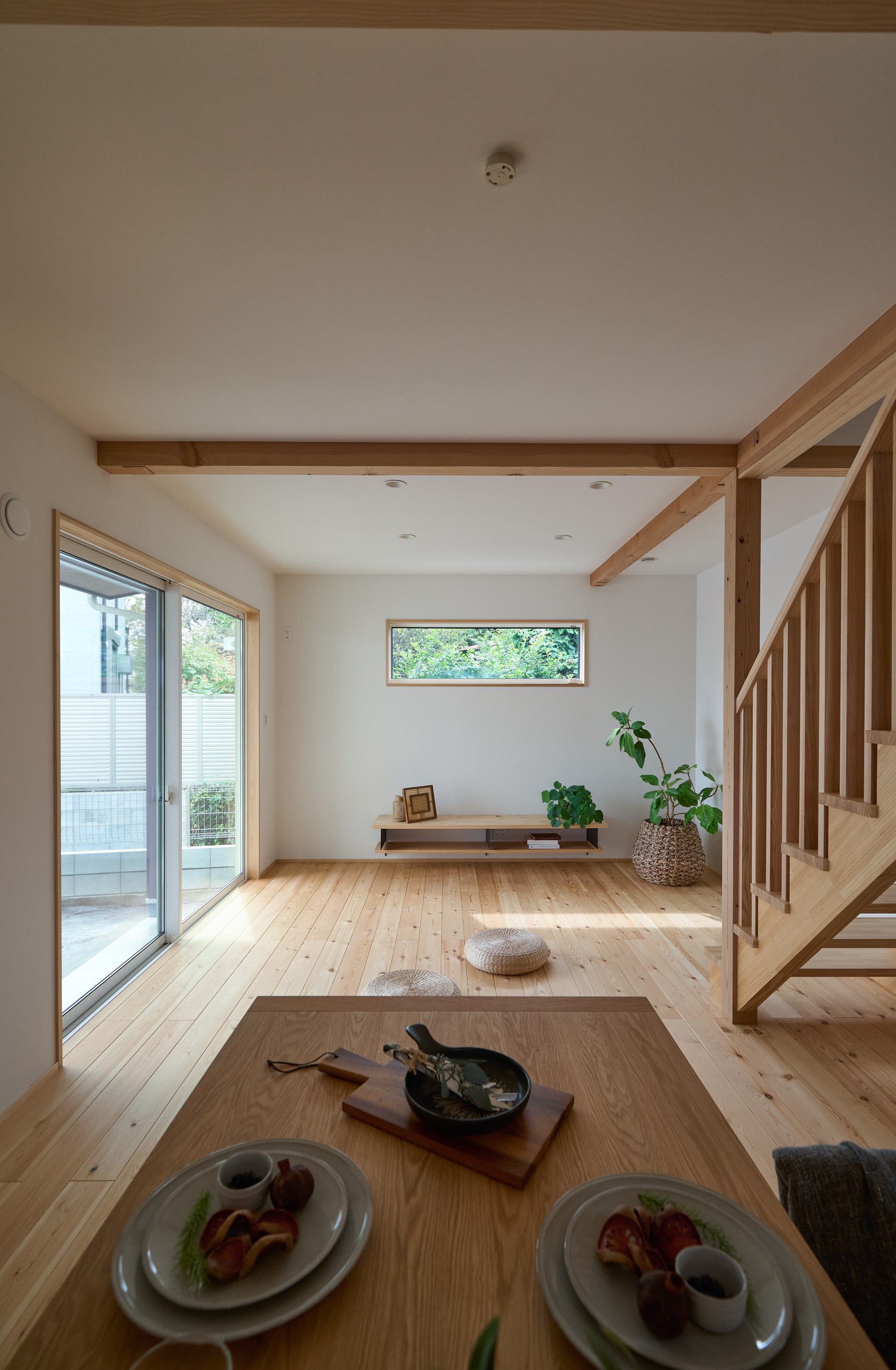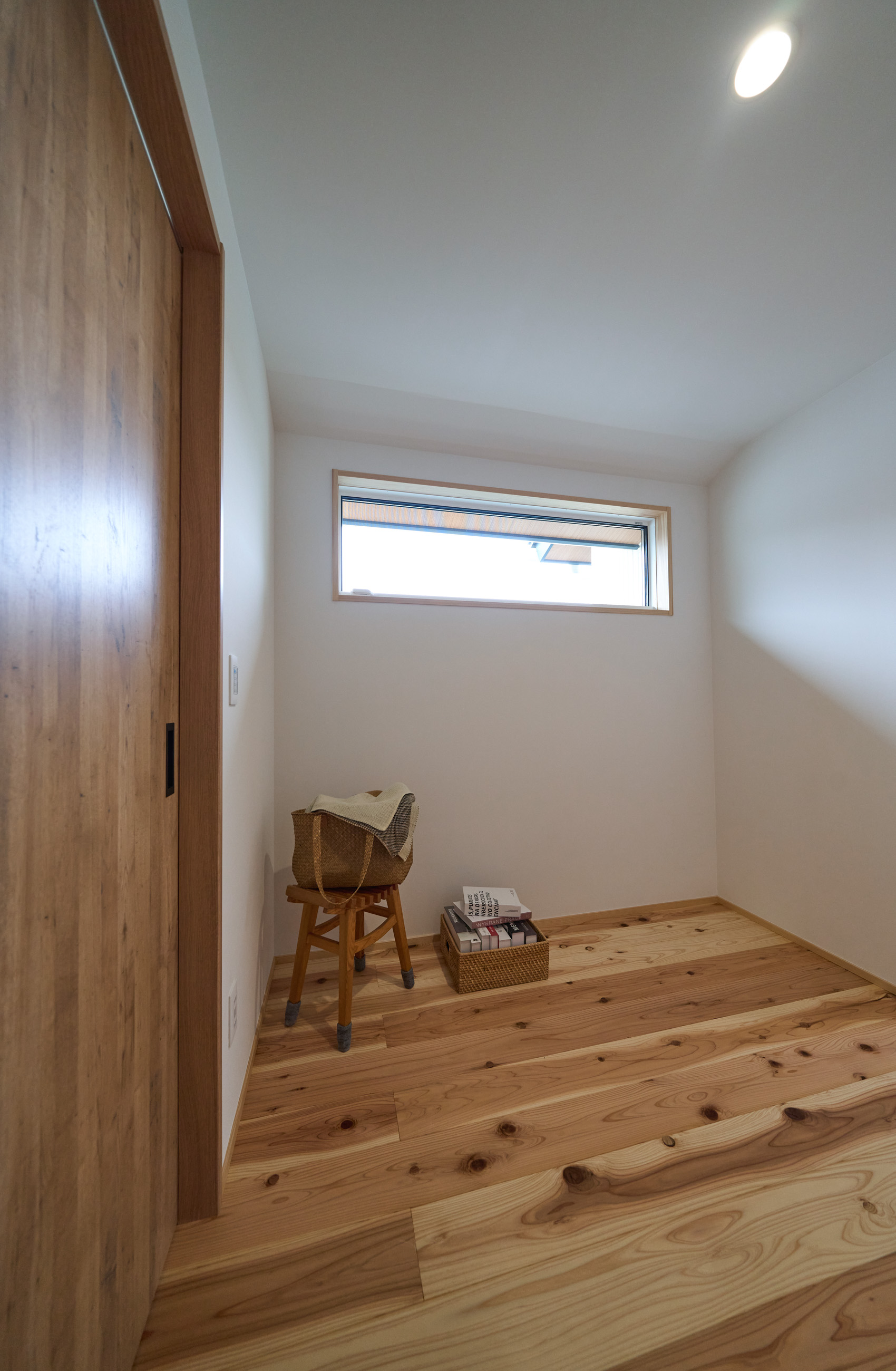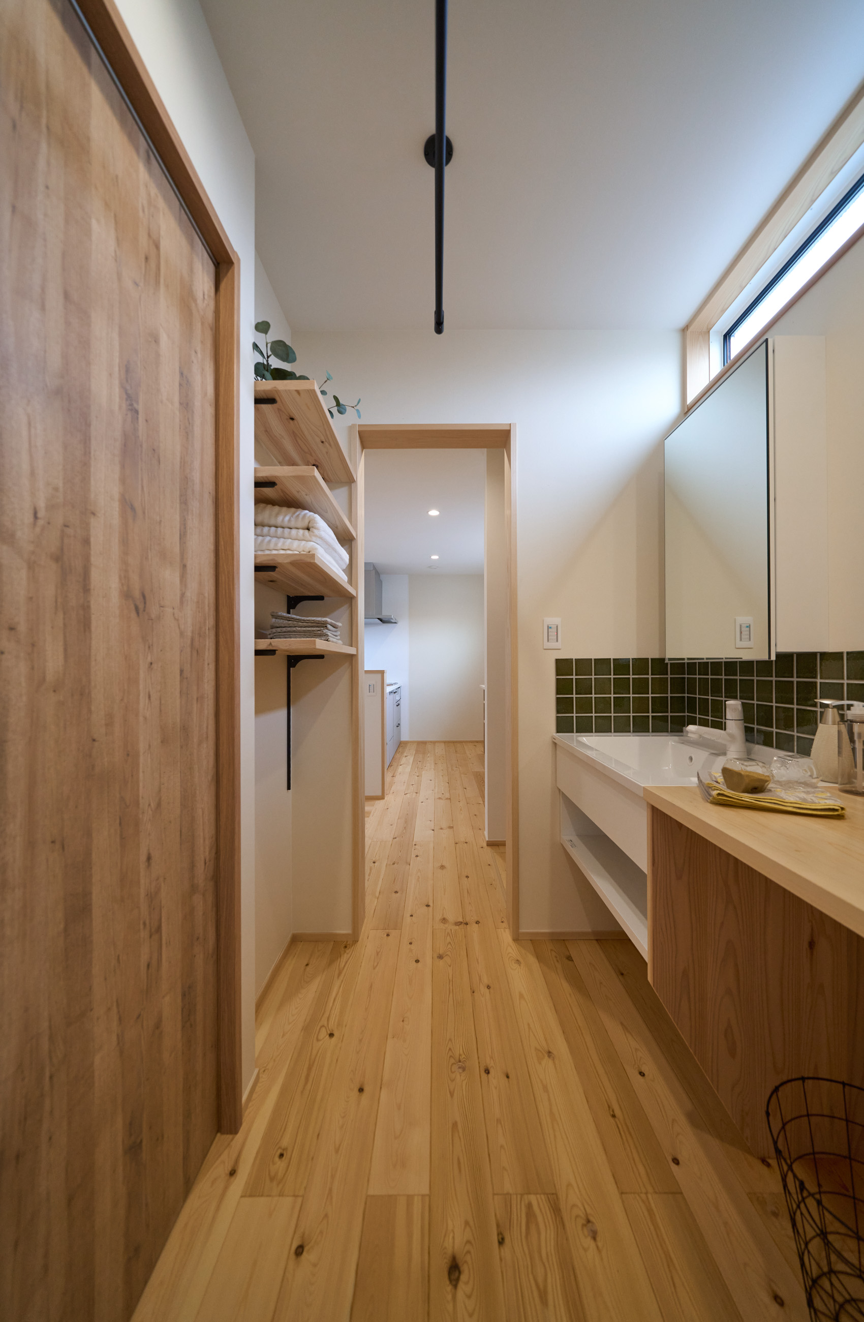「お庭を眺められるリビングと、家事動線の良い暮らしやすい家を」とご希望された建主様。旗竿地をうまく活かした建物配置により、リビングの大きな掃き出し窓からは奥行きのある庭の景色を楽しめます。 また、玄関から家事室・ファミリークローゼット・キッチン・パントリーへと回遊できる、動きやすい家事動線を実現しました。リビング横には家族でシェアできるワークスペースを、さらに集中して仕事に取り組める書斎も設けています。 加えて、可変できる子供部屋や細やかに計画された収納、すっきりと隠せるロールスクリーン用の埋め込みボックスなど、日々の暮らしを心地よく整える工夫を随所に凝らしました。 1F 周辺環境を上手に活用したリビング 旗竿地で通りから玄関まで奥行きがあることや、周辺が緑の多い住宅地ということから窓の配置を導きました。大きな掃き出し窓からは抜けの良いお庭を。TVボード上部や、デスクスペースからは周辺の緑を望めるピクチャーウィンドウを設置。彩光もあるため、室内も明るく保てます。 家事効率が上がる、設備充実の回遊動線 玄関→リビング→キッチン→家事室と、ぐるっと動きやすい回遊動線。その動線上に収納やファミリークローゼット、パントリーなど多彩な設備を配置。特に家事室とクローゼットが近いことでスムーズな洗濯動線になっています。 2F 家族のライフスタイルに沿う場所づくり 2階には主寝室や子供部屋のほか、書斎や読書スペースを配置。書斎は仕事や趣味に、読書スペースには本棚を置いて好きな本を読み耽る、そんな場所をつくりました。子供部屋は成長に併せて2部屋に可変できる仕様に。主寝室には使い勝手の良い大きなクローゼットを設置。ライフスタイルや家族の変化にも柔軟に対応できる間取りです。