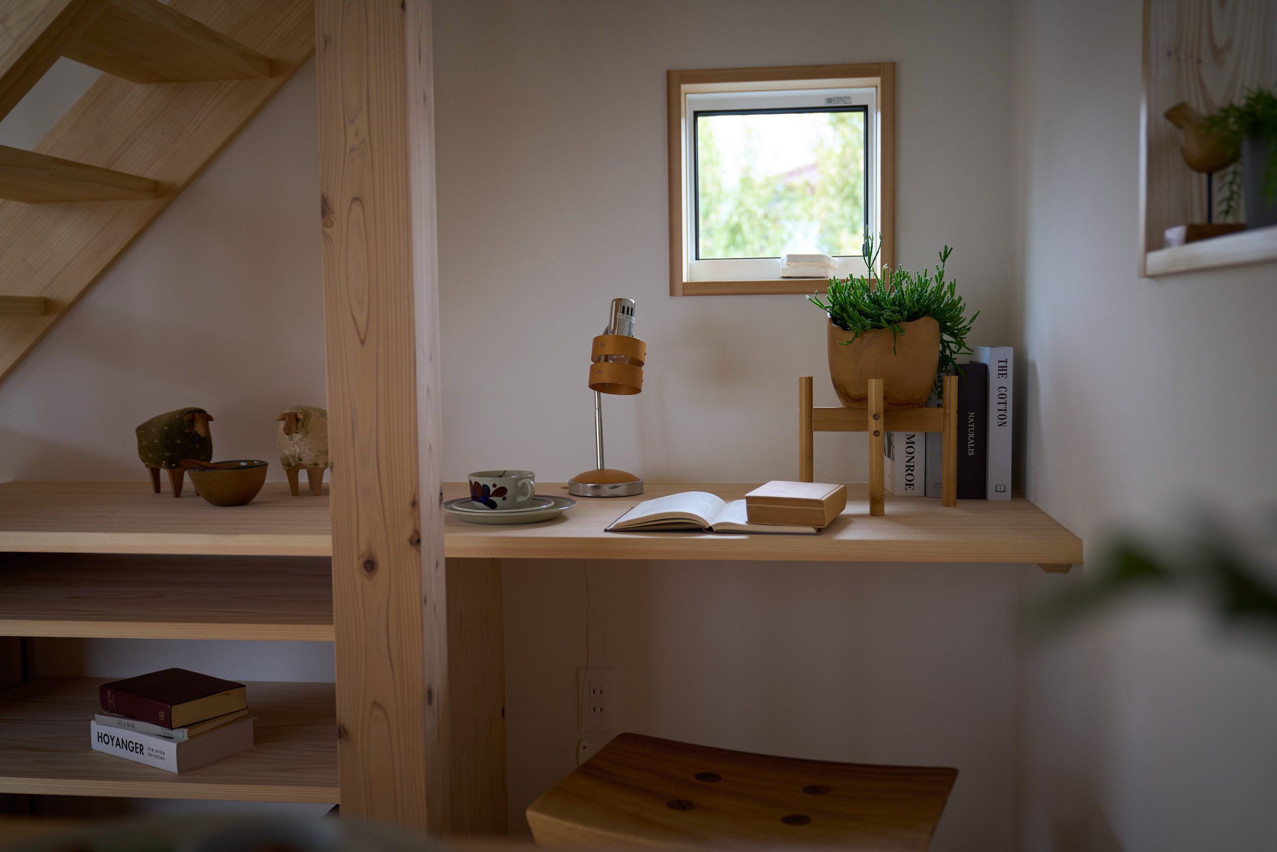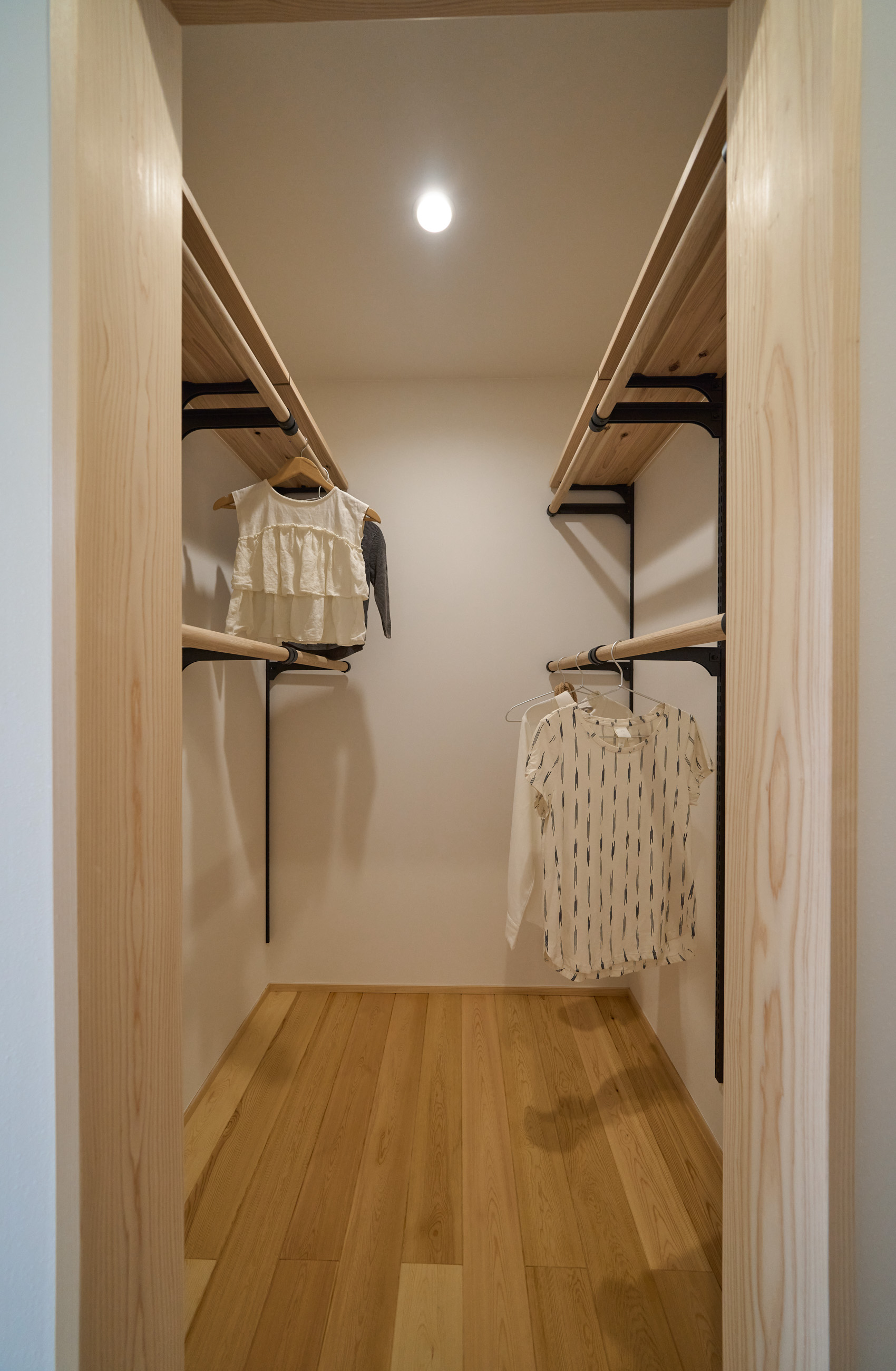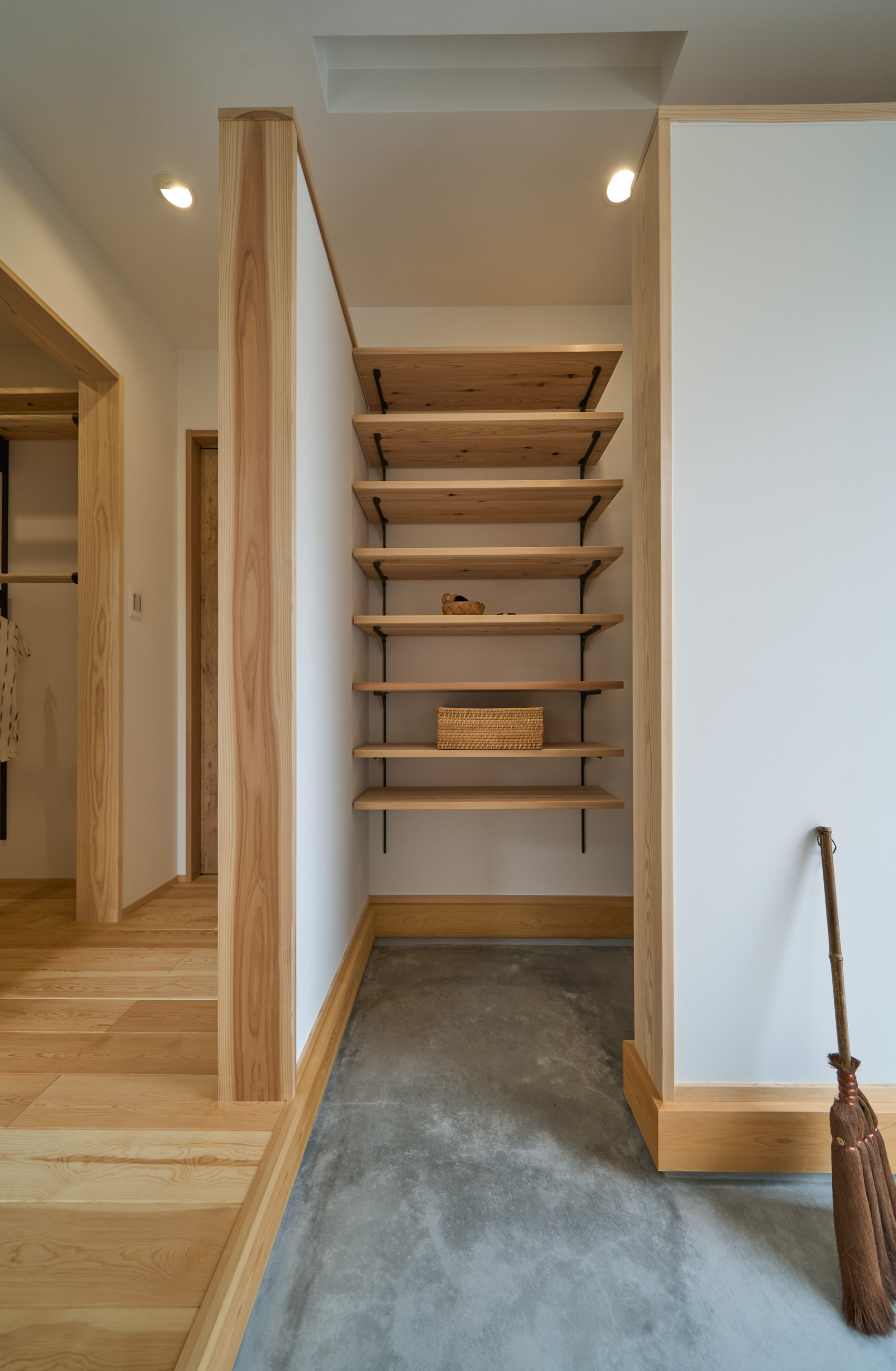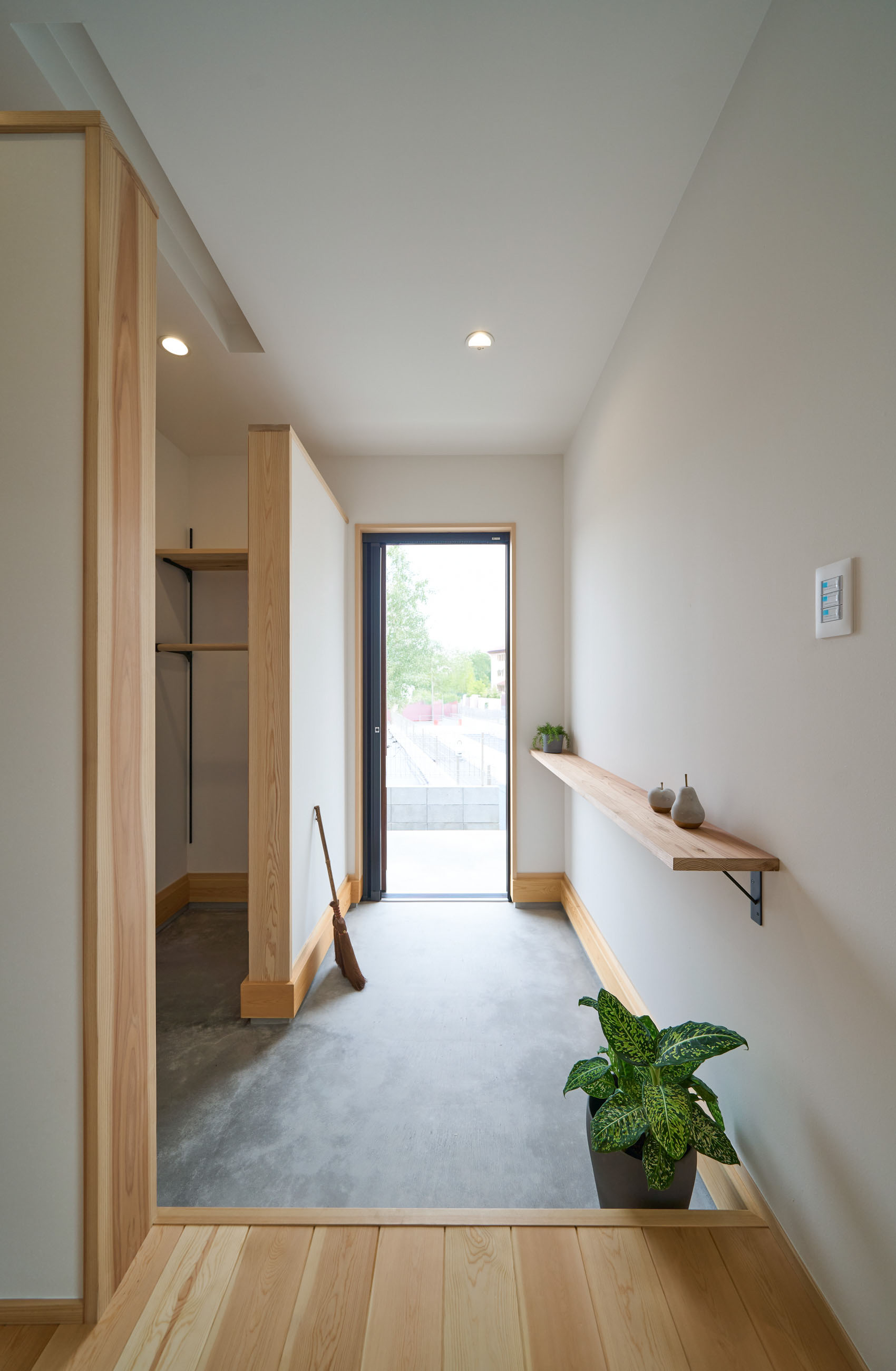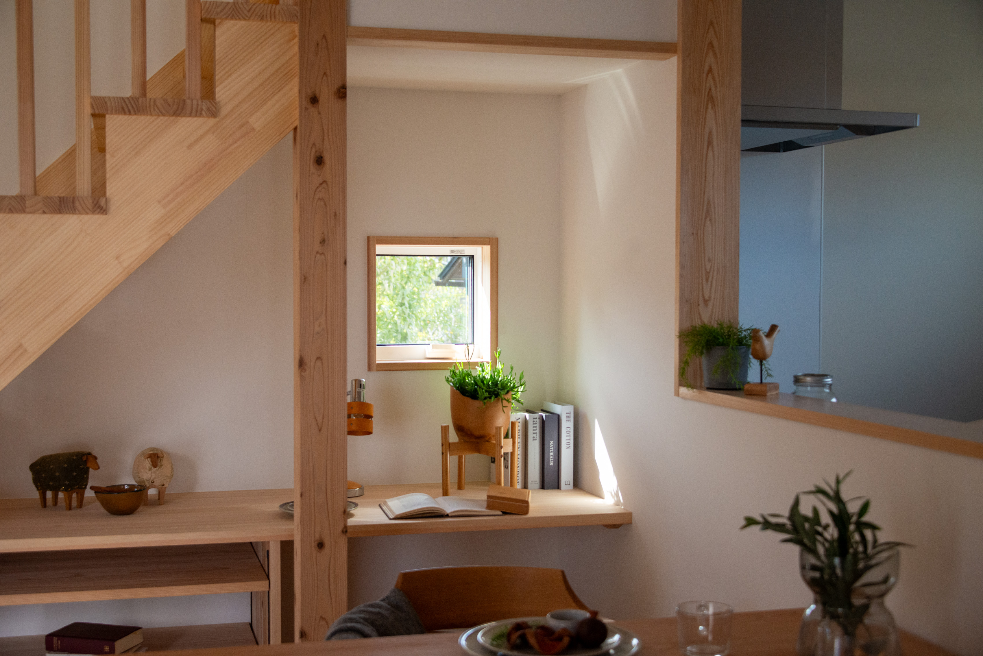 「お庭を眺められるリビングと、家事動線の良い暮らしやすい家を」とご希望された建主様。旗竿地をうまく活かした建物配置により、リビングの大きな掃き出し窓からは奥行きのある庭の景色を楽しめます。 また、玄関から家事室・ファミリークローゼット・キッチン・パントリーへと回遊できる、動きやすい家事動線を実現しました。リビング横には家族でシェアできるワークスペースを、さらに集中して仕事に取り組める書斎も設けています。 加えて、可変できる子供部屋や細やかに計画された収納、すっきりと隠せるロールスクリーン用の埋め込みボックスなど、日々の暮らしを心地よく整える工夫を随所に凝らしました。 1F 周辺環境を上手に活用したリビング 旗竿地で通りから玄関まで奥行きがあることや、周辺が緑の多い住宅地ということから窓の配置を導きました。大きな掃き出し窓からは抜けの良いお庭を。TVボード上部や、デスクスペースからは周辺の緑を望めるピクチャーウィンドウを設置。彩光もあるため、室内も明るく保てます。 家事効率が上がる、設備充実の回遊動線 玄関→リビング→キッチン→家事室と、ぐるっと動きやすい回遊動線。その動線上に収納やファミリークローゼット、パントリーなど多彩な設備を配置。特に家事室とクローゼットが近いことでスムーズな洗濯動線になっています。 2F 家族のライフスタイルに沿う場所づくり 2階には主寝室や子供部屋のほか、書斎や読書スペースを配置。書斎は仕事や趣味に、読書スペースには本棚を置いて好きな本を読み耽る、そんな場所をつくりました。子供部屋は成長に併せて2部屋に可変できる仕様に。主寝室には使い勝手の良い大きなクローゼットを設置。ライフスタイルや家族の変化にも柔軟に対応できる間取りです。
