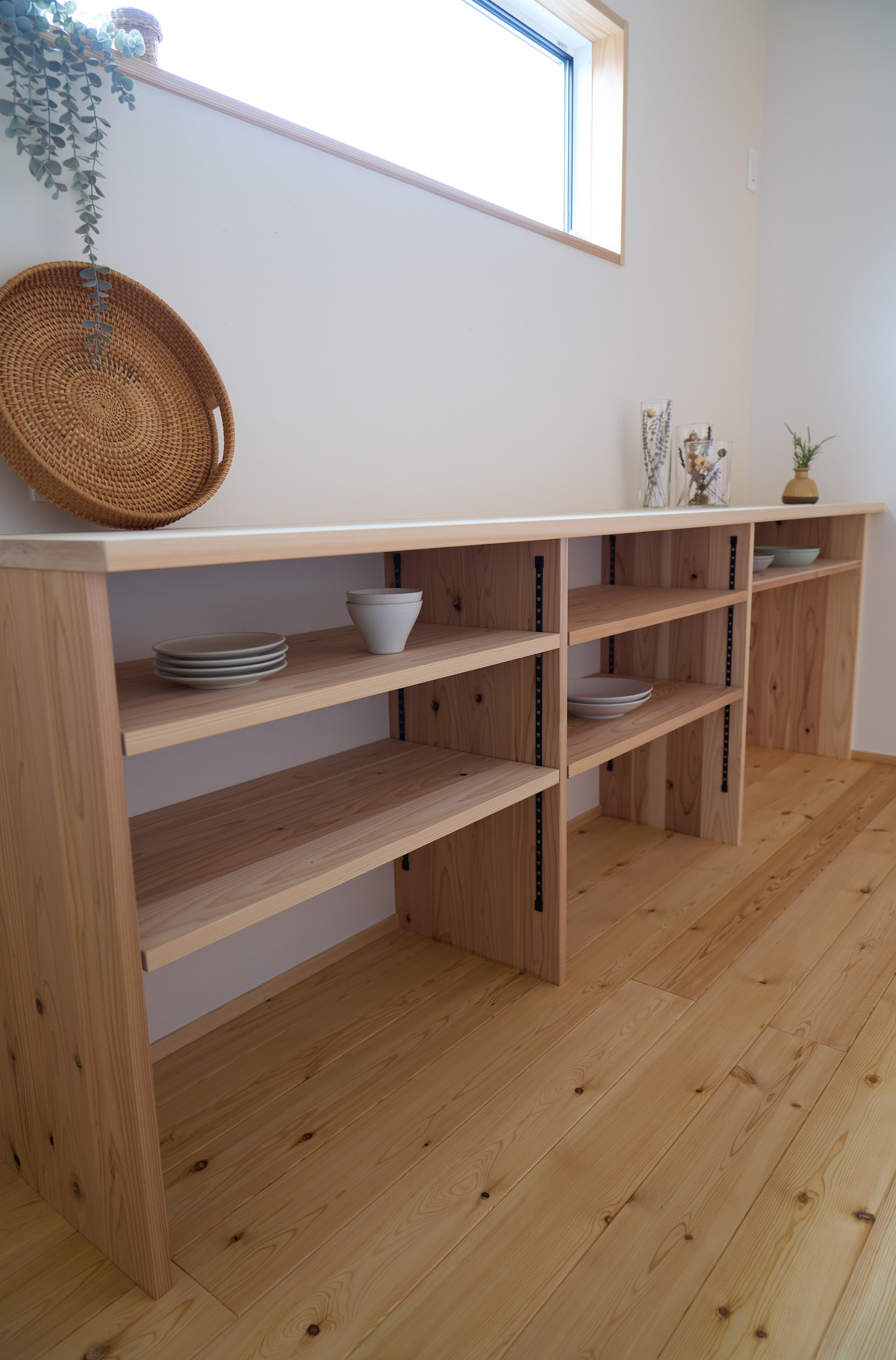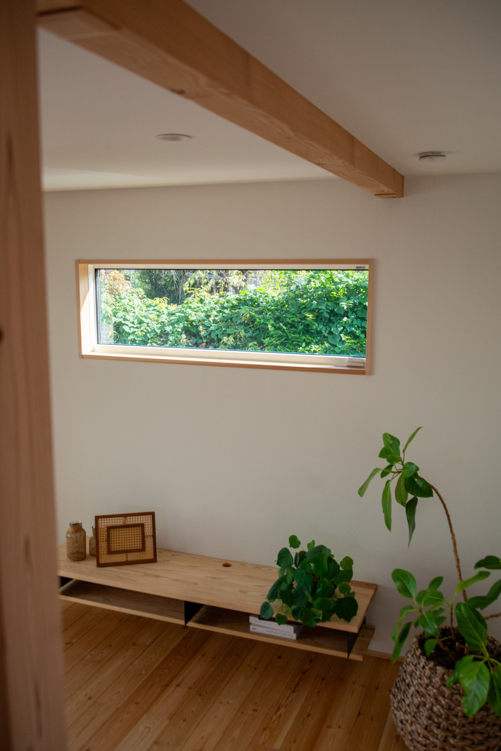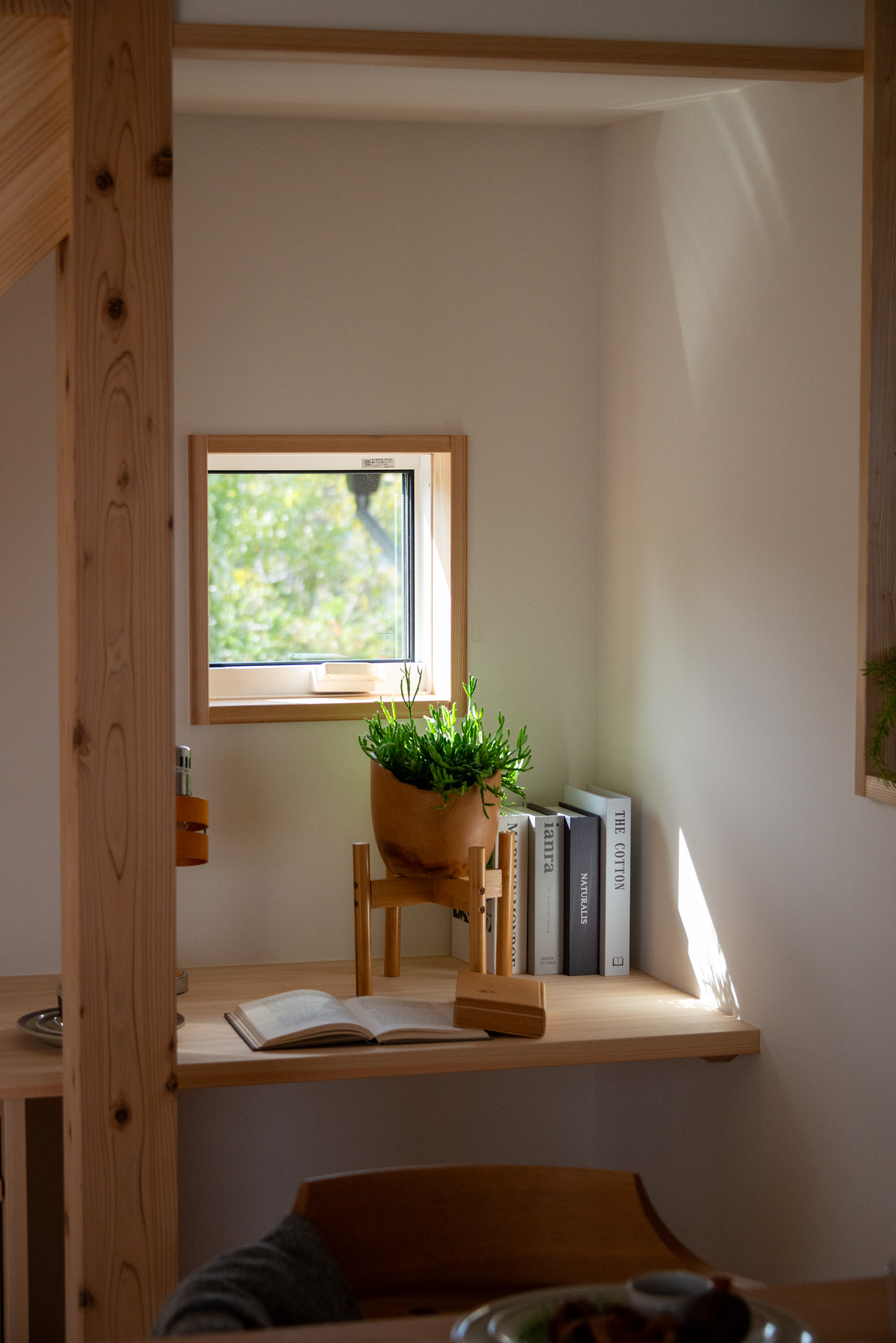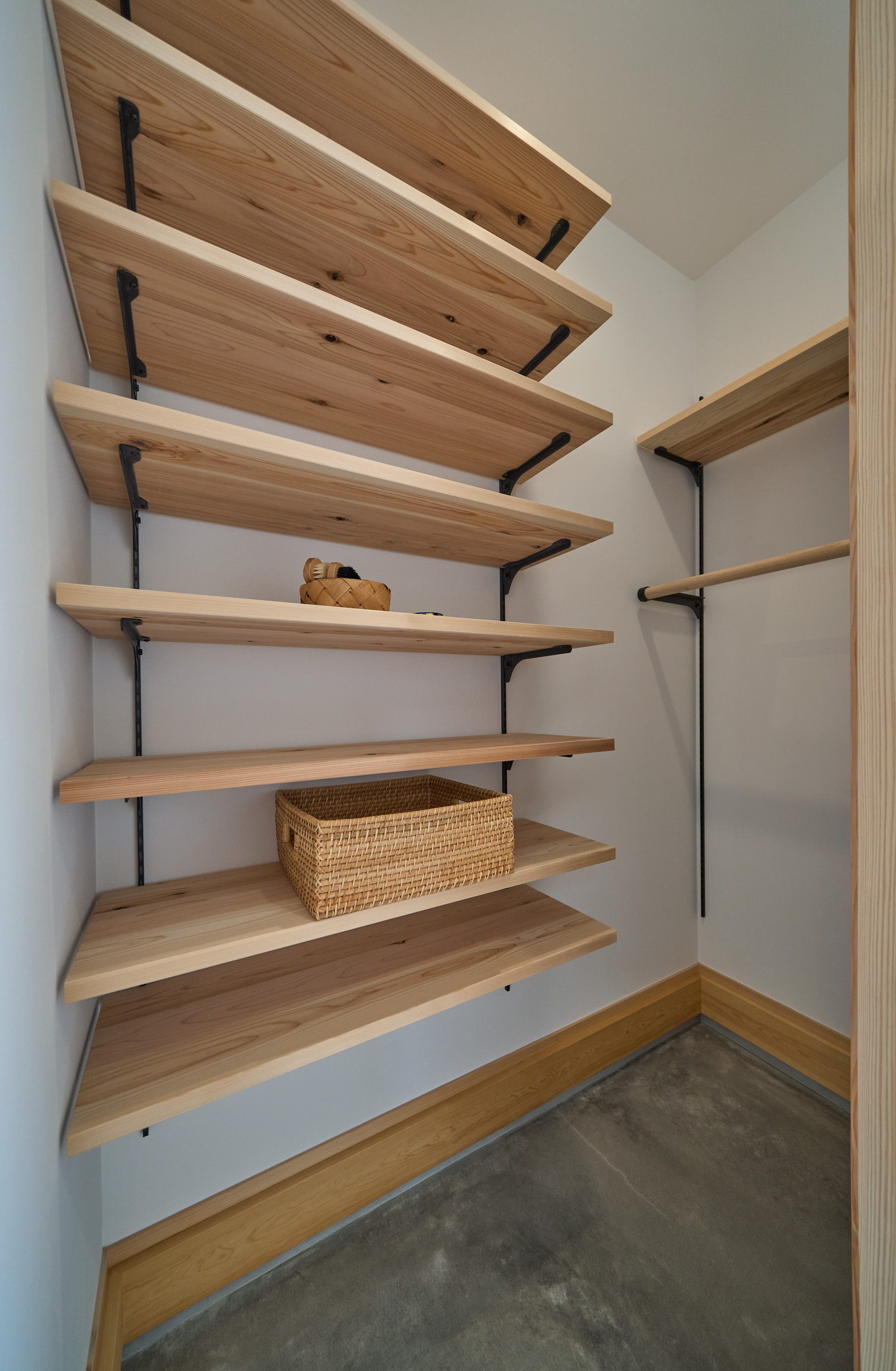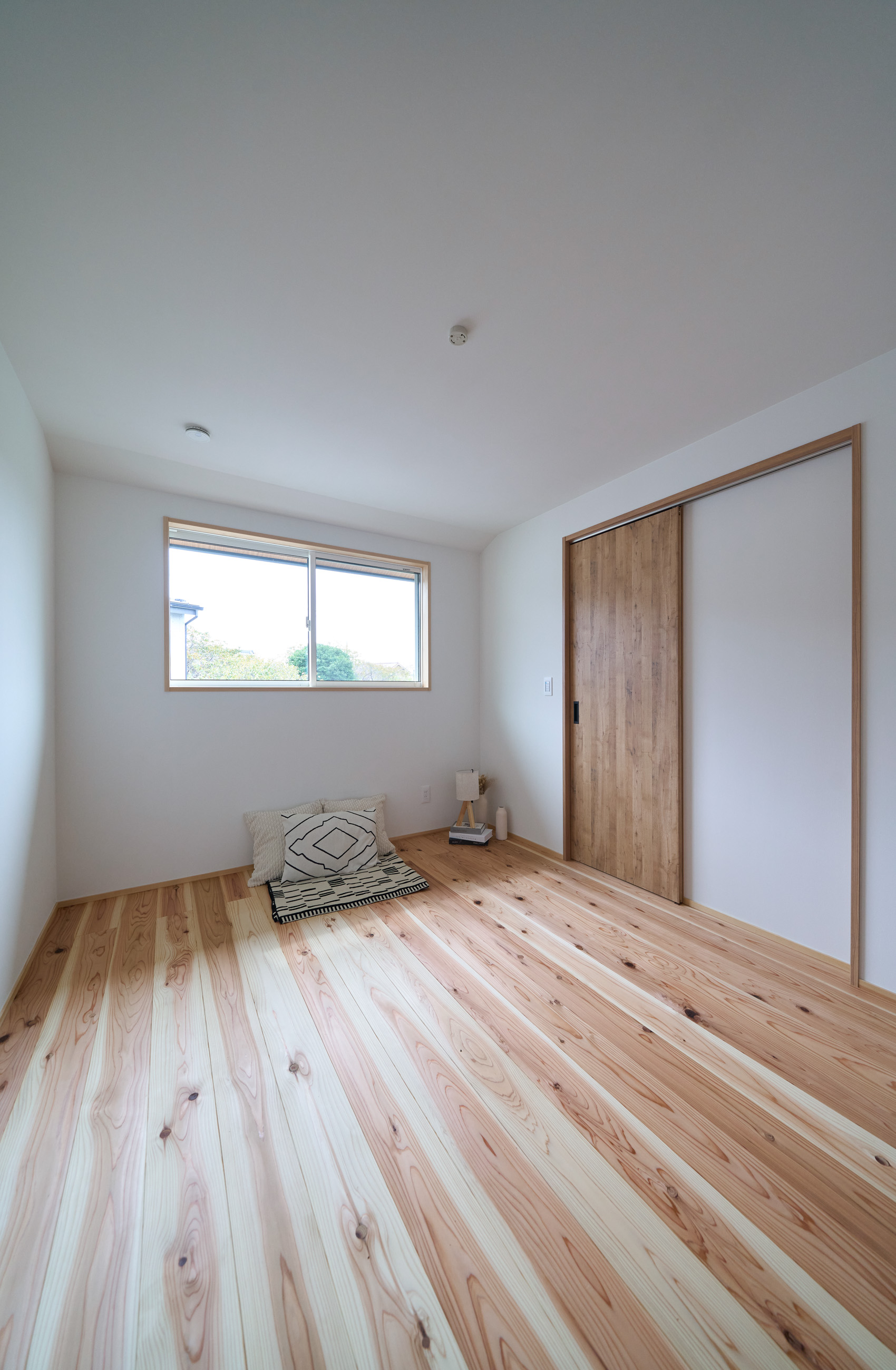 「お庭を眺められるリビングと、家事動線の良い暮らしやすい家を」とご希望された建主様。旗竿地をうまく活かした建物配置により、リビングの大きな掃き出し窓からは奥行きのある庭の景色を楽しめます。 また、玄関から家事室・ファミリークローゼット・キッチン・パントリーへと回遊できる、動きやすい家事動線を実現しました。リビング横には家族でシェアできるワークスペースを、さらに集中して仕事に取り組める書斎も設けています。 加えて、可変できる子供部屋や細やかに計画された収納、すっきりと隠せるロールスクリーン用の埋め込みボックスなど、日々の暮らしを心地よく整える工夫を随所に凝らしました。 1F 周辺環境を上手に活用したリビング 旗竿地で通りから玄関まで奥行きがあることや、周辺が緑の多い住宅地ということから窓の配置を導きました。大きな掃き出し窓からは抜けの良いお庭を。TVボード上部や、デスクスペースからは周辺の緑を望めるピクチャーウィンドウを設置。彩光もあるため、室内も明るく保てます。 家事効率が上がる、設備充実の回遊動線 玄関→リビング→キッチン→家事室と、ぐるっと動きやすい回遊動線。その動線上に収納やファミリークローゼット、パントリーなど多彩な設備を配置。特に家事室とクローゼットが近いことでスムーズな洗濯動線になっています。 2F 家族のライフスタイルに沿う場所づくり 2階には主寝室や子供部屋のほか、書斎や読書スペースを配置。書斎は仕事や趣味に、読書スペースには本棚を置いて好きな本を読み耽る、そんな場所をつくりました。子供部屋は成長に併せて2部屋に可変できる仕様に。主寝室には使い勝手の良い大きなクローゼットを設置。ライフスタイルや家族の変化にも柔軟に対応できる間取りです。