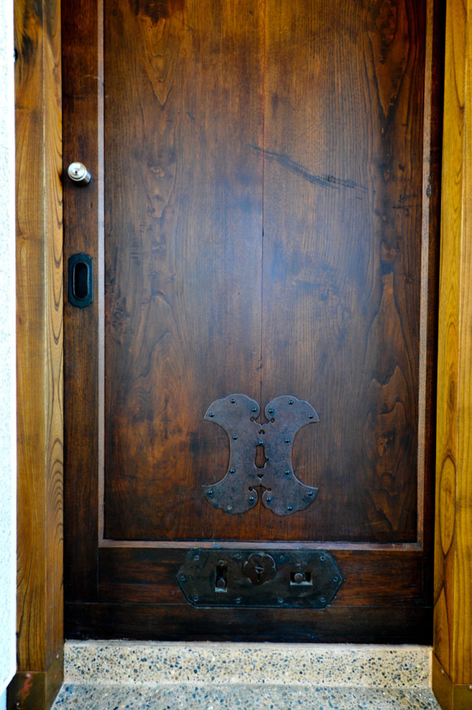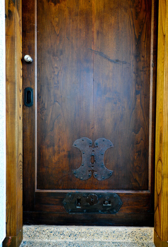 玄関にはご主人が見つけた本物の蔵戸。無機質だったRC擁壁に、奥様のご友人が名を刻んだことで、家全体に命が吹き込まれました。