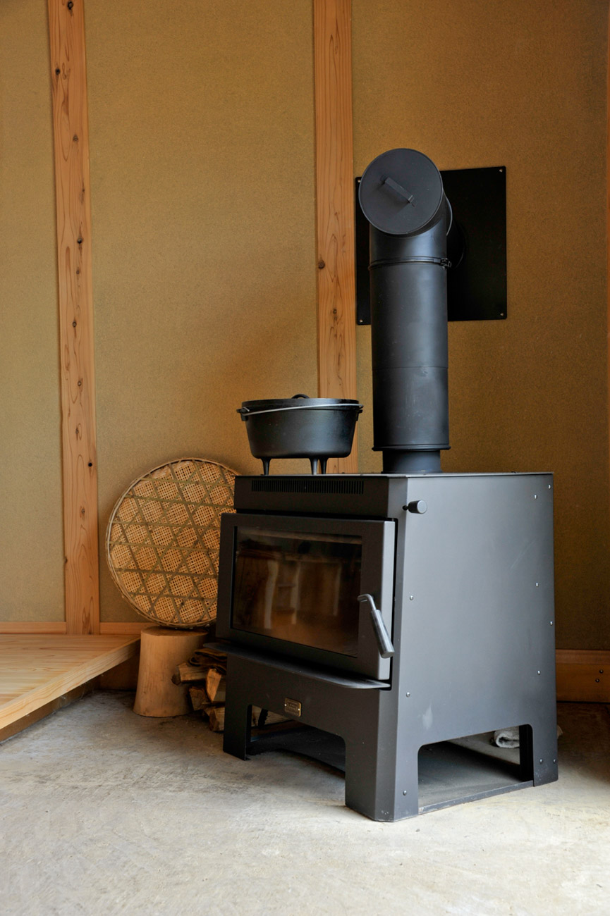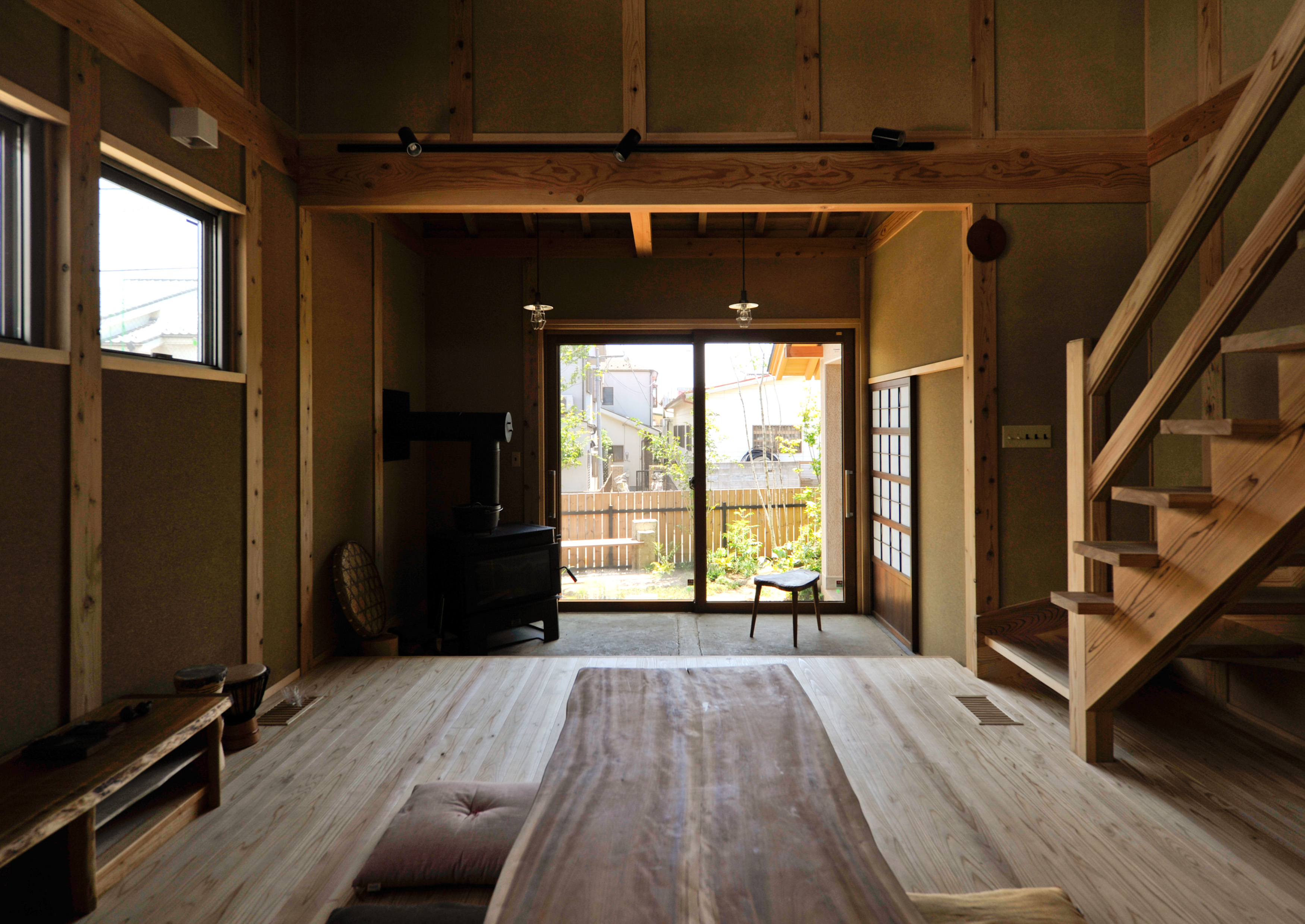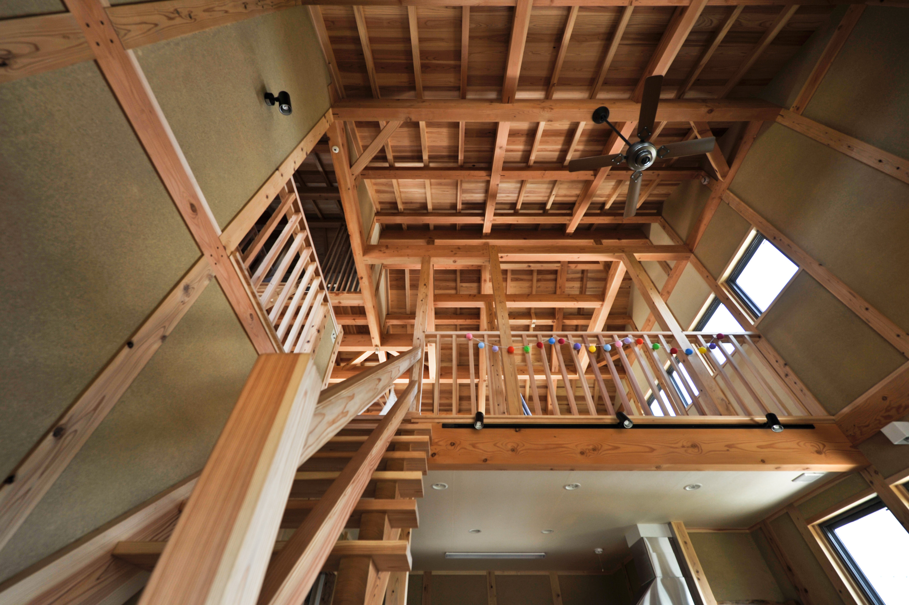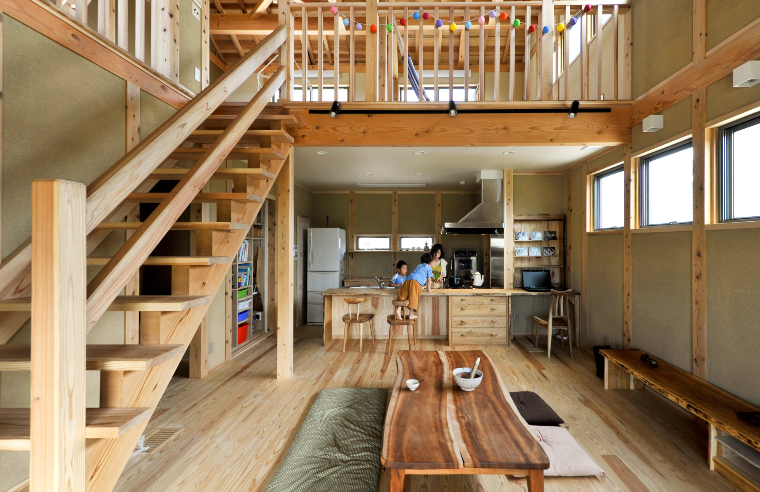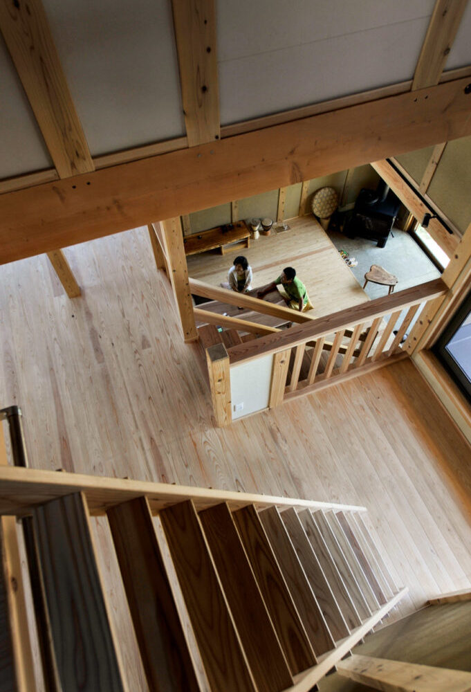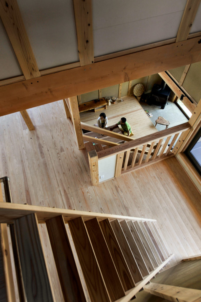 天井までのびる吹き抜けは地熱換気との相性も良く、常に家中を空気が循環。一台の薪ストーブで100坪を暖める力を持ち、冬でもやさしい暖かさに包まれます。