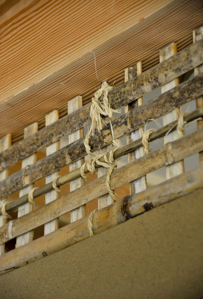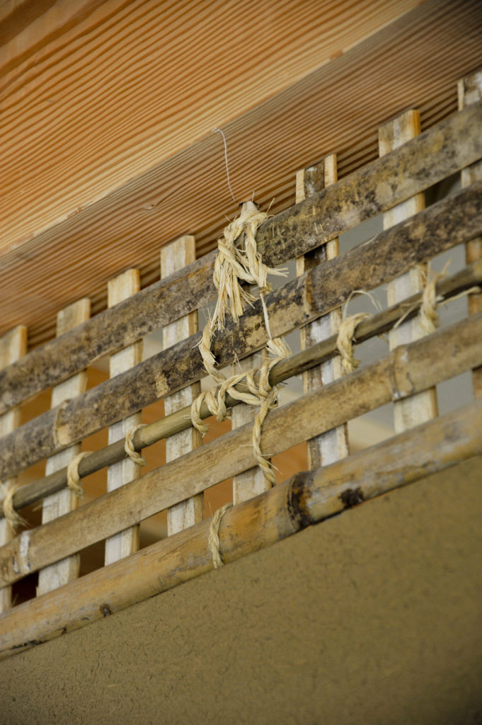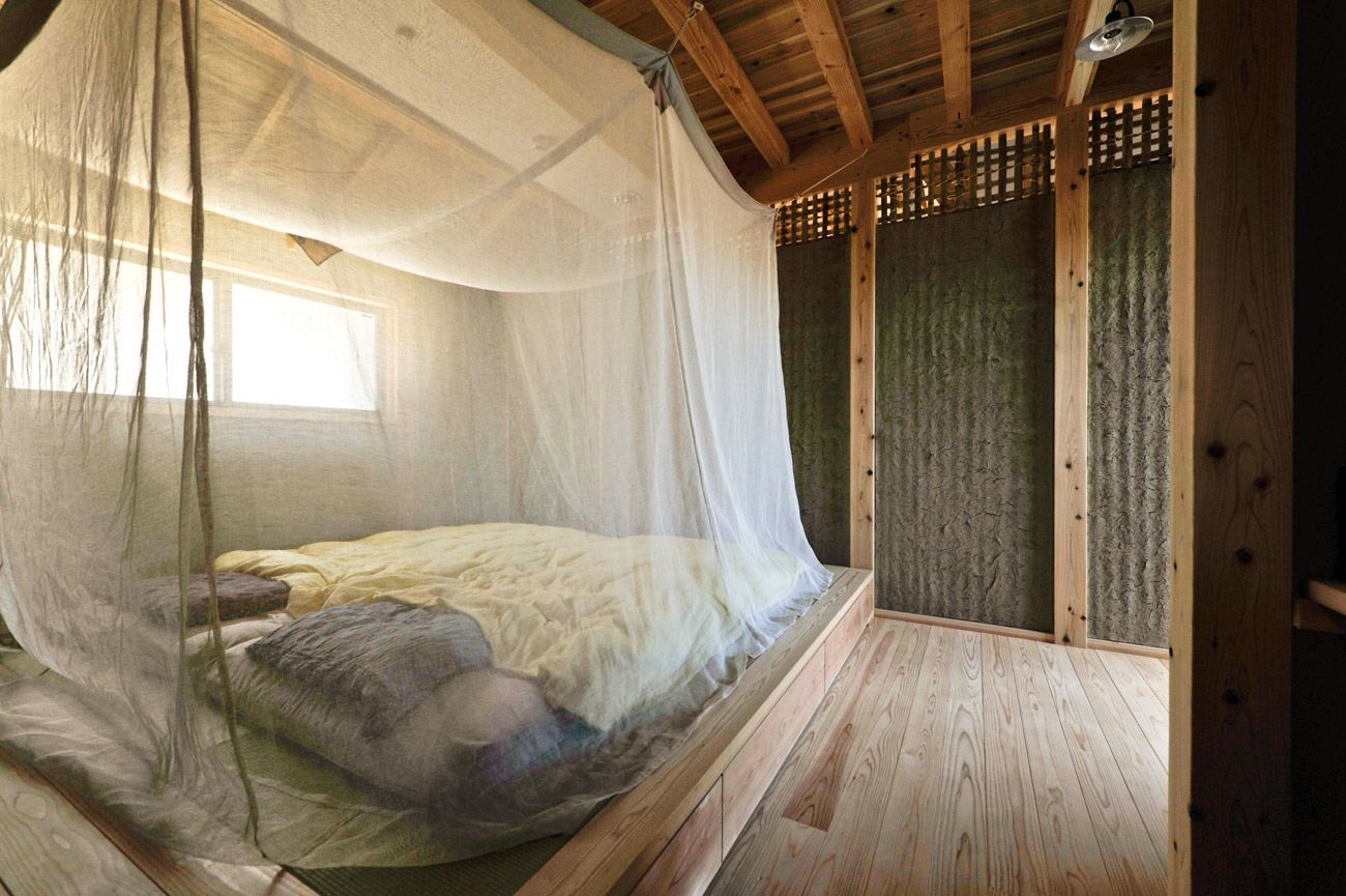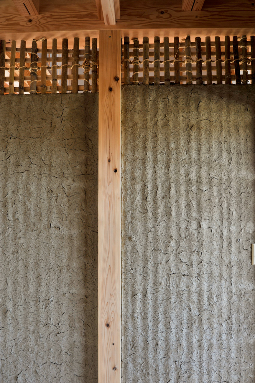 外壁には火山灰を原料にしたシラス壁、内土間には発酵させた荒木田土を使った三和土(たたき)、寝室には竹小舞に本物の土壁──昔ながらの素材と技が、空間にぬくもりと豊かさをもたらします。