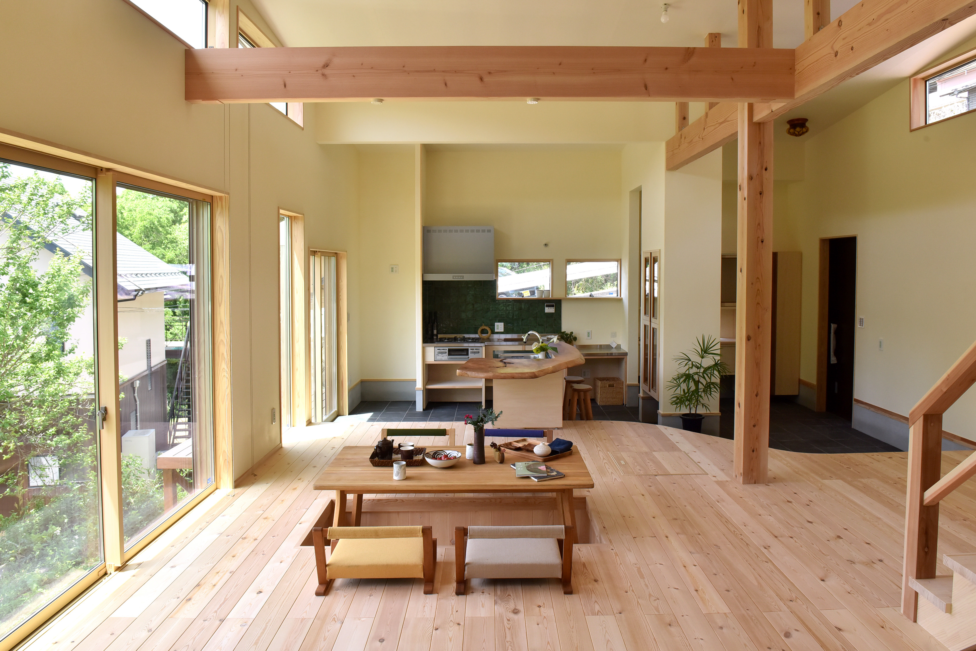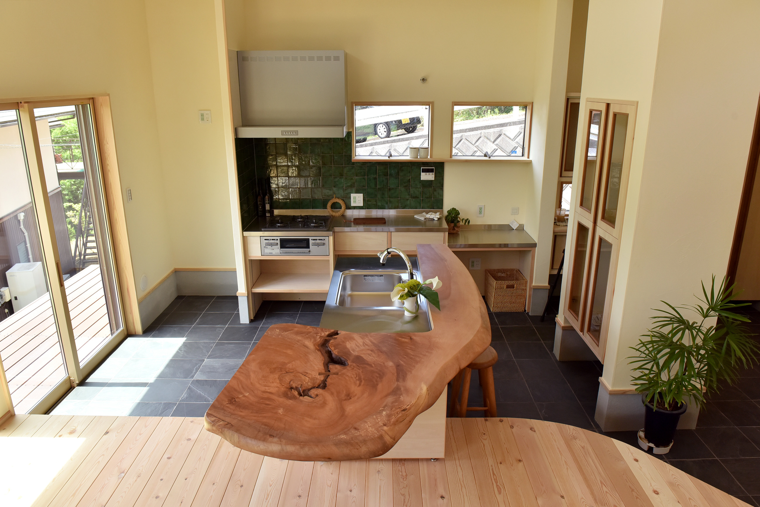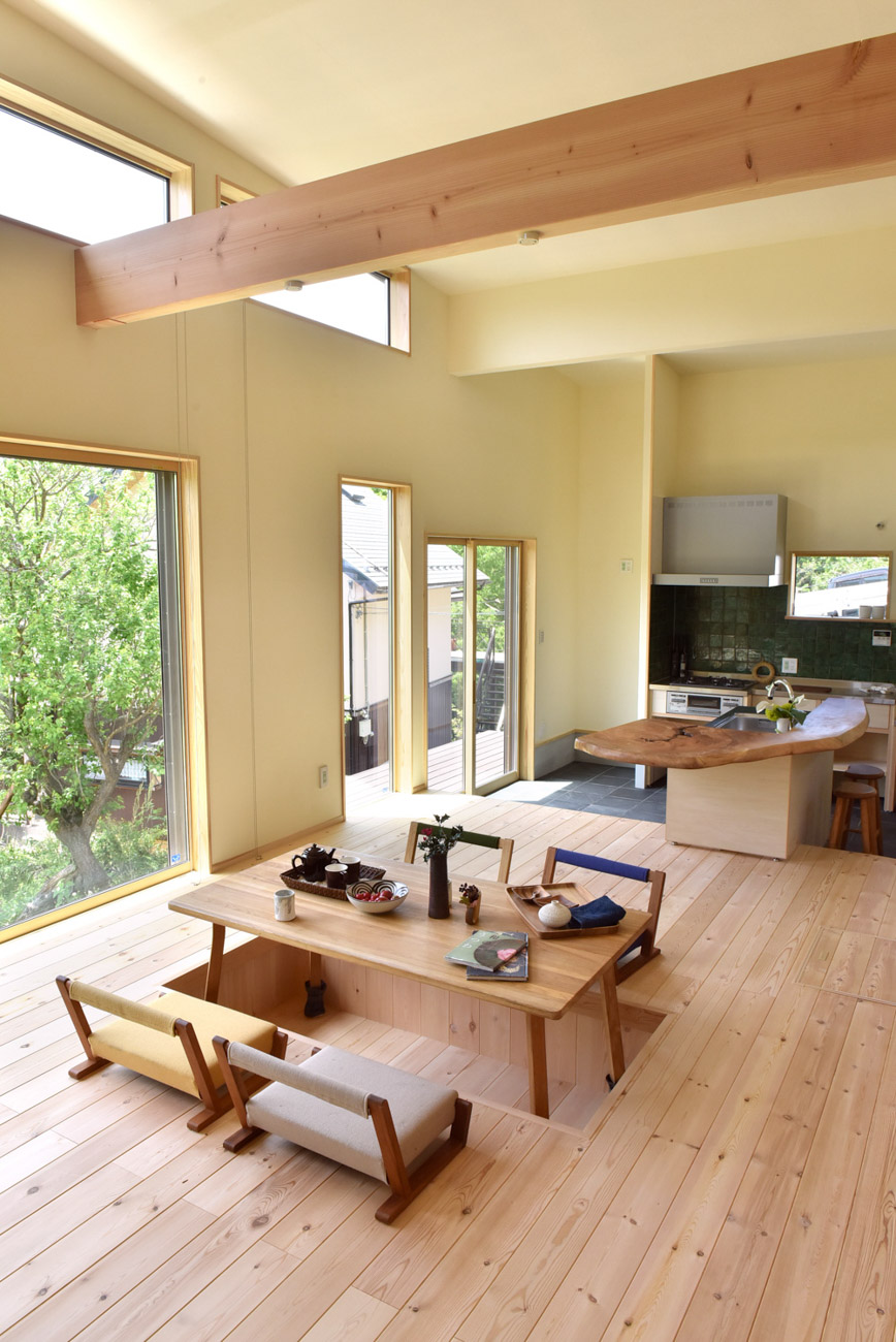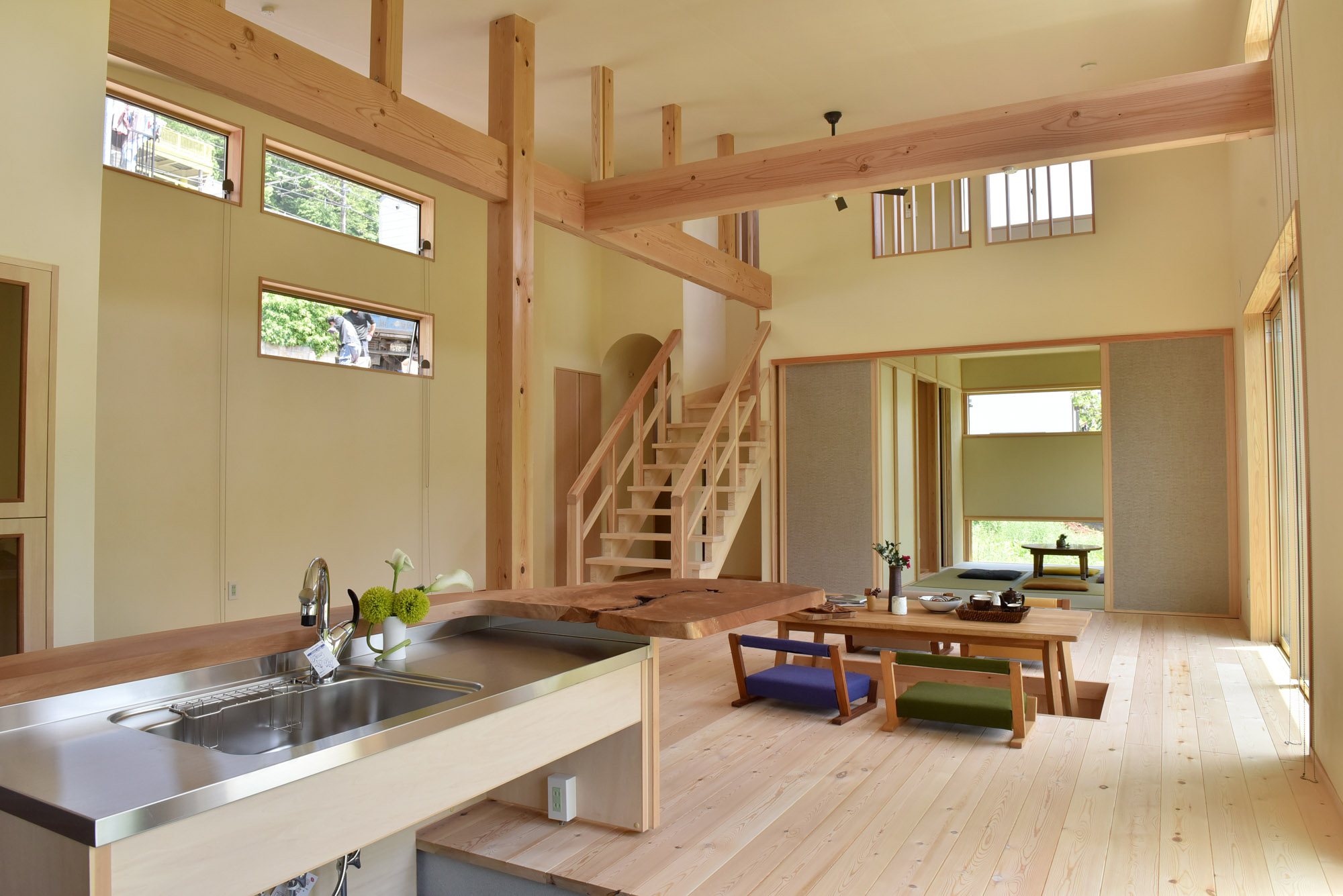 土間・小上がり・吹き抜けなどの空間の高低差を活かし、LDKに豊かな立体感をもたせた住まい。キッチンに建主様自ら選ばれたミズメザクラの一枚板を使用し、その存在感に合わせて空間全体を設計。黒いタイルと無垢床が美しく対比し、自然素材の魅力が際立ちます。