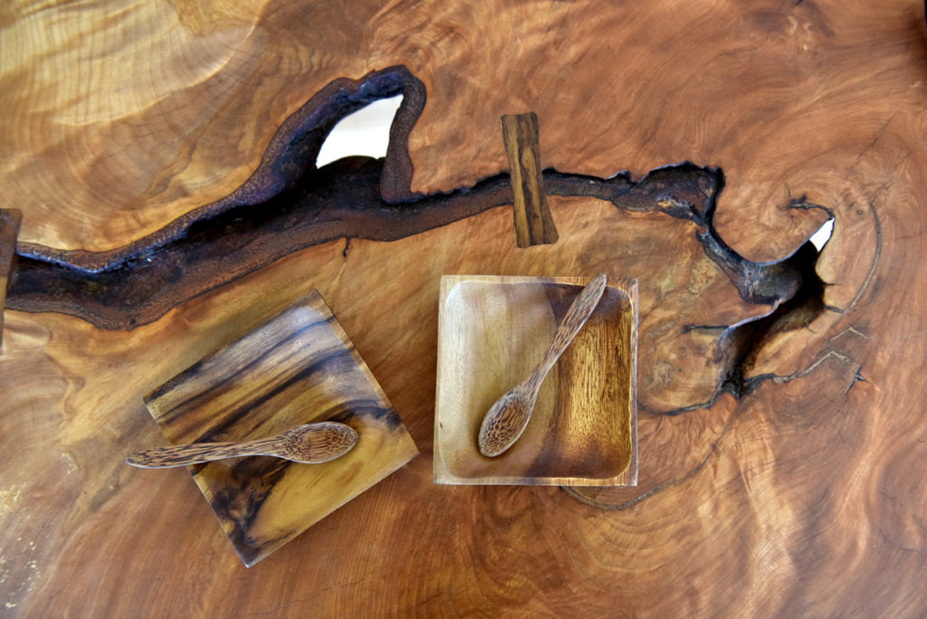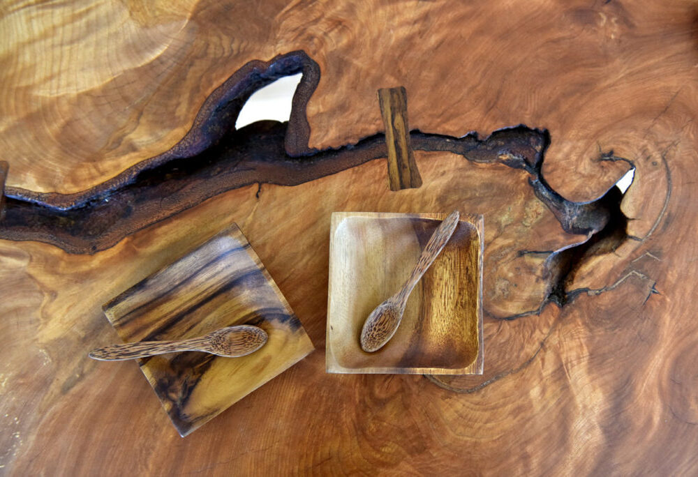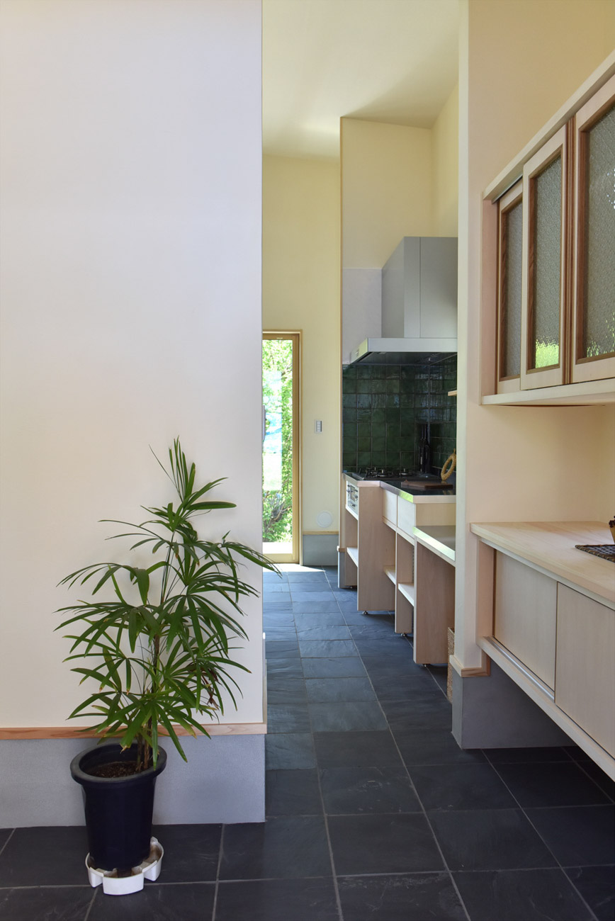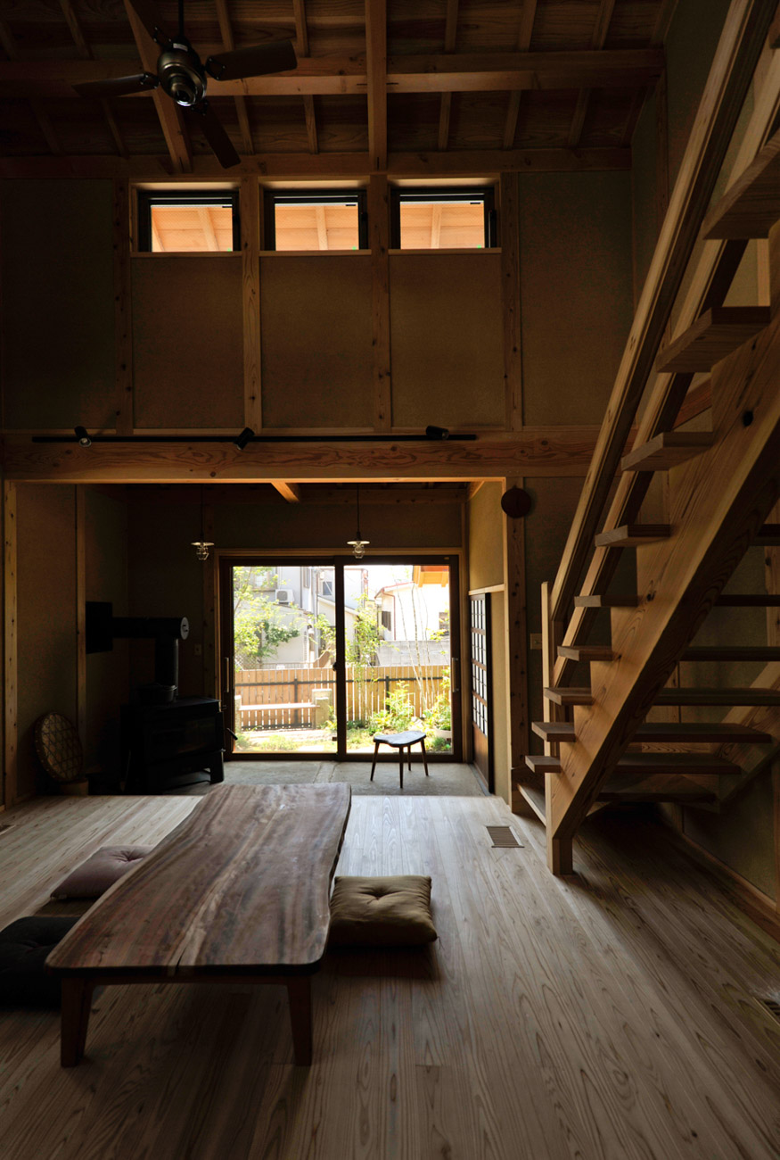 土間・小上がり・吹き抜けなどの空間の高低差を活かし、LDKに豊かな立体感をもたせた住まい。キッチンに建主様自ら選ばれたミズメザクラの一枚板を使用し、その存在感に合わせて空間全体を設計。黒いタイルと無垢床が美しく対比し、自然素材の魅力が際立ちます。