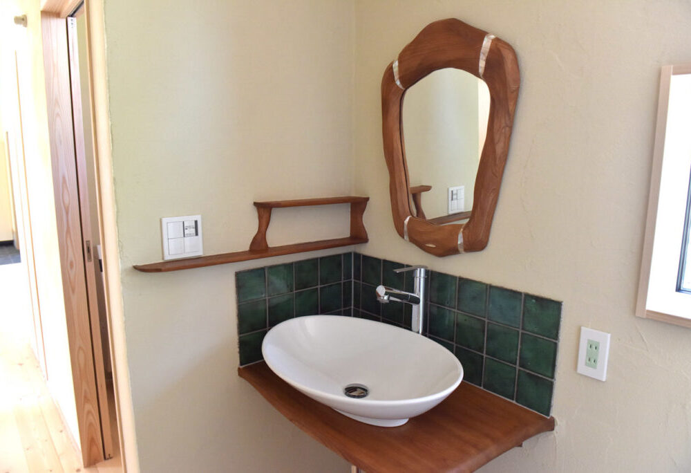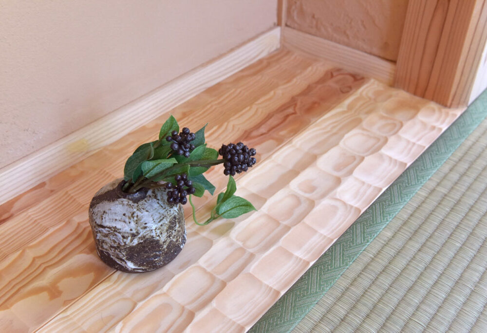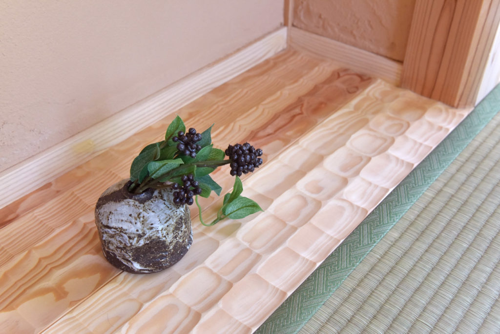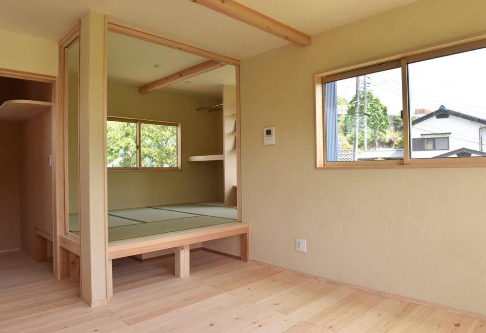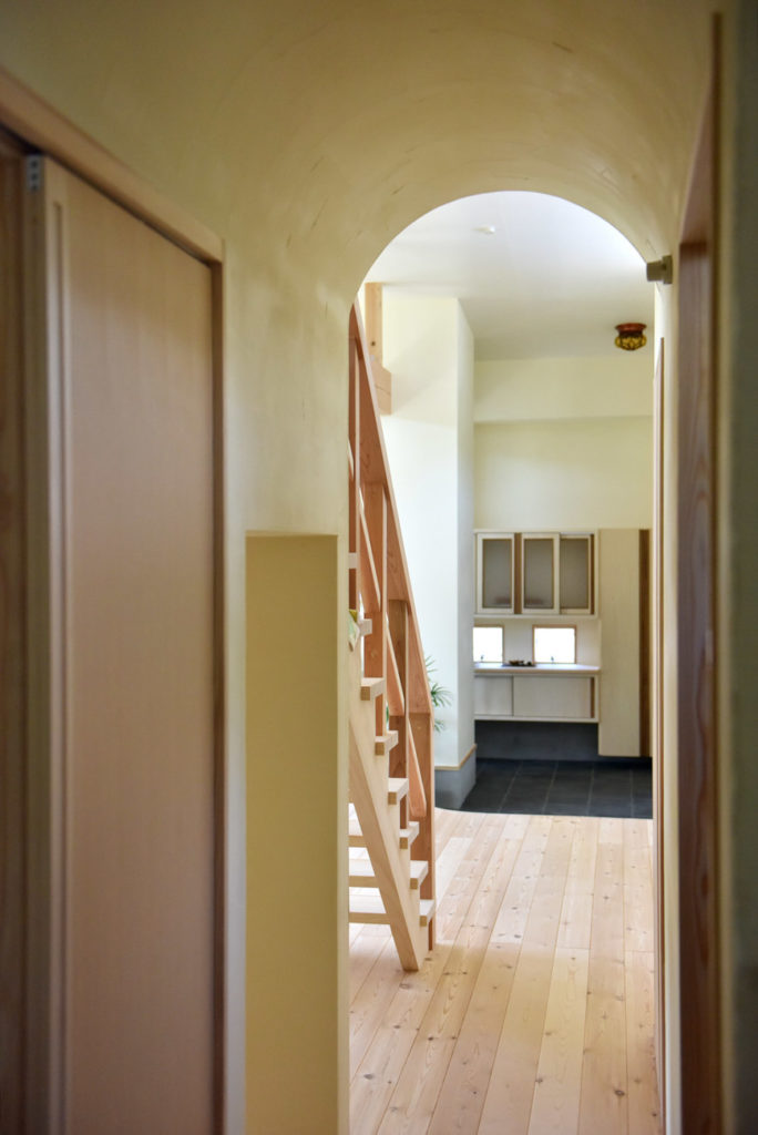 リビングの大きな窓からは、掘りごたつ越しに季節の移ろいを感じるお庭が広がり、穏やかな時間が流れます。続きの和室にはツキノミ加工が施された床の間、廊下にはアーチ天井と珪藻土の壁──随所に光る職人技が、暮らしに彩りを添えています。
