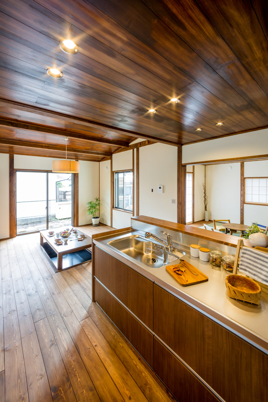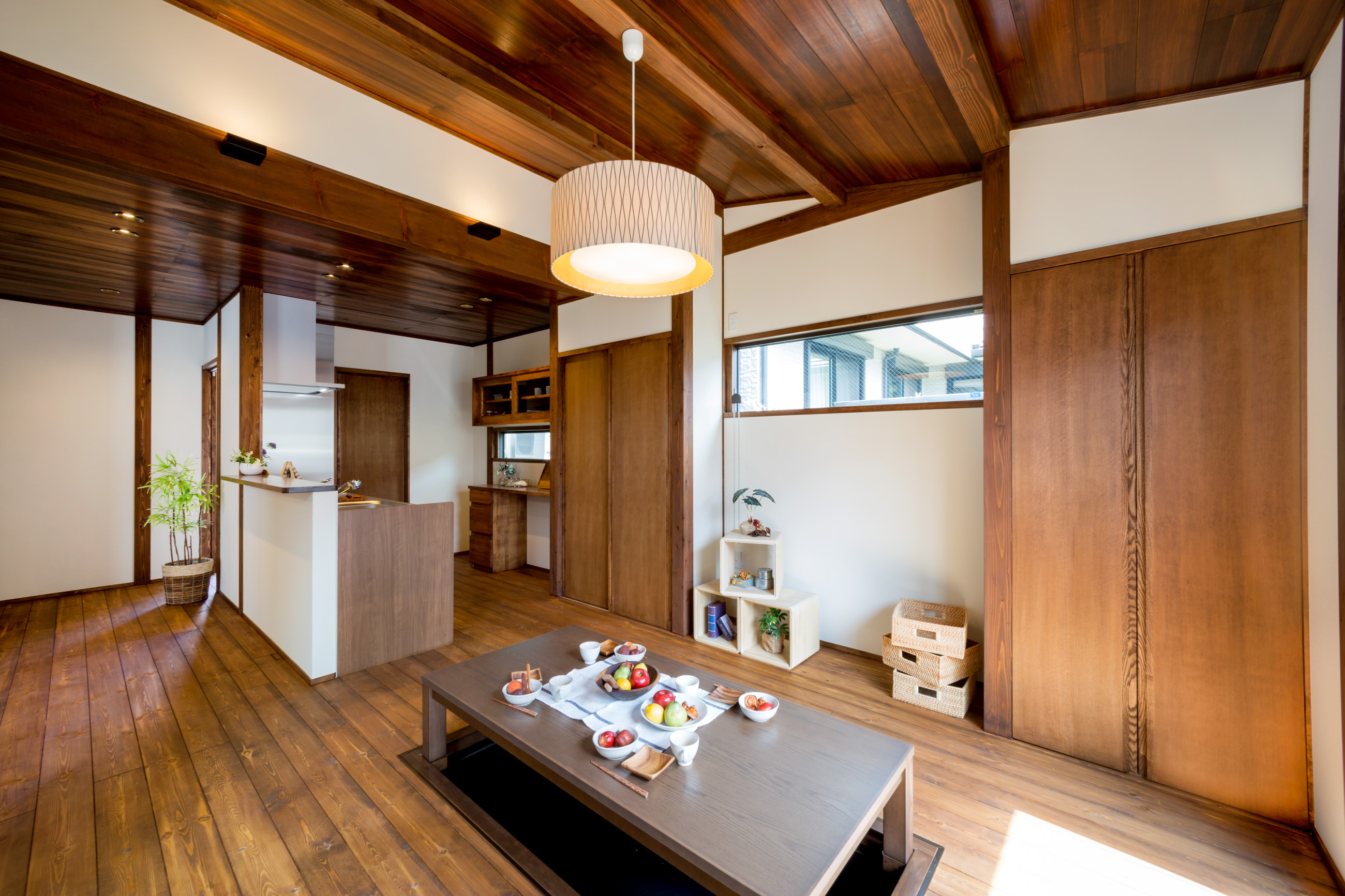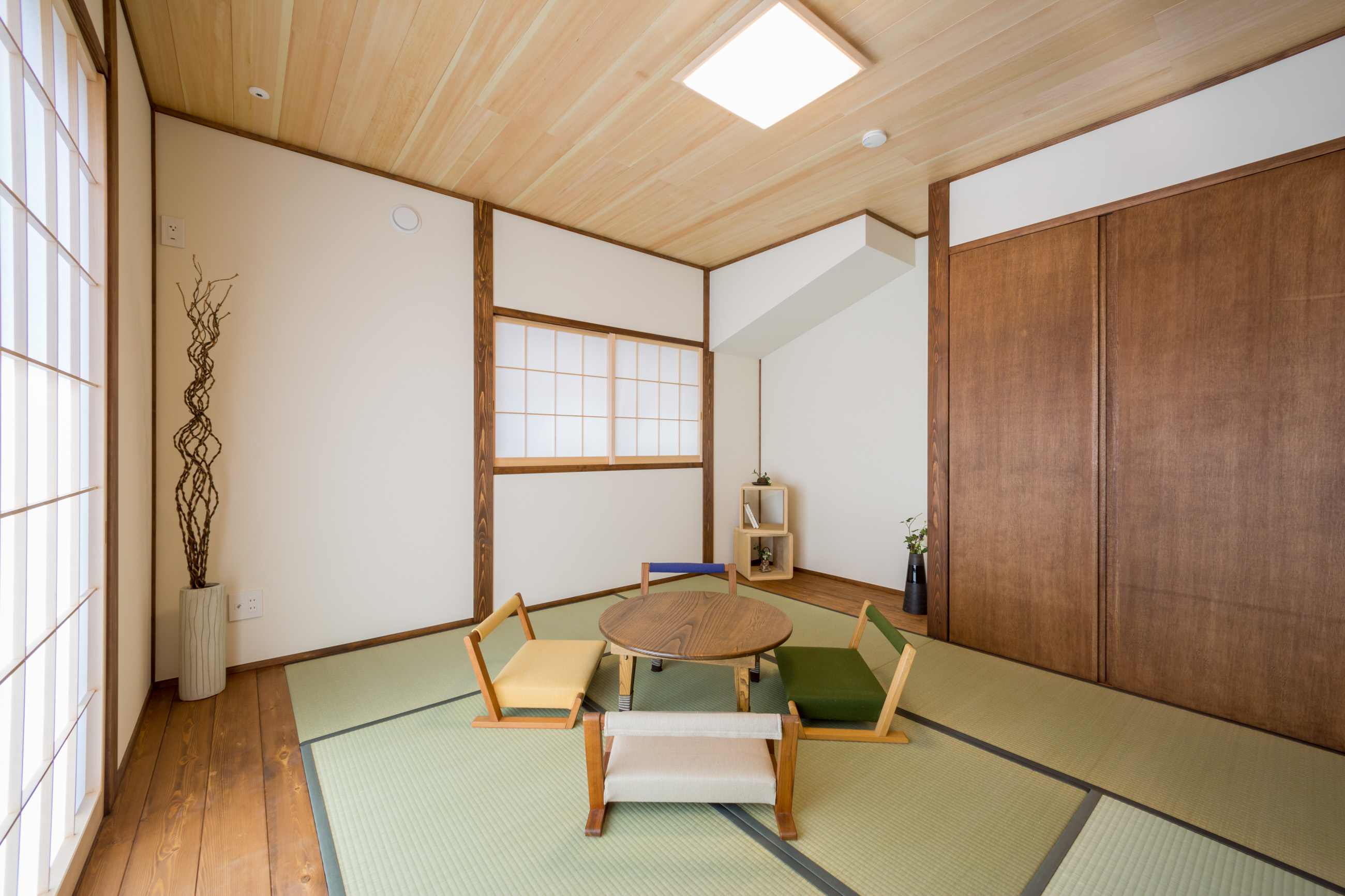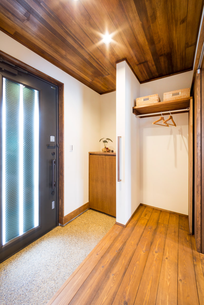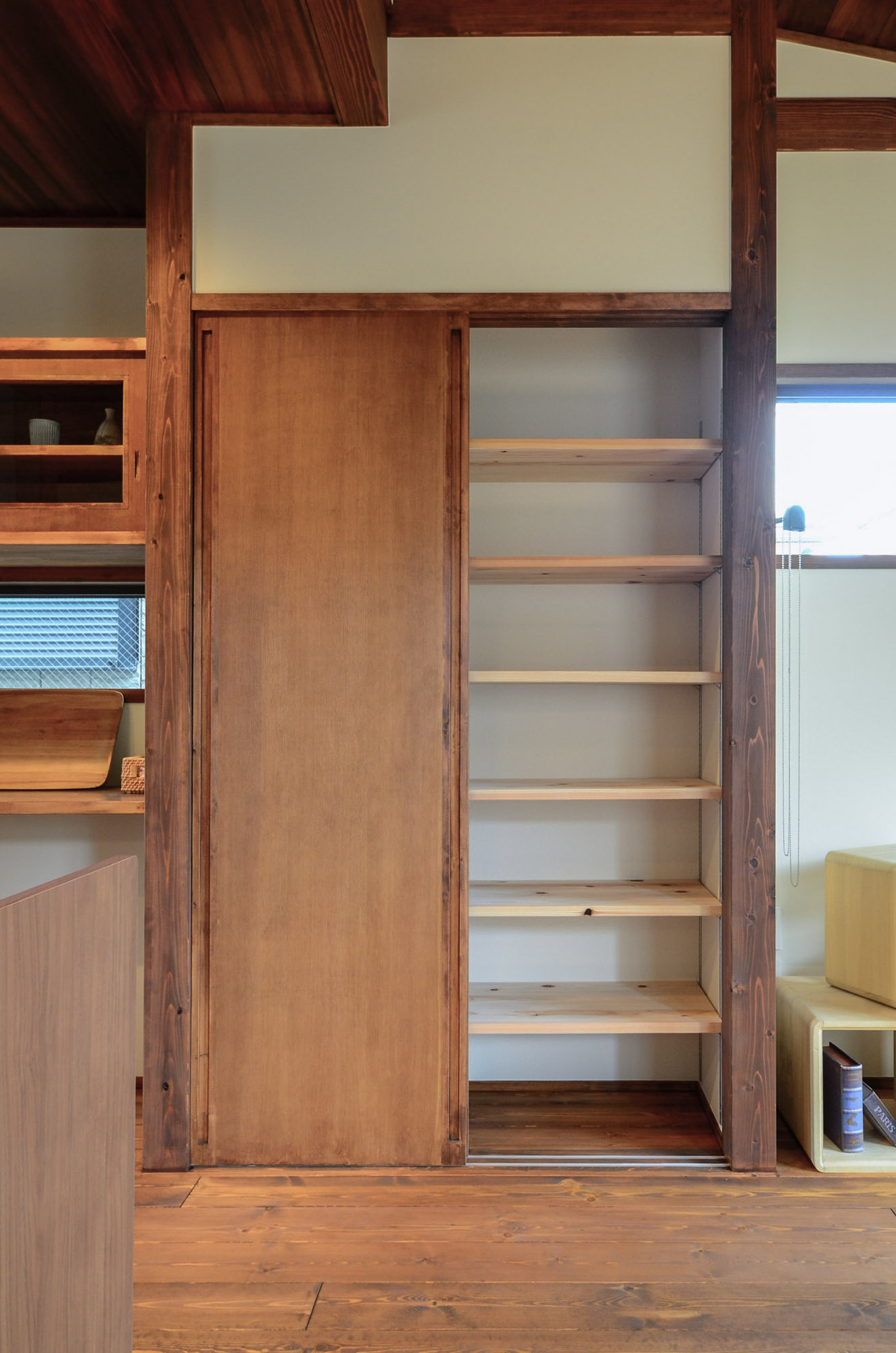 収納扉や引き戸、玄関の棚やキッチンの棚など各所に散りばめられた造作の家具や建具。1Fは床だけでなく天井にも無垢のパネリングを贅沢に採用。ココア色に染められ、室内は品のある空間に。玄関に採用された大谷石や三和土の土間など、細部にも和の趣が感じられます。また、世帯による生活時間の差を考え、1Fにご両親の和室を、2Fに建主様の個室を設けました。将来的な介護のことも考えたプランニングとなっています。