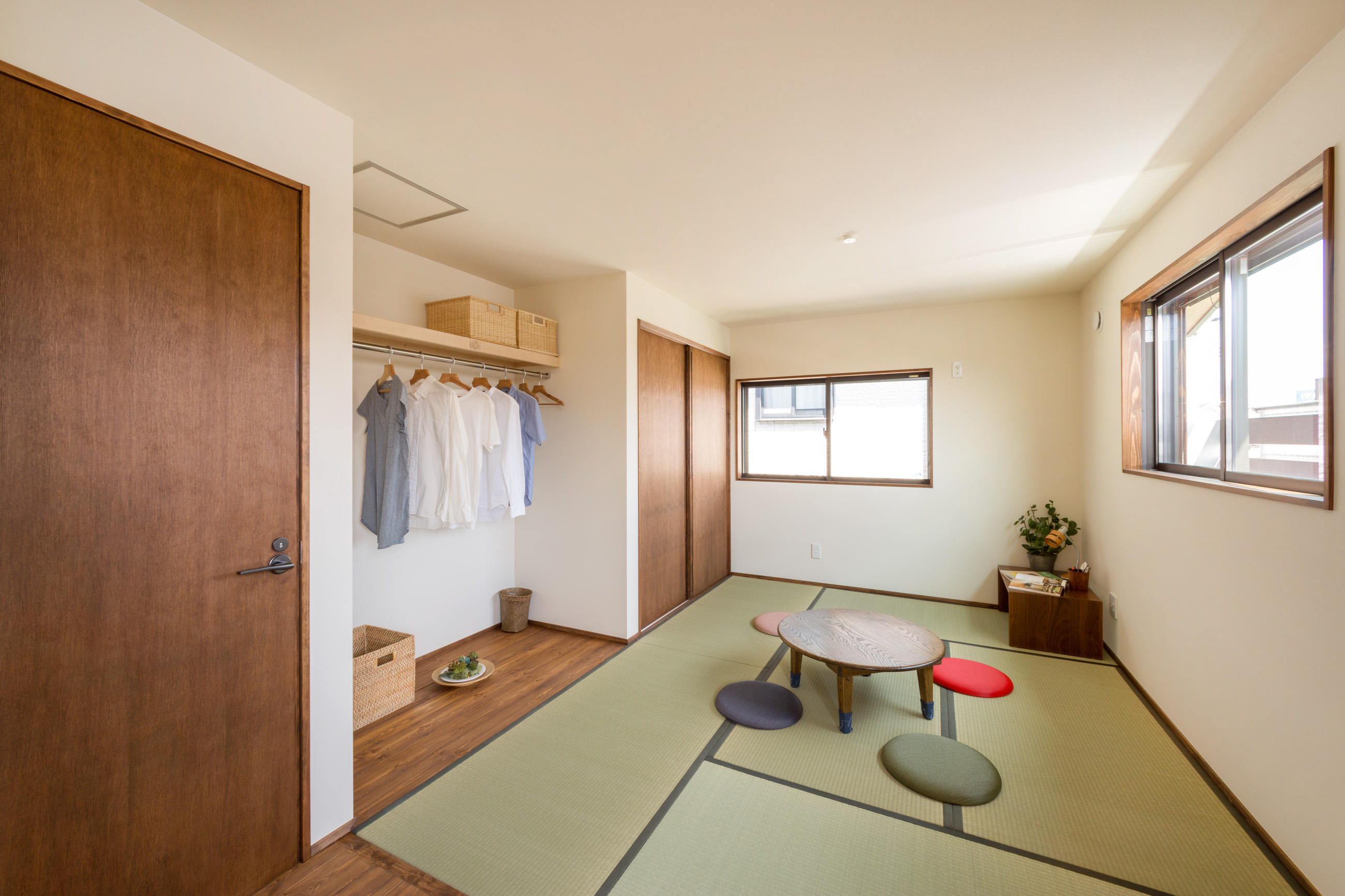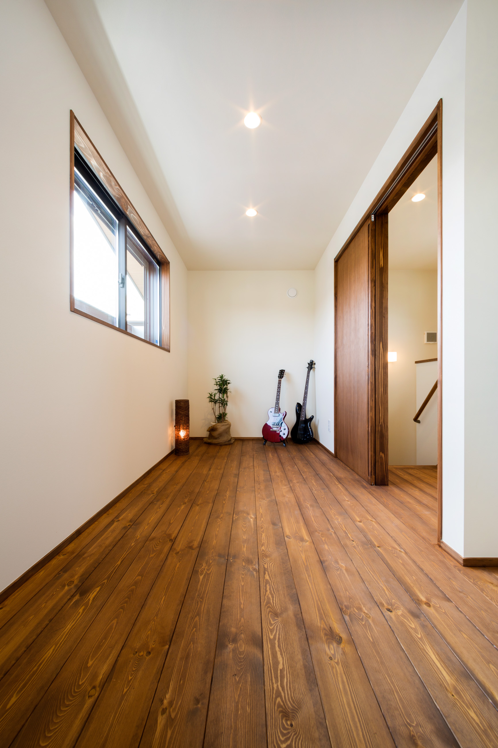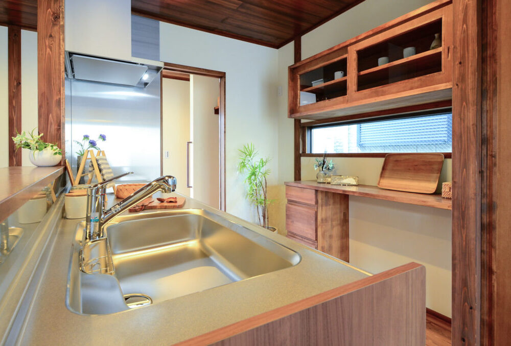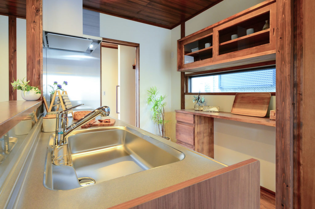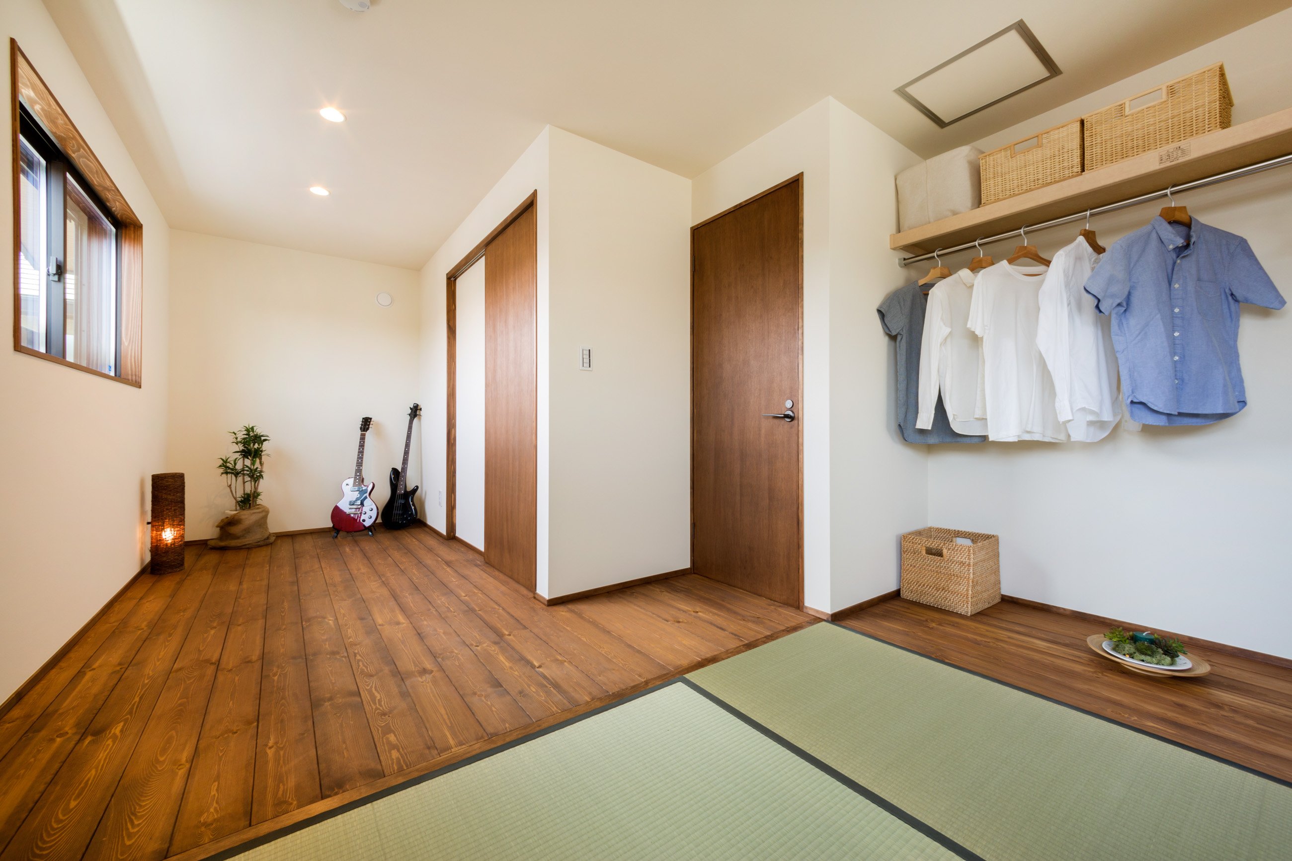 収納扉や引き戸、玄関の棚やキッチンの棚など各所に散りばめられた造作の家具や建具。1Fは床だけでなく天井にも無垢のパネリングを贅沢に採用。ココア色に染められ、室内は品のある空間に。玄関に採用された大谷石や三和土の土間など、細部にも和の趣が感じられます。また、世帯による生活時間の差を考え、1Fにご両親の和室を、2Fに建主様の個室を設けました。将来的な介護のことも考えたプランニングとなっています。
