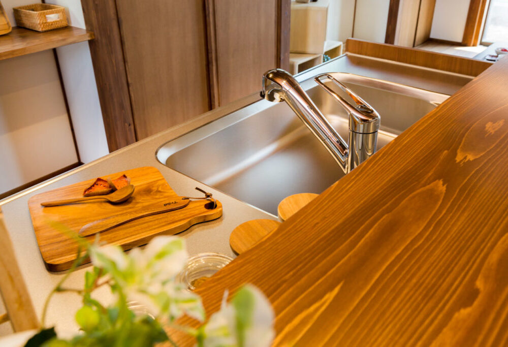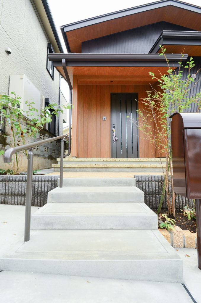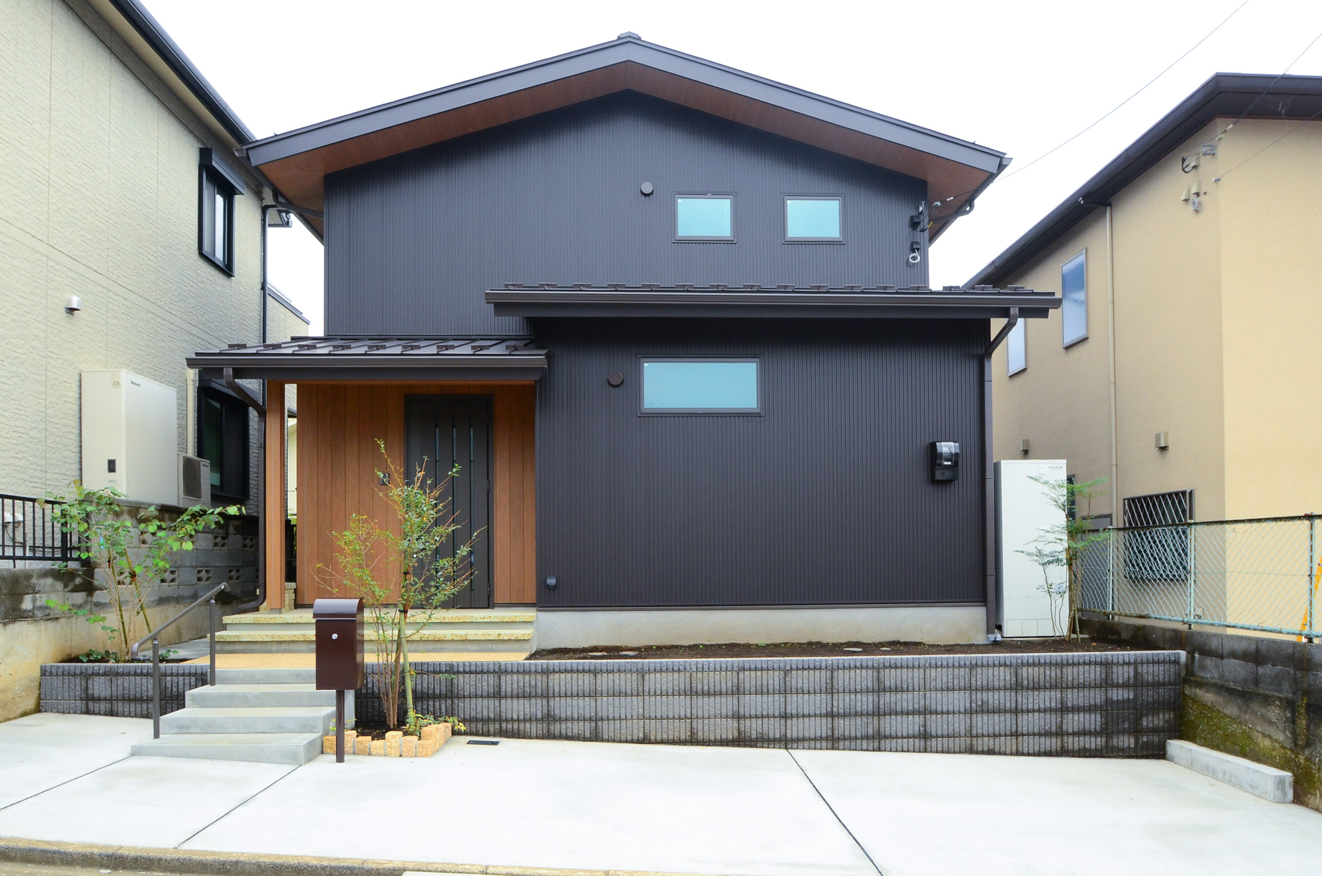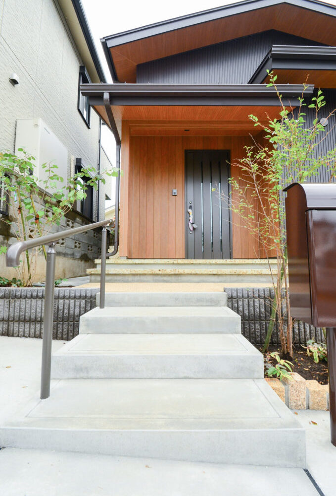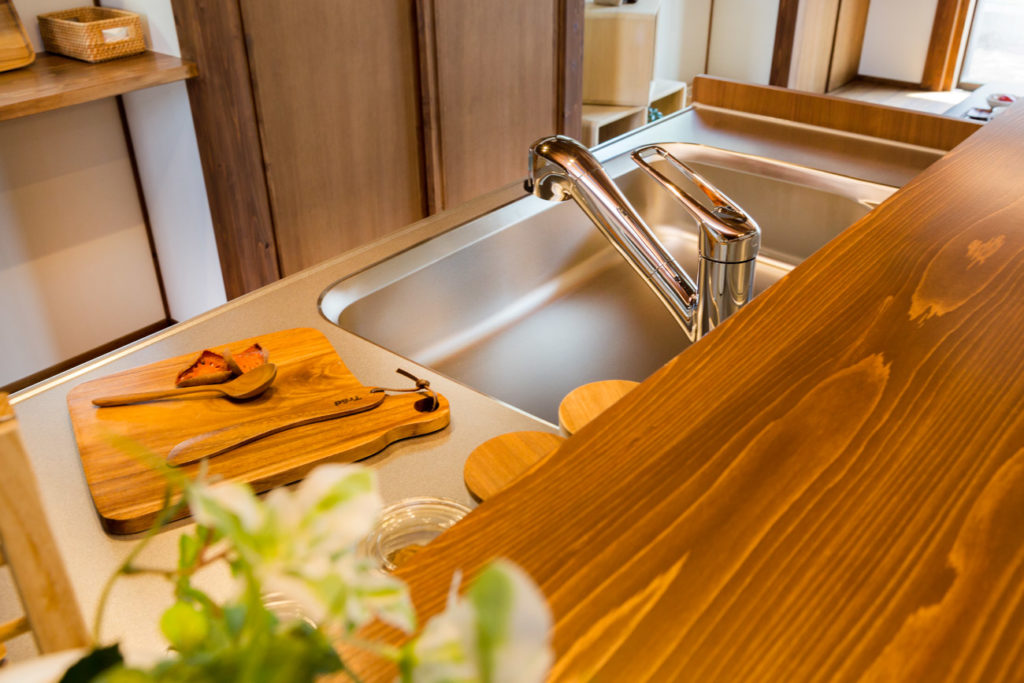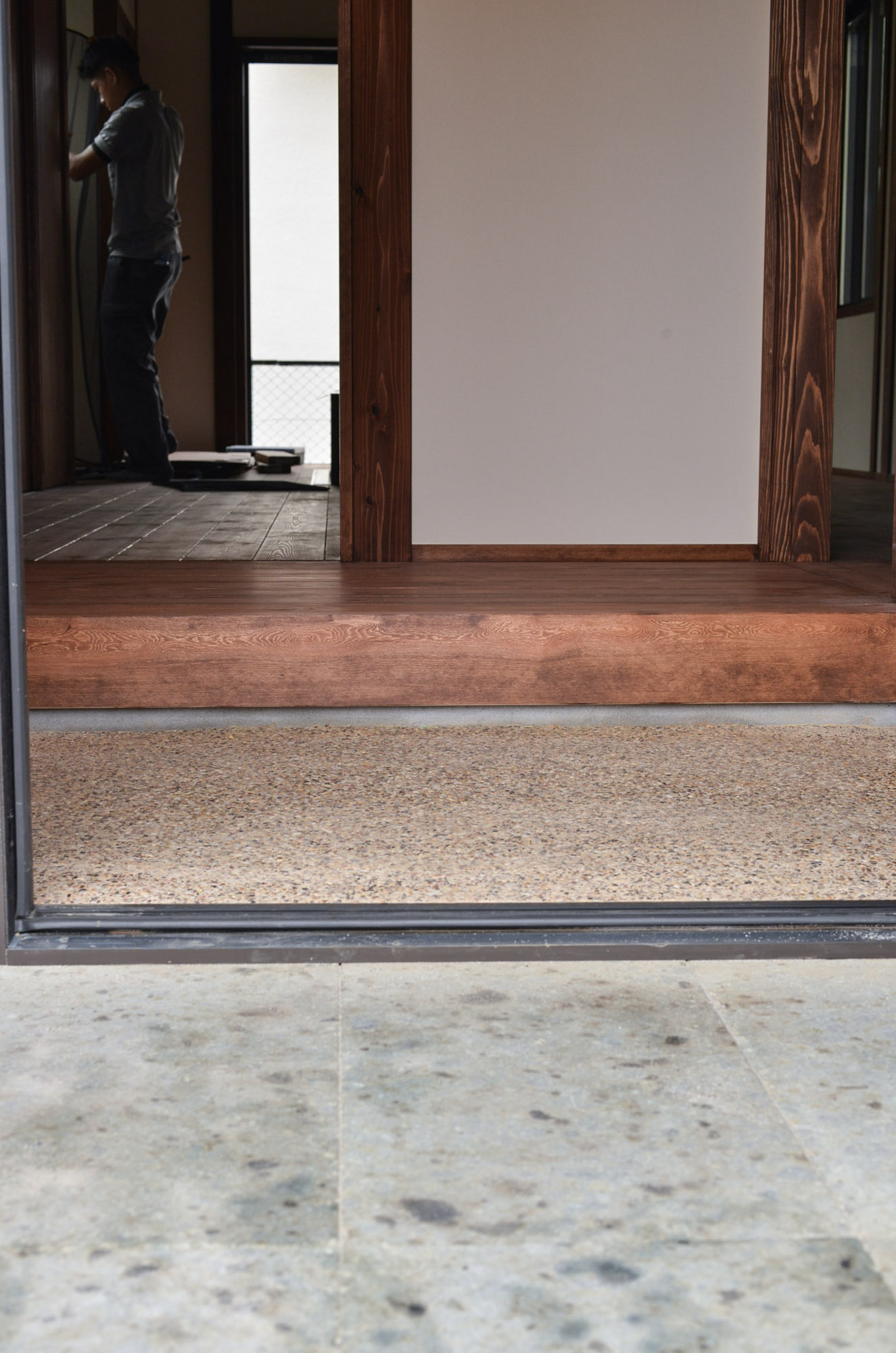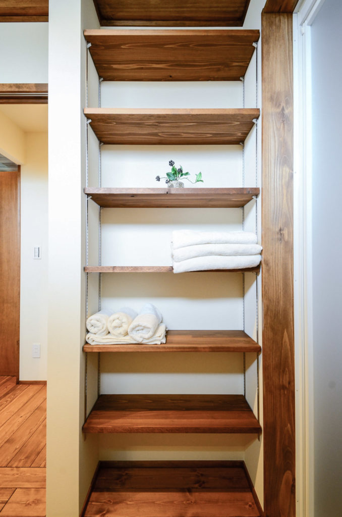 収納扉や引き戸、玄関の棚やキッチンの棚など各所に散りばめられた造作の家具や建具。1Fは床だけでなく天井にも無垢のパネリングを贅沢に採用。ココア色に染められ、室内は品のある空間に。玄関に採用された大谷石や三和土の土間など、細部にも和の趣が感じられます。また、世帯による生活時間の差を考え、1Fにご両親の和室を、2Fに建主様の個室を設けました。将来的な介護のことも考えたプランニングとなっています。