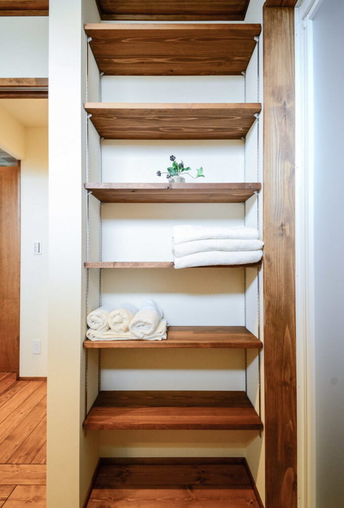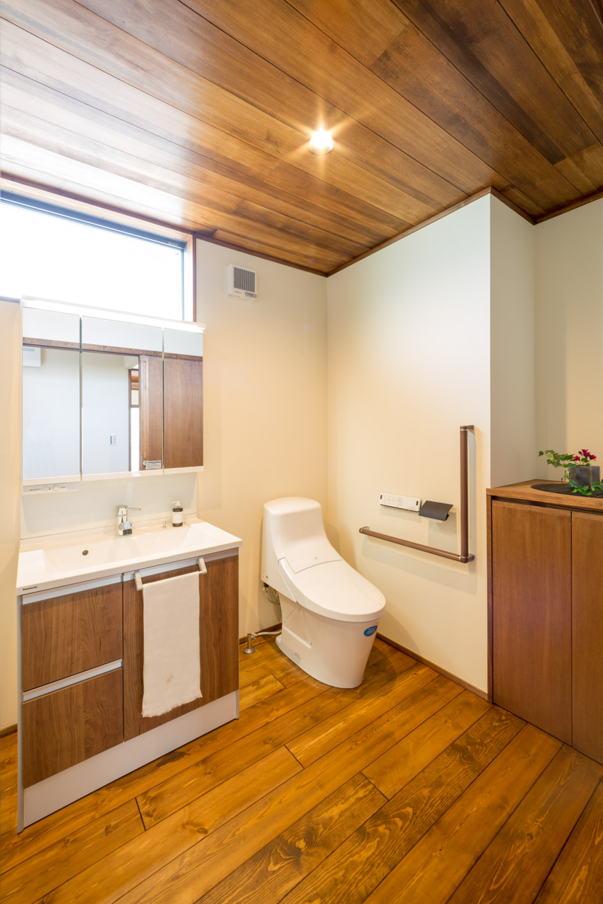 快適な空気を家中に伝えるため、あえてリビングと階段付近には扉をつけず、浴室やトイレに行くときも快適に過ごせるように。また、将来の介護なども見据えて、洗面室とトイレに仕切りを設けない設計となっています。