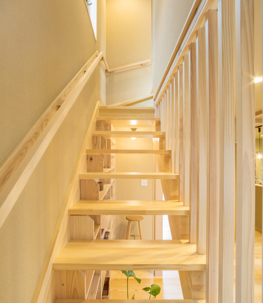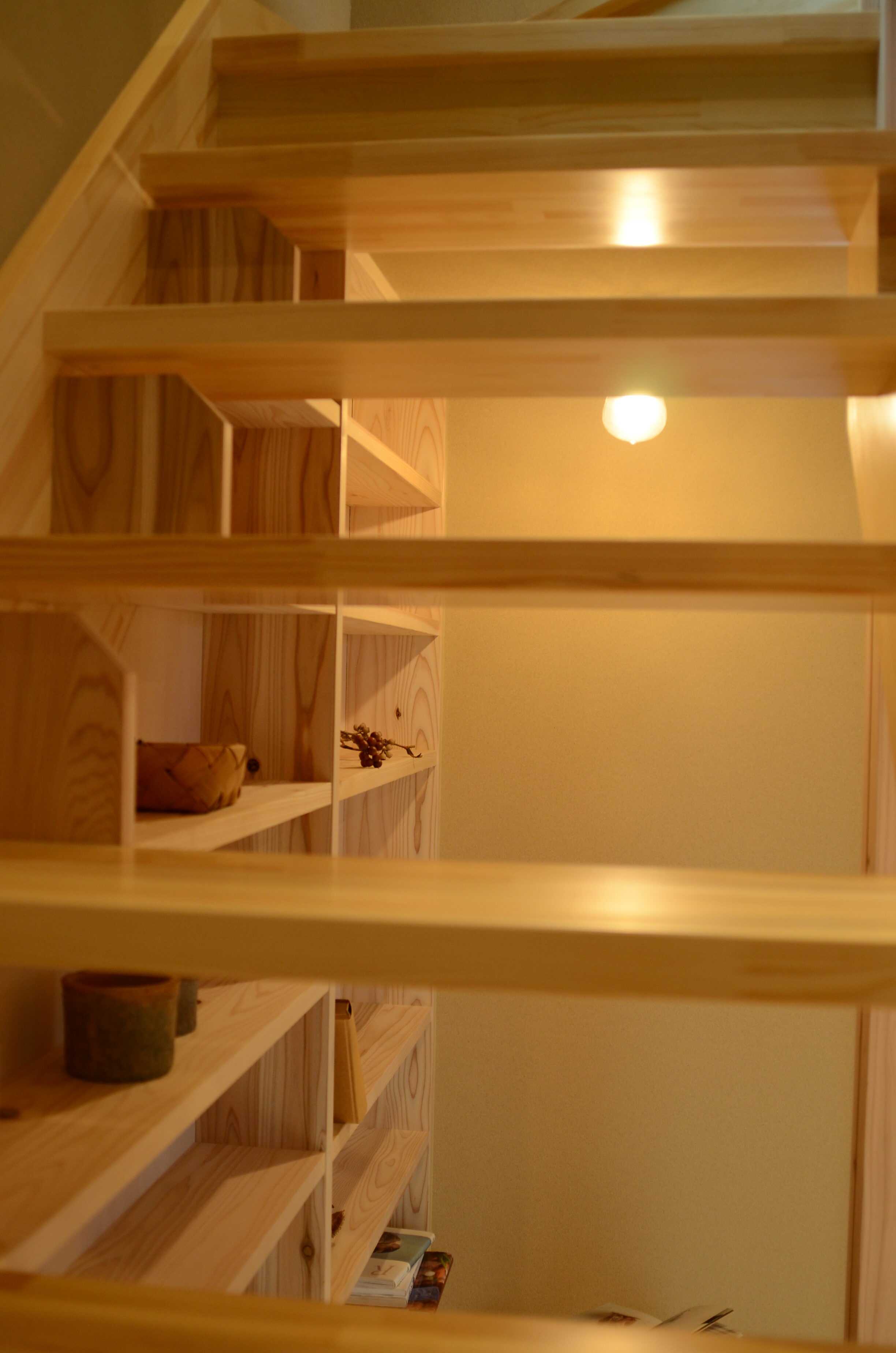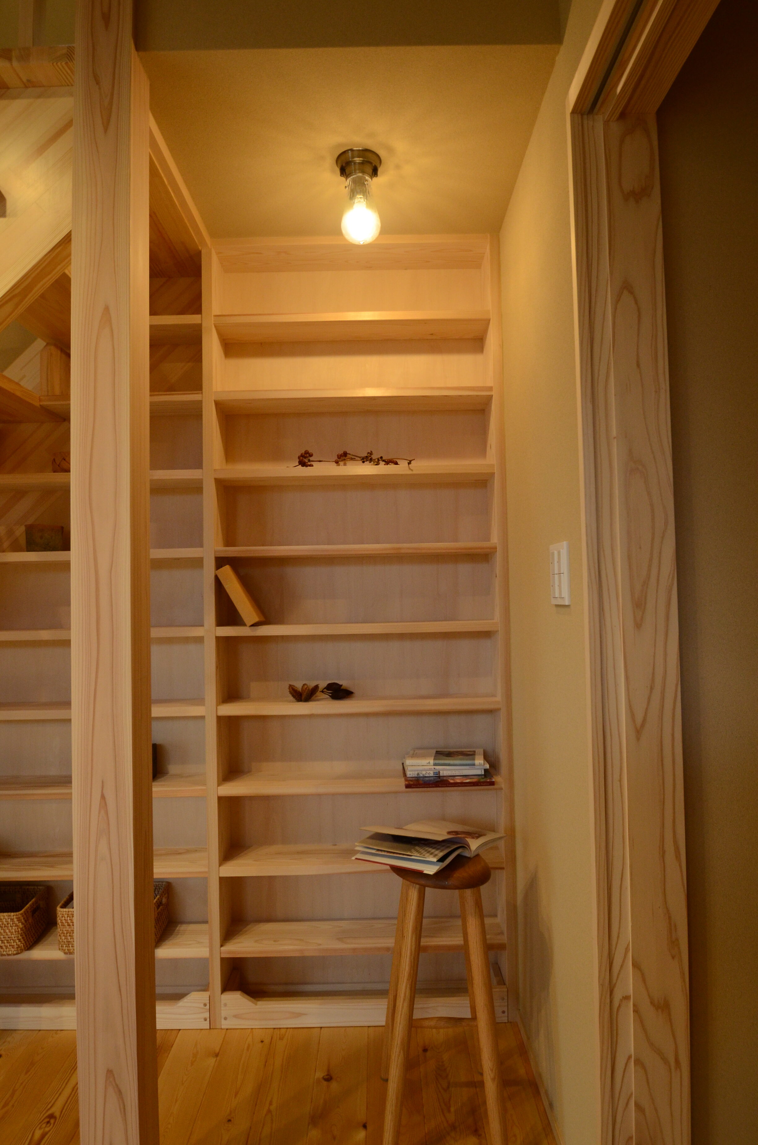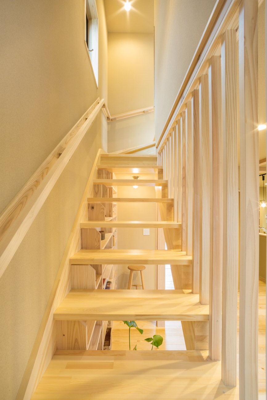 階段下の大きな本棚。そこはお気に入りの小説を読み耽る、いつもの場所。 キッチンを中心に家事動線を工夫した、シンプルで暮らしやすいお住まい。