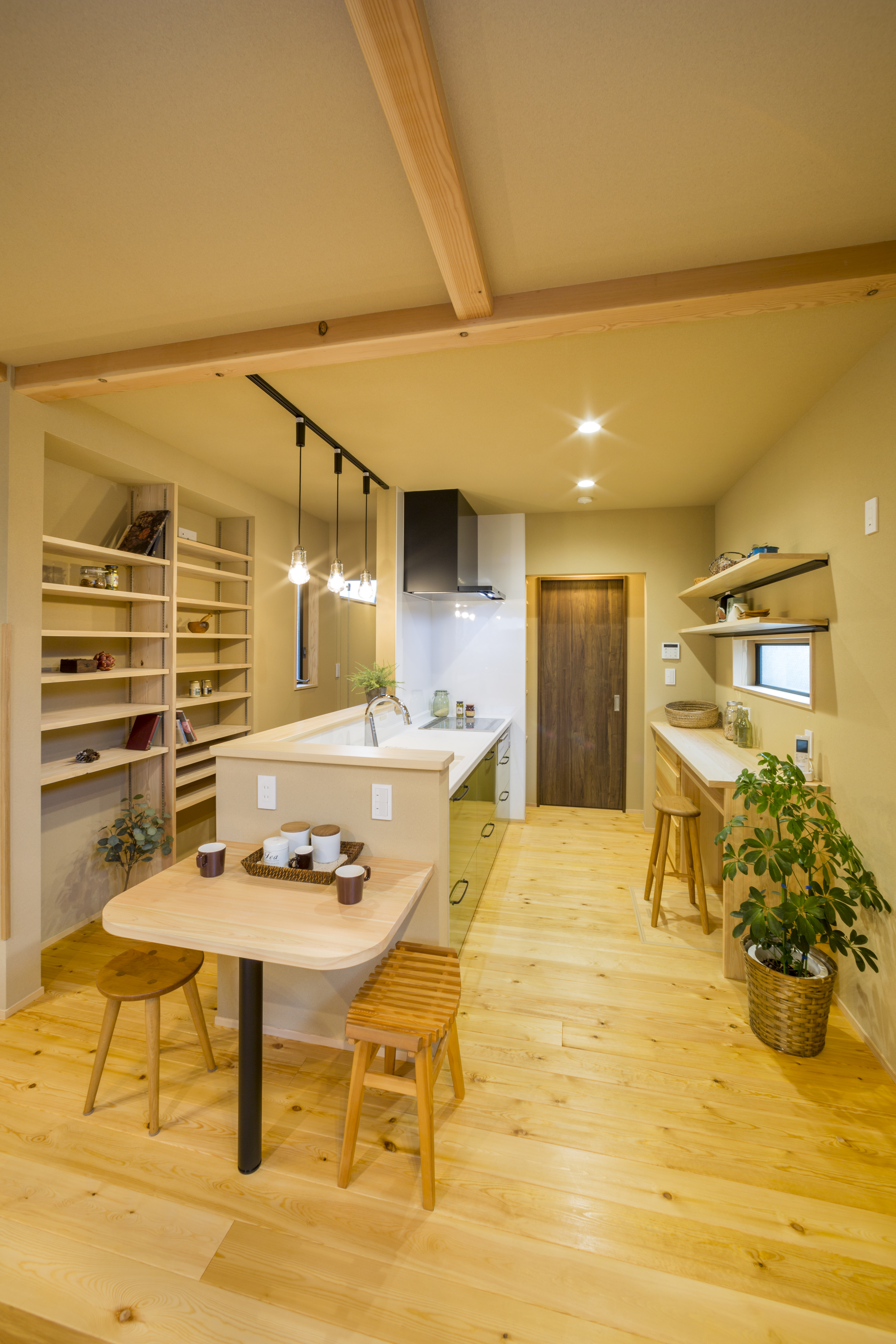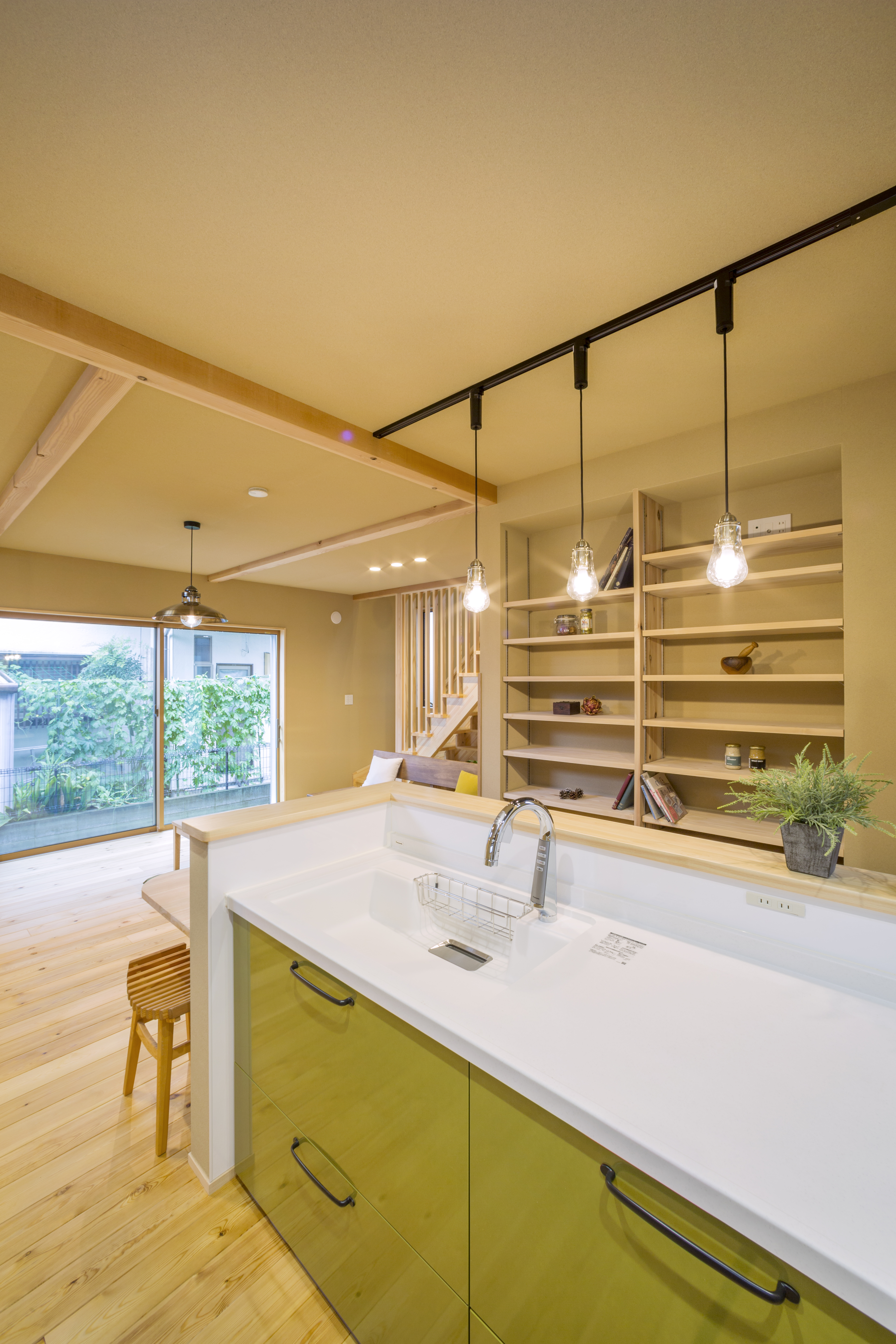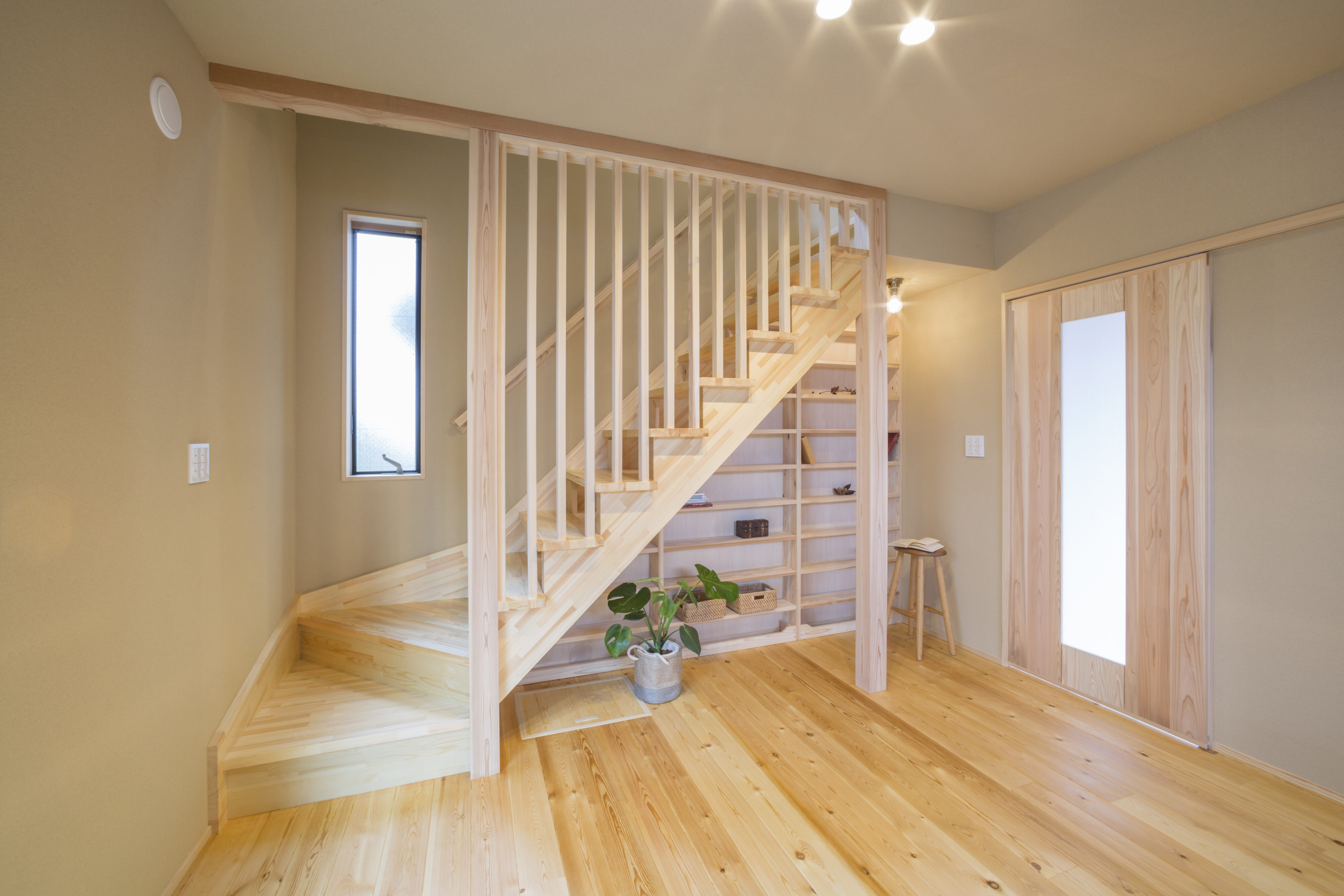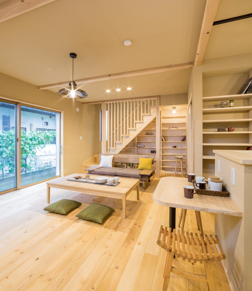 階段下の大きな本棚。そこはお気に入りの小説を読み耽る、いつもの場所。 キッチンを中心に家事動線を工夫した、シンプルで暮らしやすいお住まい。