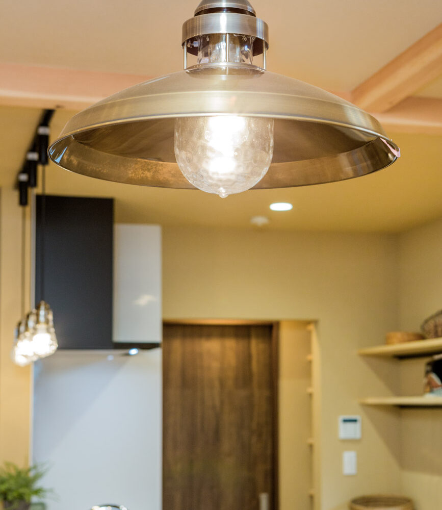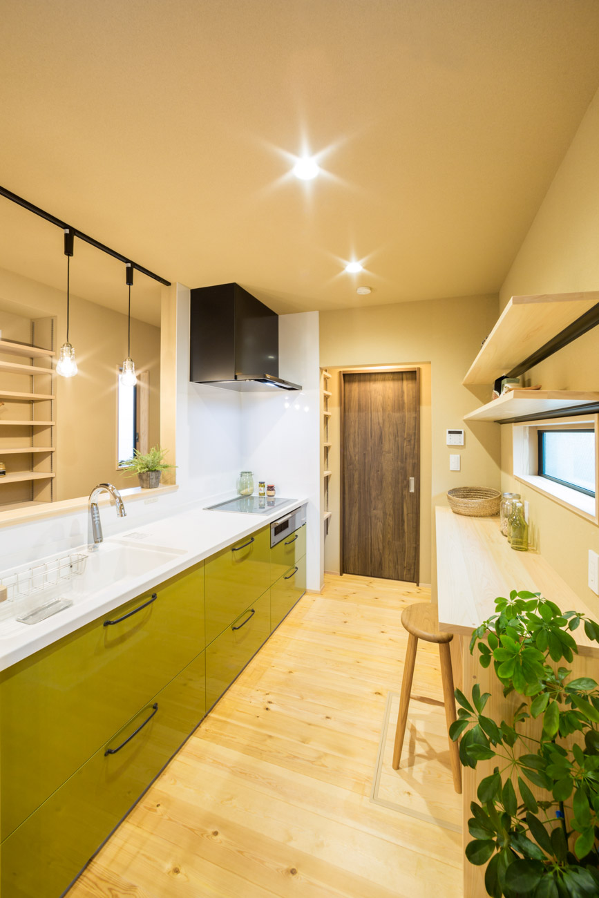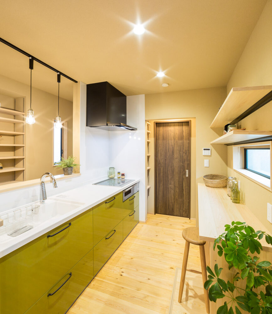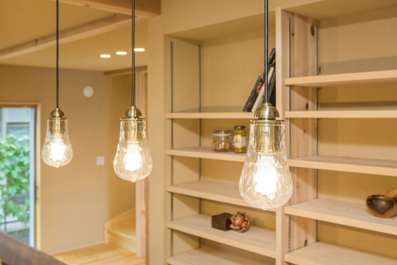 階段下の大きな本棚。そこはお気に入りの小説を読み耽る、いつもの場所。 キッチンを中心に家事動線を工夫した、シンプルで暮らしやすいお住まい。