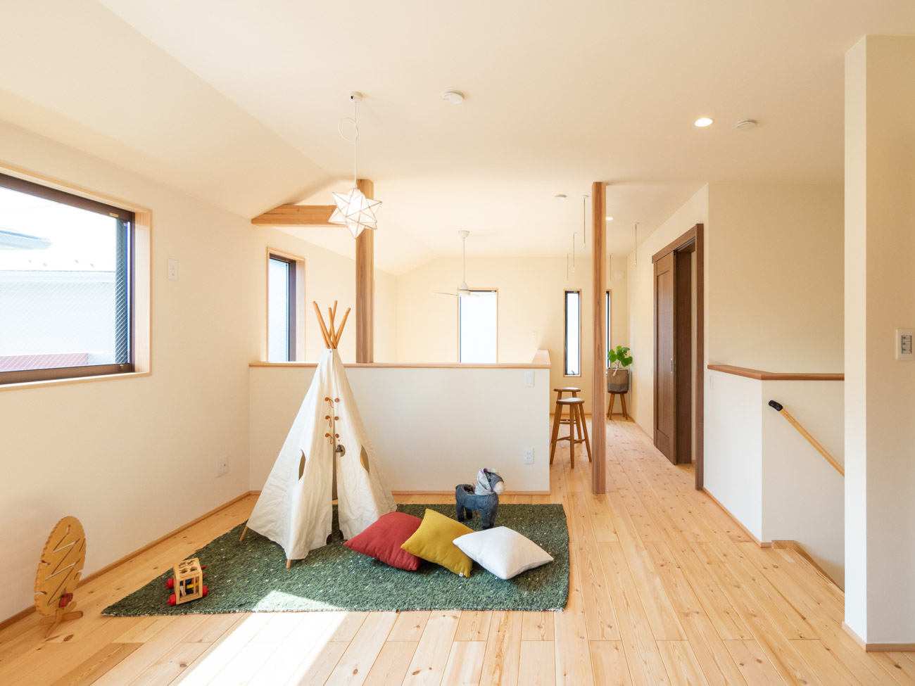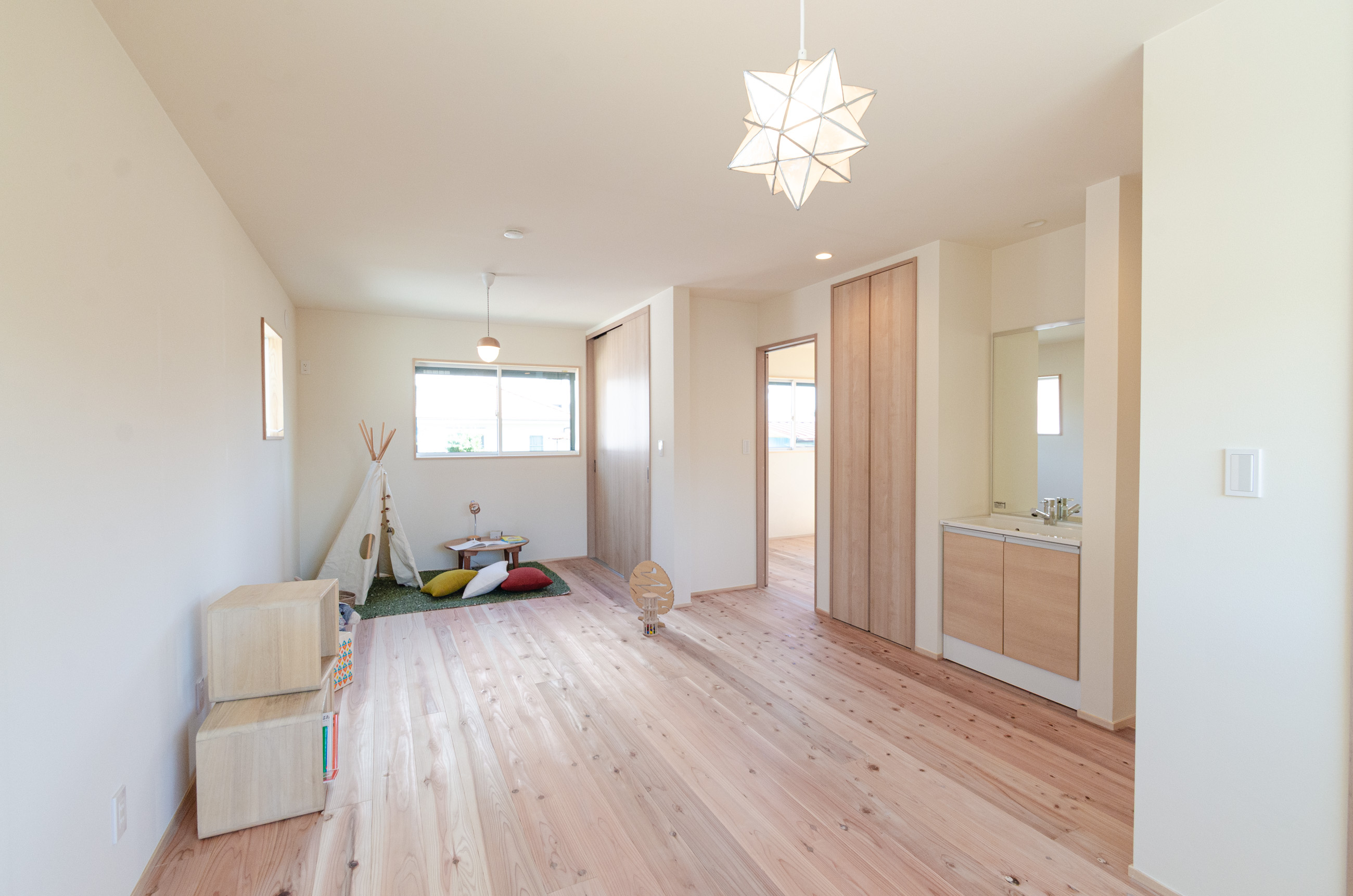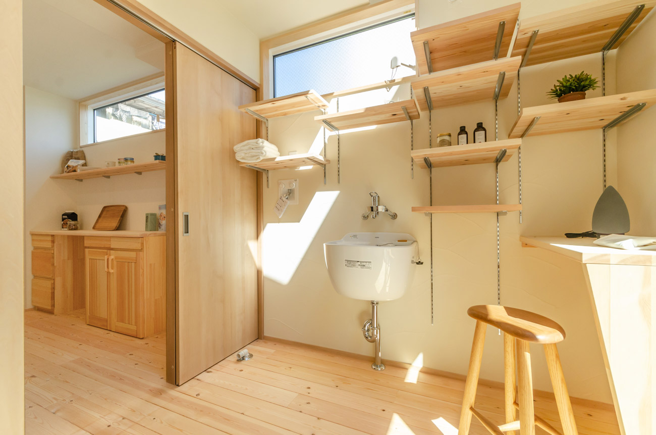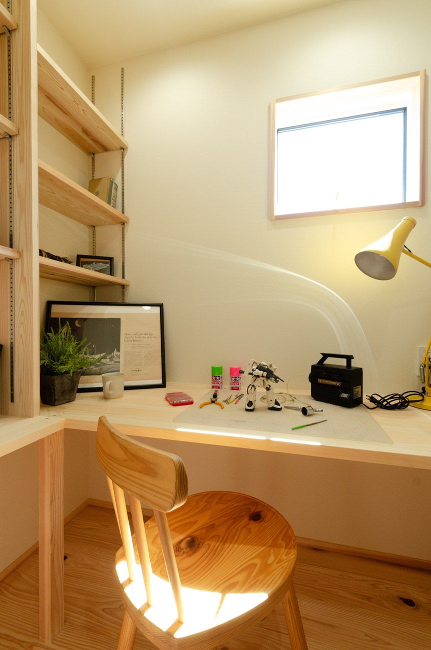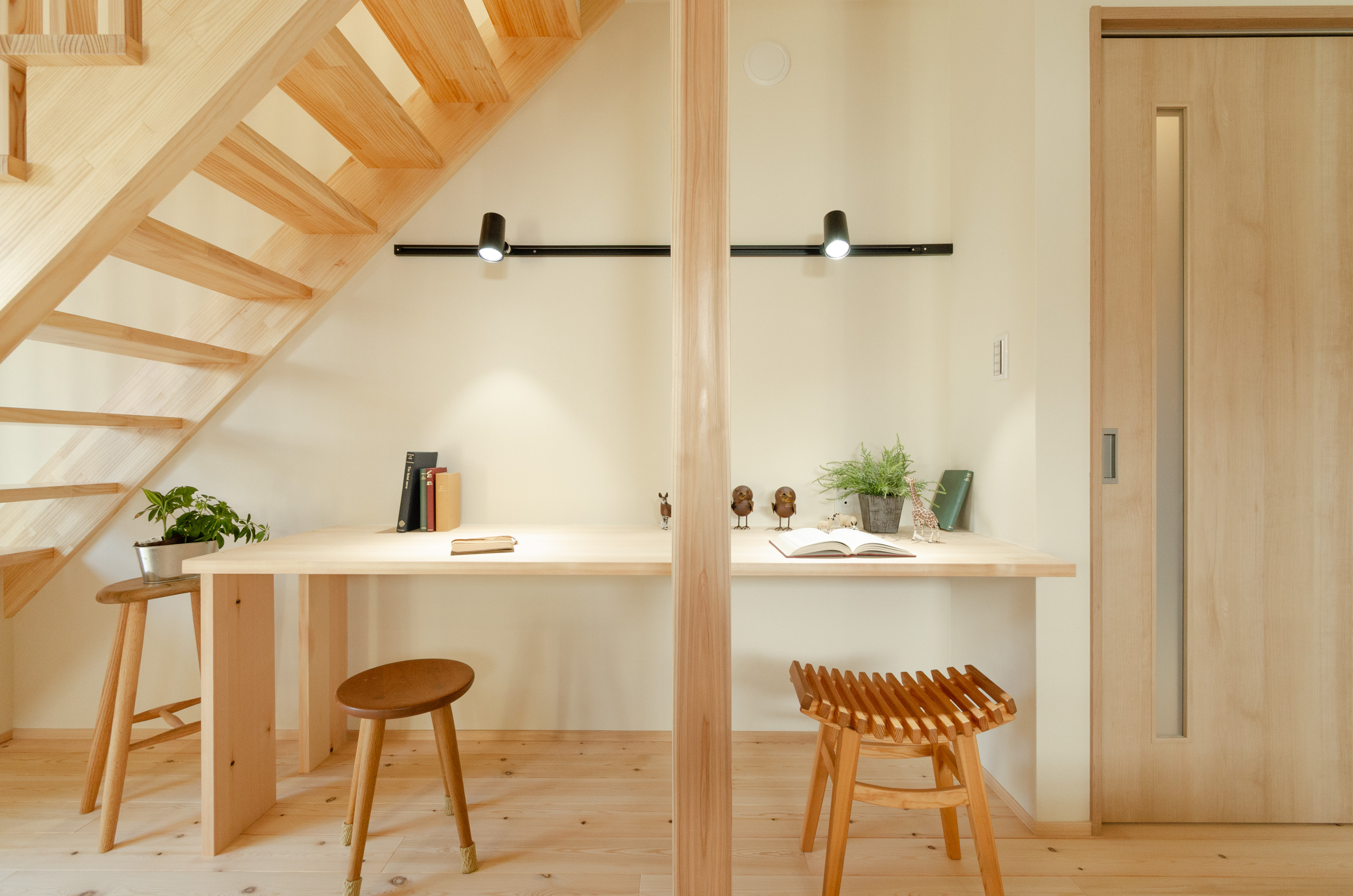 建主様親子と、お母様で暮らす予定のプチ二世帯。家族で集まるリビングは広くゆったりとつくられ、居心地の良い空間に。お母様のお部屋もリビング脇に作られ、ご様子を伺えるようになっています。 一方、二階の階段横の扉を開けると、本棚の奥にこじんまりとした書斎が現れます。家の一角に隠れるようにそっと作られたその書斎は、一人の時間を存分に楽しめる秘密の部屋。広い作業台があるため、仕事をしたり、趣味を楽しんだり読書に没頭したりと、自分一人の時間を思いきり満喫できます。 家族の時間も、一人の時間も大切にできるお住まいがとなりました。 設備と動線を備えた 暮らしやすい間取り サンルームと家事室を兼ねたランドリースペース、2階には大容量の三列ウォークインクローゼットと使いやすい設備が充実。脱衣所→キッチン→ランドリースペース→リビングをぐるっと回れる動きやすい家事動線は、モノが多くなる部分はリビングから見えないよう工夫されています。住む人の暮らしに合わせた使いやすい家事動線や設備をご提案いたします。お身体のことも考え、高齢のお母様のお部屋はリビングのすぐ脇に。 使い分けられる 2つのワークスペース 子供も大人もあると便利なのがワークスペース。仕事や家事をこなしたり子供の学習スペースとして大活躍です。リビング脇や家事室の一角に作ってちょっとした時間に利用するのもよし。より集中できる書斎やスタディルームとして作りこむのもよし。成長に併せて使い分けることも可能です。こちらのお住まいにはリビング横のデスクと2階階段脇に奥まった書斎と、2箇所のワークスペースを設置。 成長に合わせて 可変する間取り 二階の広いファミリースペースは、子供の成長に合わせて二部屋にまじ切ることができます。お子様が小さいうちは家族の部屋として、大きくなれば個室へと可変することができます。