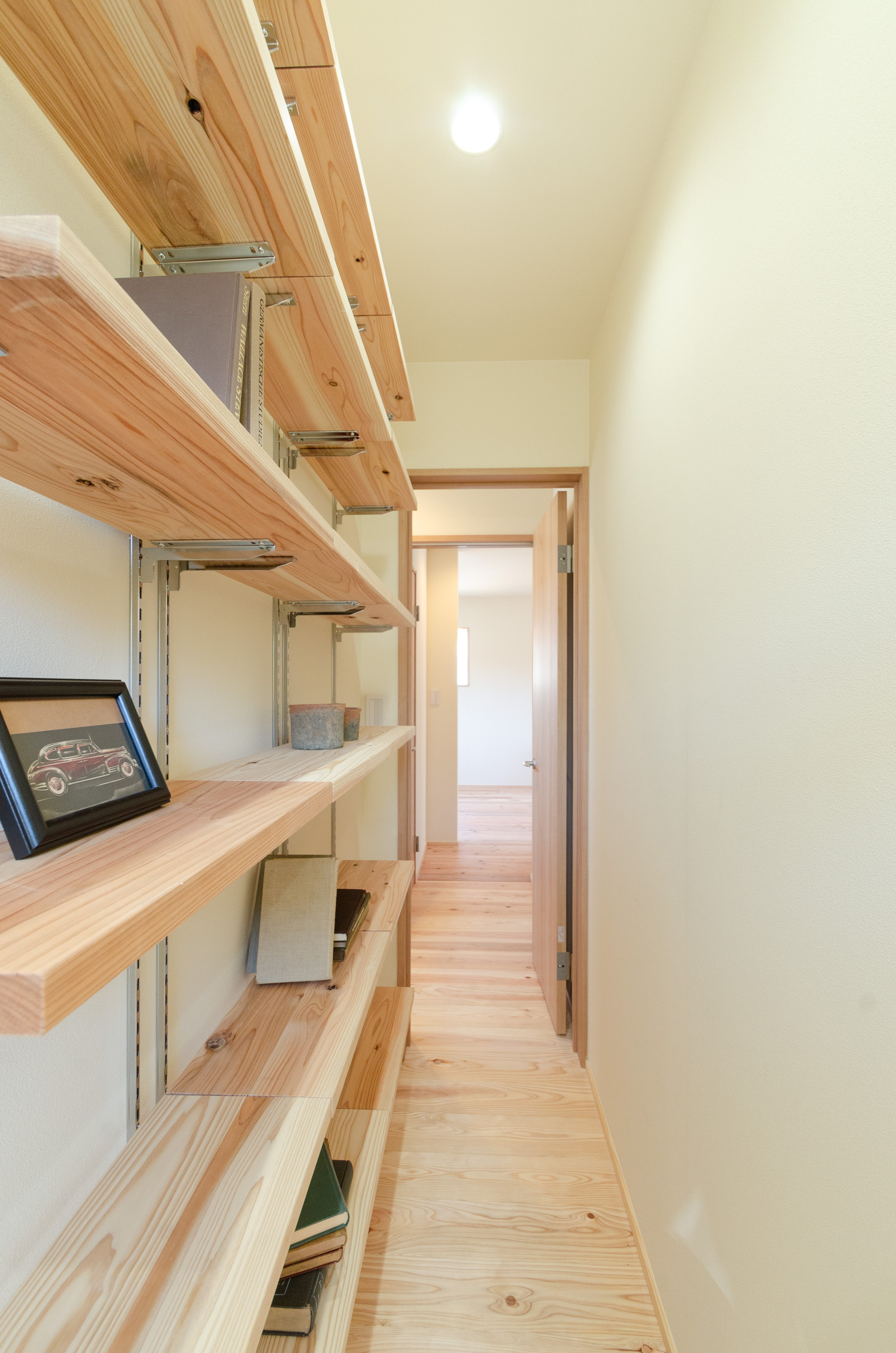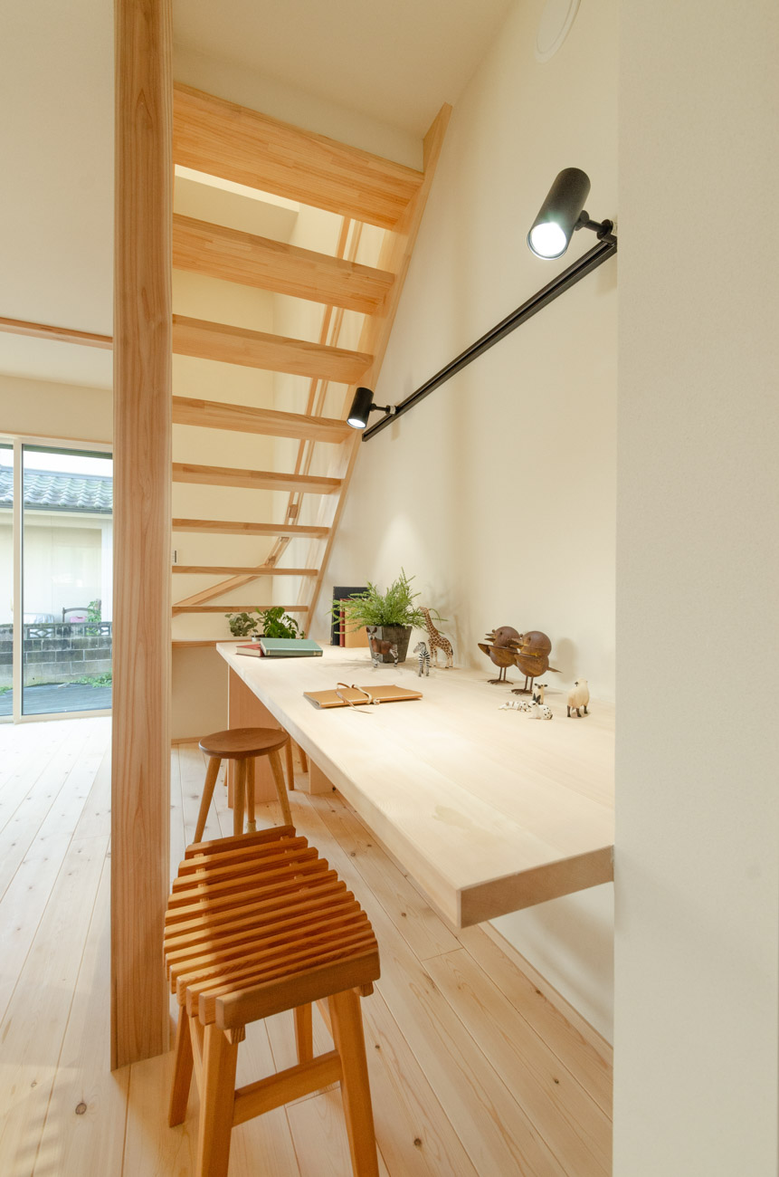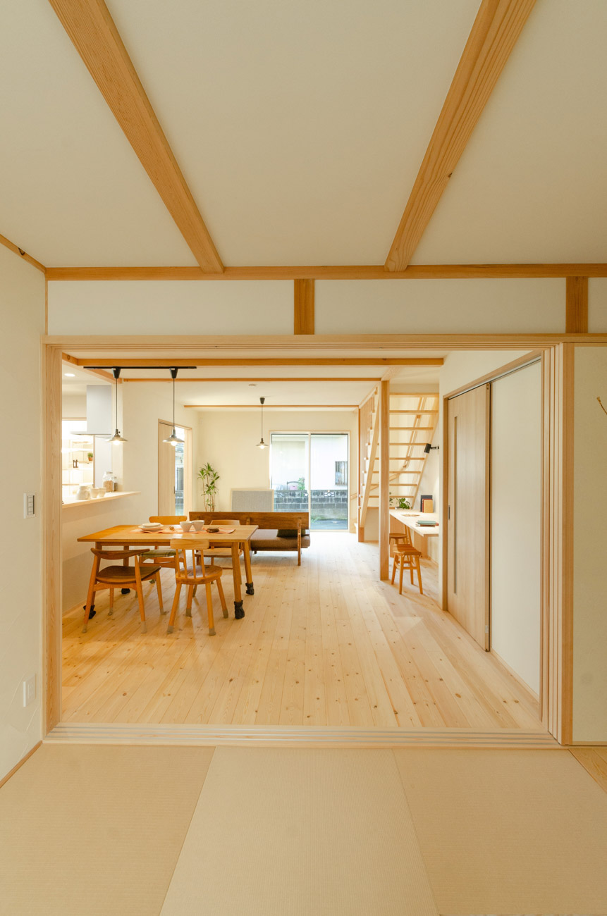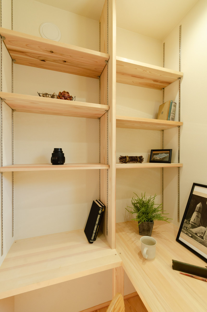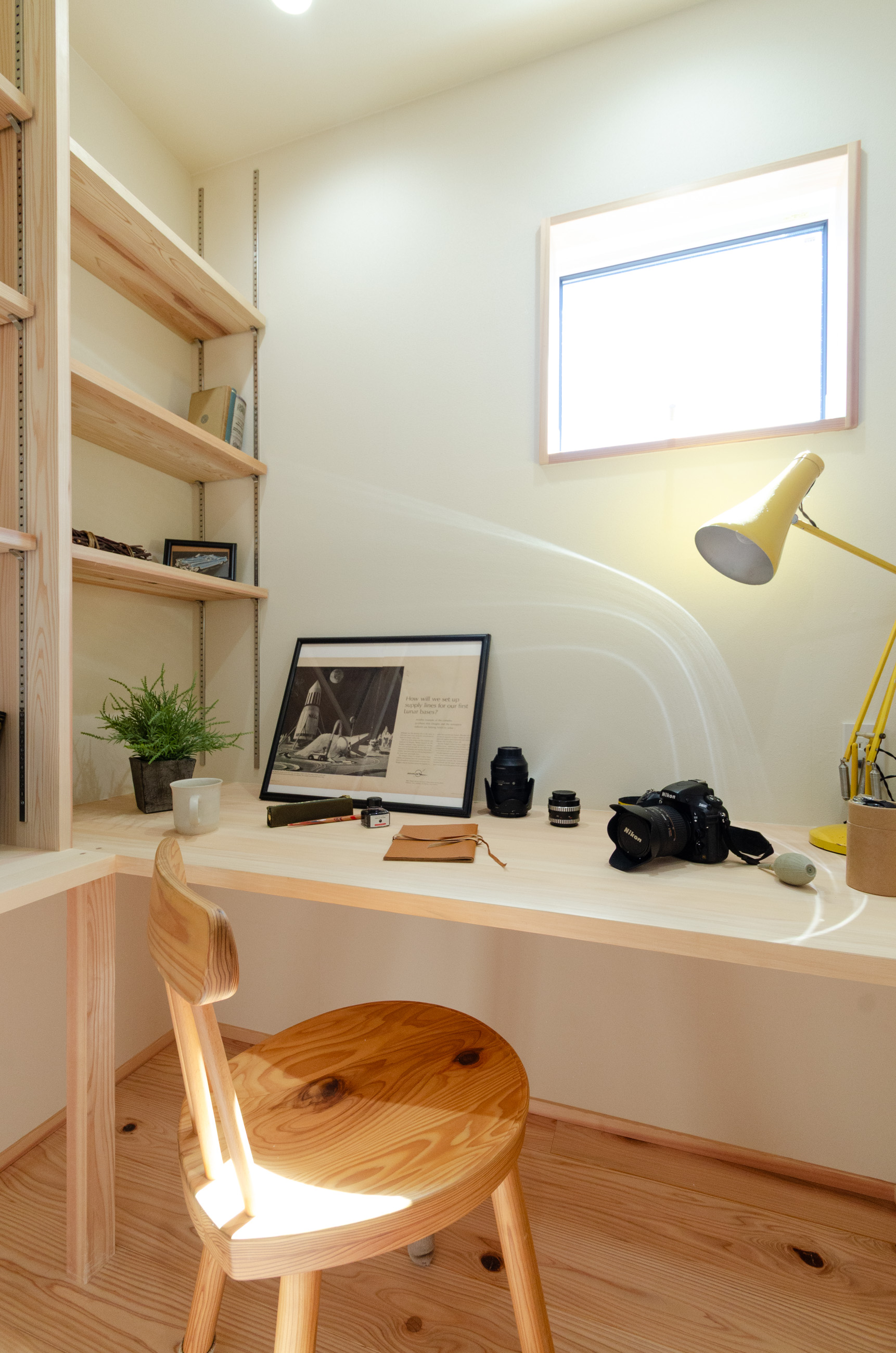 建主様親子と、お母様で暮らす予定のプチ二世帯。家族で集まるリビングは広くゆったりとつくられ、居心地の良い空間に。お母様のお部屋もリビング脇に作られ、ご様子を伺えるようになっています。 一方、二階の階段横の扉を開けると、本棚の奥にこじんまりとした書斎が現れます。家の一角に隠れるようにそっと作られたその書斎は、一人の時間を存分に楽しめる秘密の部屋。広い作業台があるため、仕事をしたり、趣味を楽しんだり読書に没頭したりと、自分一人の時間を思いきり満喫できます。 家族の時間も、一人の時間も大切にできるお住まいがとなりました。 設備と動線を備えた 暮らしやすい間取り サンルームと家事室を兼ねたランドリースペース、2階には大容量の三列ウォークインクローゼットと使いやすい設備が充実。脱衣所→キッチン→ランドリースペース→リビングをぐるっと回れる動きやすい家事動線は、モノが多くなる部分はリビングから見えないよう工夫されています。住む人の暮らしに合わせた使いやすい家事動線や設備をご提案いたします。お身体のことも考え、高齢のお母様のお部屋はリビングのすぐ脇に。 使い分けられる 2つのワークスペース 子供も大人もあると便利なのがワークスペース。仕事や家事をこなしたり子供の学習スペースとして大活躍です。リビング脇や家事室の一角に作ってちょっとした時間に利用するのもよし。より集中できる書斎やスタディルームとして作りこむのもよし。成長に併せて使い分けることも可能です。こちらのお住まいにはリビング横のデスクと2階階段脇に奥まった書斎と、2箇所のワークスペースを設置。 成長に合わせて 可変する間取り 二階の広いファミリースペースは、子供の成長に合わせて二部屋にまじ切ることができます。お子様が小さいうちは家族の部屋として、大きくなれば個室へと可変することができます。