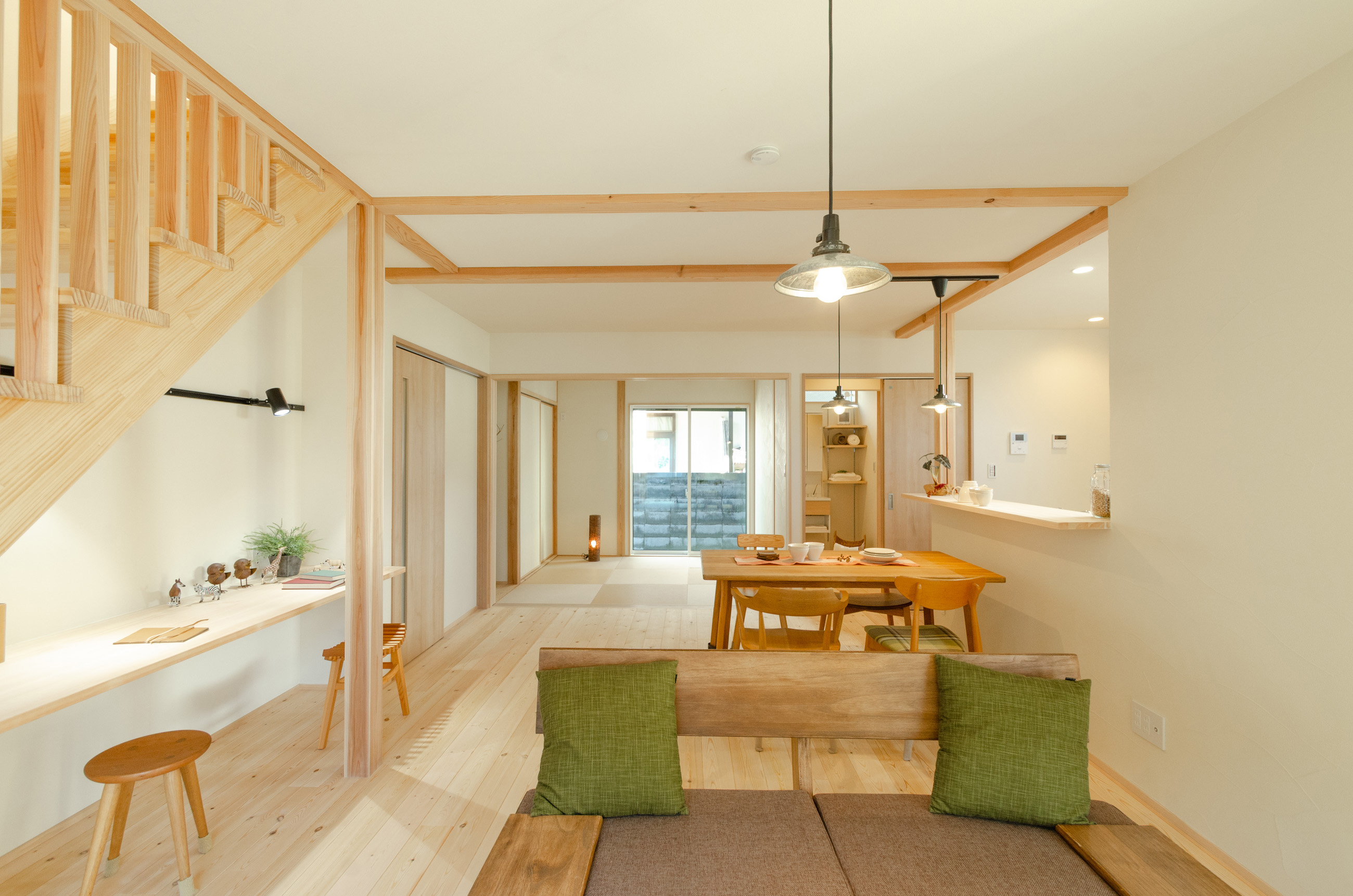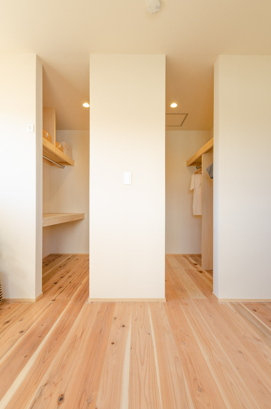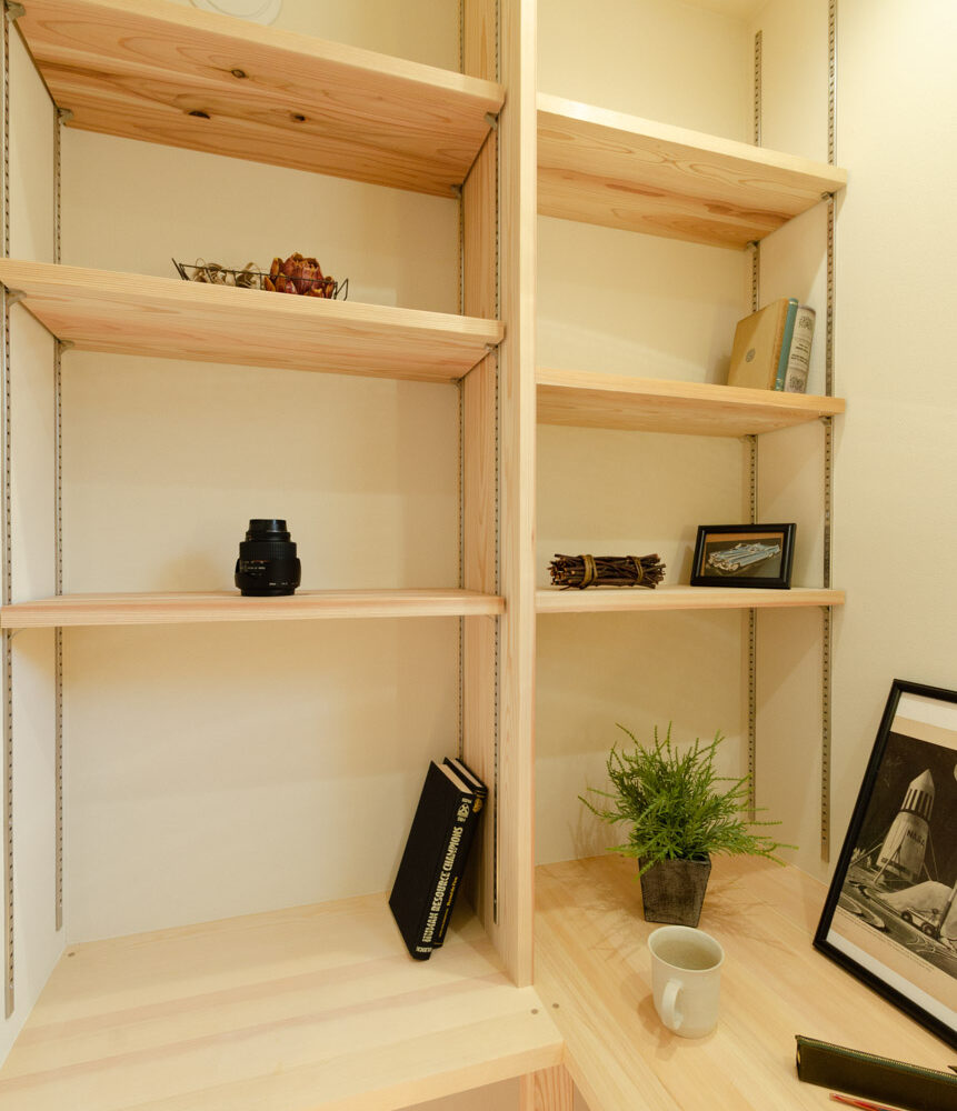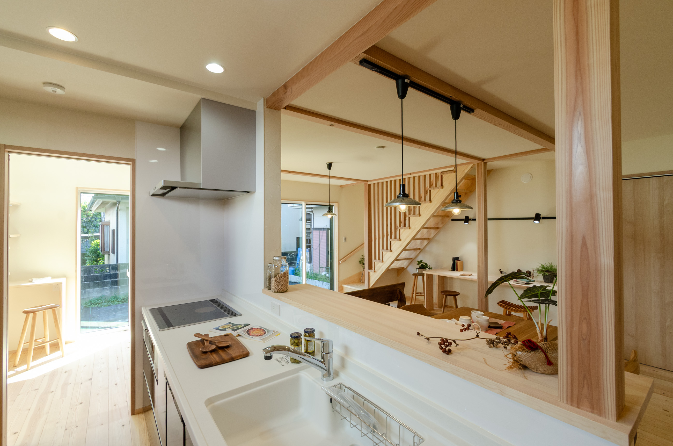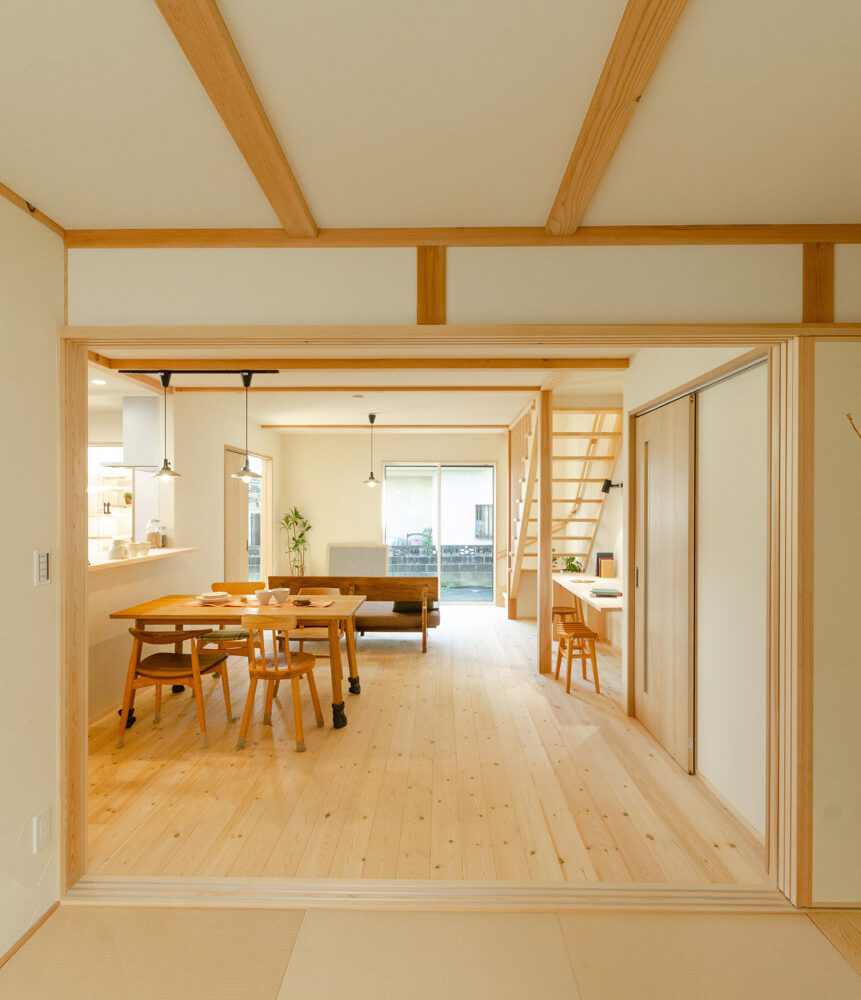 建主様親子と、お母様で暮らす予定のプチ二世帯。家族で集まるリビングは広くゆったりとつくられ、居心地の良い空間に。お母様のお部屋もリビング脇に作られ、ご様子を伺えるようになっています。 一方、二階の階段横の扉を開けると、本棚の奥にこじんまりとした書斎が現れます。家の一角に隠れるようにそっと作られたその書斎は、一人の時間を存分に楽しめる秘密の部屋。広い作業台があるため、仕事をしたり、趣味を楽しんだり読書に没頭したりと、自分一人の時間を思いきり満喫できます。 家族の時間も、一人の時間も大切にできるお住まいがとなりました。 設備と動線を備えた 暮らしやすい間取り サンルームと家事室を兼ねたランドリースペース、2階には大容量の三列ウォークインクローゼットと使いやすい設備が充実。脱衣所→キッチン→ランドリースペース→リビングをぐるっと回れる動きやすい家事動線は、モノが多くなる部分はリビングから見えないよう工夫されています。住む人の暮らしに合わせた使いやすい家事動線や設備をご提案いたします。お身体のことも考え、高齢のお母様のお部屋はリビングのすぐ脇に。 使い分けられる 2つのワークスペース 子供も大人もあると便利なのがワークスペース。仕事や家事をこなしたり子供の学習スペースとして大活躍です。リビング脇や家事室の一角に作ってちょっとした時間に利用するのもよし。より集中できる書斎やスタディルームとして作りこむのもよし。成長に併せて使い分けることも可能です。こちらのお住まいにはリビング横のデスクと2階階段脇に奥まった書斎と、2箇所のワークスペースを設置。 成長に合わせて 可変する間取り 二階の広いファミリースペースは、子供の成長に合わせて二部屋にまじ切ることができます。お子様が小さいうちは家族の部屋として、大きくなれば個室へと可変することができます。