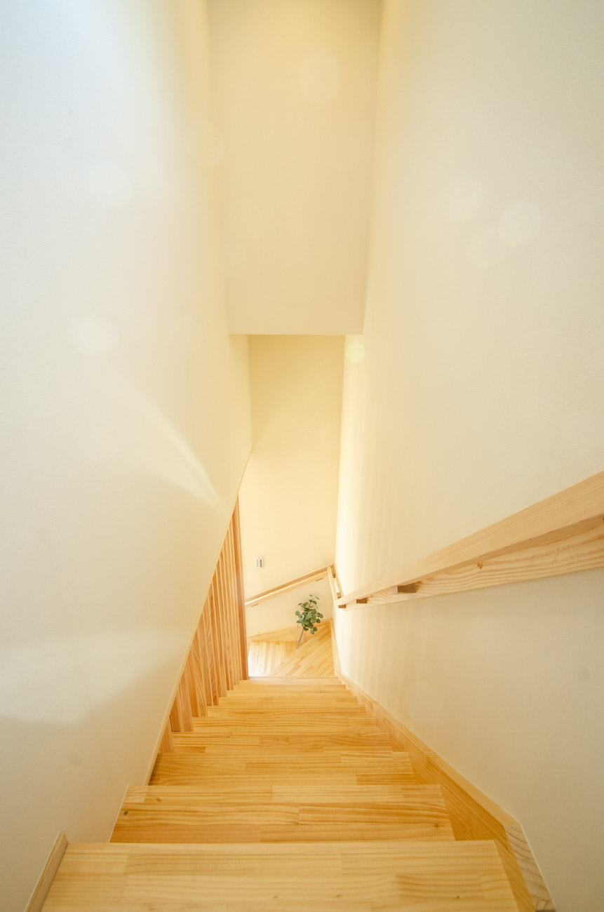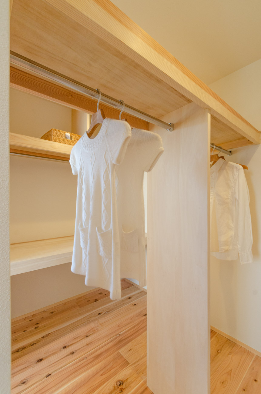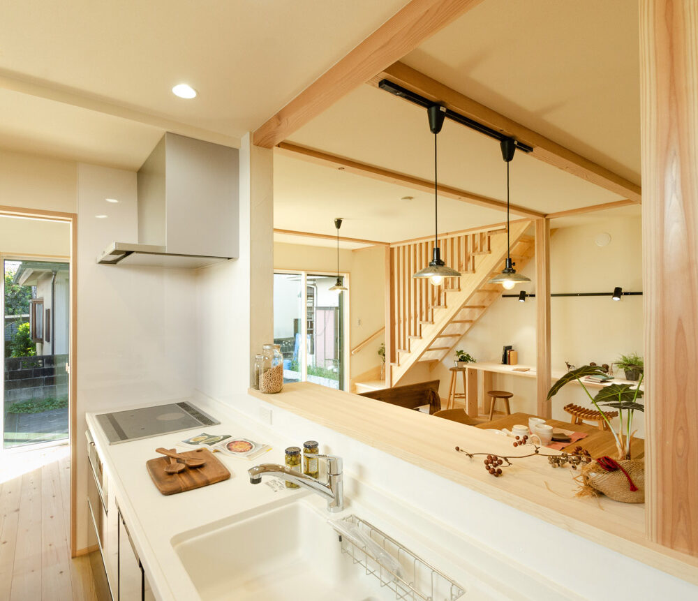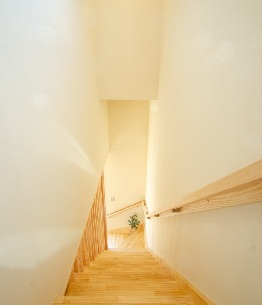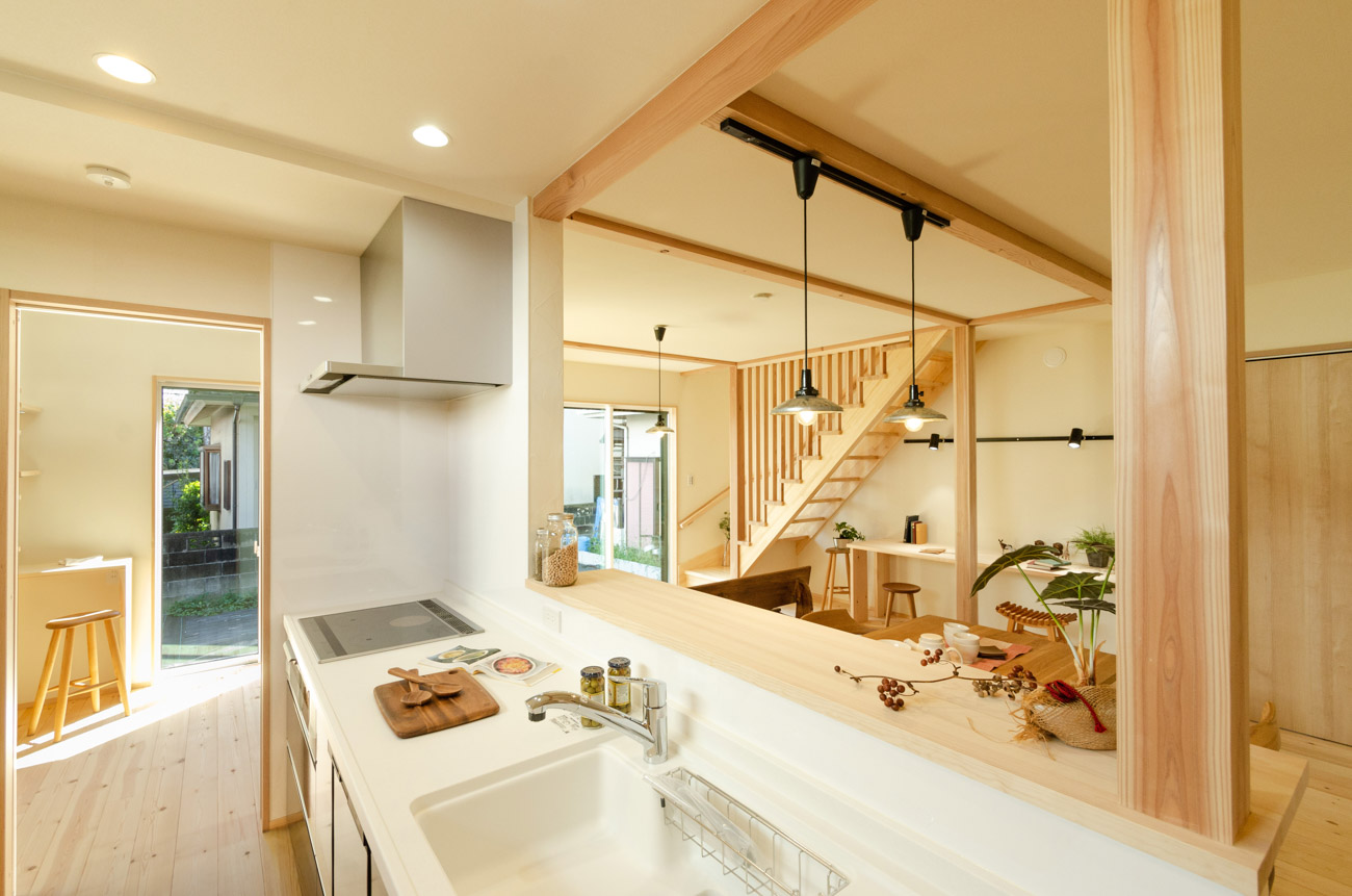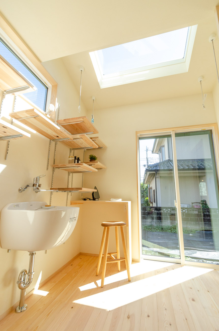 建主様親子と、お母様で暮らす予定のプチ二世帯。家族で集まるリビングは広くゆったりとつくられ、居心地の良い空間に。お母様のお部屋もリビング脇に作られ、ご様子を伺えるようになっています。 一方、二階の階段横の扉を開けると、本棚の奥にこじんまりとした書斎が現れます。家の一角に隠れるようにそっと作られたその書斎は、一人の時間を存分に楽しめる秘密の部屋。広い作業台があるため、仕事をしたり、趣味を楽しんだり読書に没頭したりと、自分一人の時間を思いきり満喫できます。 家族の時間も、一人の時間も大切にできるお住まいがとなりました。 設備と動線を備えた 暮らしやすい間取り サンルームと家事室を兼ねたランドリースペース、2階には大容量の三列ウォークインクローゼットと使いやすい設備が充実。脱衣所→キッチン→ランドリースペース→リビングをぐるっと回れる動きやすい家事動線は、モノが多くなる部分はリビングから見えないよう工夫されています。住む人の暮らしに合わせた使いやすい家事動線や設備をご提案いたします。お身体のことも考え、高齢のお母様のお部屋はリビングのすぐ脇に。 使い分けられる 2つのワークスペース 子供も大人もあると便利なのがワークスペース。仕事や家事をこなしたり子供の学習スペースとして大活躍です。リビング脇や家事室の一角に作ってちょっとした時間に利用するのもよし。より集中できる書斎やスタディルームとして作りこむのもよし。成長に併せて使い分けることも可能です。こちらのお住まいにはリビング横のデスクと2階階段脇に奥まった書斎と、2箇所のワークスペースを設置。 成長に合わせて 可変する間取り 二階の広いファミリースペースは、子供の成長に合わせて二部屋にまじ切ることができます。お子様が小さいうちは家族の部屋として、大きくなれば個室へと可変することができます。