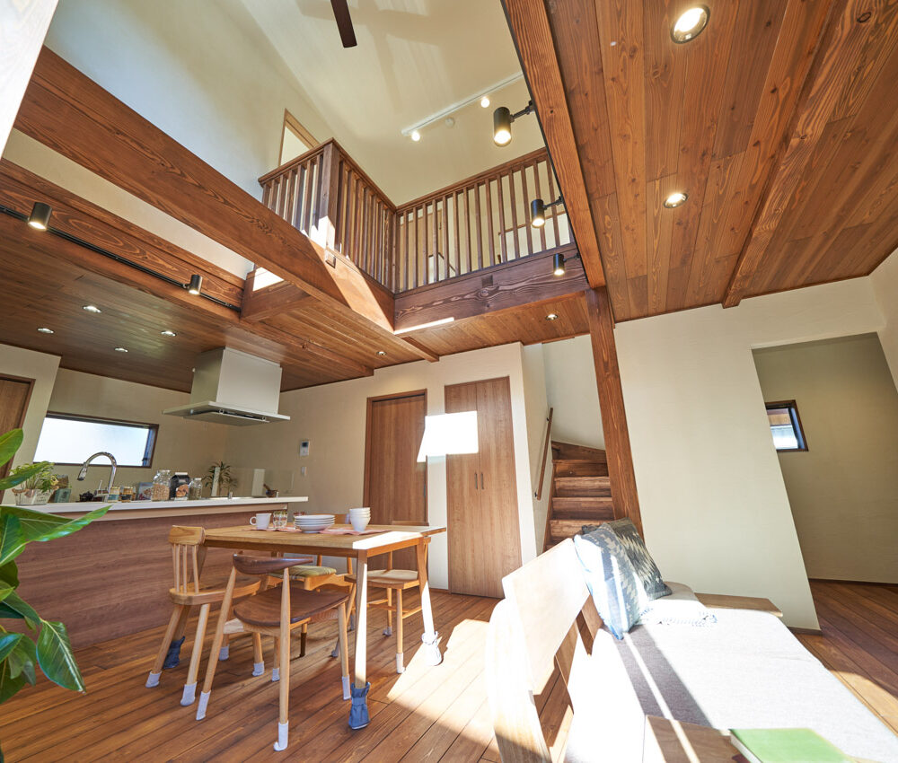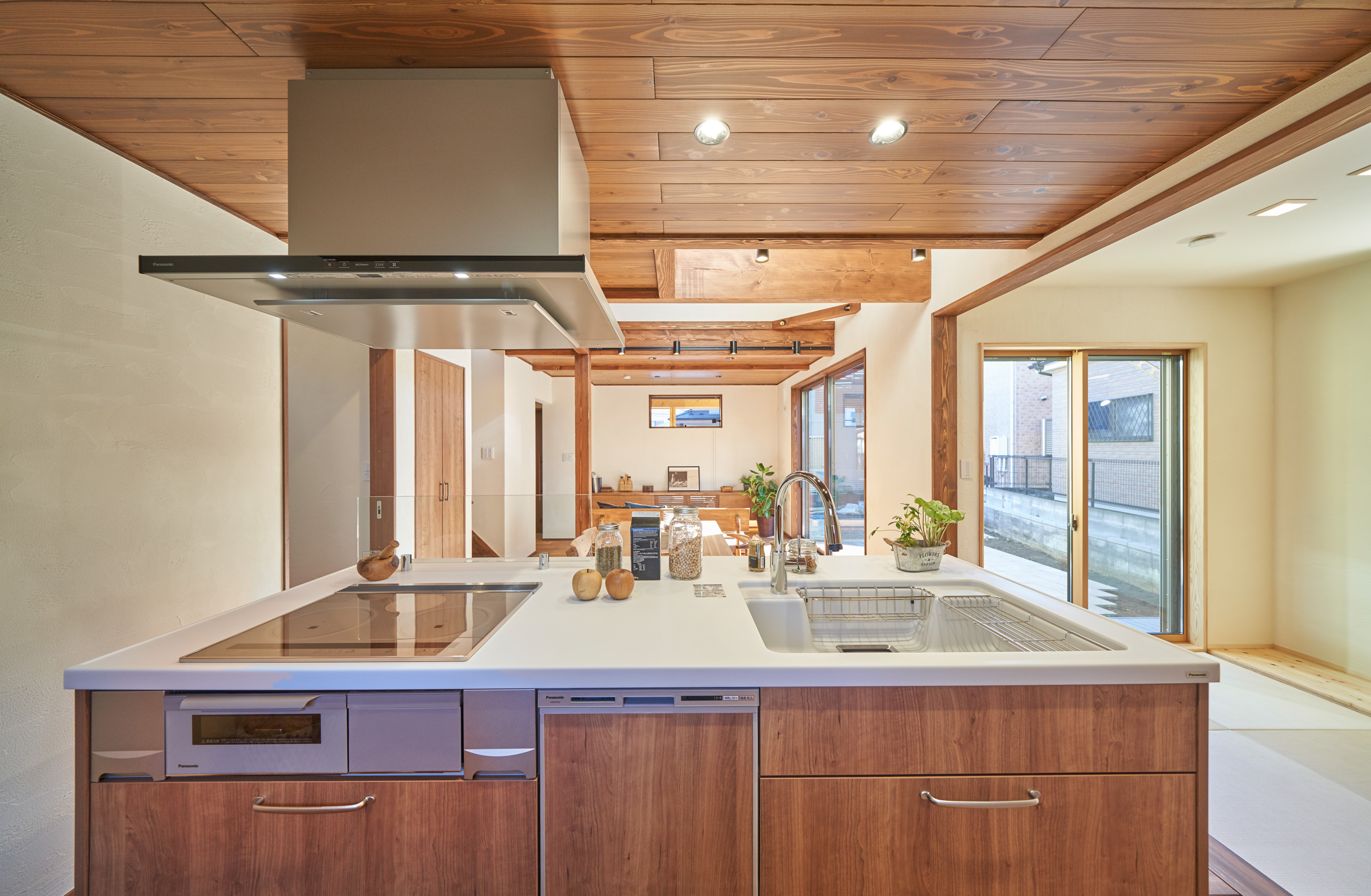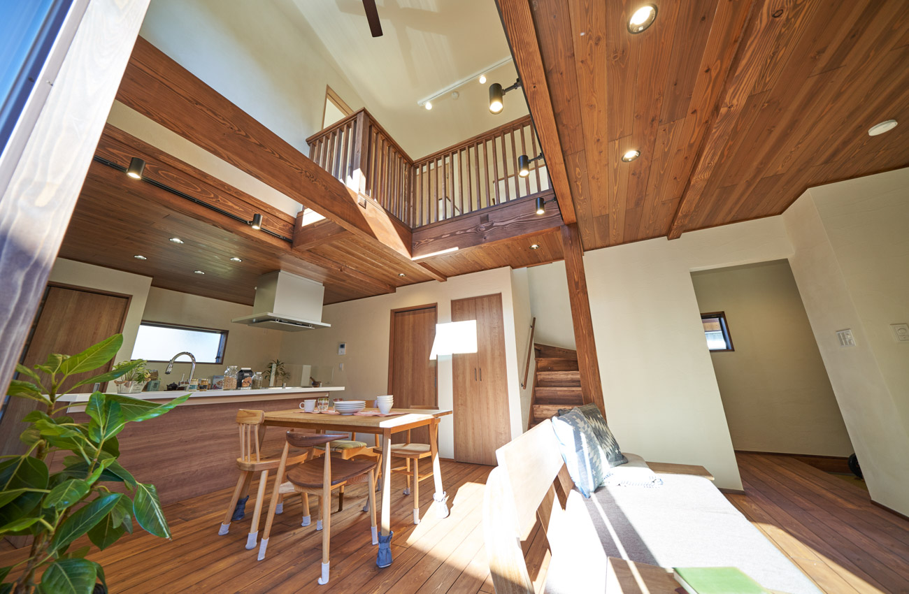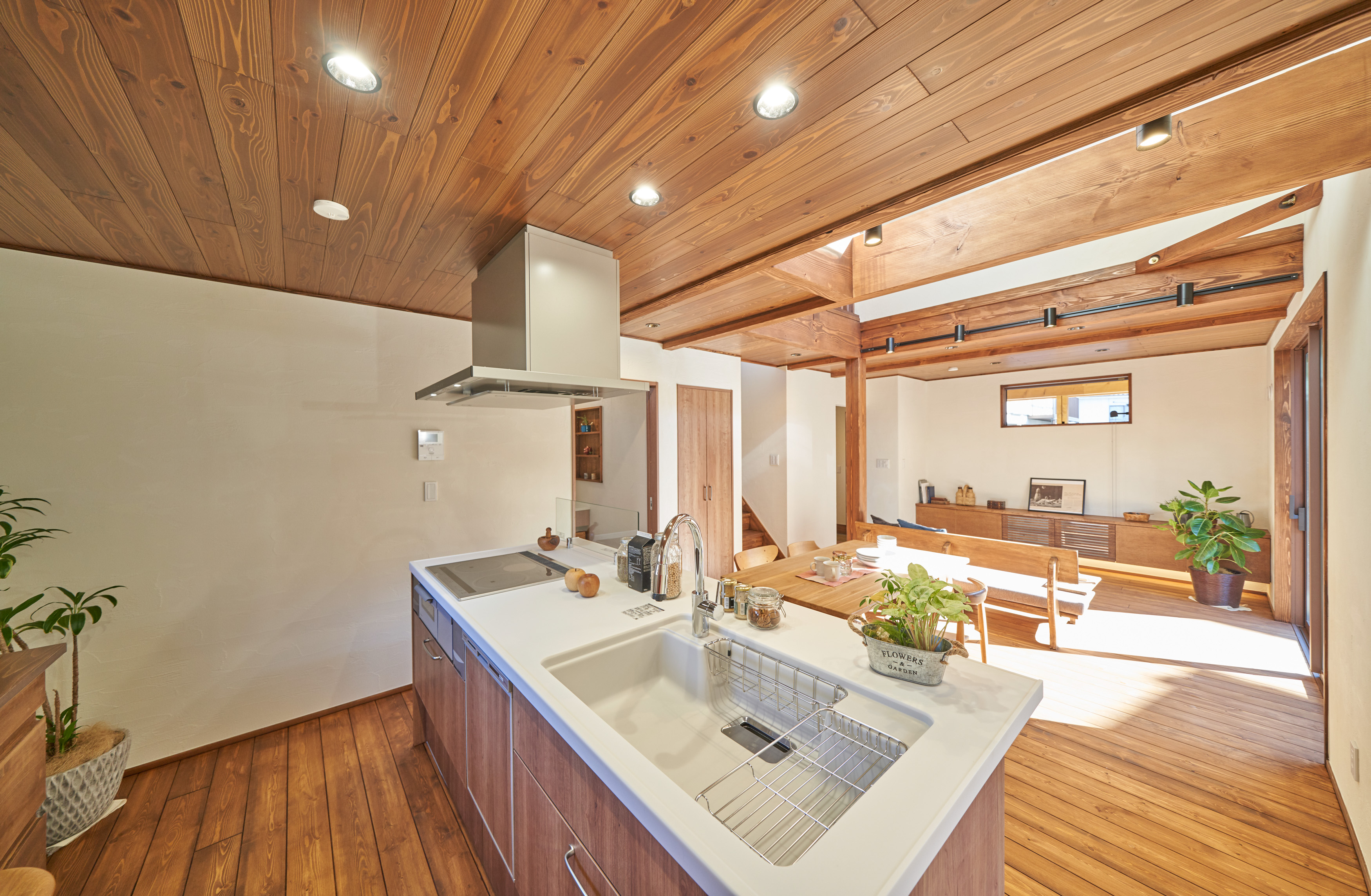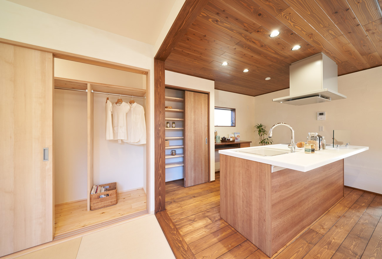 昔ながらの色や素材を使い、随所に趣深さを。中心に吹き抜けを配置し、高低差のインパクトと吹き抜けからの明るさで広さを体感できます。天井まで無垢板を使用した美しい内装仕上げ。大きなアイランドキッチンを中心に家事ができるよう、キッチン横には家事室にも育児スペースにも衣装収納にもなる和室を設置。そのままウッドデッキへも出られます。