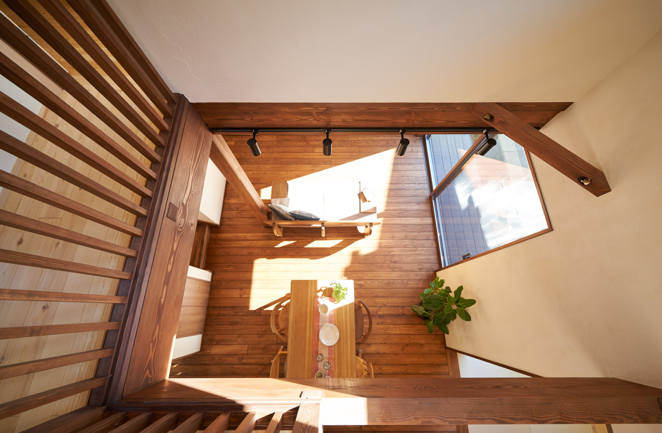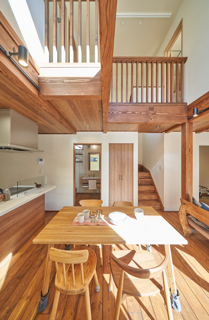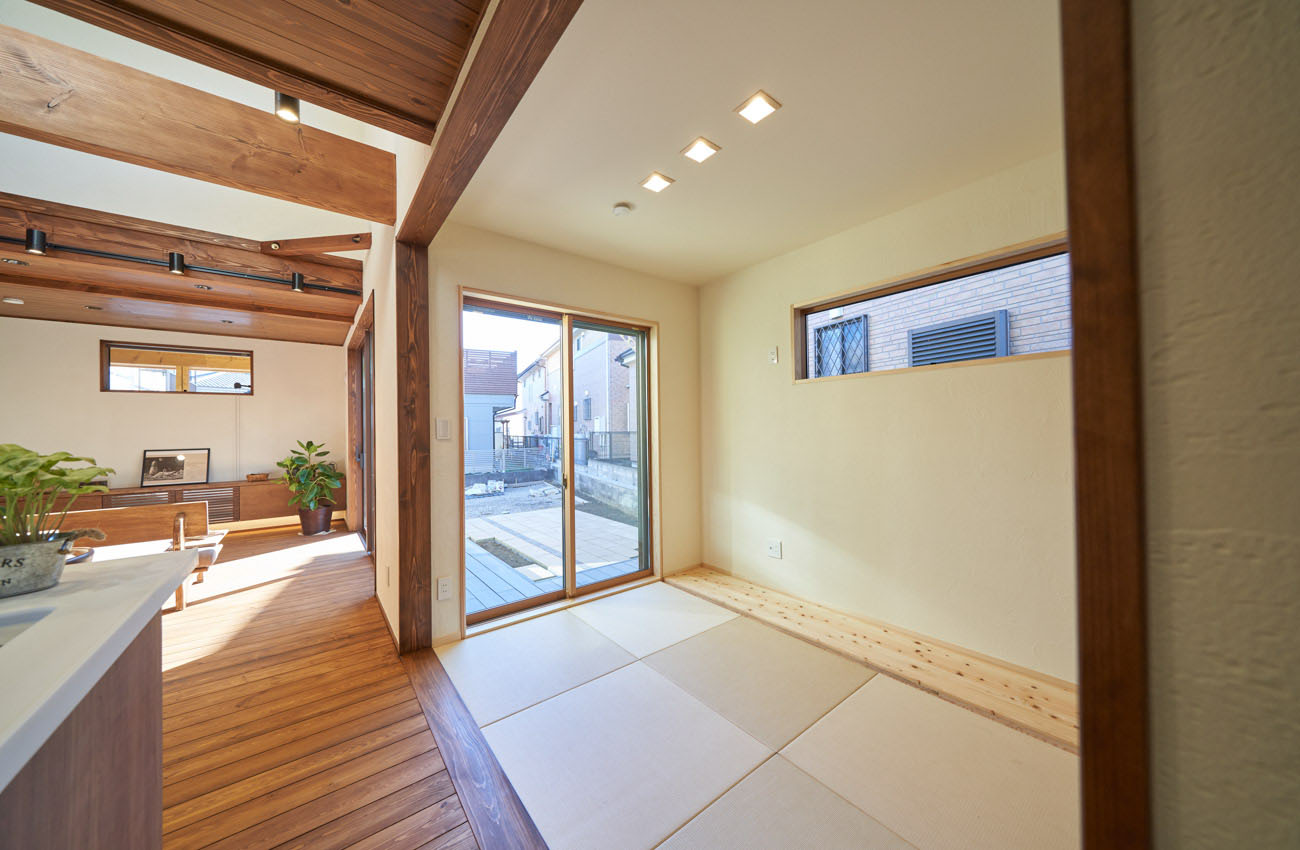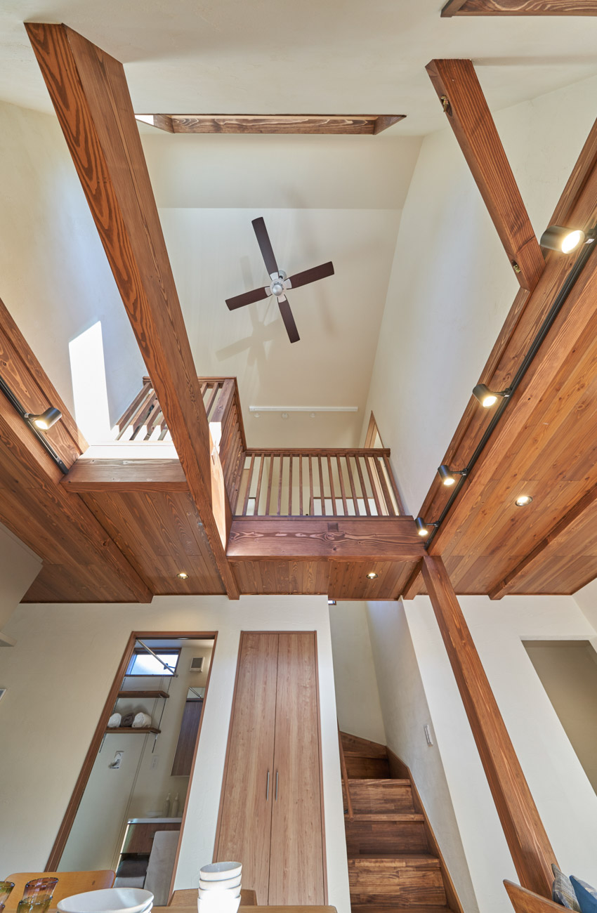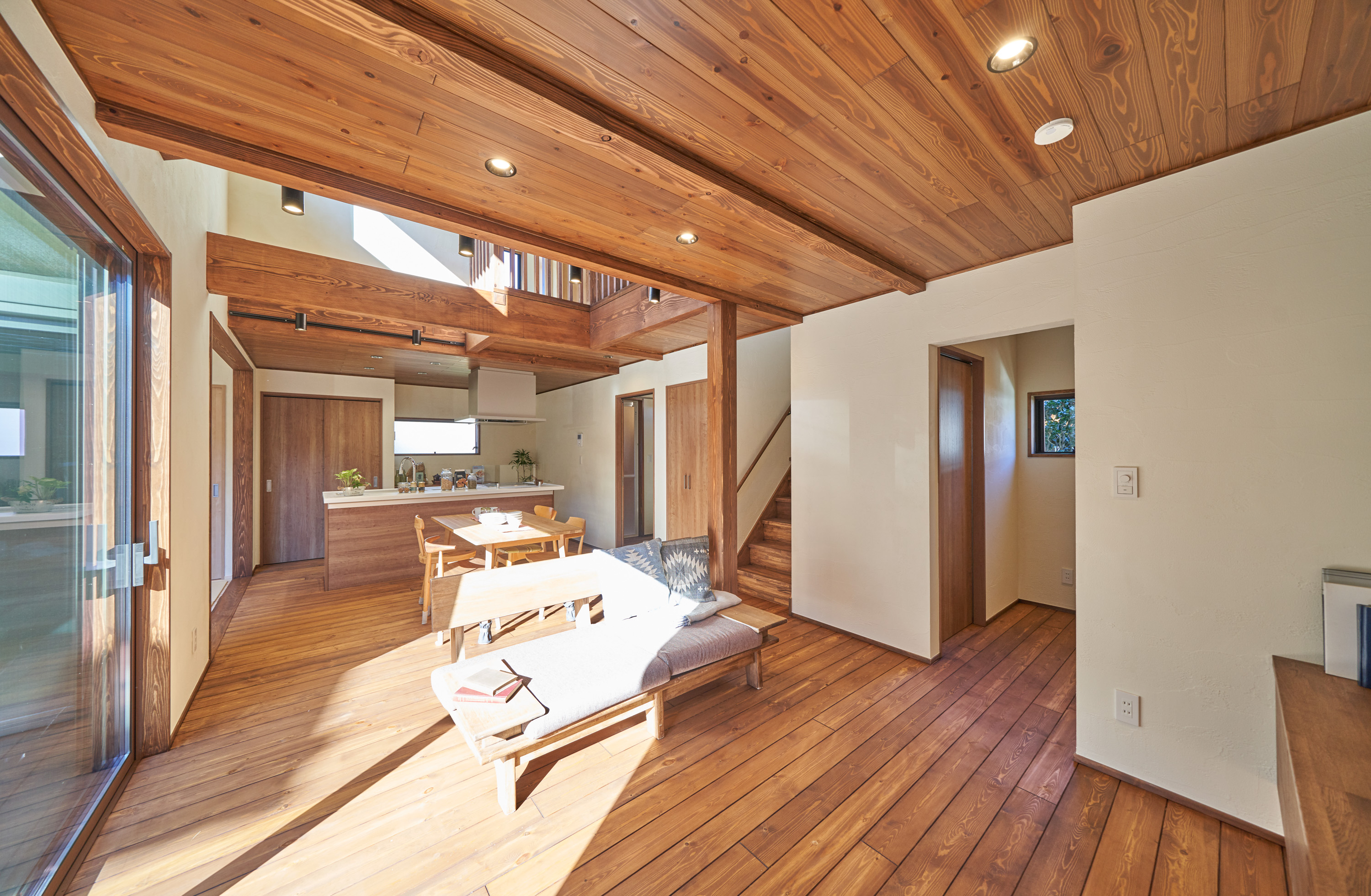 昔ながらの色や素材を使い、随所に趣深さを。中心に吹き抜けを配置し、高低差のインパクトと吹き抜けからの明るさで広さを体感できます。天井まで無垢板を使用した美しい内装仕上げ。大きなアイランドキッチンを中心に家事ができるよう、キッチン横には家事室にも育児スペースにも衣装収納にもなる和室を設置。そのままウッドデッキへも出られます。